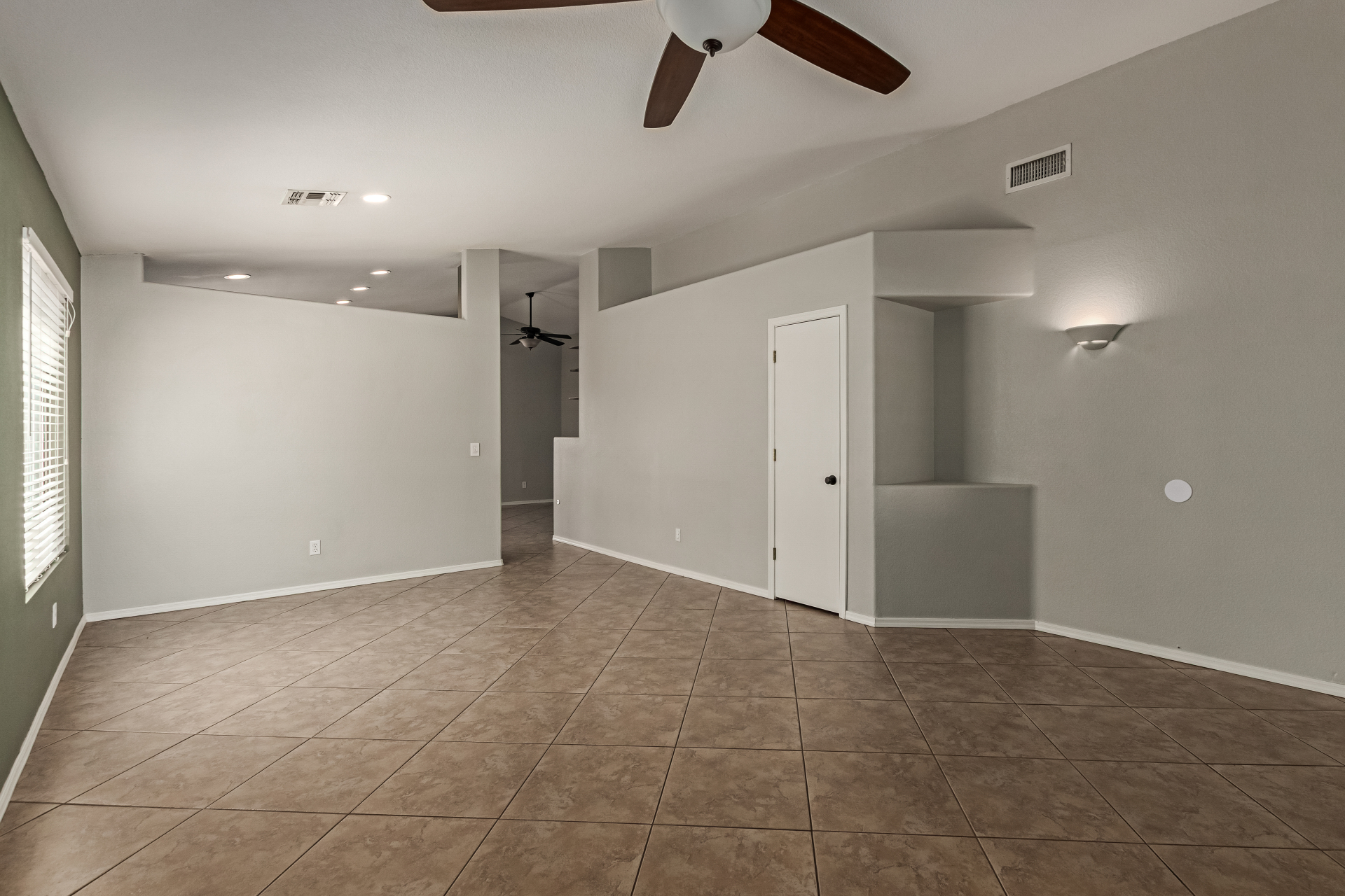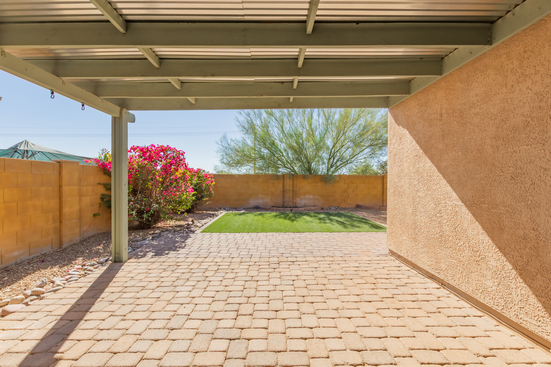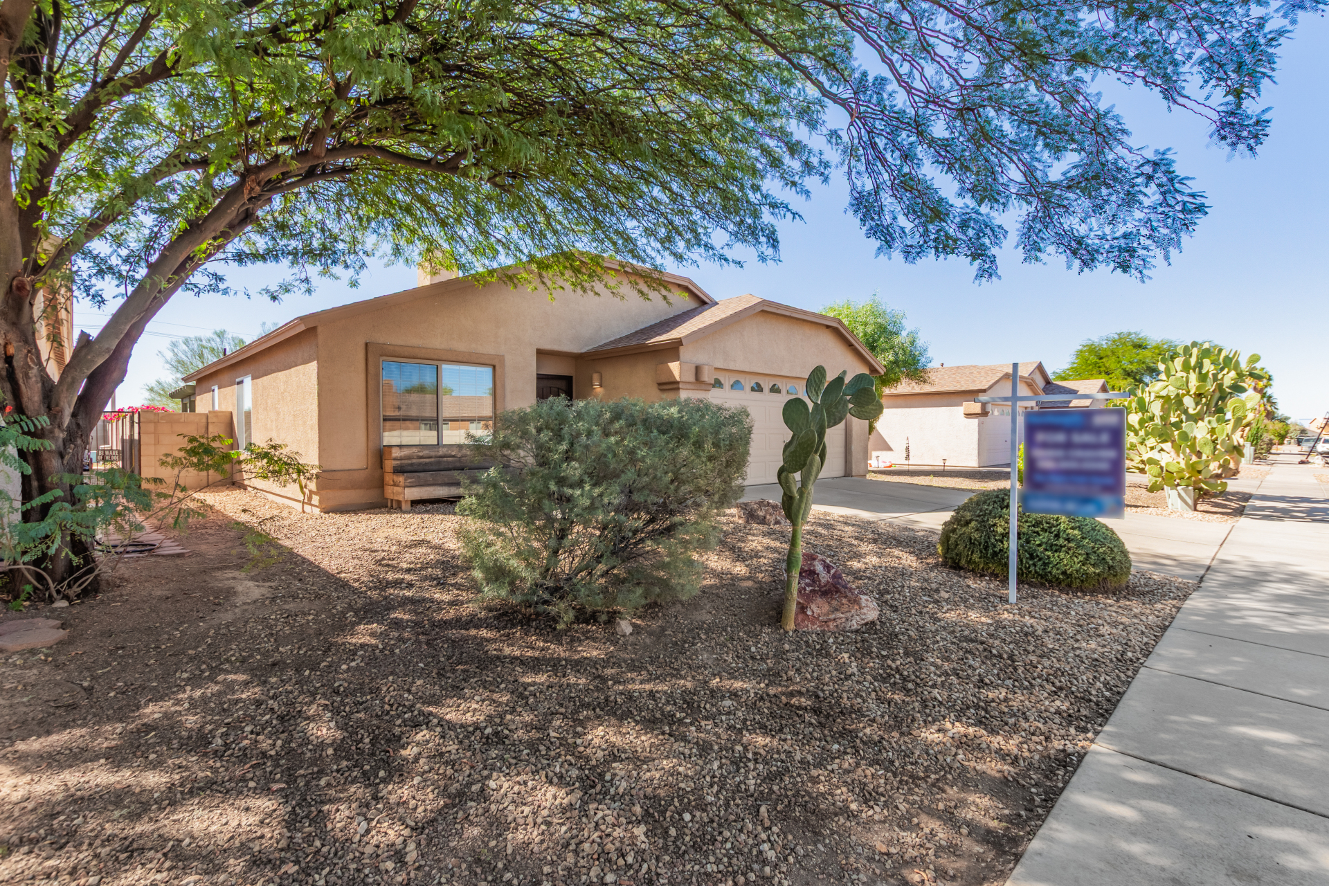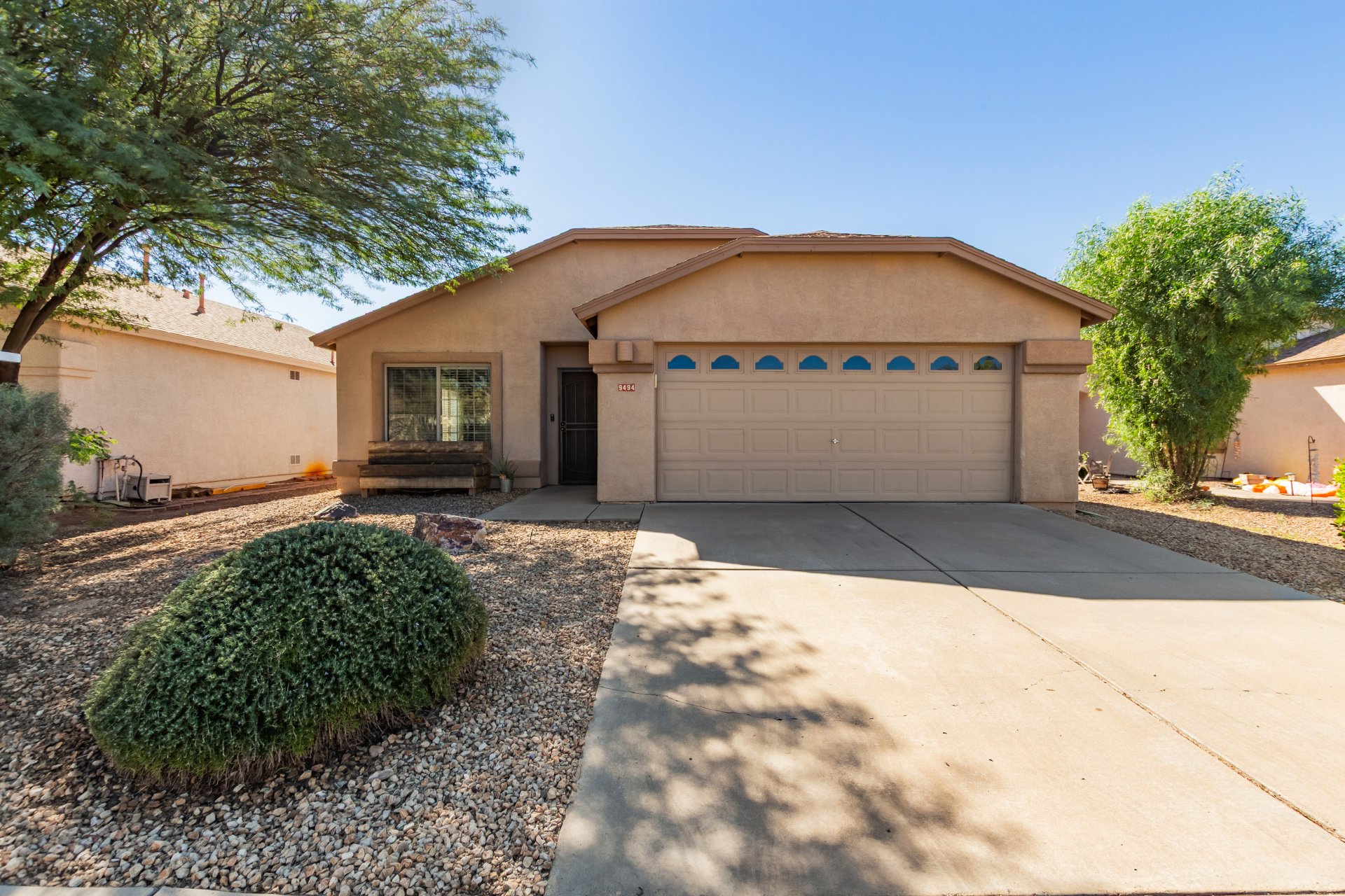 Beautifully updated 3BD/2BA home in desirable Rita Ranch! Step inside to find vaulted ceilings, modern finishes, and warm wooden built-ins and shelving throughout for both charm and functionality. The spacious floor plan includes a cozy living area with fireplace, vaulted ceilings and updated kitchen and bathroom. Enjoy outdoor living with a covered patio, landscaped backyard featuring pavers and lush artificial turf, and no rear neighbors-just peaceful open desert views behind you. Plus, a newer AC, 2-car garage, and more make this home move-in ready and full of value!