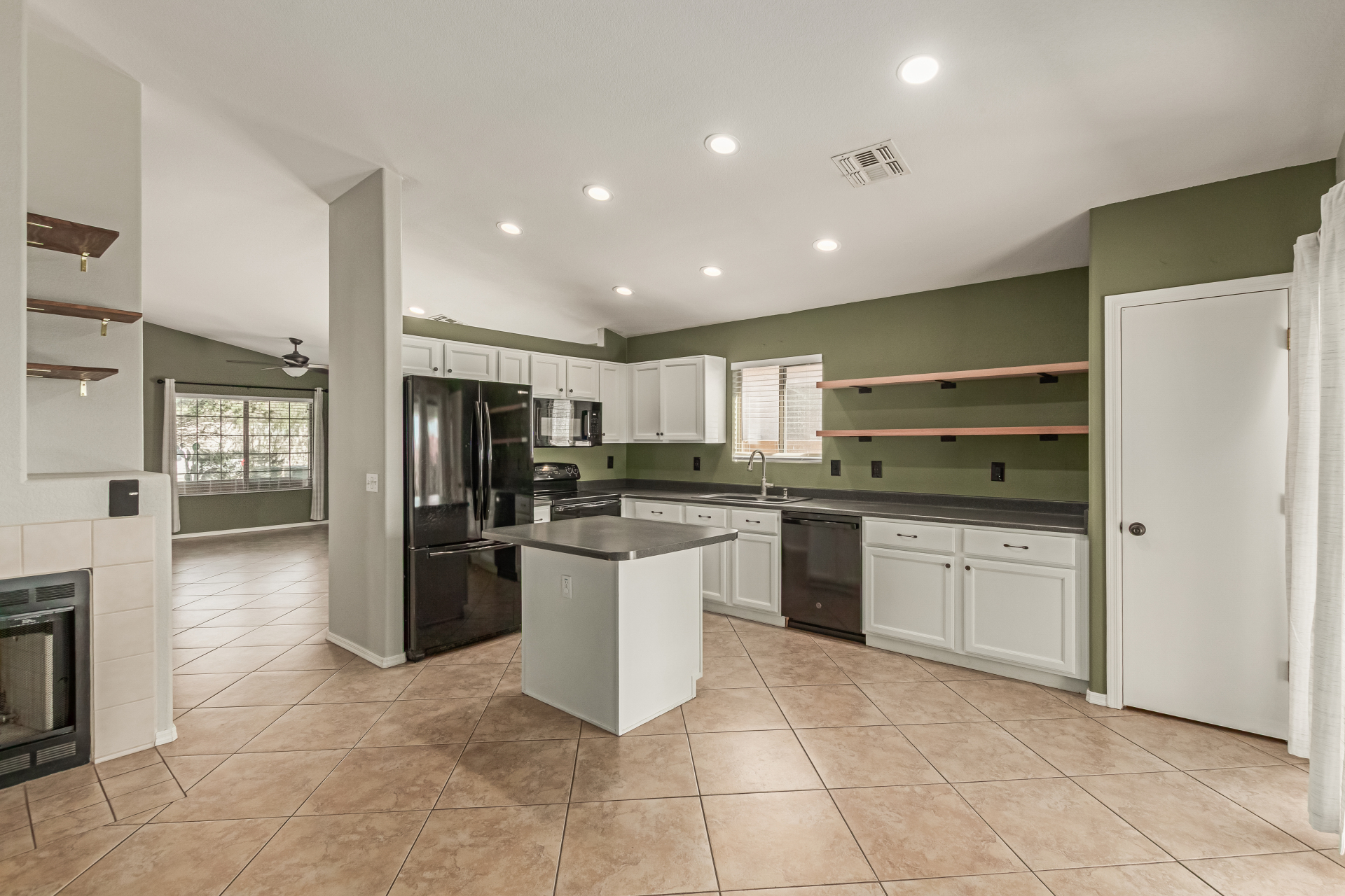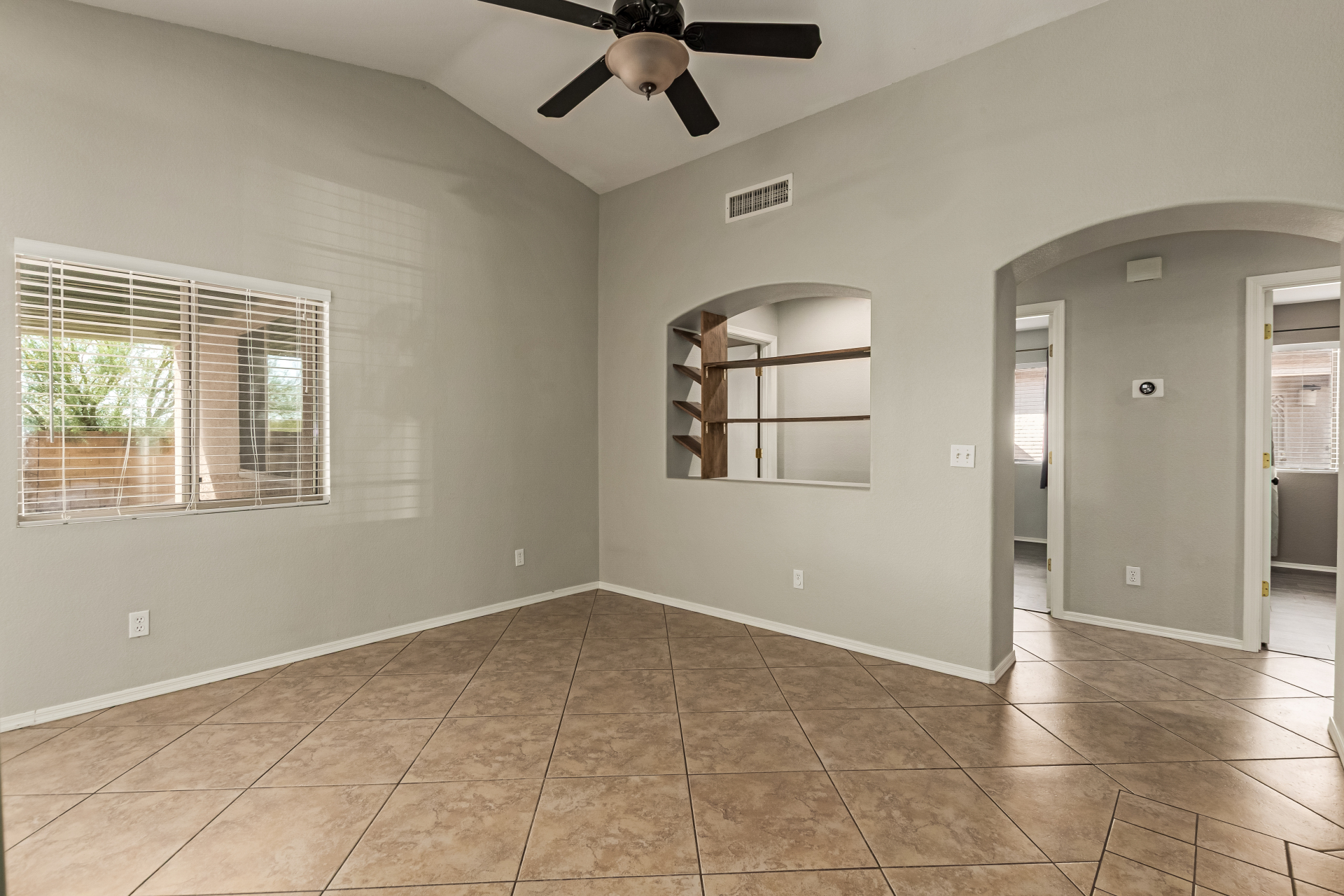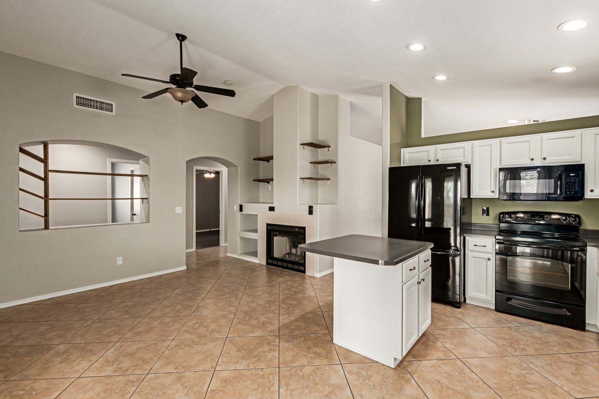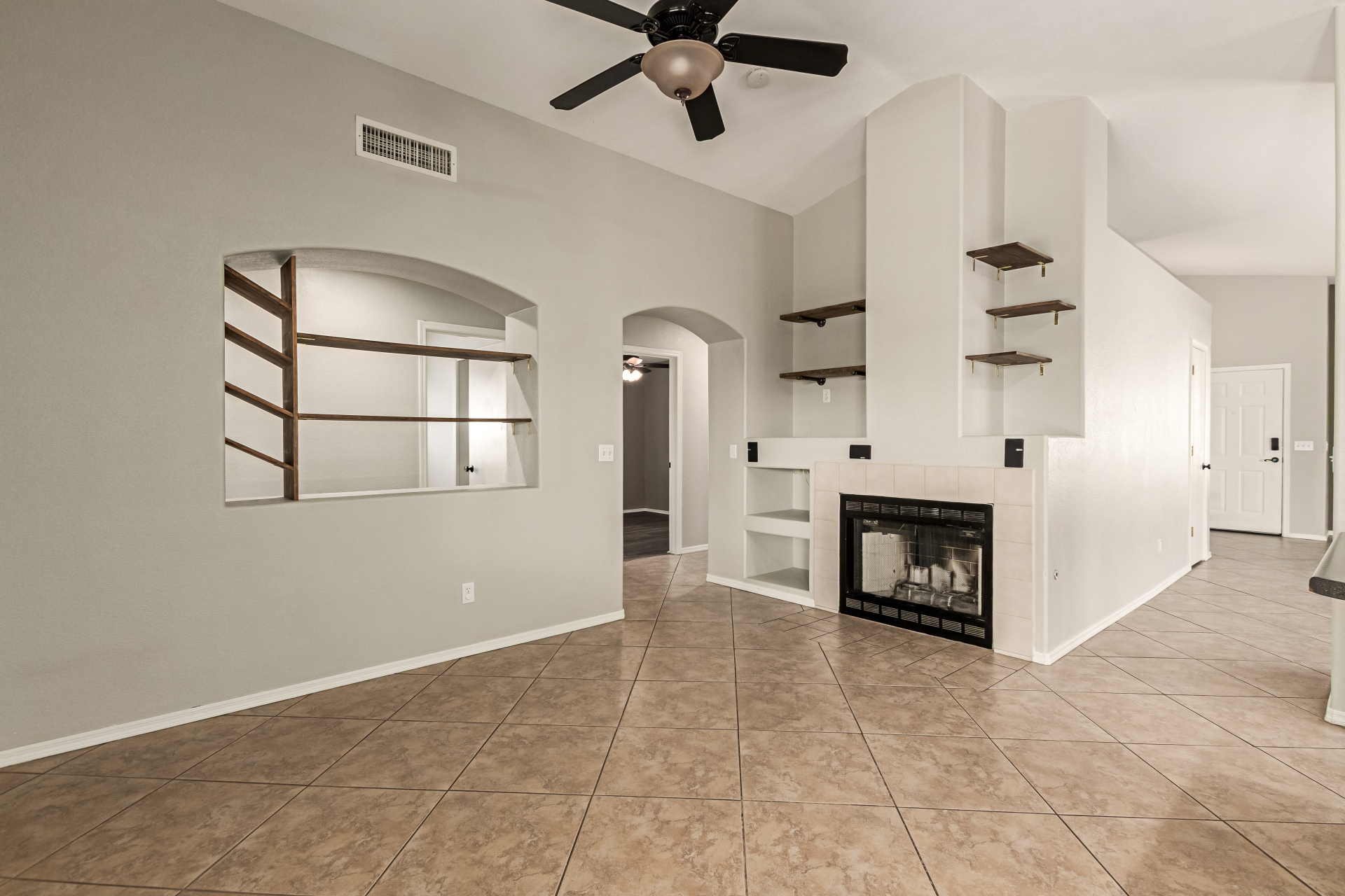 Beautifully updated 3BD/2BA home in desirable Rita Ranch! Step inside to find vaulted ceilings, modern finishes, and warm wooden built-ins and shelving throughout for both charm and functionality. The spacious floor plan includes a cozy living area with fireplace, vaulted ceilings and updated kitchen and bathroom. Enjoy outdoor living with a covered patio, landscaped backyard featuring pavers and lush artificial turf, and no rear neighbors-just peaceful open desert views behind you. Plus, a newer AC, 2-car garage, and more make this home move-in ready and full of value!