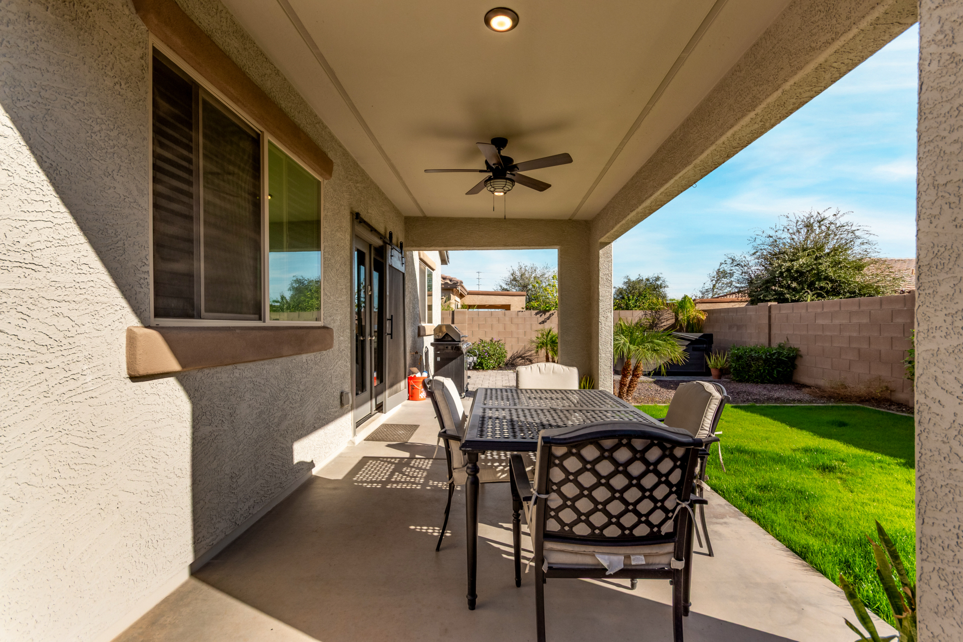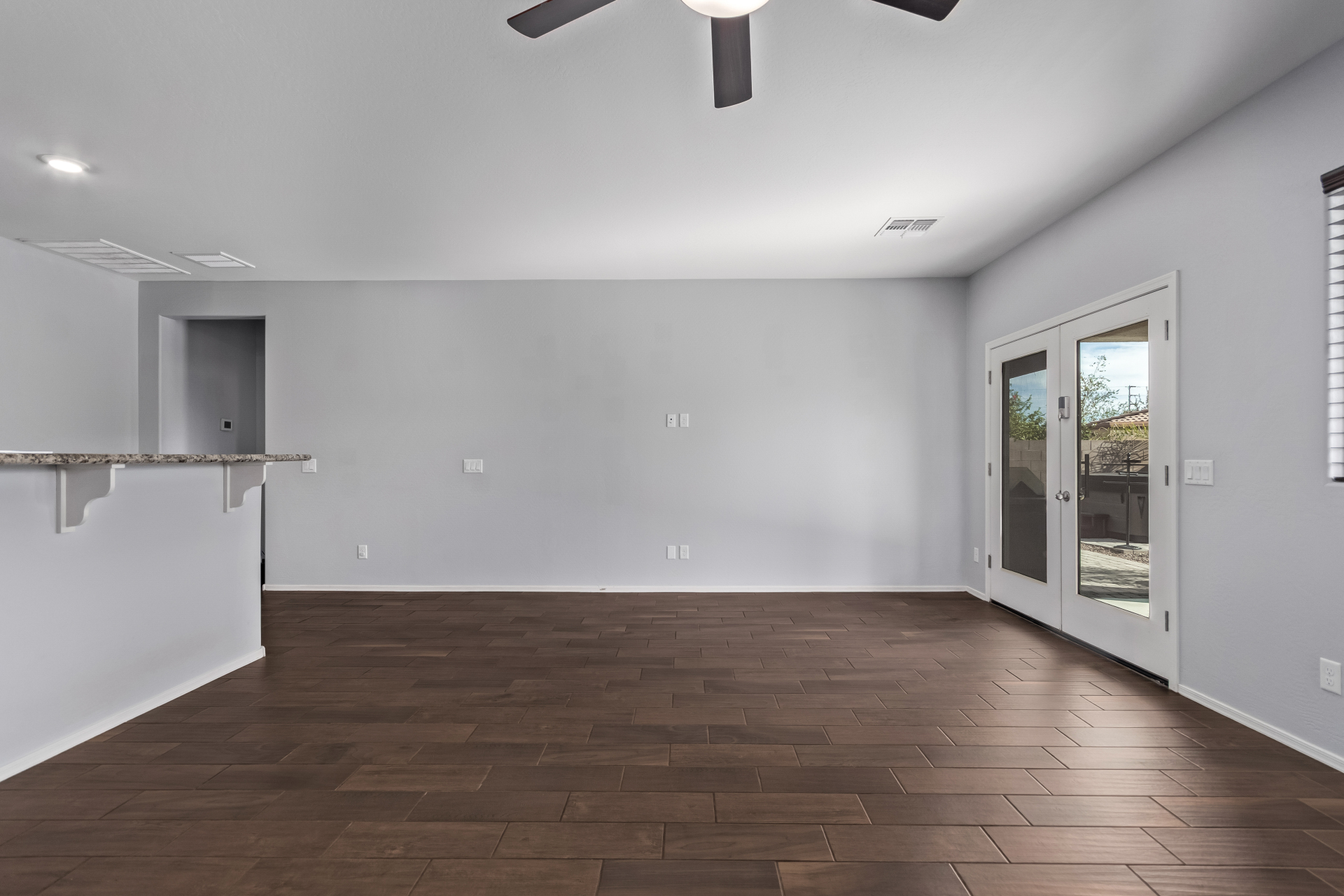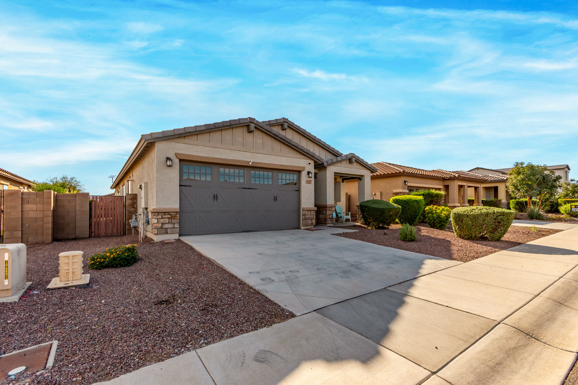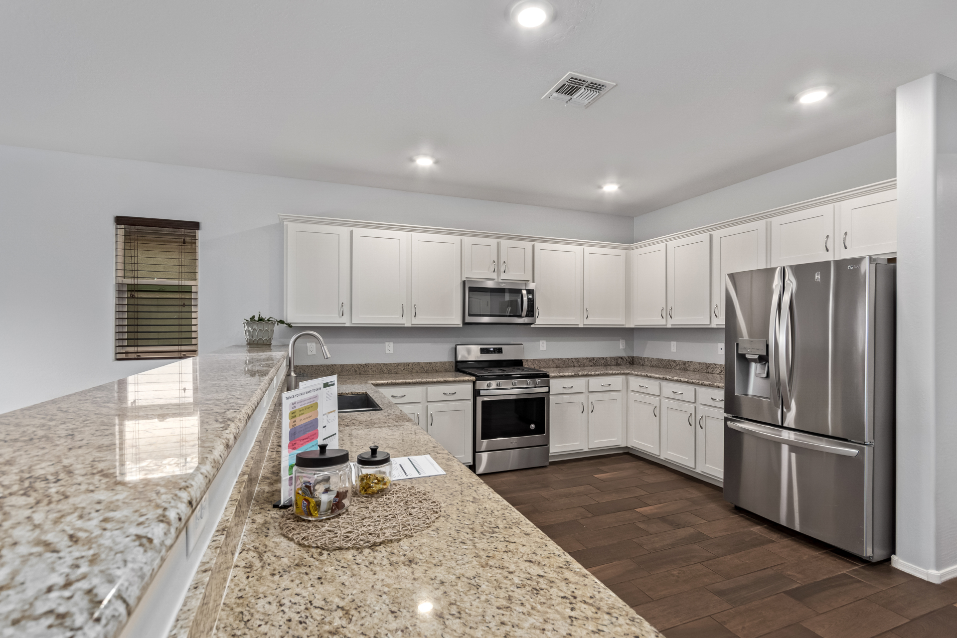 Stunning 3-bedroom, 3-bathroom home with den and formal dining/game room! Featuring elegant wood-look tile flooring, a chef-inspired kitchen with white 36-inch cabinets, granite countertops, and stainless steel appliances. Energy-efficient upgrades include tankless water heater, spray foam insulation, dual-flush toilets, and LED lighting throughout. The desirable north/south-facing lot offers a south-facing backyard with a relaxing hot tub, gas stub for an outdoor kitchen, and plenty of space for a future pool or play area. Move-in ready and perfect for Arizona living.