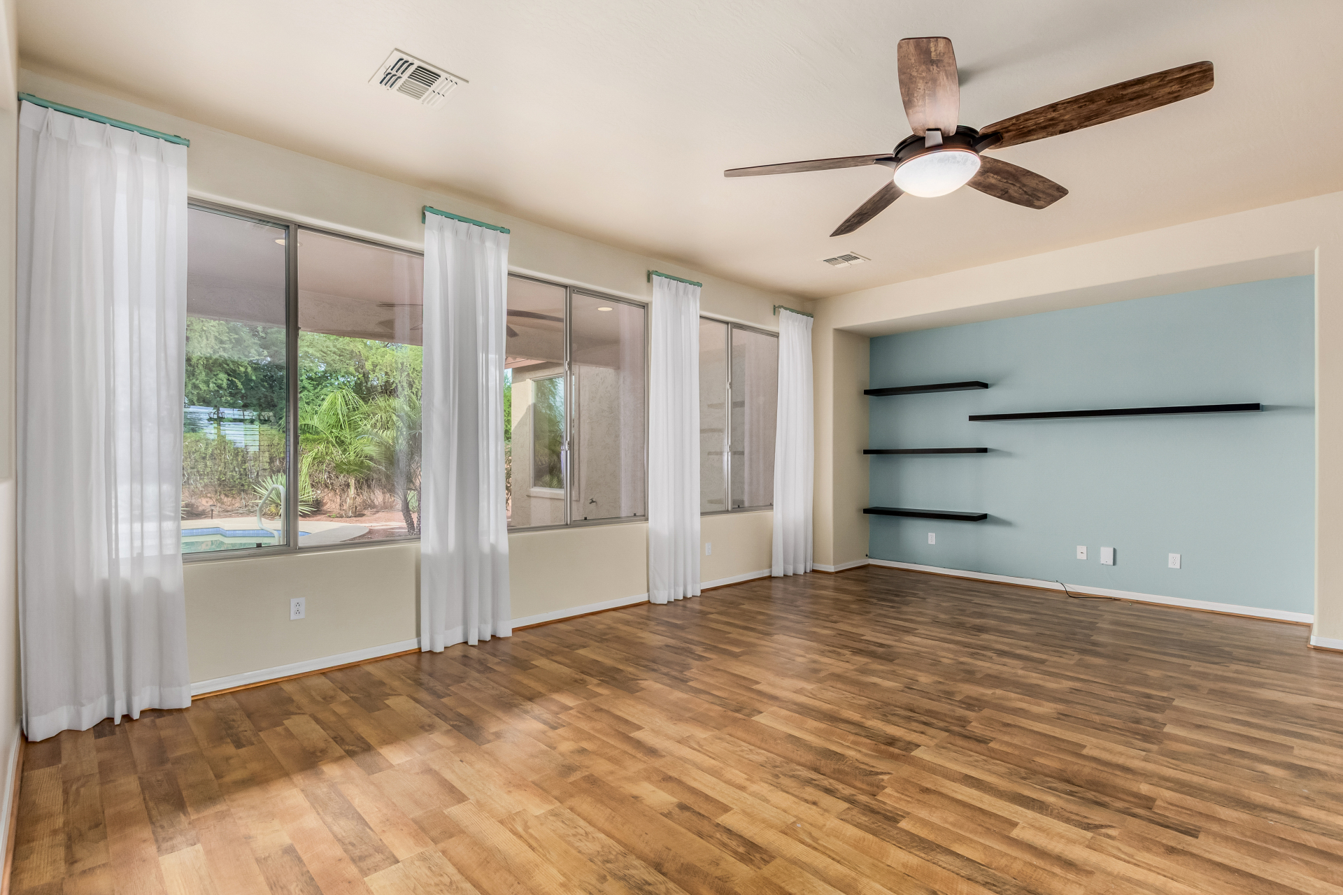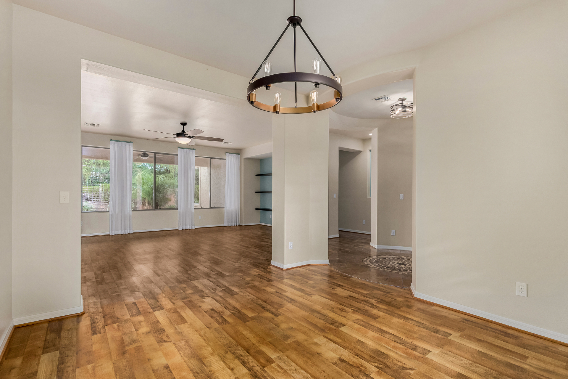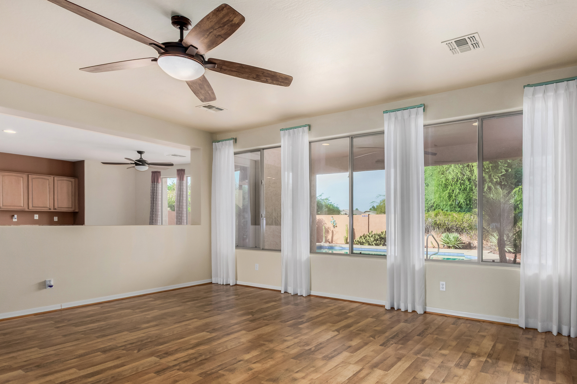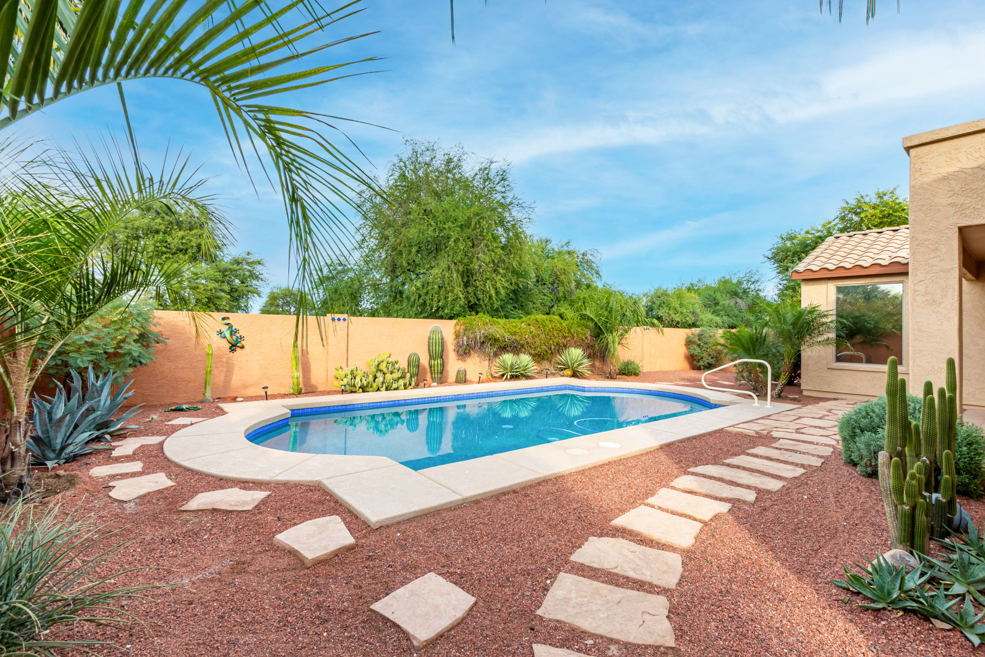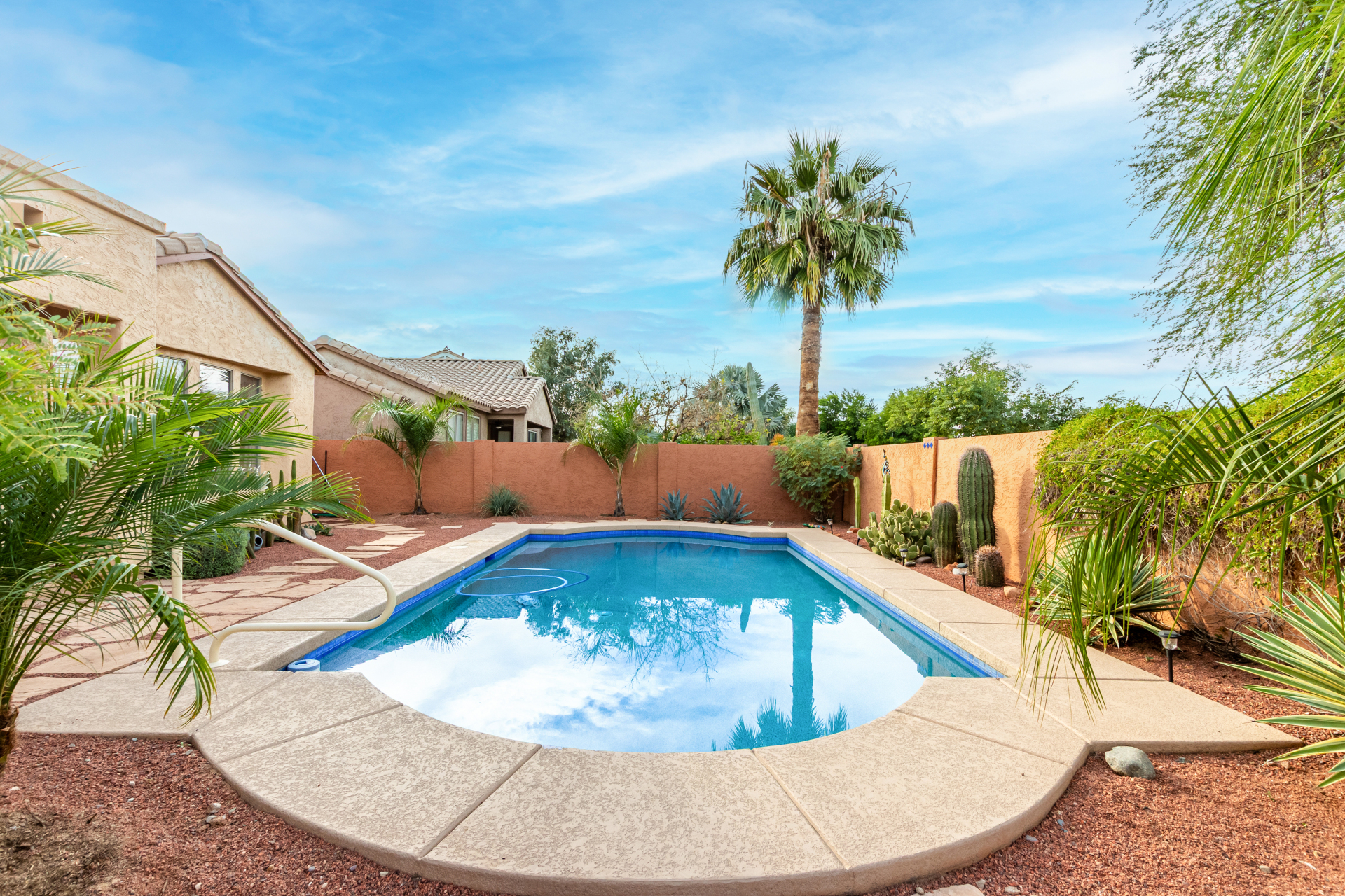 LOCATION + PRIVACY = PARADISE! This is an exceptional home in a great community on a beautiful lot sided by 2 parks~Desirable N/S lot~Lightly lived in, lovely well cared for, 3 bedroom, 2 bath & huge bonus room that can be 4th bedroom/office or games room, has it's own A/C~Large open bright kitchen, lots of maple cabinets & custom granite counters, big island, stainless appliances including a new induction/air fryer combination oven & pantry~Custom tile mosaic in foyer~Neutral décor~Open floor plan~Extended length garage~Easy maintenance desert landscaping & stucco block walls surround the refreshing Pebble finish in-ground pool~Large covered back patio~Freshly painted exterior~Close to all amenities, shopping, restaurants, Costco, sporting events & 303~True pride of Ownership, Must see!