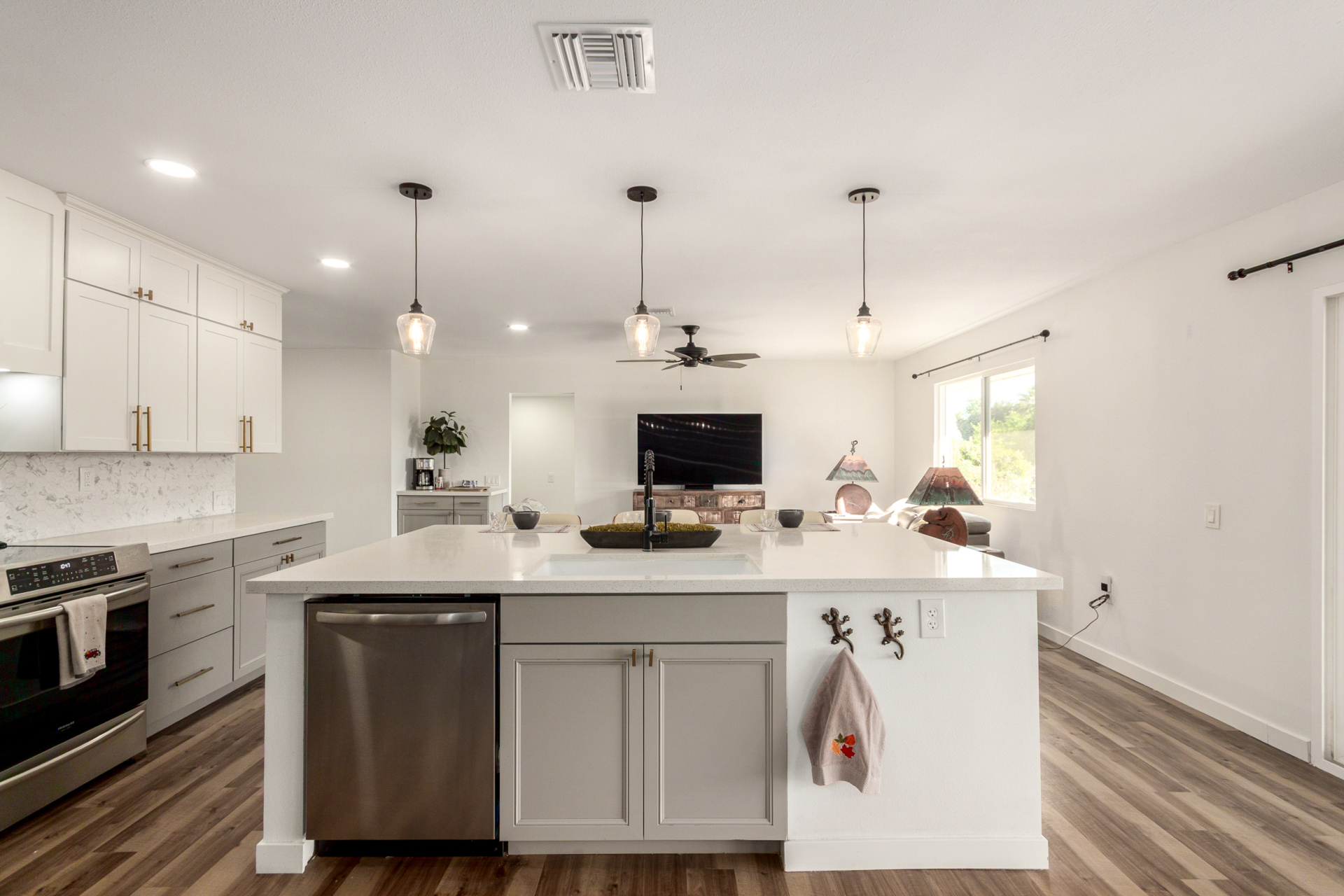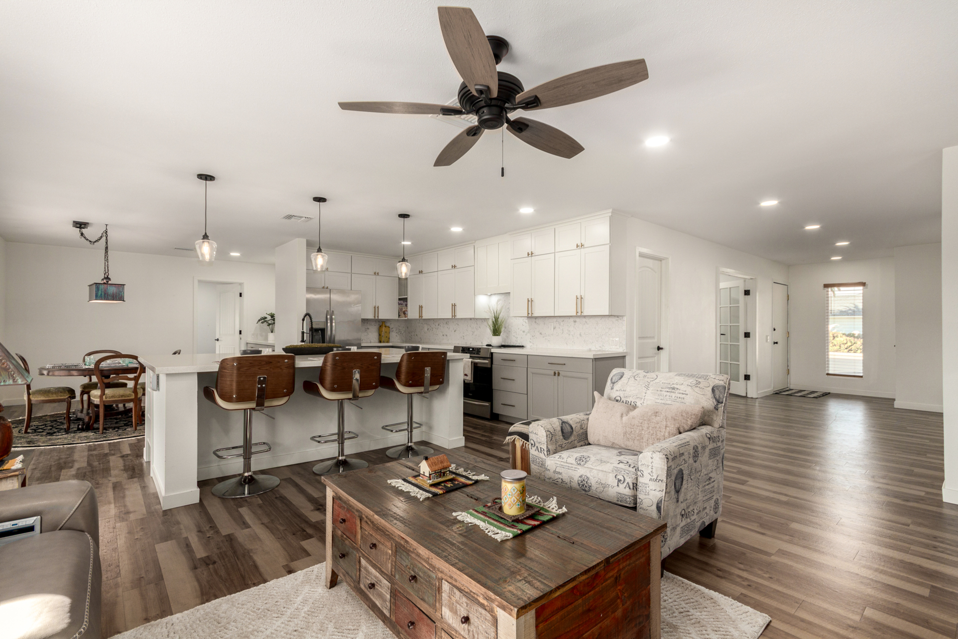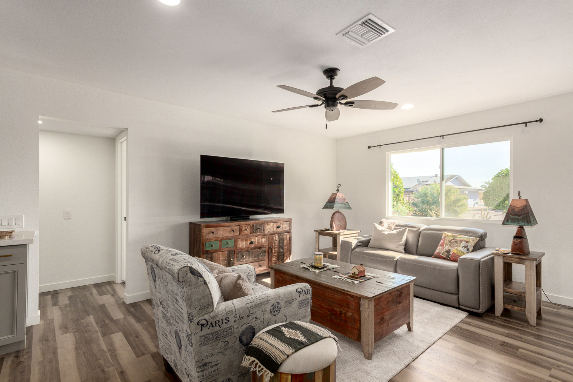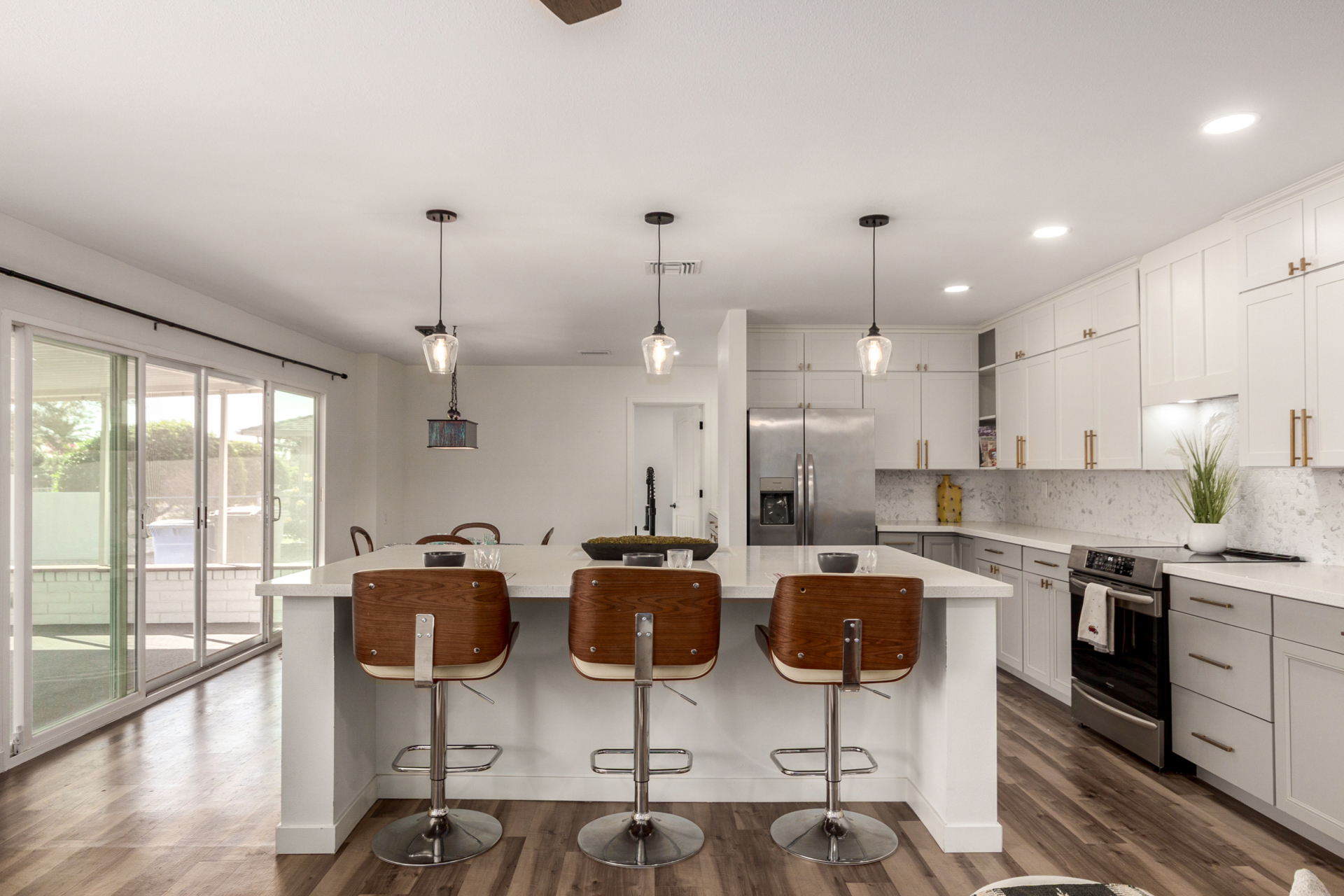 Discover *MODERN LIVING in the heart of Sun City! This stunning FULLY REMODELED 3 bed 2 bath home *Annapolis floorplan offering *CONTEMPORARY CHARM and comfort across 2060sq' of thoughtfully designed space. Enjoy the elegance of *LUXURY VINYL PLANK FLOORING, paired with an *OPEN CONCEPT LAYOUT with an attached *ARIZONA ROOM that's perfect for entertaining. The kitchen boasts *SS APPLIANCES, *QUARTZ COUNTERTOPS, backyard views, making it an entertainers dream. Relax in the spacious primary suite located in the rear of the home with a spa inspired bathroom and walk in closet! 2 bedroom is down the long hallway toward the front of the home. Large picture window allows for extra sunlight and privacy from the other bedrooms.