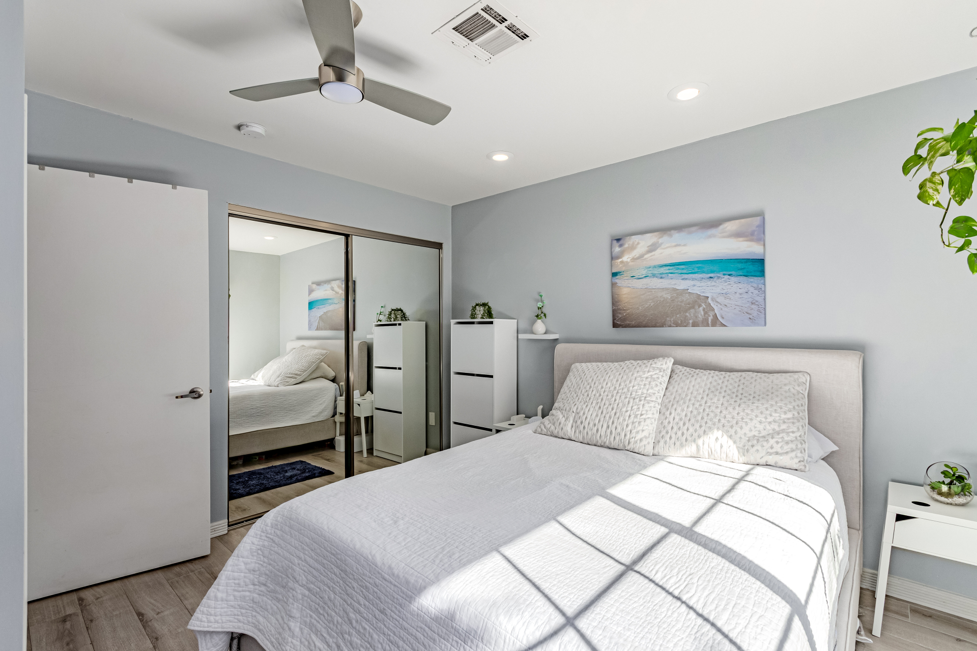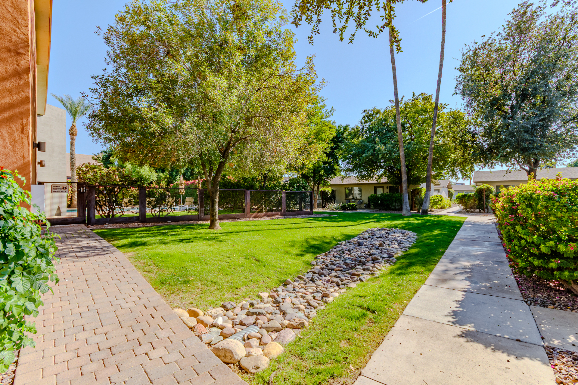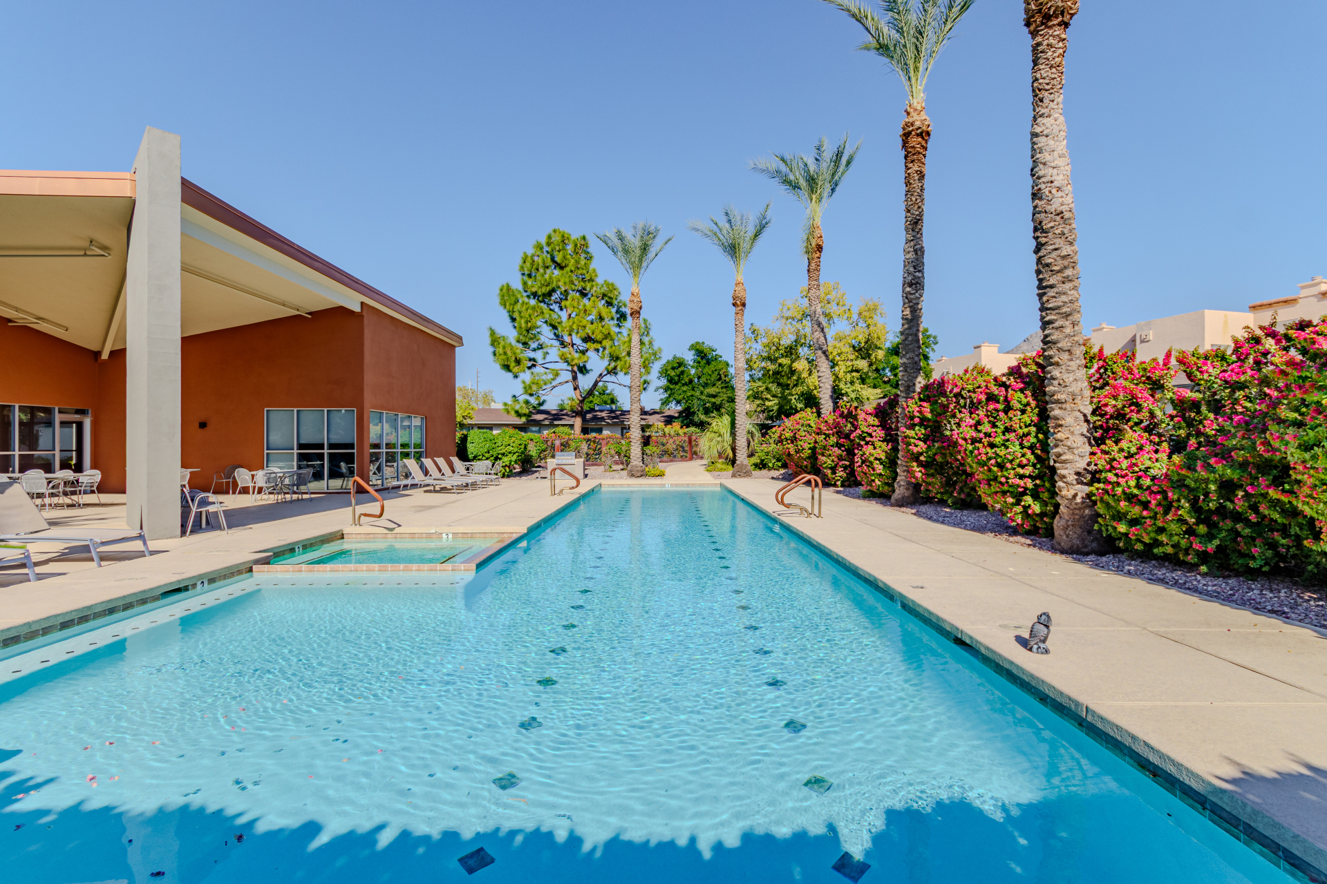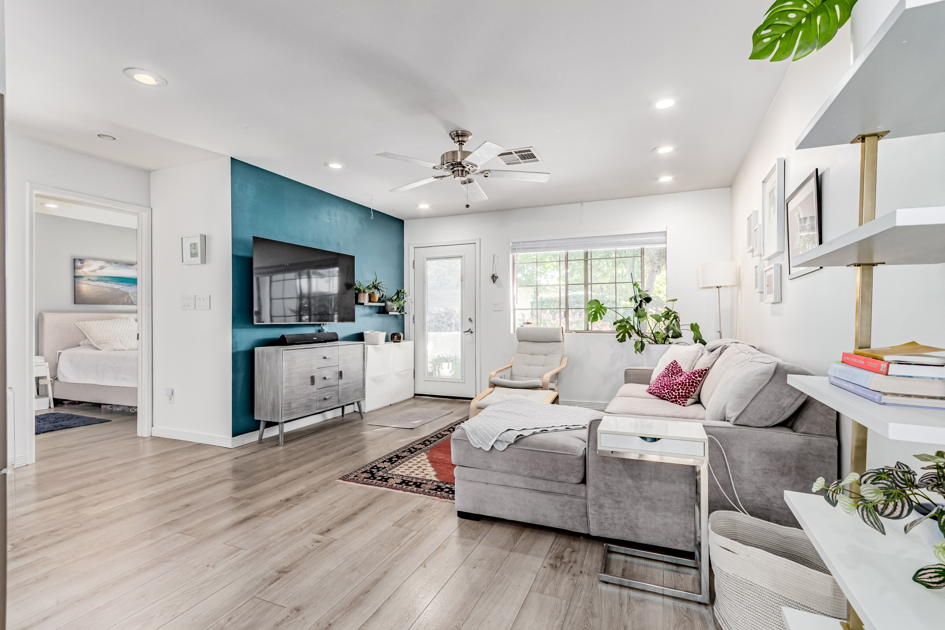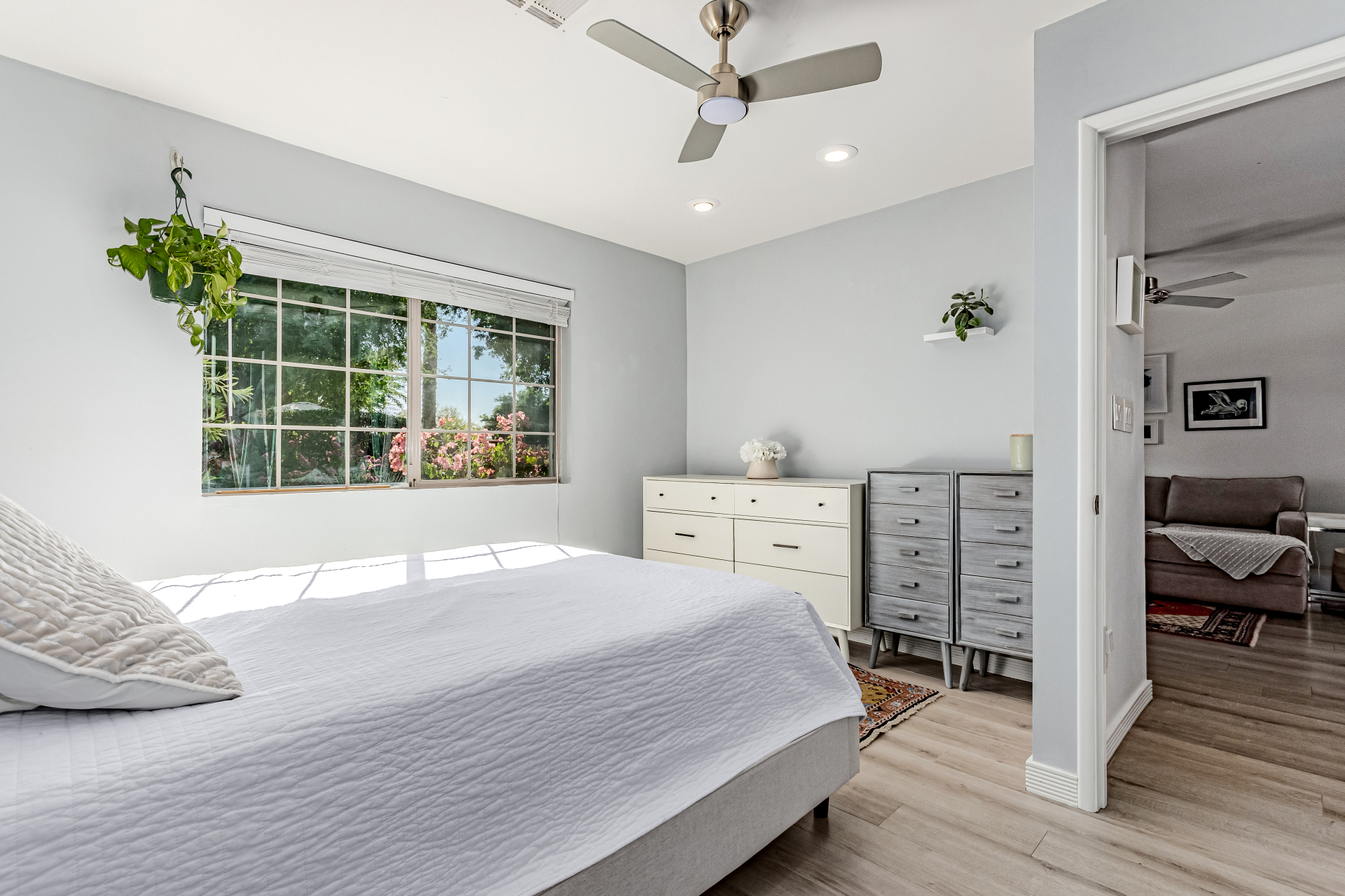 Discover all the charm of this lovely 2-bedroom/1-bathroom home! The vibrant landscape and cozy front patio are just the beginning. Inside, you'll find sizable living spaces with wood-look flooring, recessed lighting, abundant natural light, and stylish tones throughout, creating a cozy ambiance. The bright kitchen showcases ample cabinetry, tile backsplash, granite countertops, and built-in appliances. You'll love the spacious bedrooms, each with a closet with mirrored doors. Out back, you'll have a cozy patio to enjoy your morning brew and quiet evenings. Visit the community's pool, spa, tennis court, clubhouse, fitness center, and other amenities to fill your days with fun! Welcome home!
