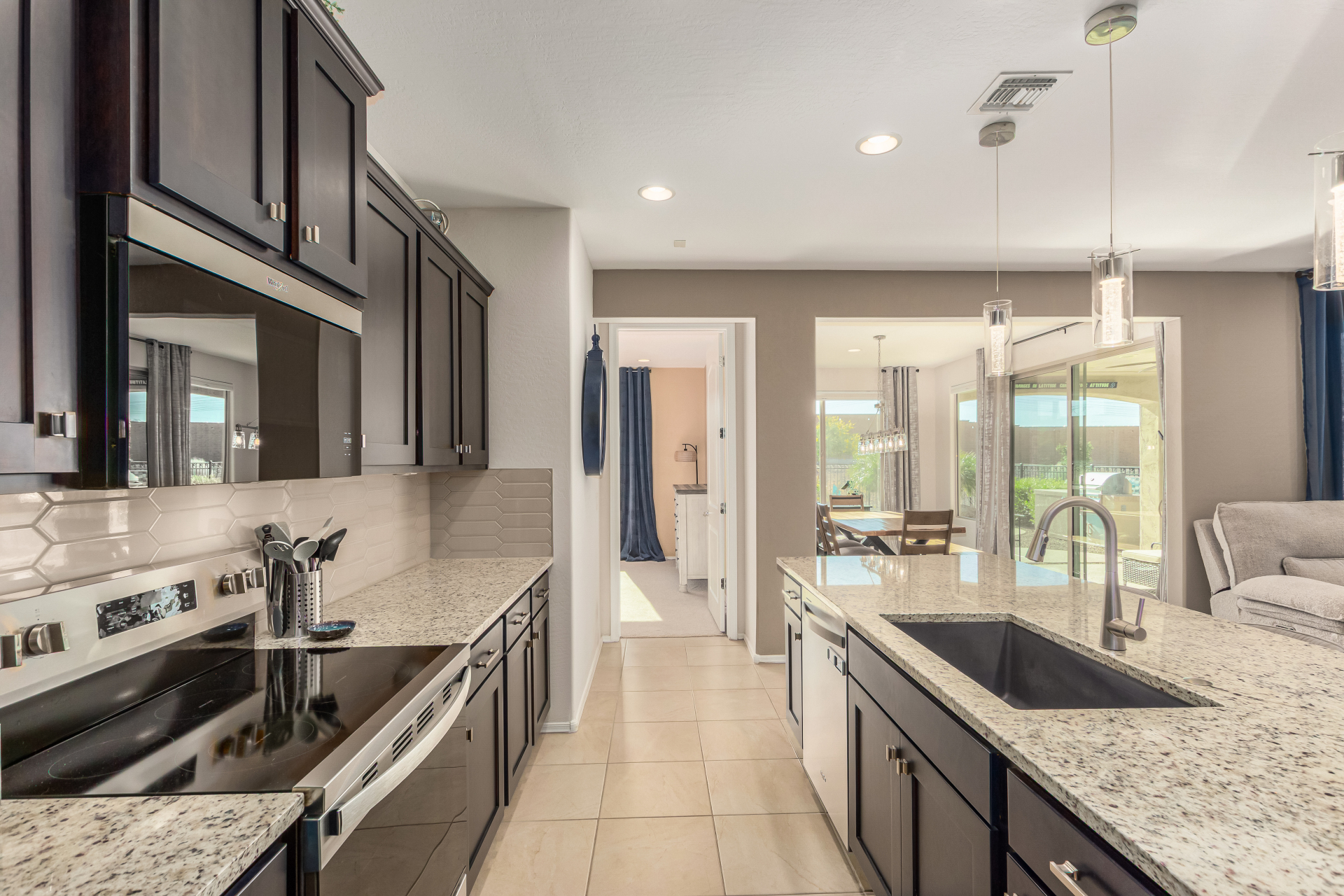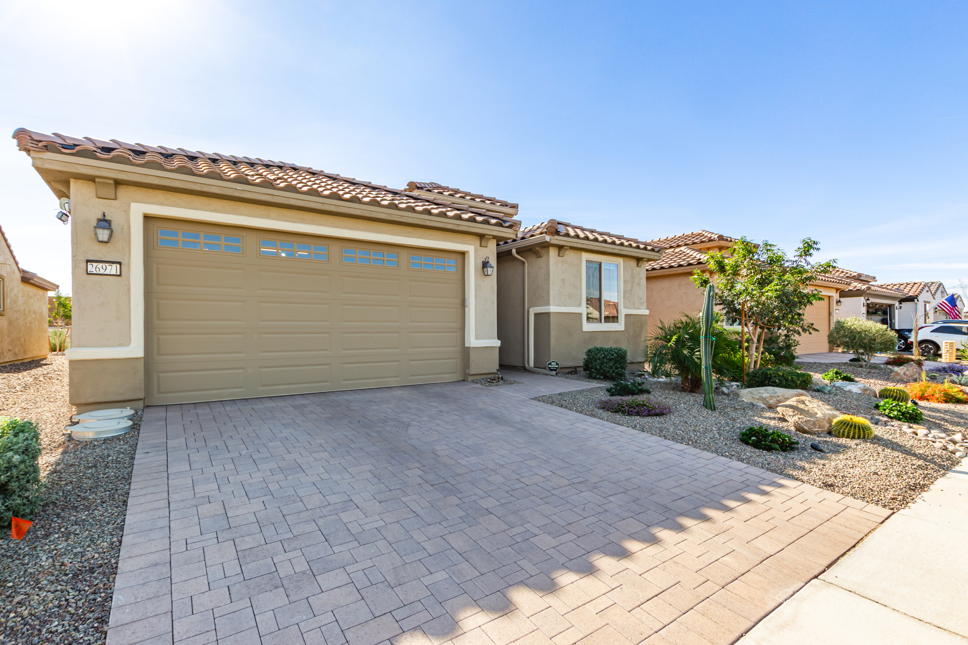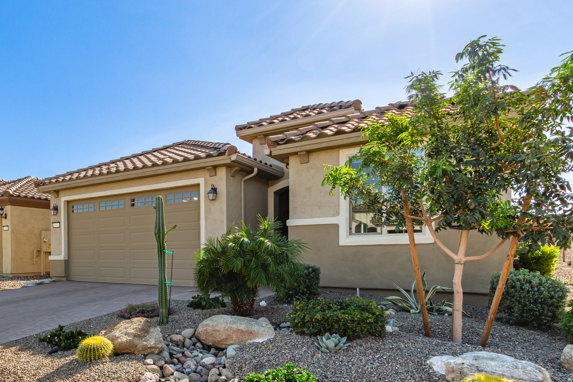 Welcome to resort-style living redefined in Sun City Festival — this 2023-built Pulte home pairs modern design with low-maintenance luxury, creating the perfect 55+ desert retreat. The single-level Odyssey floor plan offers 2 bedrooms, 2 baths, and 1,524 sq ft of thoughtfully upgraded living space. Step inside to find 8-foot doors, designer lighting, upgraded tile and carpet, and a bright, open layout that feels brand new. The kitchen features a granite island, Whirlpool stainless appliances, tile backsplash, pendant lighting, and a coffee bar nook with a walk-in pantry. The dining area includes a shiplap accent wall and upgraded fixtures, while the great room offers surround sound for an immersive entertainment experience. The primary suite features a custom tile accent wall, walk-in shower with bench, and upgraded mirrors. The laundry room includes upper and lower cabinetry, dual countertops (one pre-plumbed for a sink), and a hanging bar. Samsung washer and dryer are negotiable.