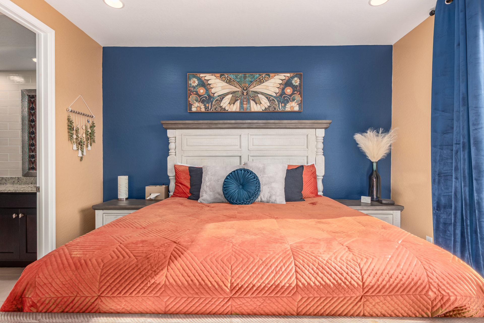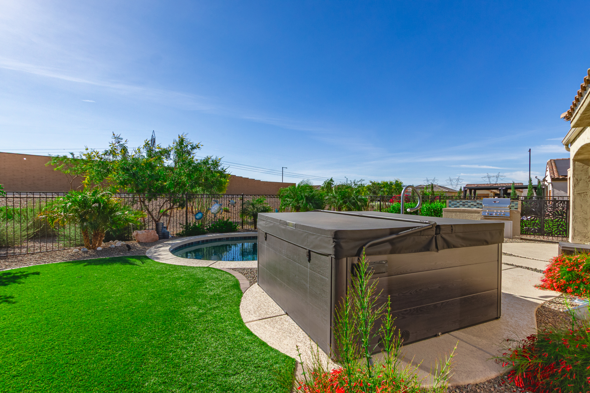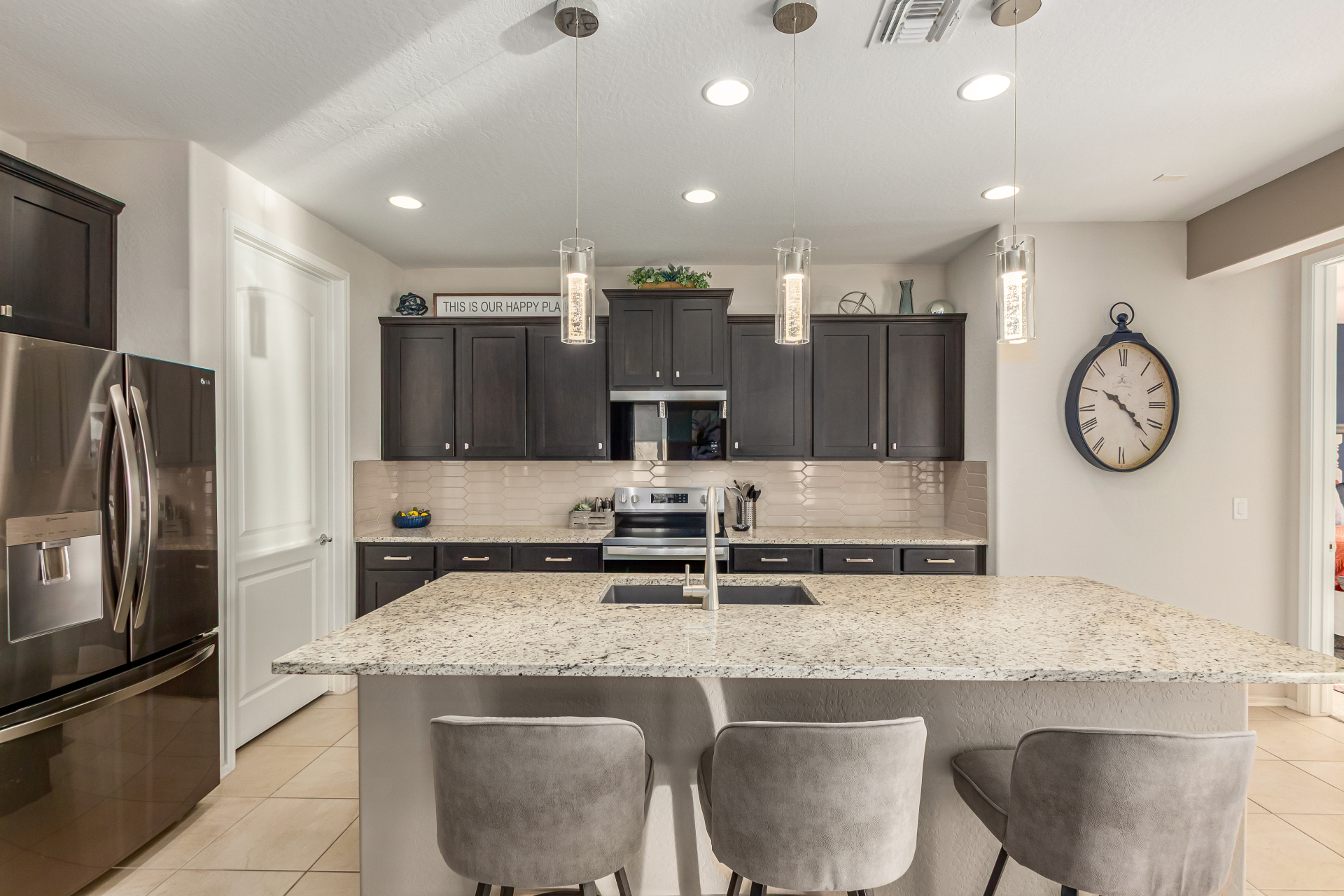 Welcome to resort-style living redefined in Sun City Festival — this 2023-built Pulte home pairs modern design with low-maintenance luxury, creating the perfect 55+ desert retreat. The single-level Odyssey floor plan offers 2 bedrooms, 2 baths, and 1,524 sq ft of thoughtfully upgraded living space. Step inside to find 8-foot doors, designer lighting, upgraded tile and carpet, and a bright, open layout that feels brand new. The kitchen features a granite island, Whirlpool stainless appliances, tile backsplash, pendant lighting, and a coffee bar nook with a walk-in pantry. The dining area includes a shiplap accent wall and upgraded fixtures, while the great room offers surround sound for an immersive entertainment experience. The primary suite features a custom tile accent wall, walk-in shower with bench, and upgraded mirrors. The laundry room includes upper and lower cabinetry, dual countertops (one pre-plumbed for a sink), and a hanging bar. Samsung washer and dryer are negotiable.