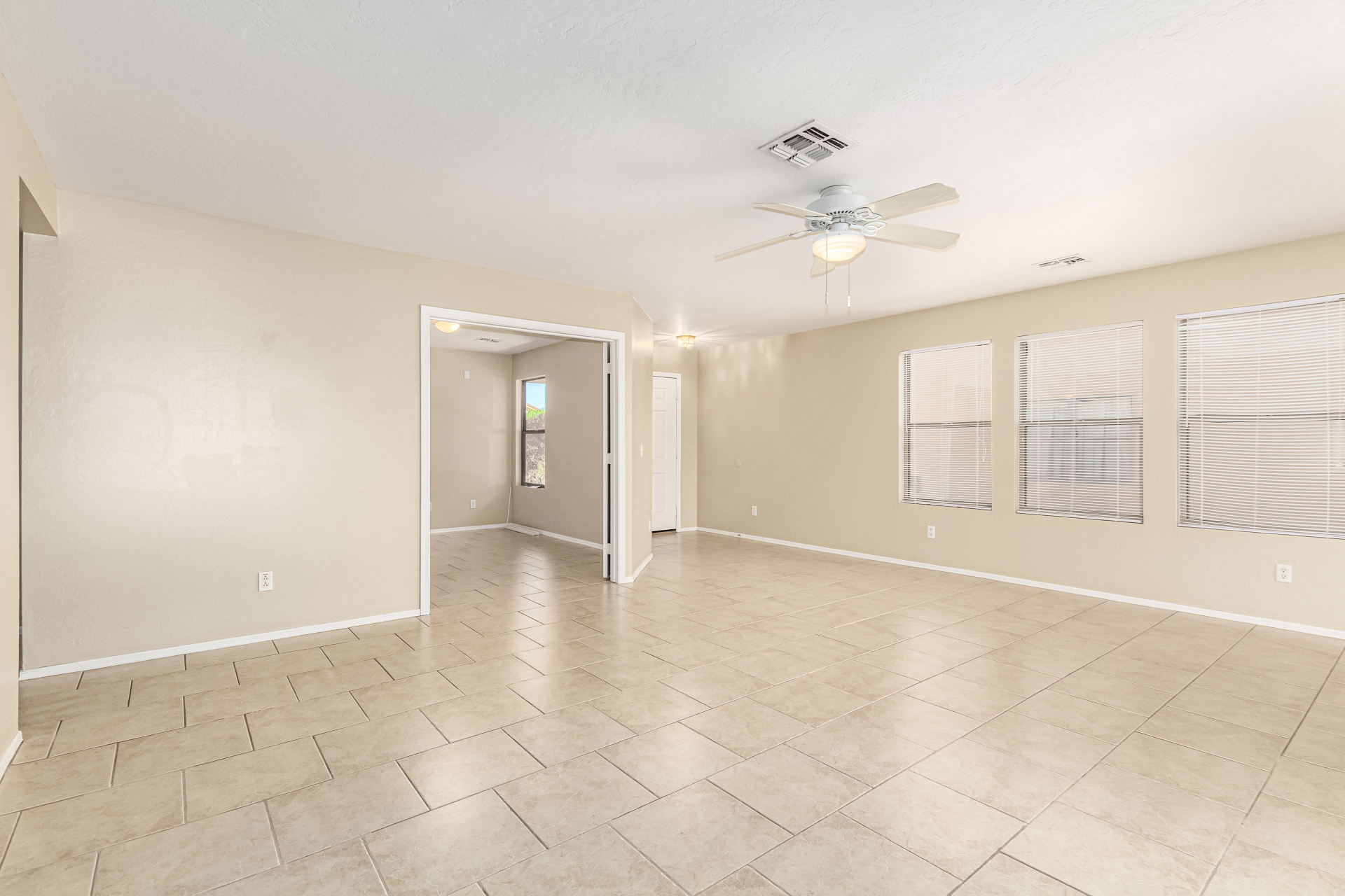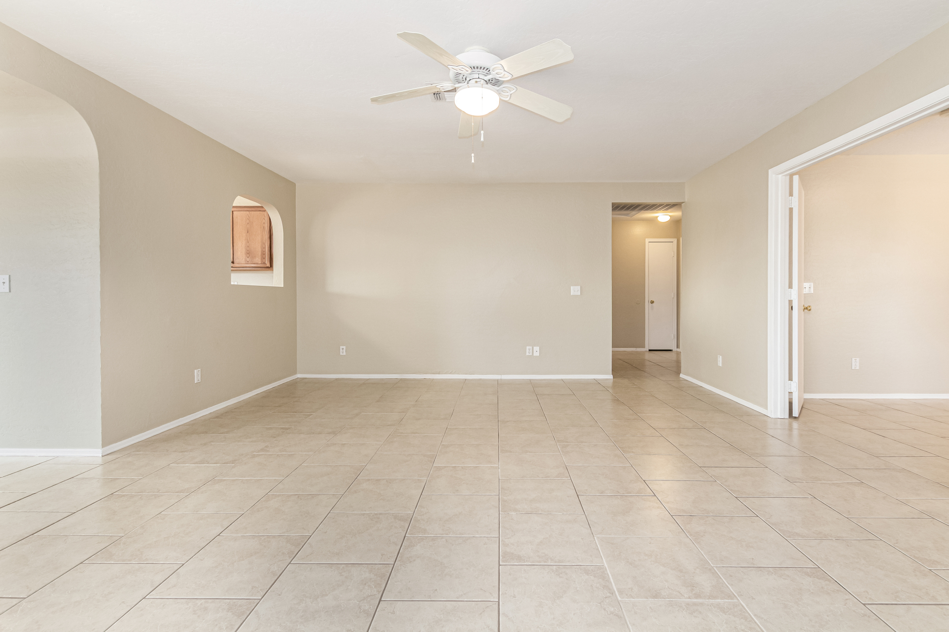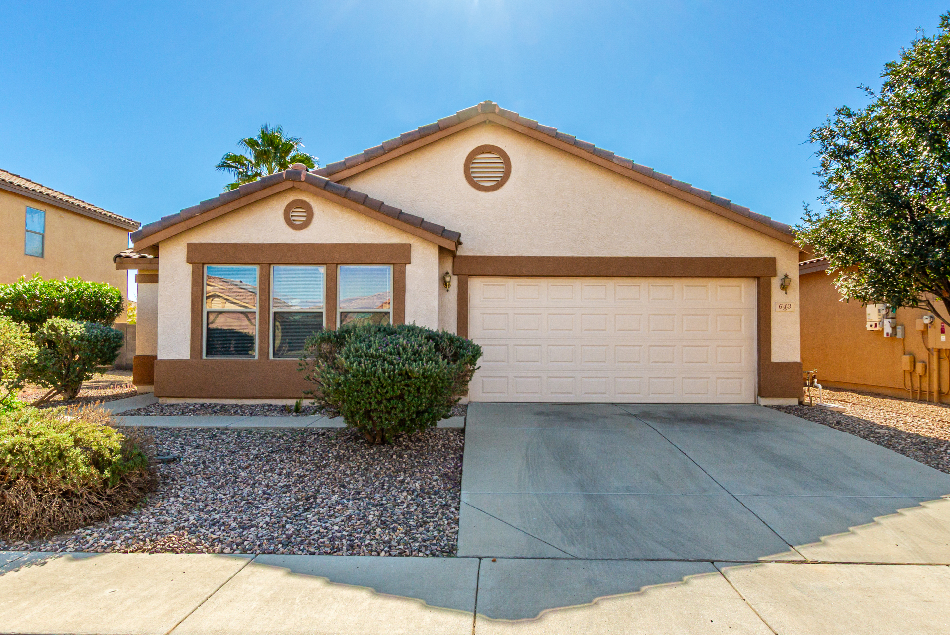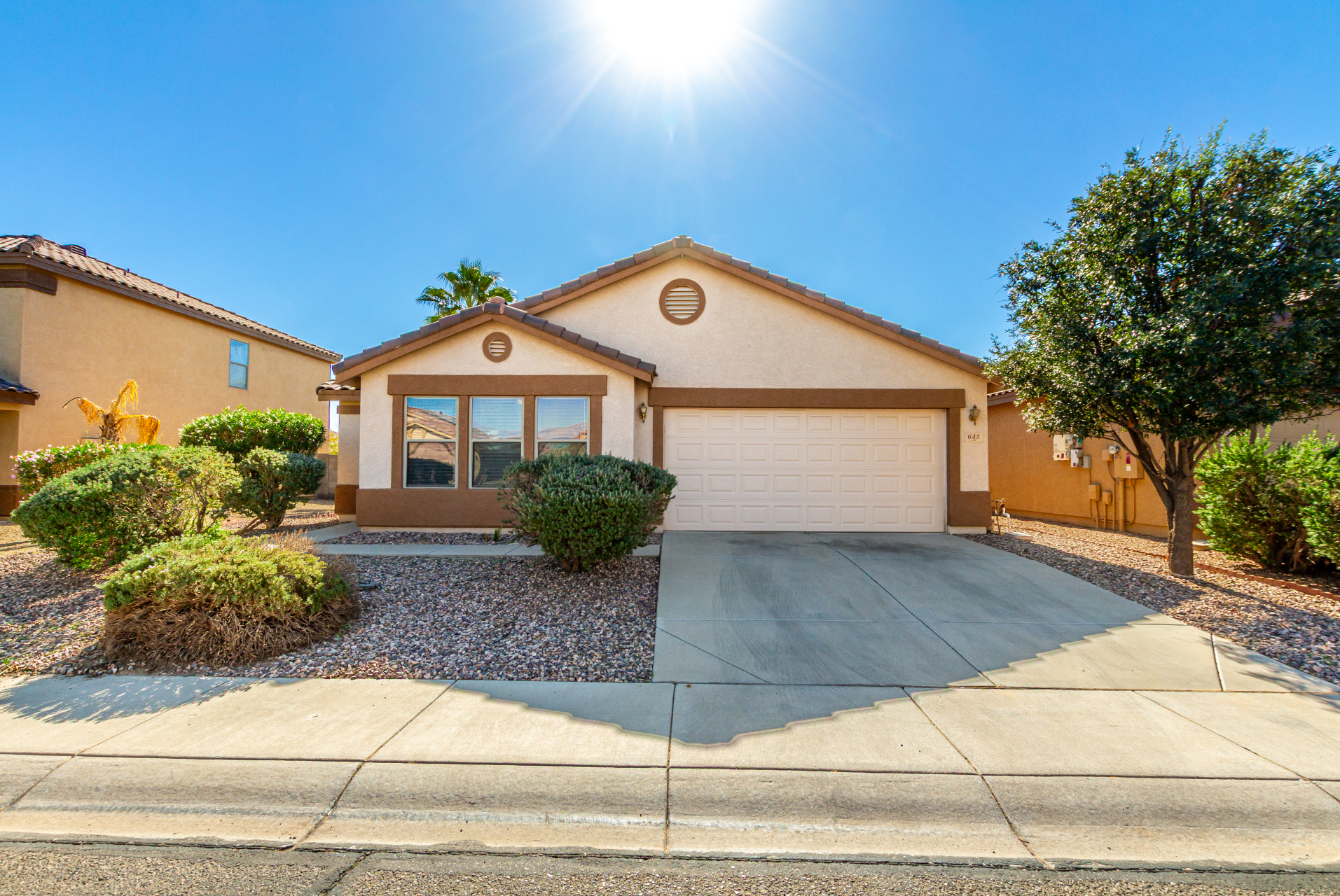 Become the proud owner of this well-maintained, lovely 3-bedroom, 2-bath + Office home in SK Ranch! Located on a quiet cul-de-sac. You'll be delighted by the serene living room with a soothing palette, blinds, and durable tile flooring for easy maintenance. The eat-in kitchen features ample wood cabinetry, stainless steel appliances, a pantry, and an island with a breakfast bar for casual meals. You'll also find a versatile den ideal for an office or a quiet study. The primary bedroom features soft carpeting, a walk-in closet, and a private bathroom with dual sinks for an efficient daily routine. Unwind at the end of a long day in the backyard, which features a covered patio and ample space to craft your dream outdoor oasis. Don't miss out on this fantastic opportunity!
