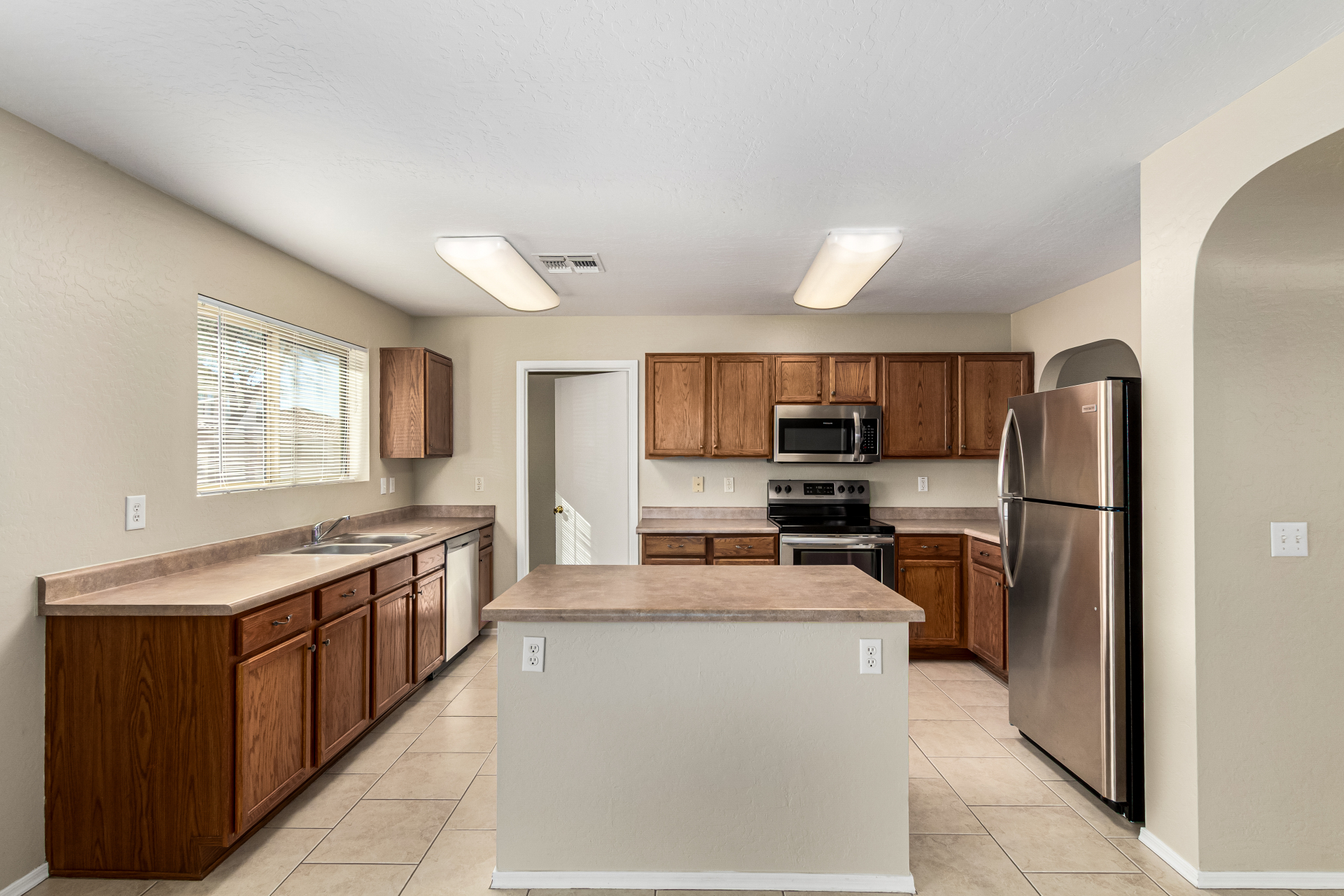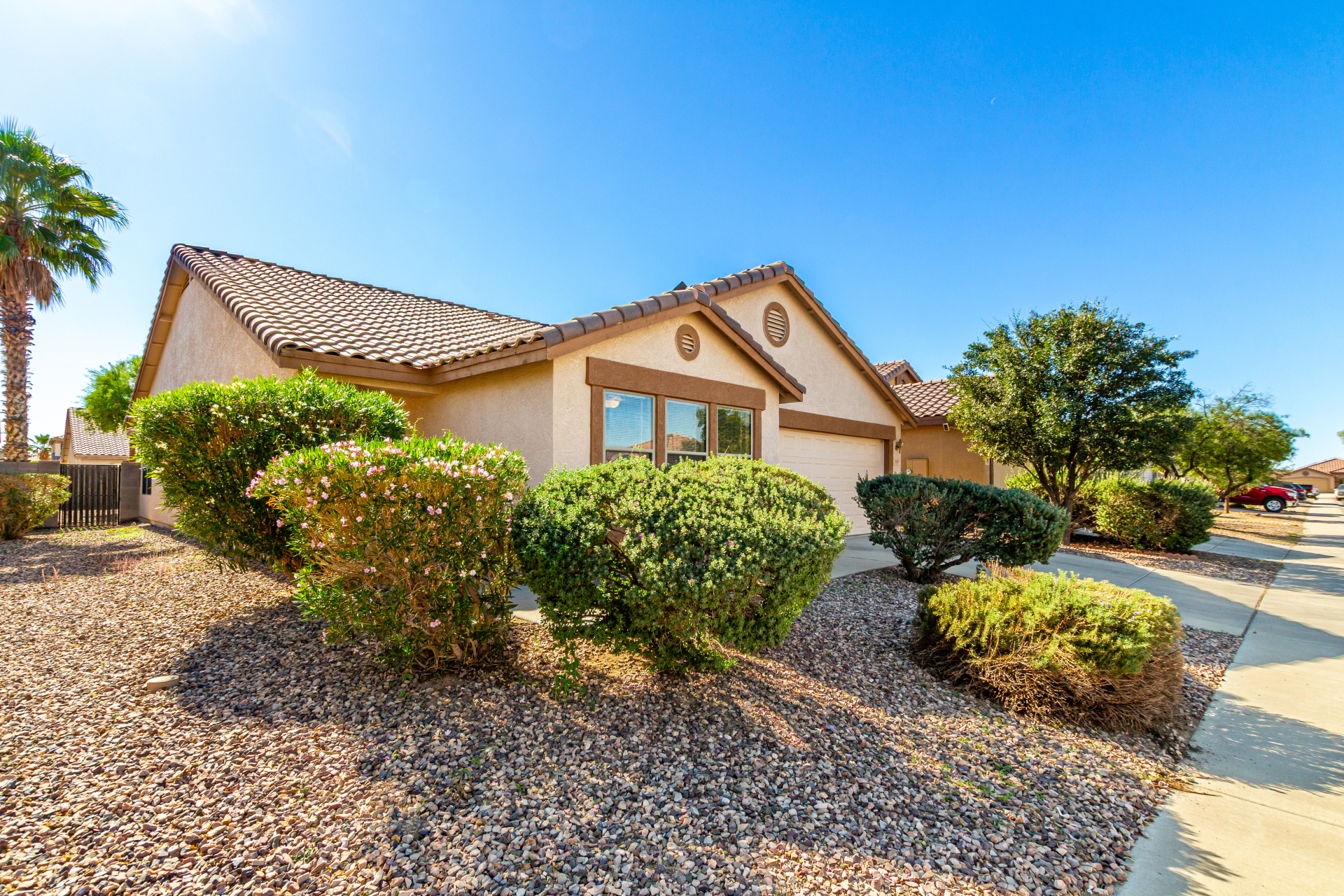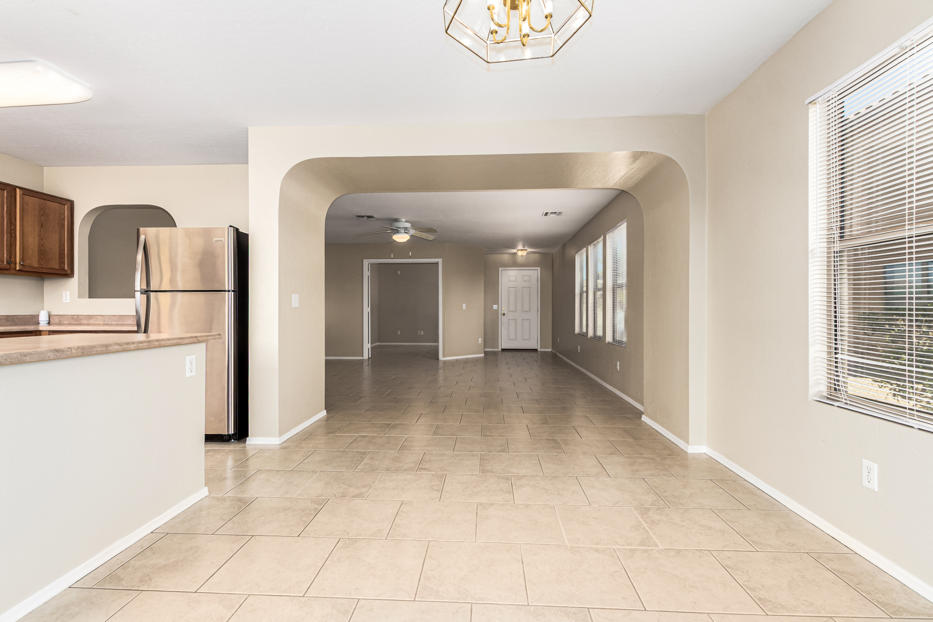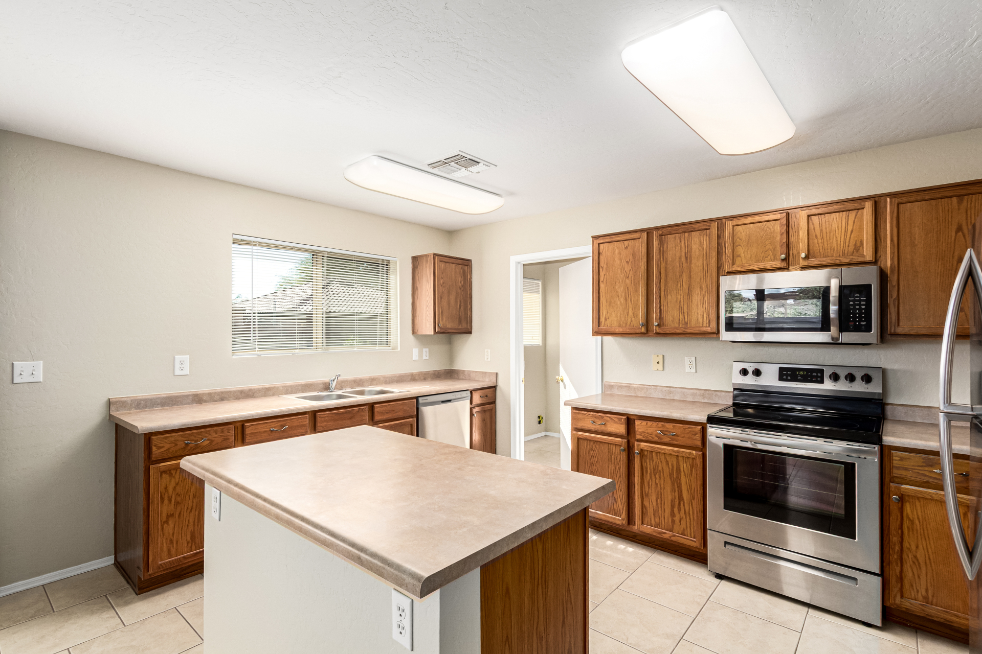 Become the proud owner of this well-maintained, lovely 3-bedroom, 2-bath + Office home in SK Ranch! Located on a quiet cul-de-sac. You'll be delighted by the serene living room with a soothing palette, blinds, and durable tile flooring for easy maintenance. The eat-in kitchen features ample wood cabinetry, stainless steel appliances, a pantry, and an island with a breakfast bar for casual meals. You'll also find a versatile den ideal for an office or a quiet study. The primary bedroom features soft carpeting, a walk-in closet, and a private bathroom with dual sinks for an efficient daily routine. Unwind at the end of a long day in the backyard, which features a covered patio and ample space to craft your dream outdoor oasis. Don't miss out on this fantastic opportunity!