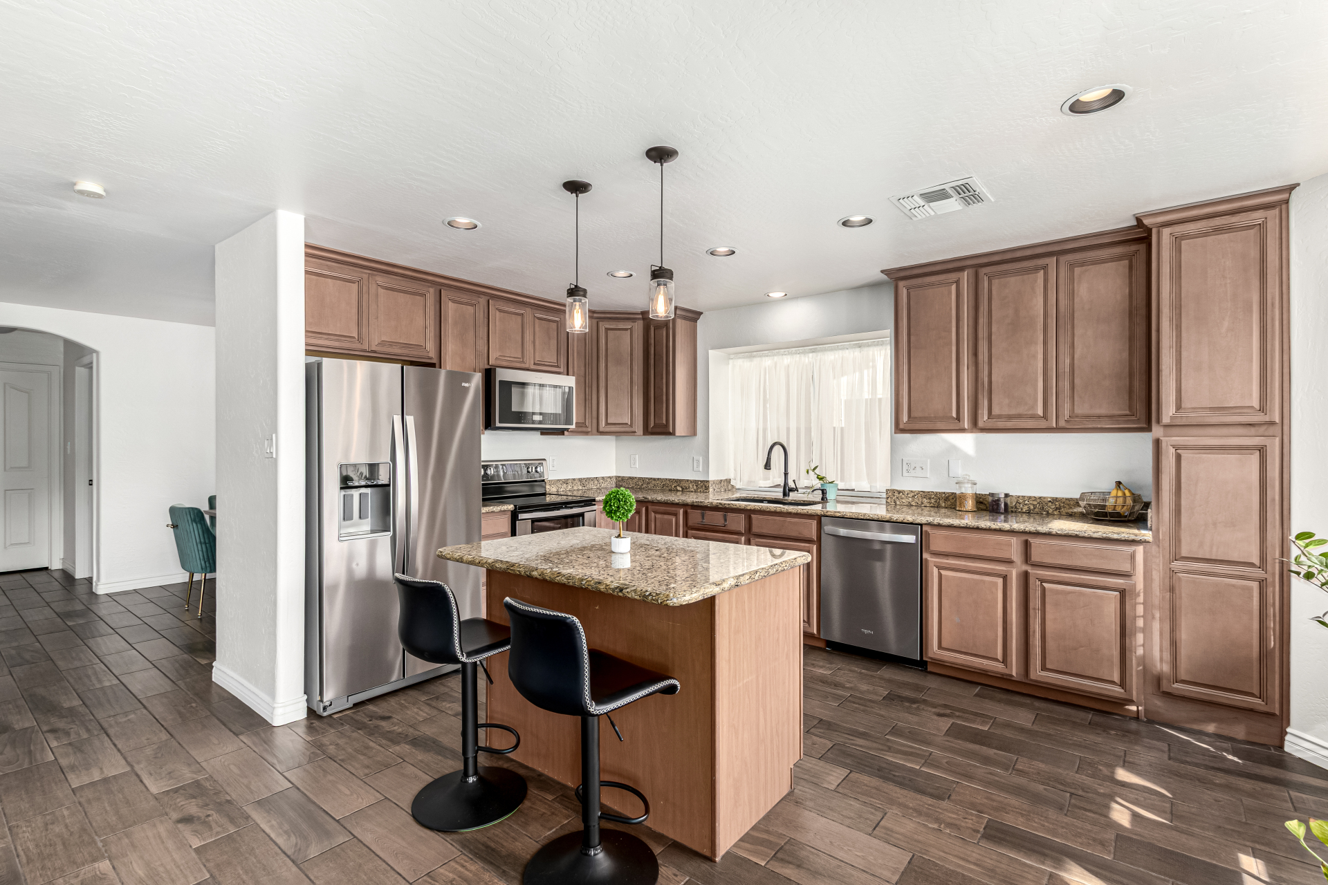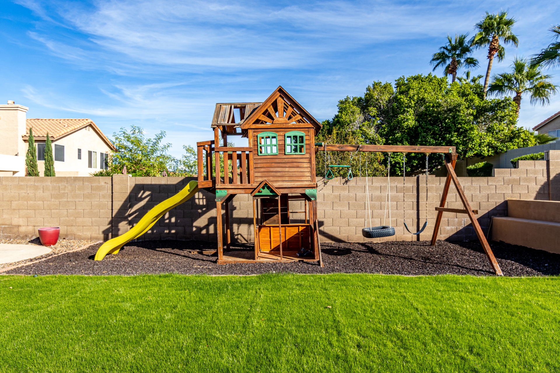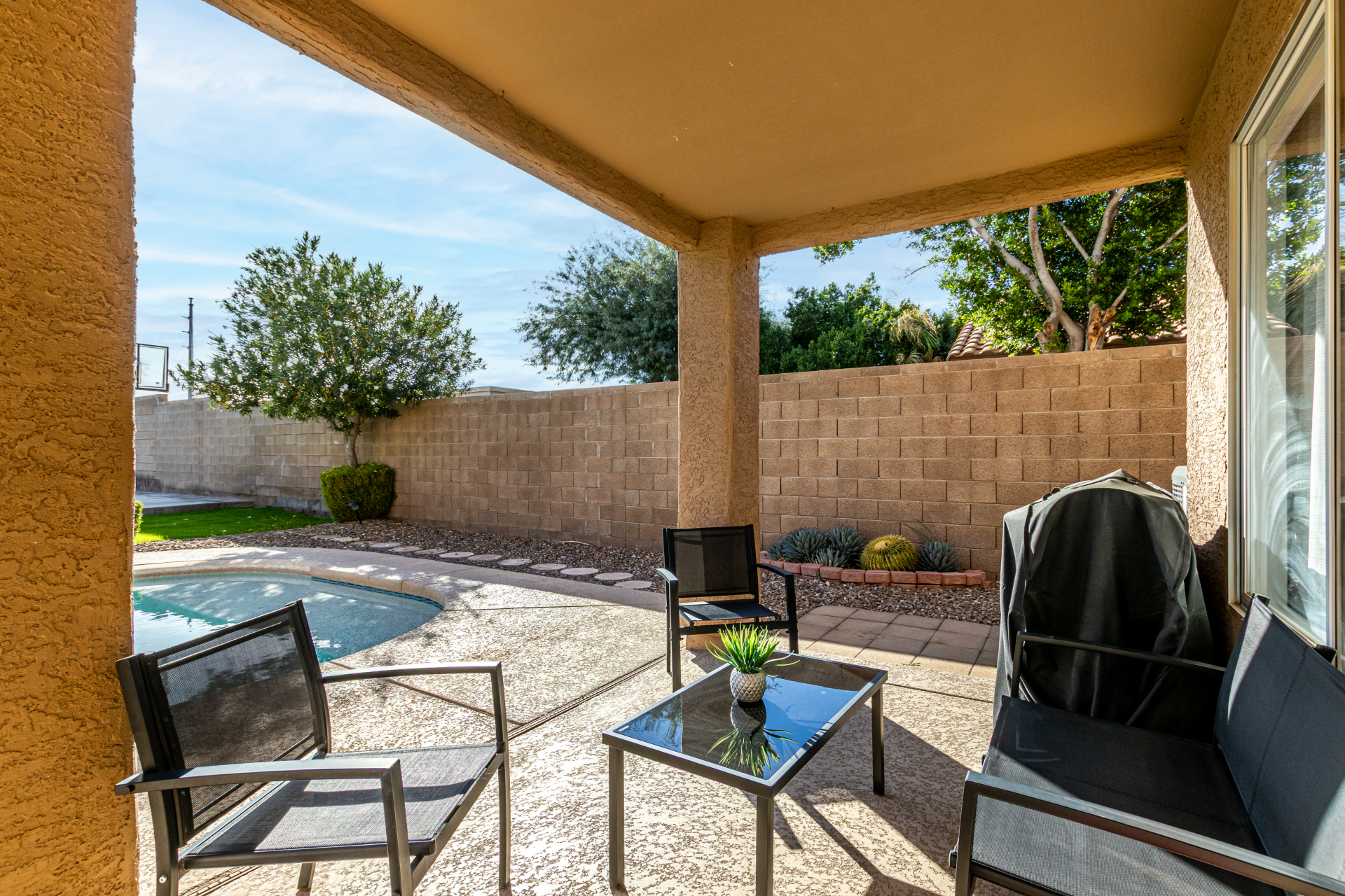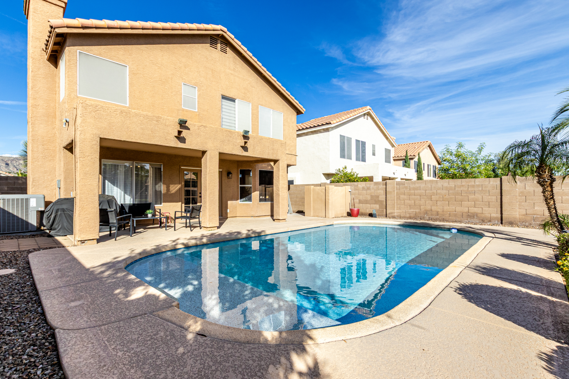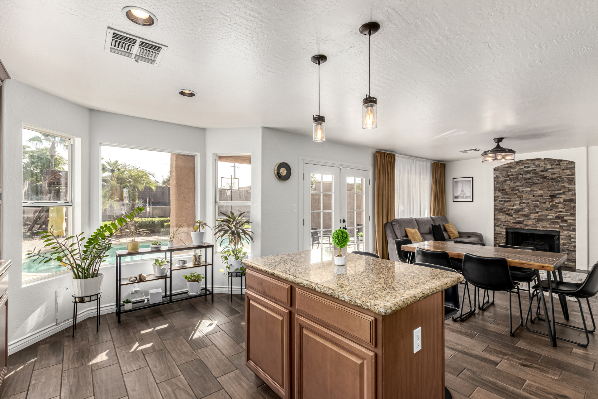 Welcome to Ahwatukee Foothills—where Mountain Living meets relaxed lifestyle. This thoughtfully designed 4-bed, 3-bath home flows beautifully, featuring warm wood-look tile, granite countertops, custom cabinetry, and a striking stone wall fireplace anchoring the main living space. The serene primary suite overlooks the backyard and offers an large walk-in closet. The en-suite bath feels spa-inspired with ceramic tile, a custom vanity, walk-in shower, and a deep soaking tub made for unwinding. Step through French doors to a true backyard oasis—sparkling pool, sport court, and play yard—perfect for everyday living and effortless entertaining. Minutes to South Mountain's breathtaking views and miles of hiking and biking trails. Dining|Shopping are right down the street. Welcome Home!