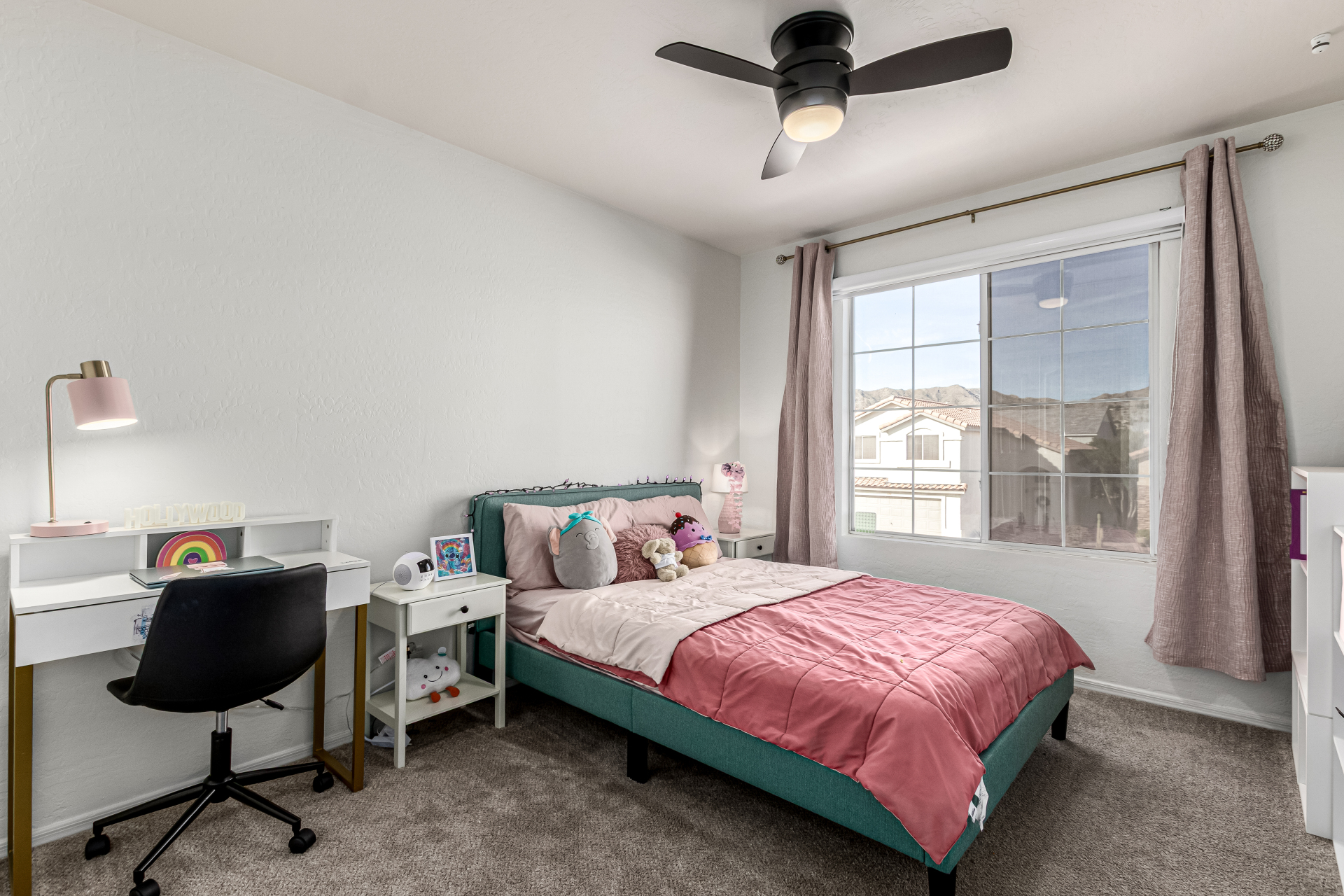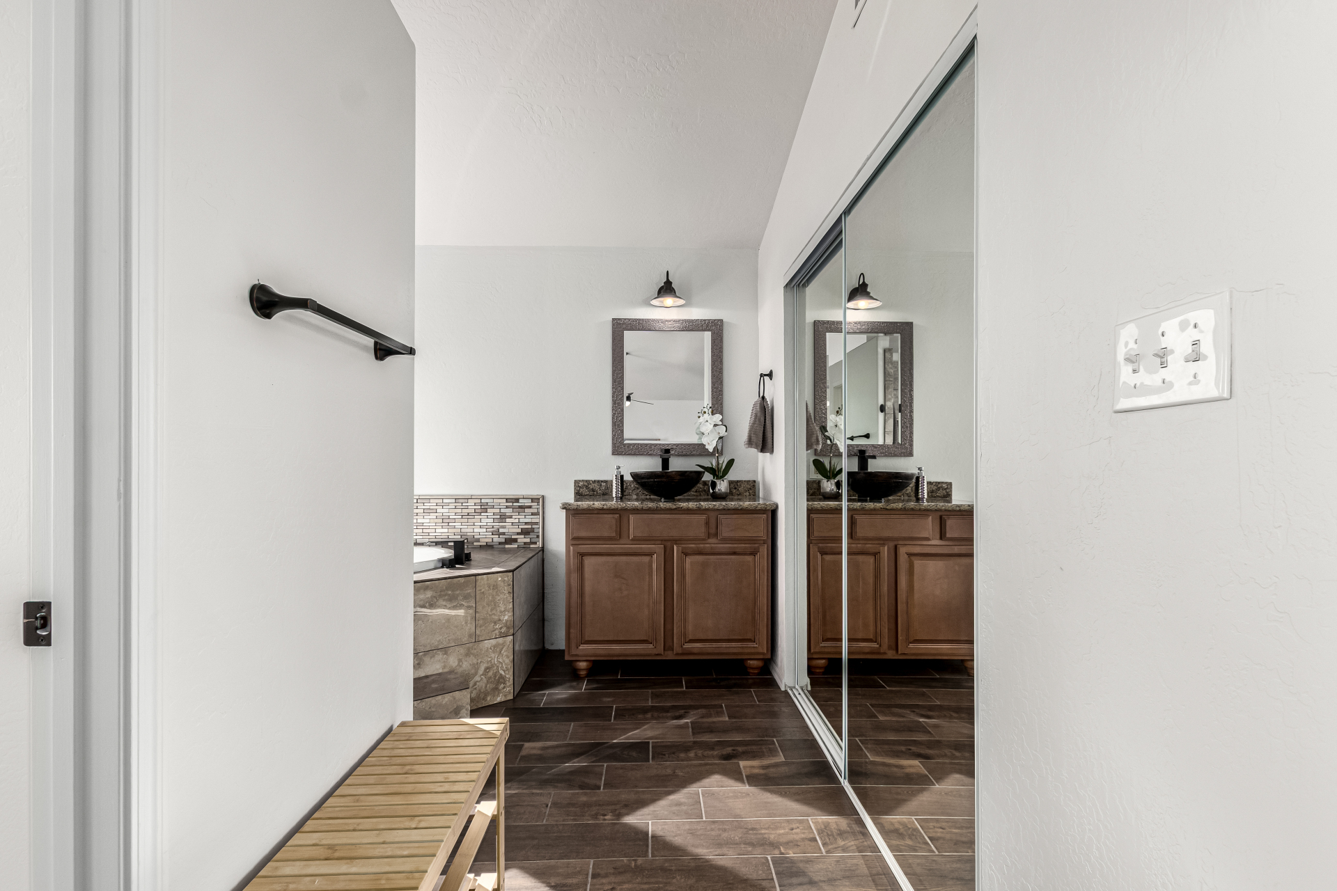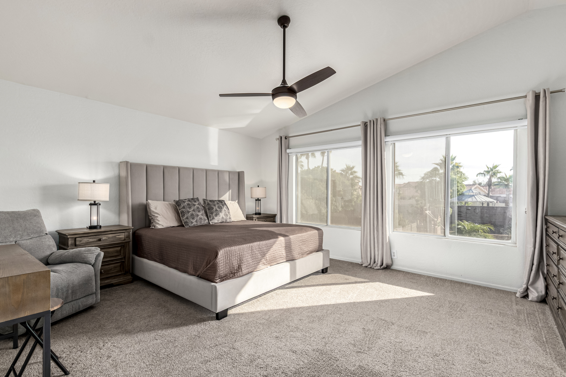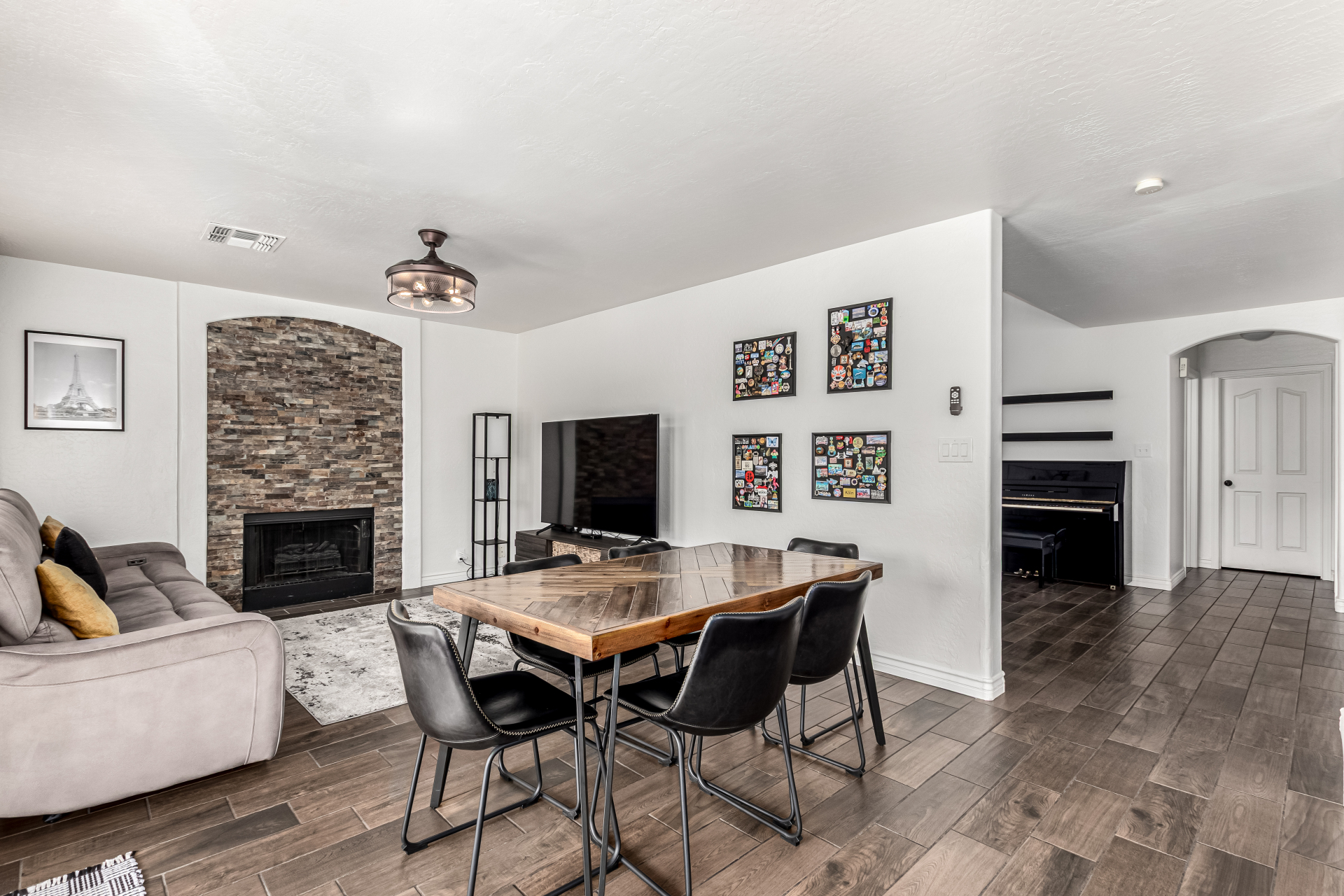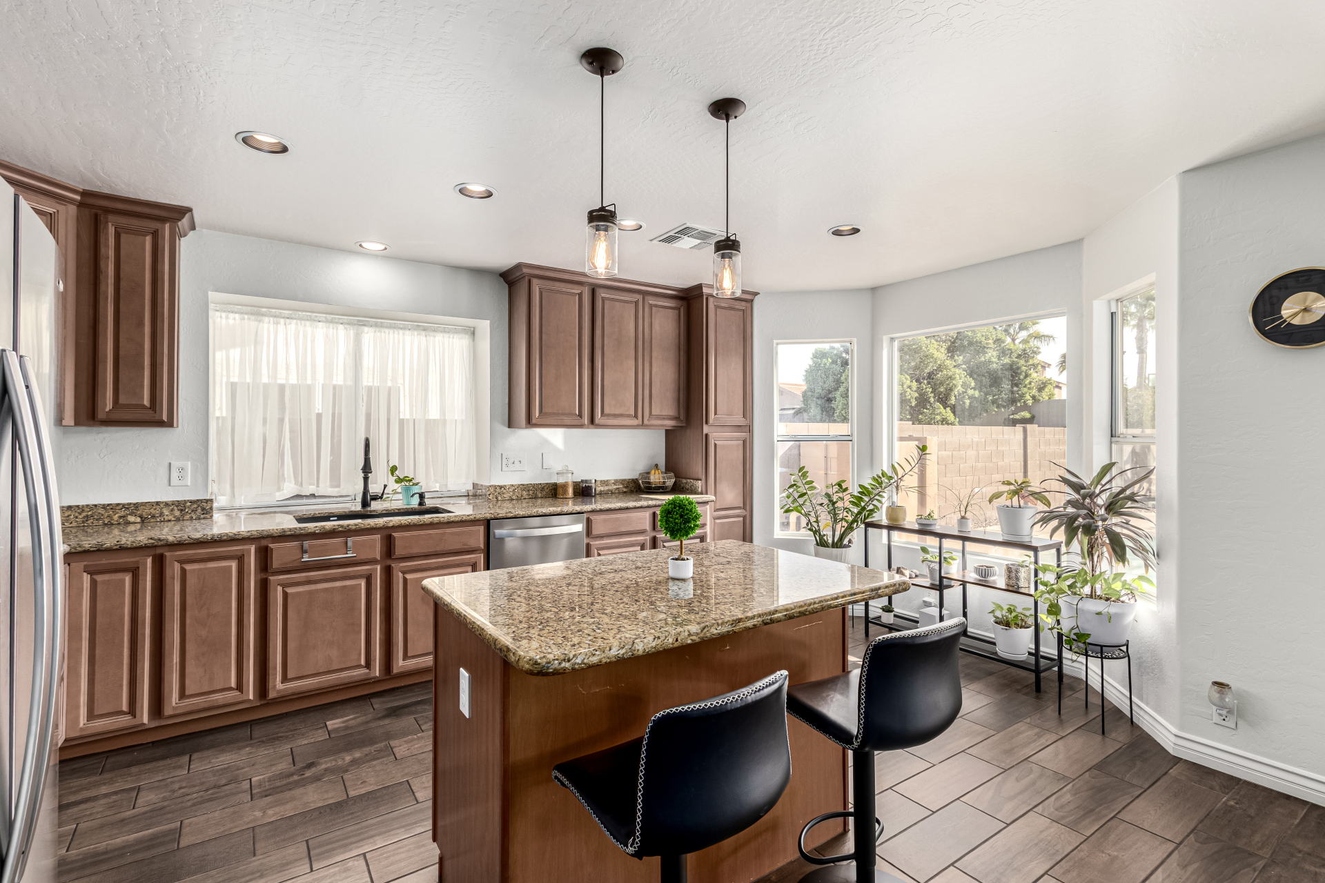 Welcome to Ahwatukee Foothills—where Mountain Living meets relaxed lifestyle. This thoughtfully designed 4-bed, 3-bath home flows beautifully, featuring warm wood-look tile, granite countertops, custom cabinetry, and a striking stone wall fireplace anchoring the main living space. The serene primary suite overlooks the backyard and offers an large walk-in closet. The en-suite bath feels spa-inspired with ceramic tile, a custom vanity, walk-in shower, and a deep soaking tub made for unwinding. Step through French doors to a true backyard oasis—sparkling pool, sport court, and play yard—perfect for everyday living and effortless entertaining. Minutes to South Mountain's breathtaking views and miles of hiking and biking trails. Dining|Shopping are right down the street. Welcome Home!