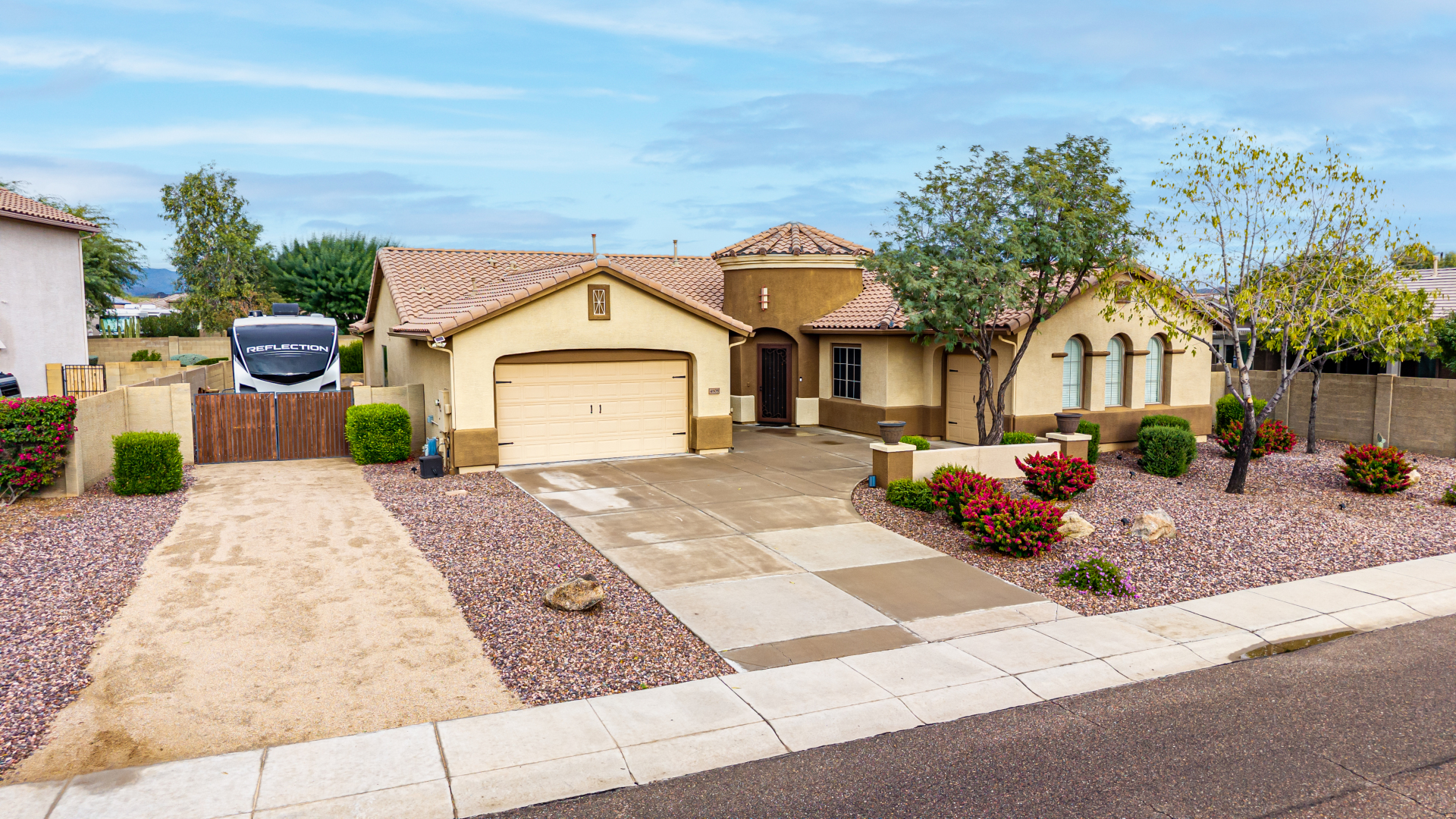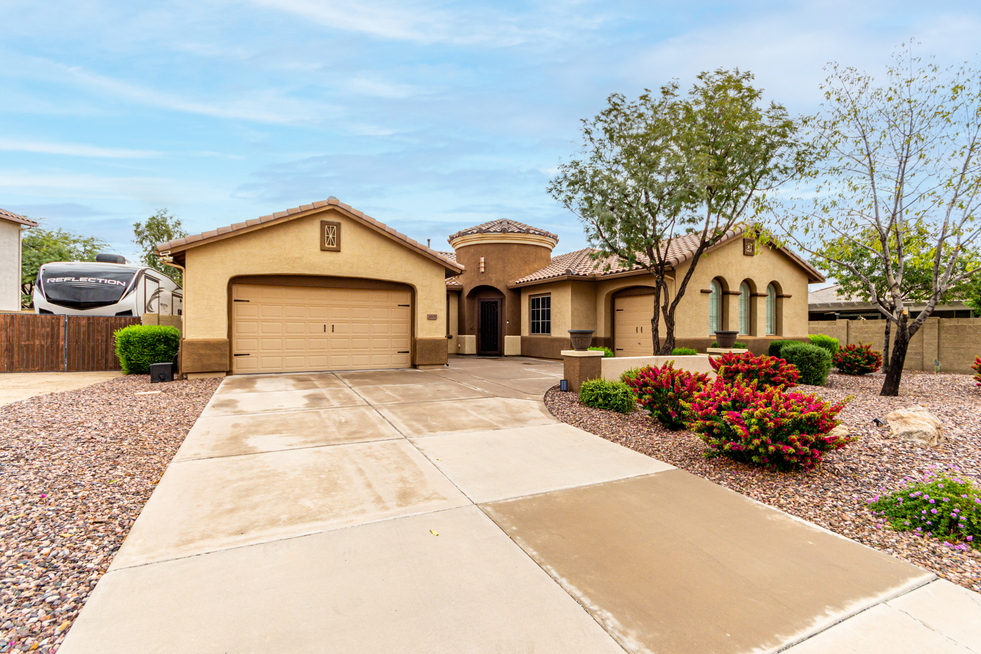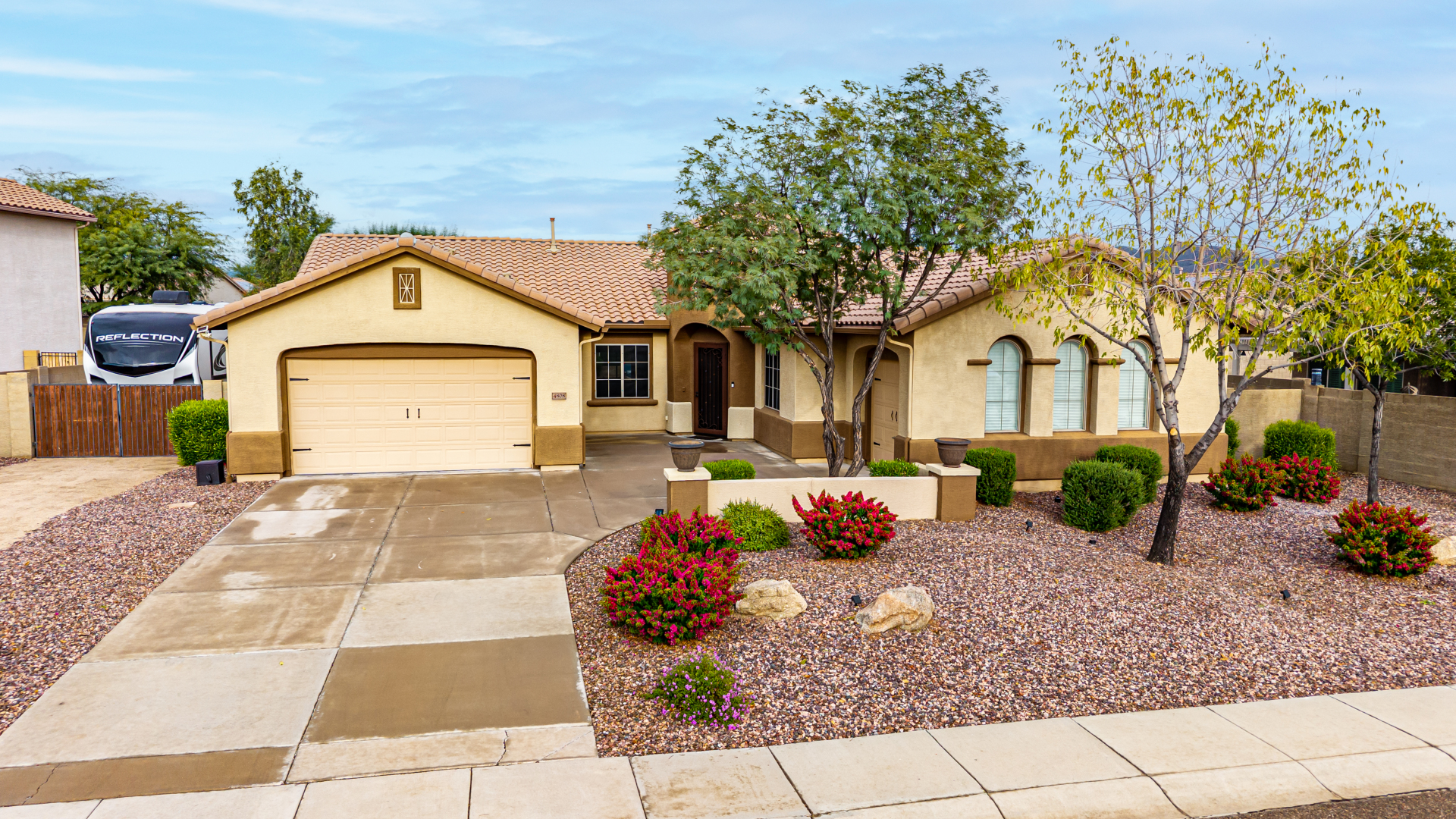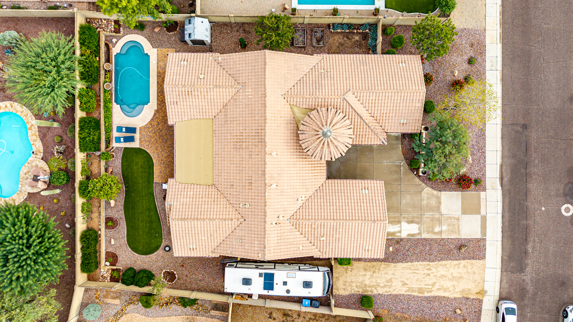 Exceptional, spacious home w/ 10 ft ceilings throughout. Split 4 bdrm/den/2.5 bath, open concept floorplan on 1/3 acre lot. RV PARKING W/ ELECTRIC HOOKUP. Large kitchen w/ center island, granite counters, & ample maple cabinets w/ pull out shelves. Dbl ovens, built in micro, 5 burner gas stove, & more! Oversized primary bdrm w/ large walk in closet and built in shelves. Primary bath has a garden soaking tub, dbl sinks, sep shower w/ bench seat and vanity sitting area. 3 additional bdrms are good sized w/ built in dbl desk/craft area w/ abundant maple cabs. Fam Rm has a cozy gas fireplace, pre-wired surround & picture windows over looking the backyard oasis & pool. Spacious multifunctional liv rm has a large glass sliding door to the covered patio. Big laundry rm w/ cabs, mounted