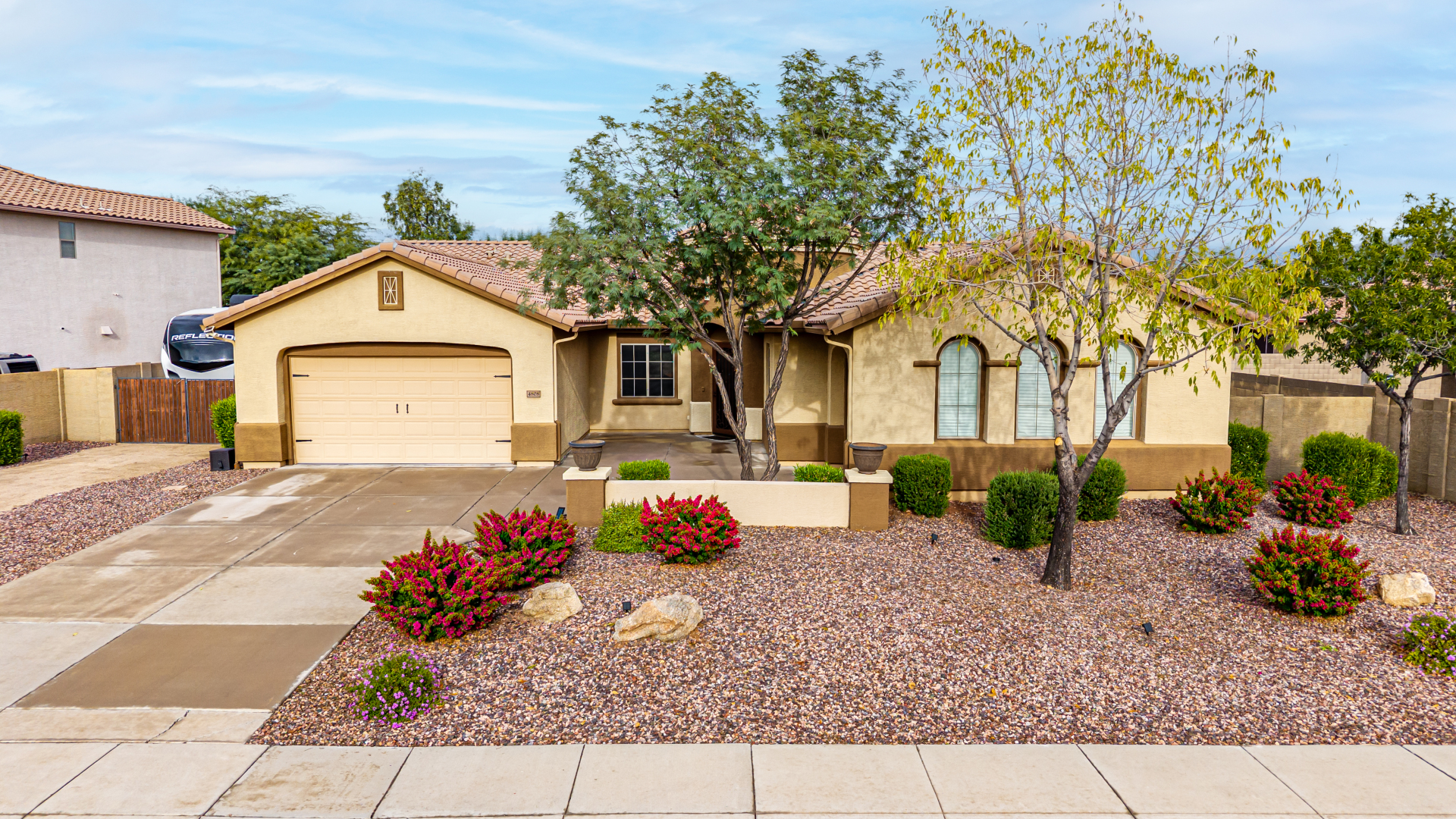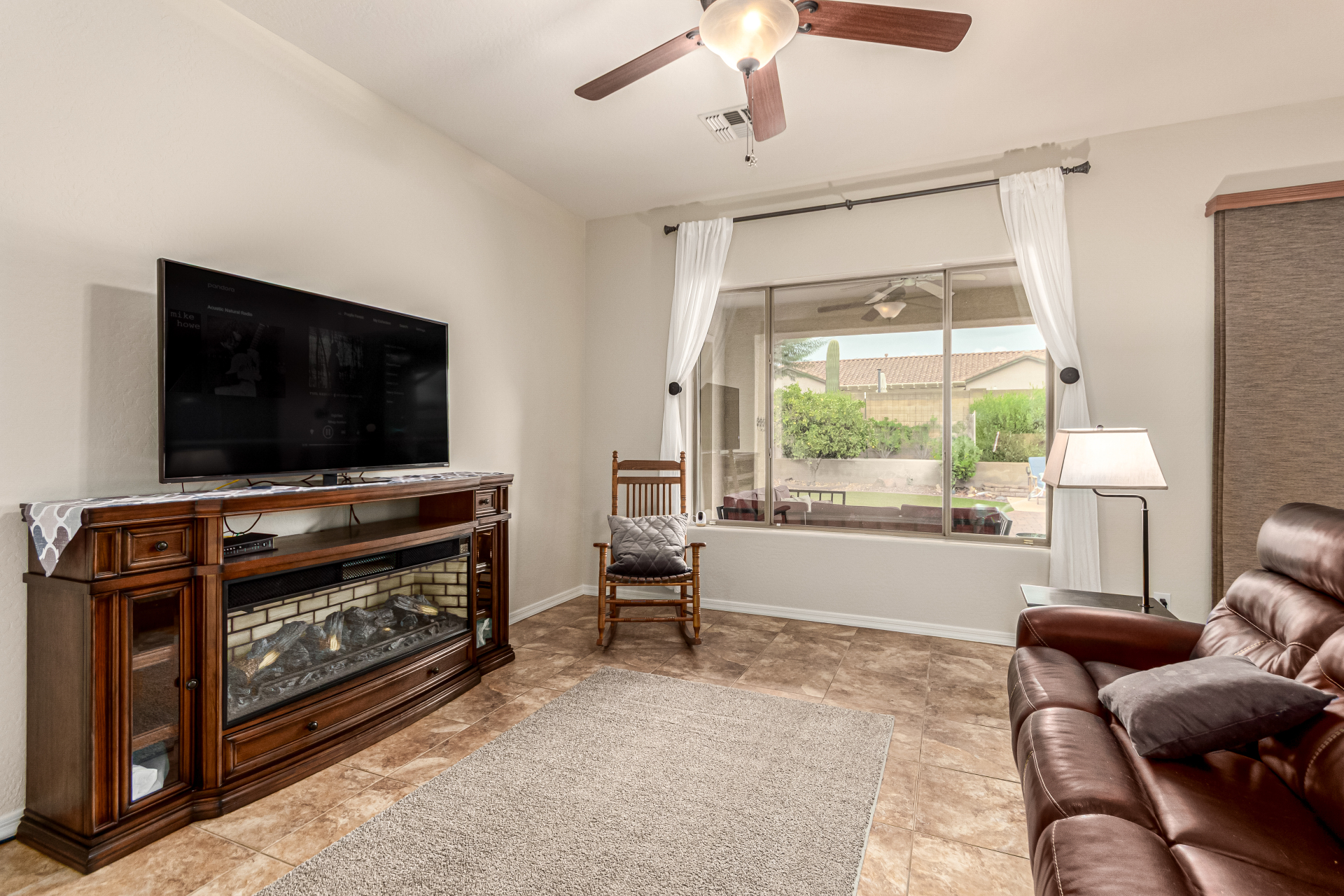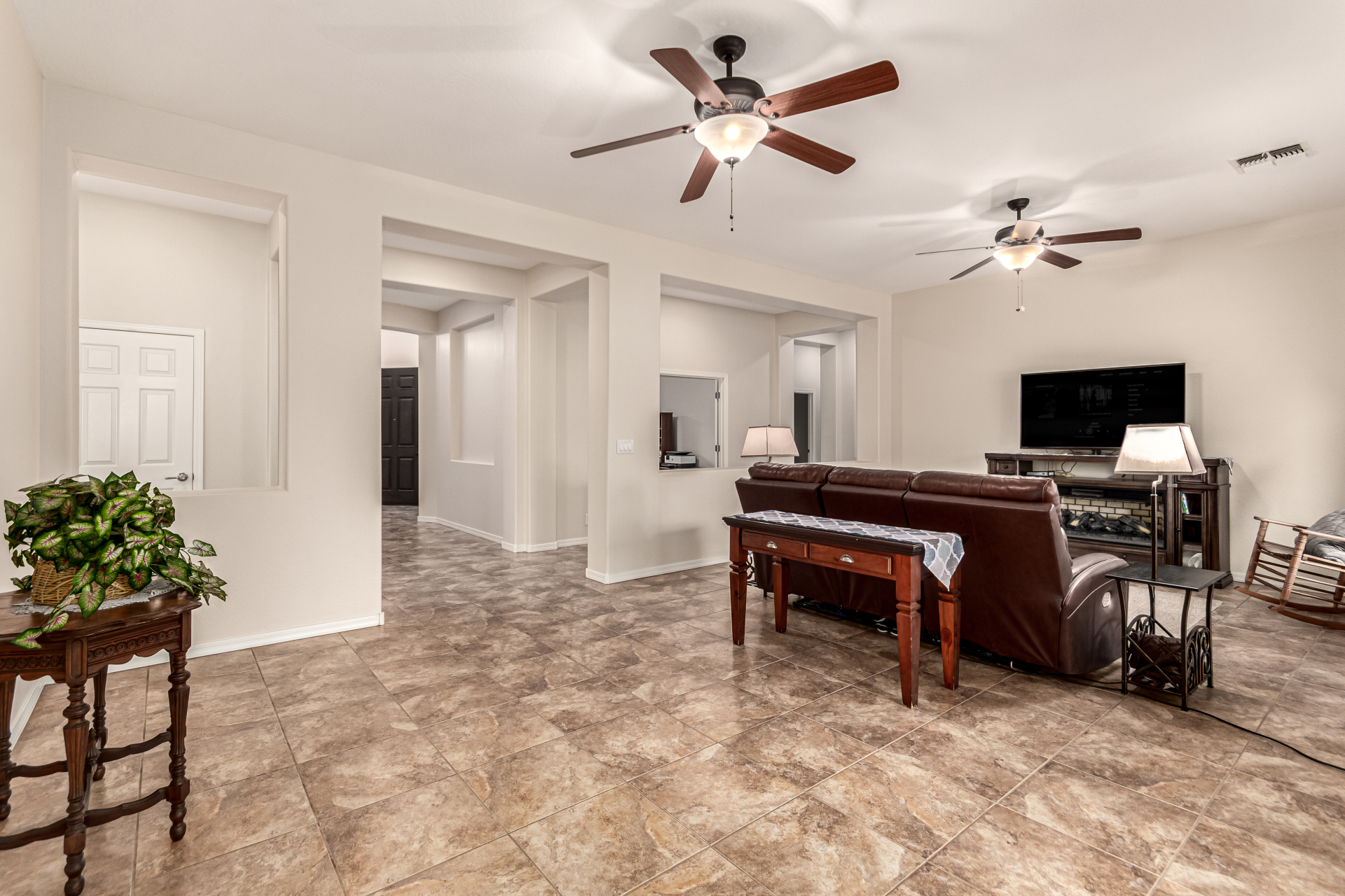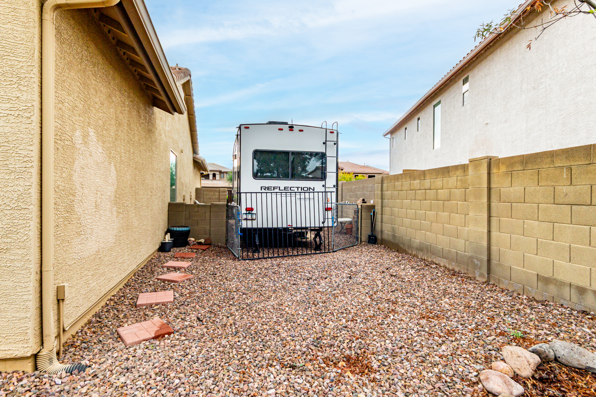Exceptional, spacious home w/ 10 ft ceilings throughout. Split 4 bdrm/den/2.5 bath, open concept floorplan on 1/3 acre lot. RV PARKING W/ ELECTRIC HOOKUP. Large kitchen w/ center island, granite counters, & ample maple cabinets w/ pull out shelves. Dbl ovens, built in micro, 5 burner gas stove, & more! Oversized primary bdrm w/ large walk in closet and built in shelves. Primary bath has a garden soaking tub, dbl sinks, sep shower w/ bench seat and vanity sitting area. 3 additional bdrms are good sized w/ built in dbl desk/craft area w/ abundant maple cabs. Fam Rm has a cozy gas fireplace, pre-wired surround & picture windows over looking the backyard oasis & pool. Spacious multifunctional liv rm has a large glass sliding door to the covered patio. Big laundry rm w/ cabs, mounted