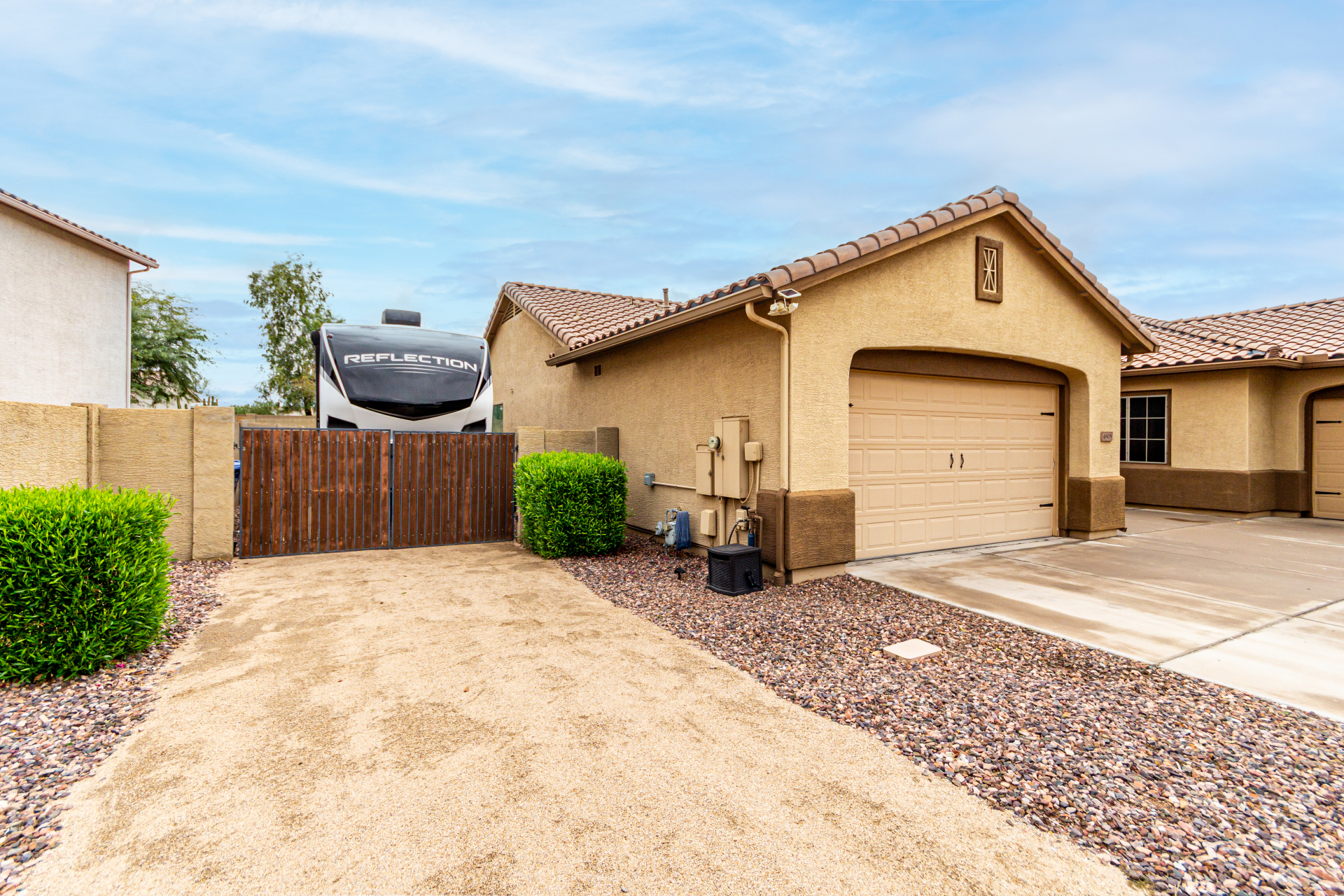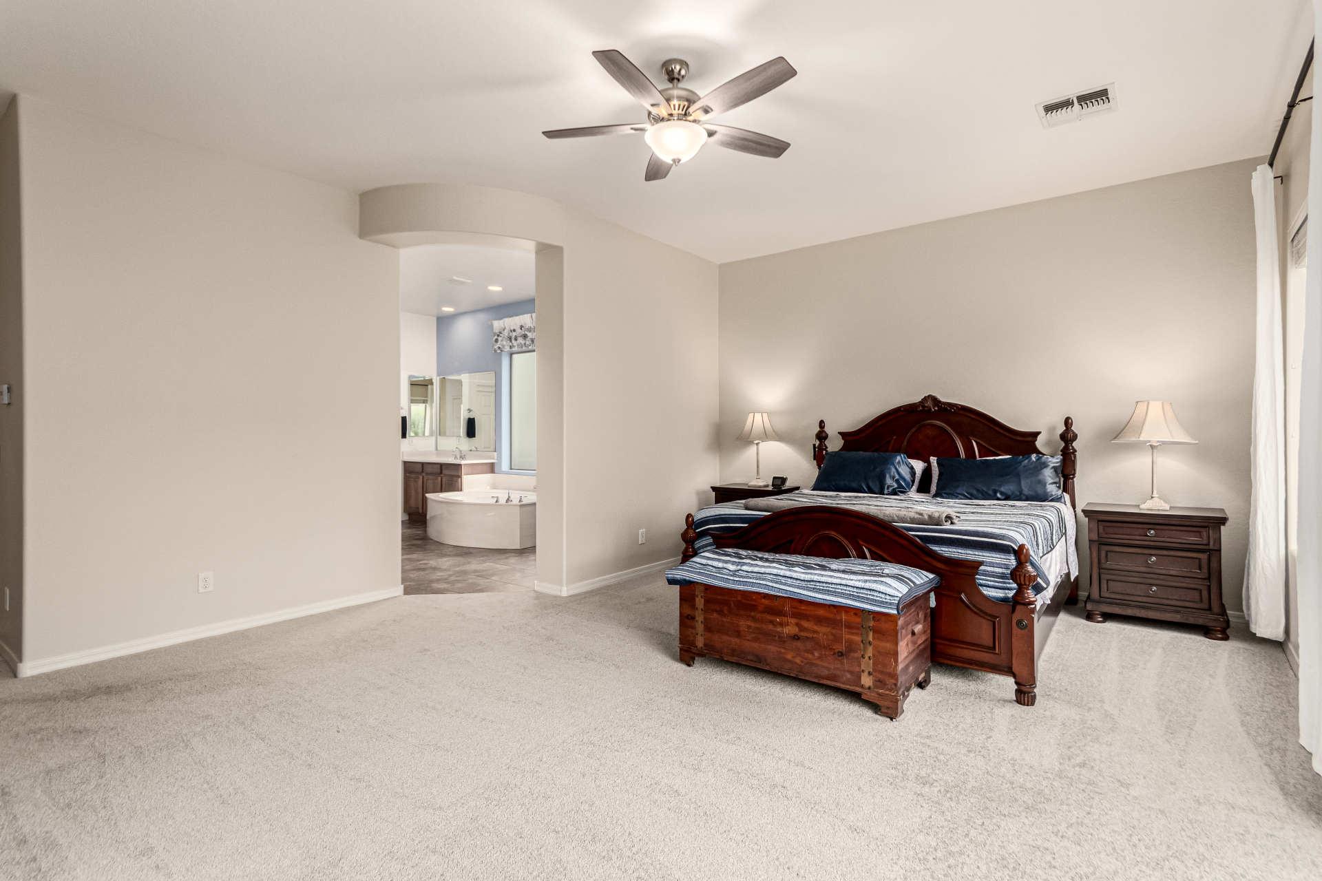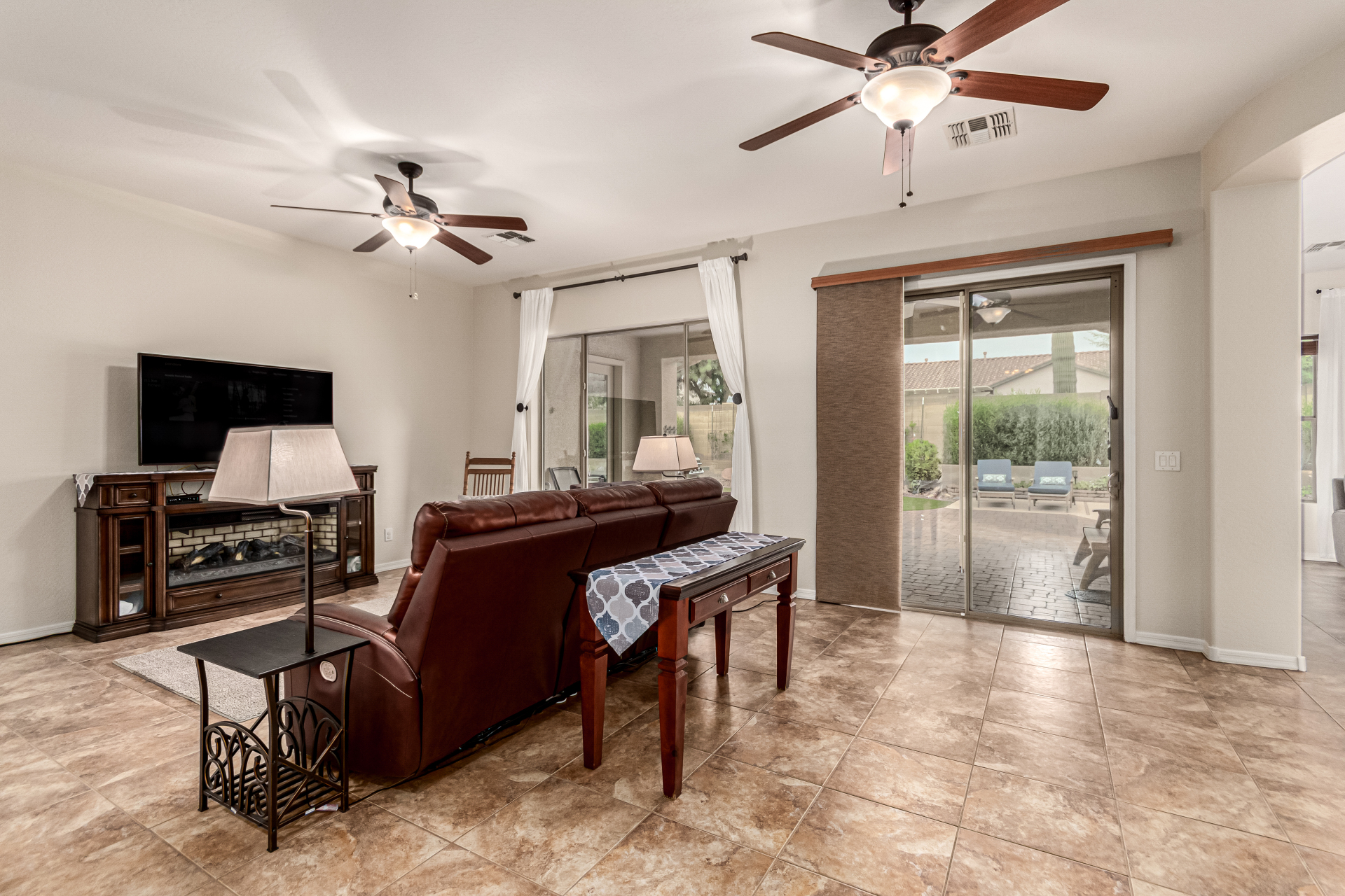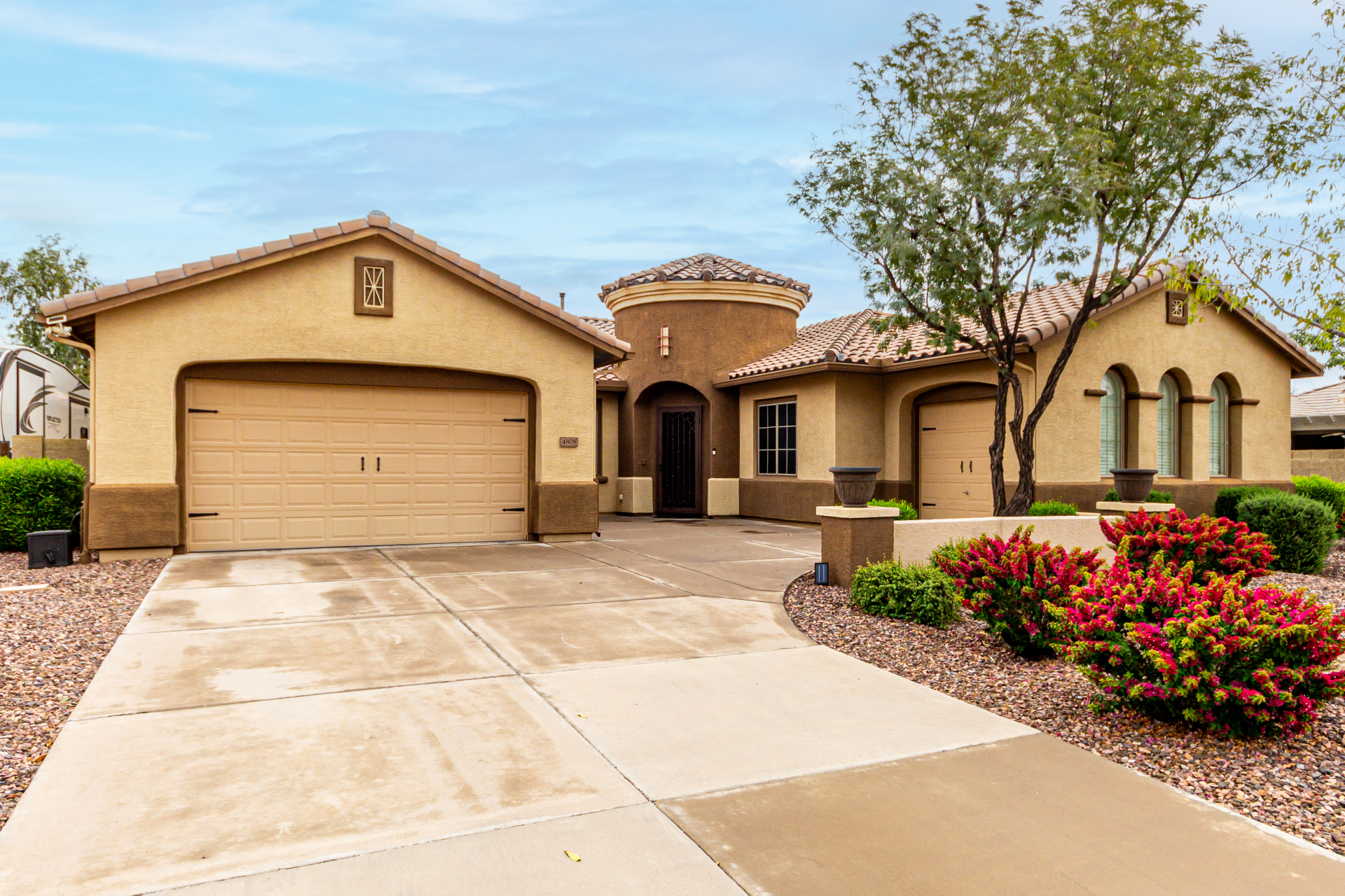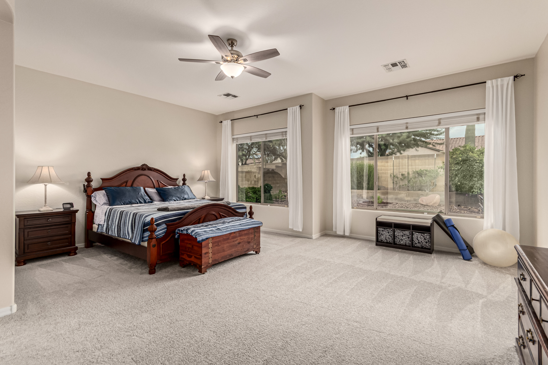 Exceptional, spacious home w/ 10 ft ceilings throughout. Split 4 bdrm/den/2.5 bath, open concept floorplan on 1/3 acre lot. RV PARKING W/ ELECTRIC HOOKUP. Large kitchen w/ center island, granite counters, & ample maple cabinets w/ pull out shelves. Dbl ovens, built in micro, 5 burner gas stove, & more! Oversized primary bdrm w/ large walk in closet and built in shelves. Primary bath has a garden soaking tub, dbl sinks, sep shower w/ bench seat and vanity sitting area. 3 additional bdrms are good sized w/ built in dbl desk/craft area w/ abundant maple cabs. Fam Rm has a cozy gas fireplace, pre-wired surround & picture windows over looking the backyard oasis & pool. Spacious multifunctional liv rm has a large glass sliding door to the covered patio. Big laundry rm w/ cabs, mounted