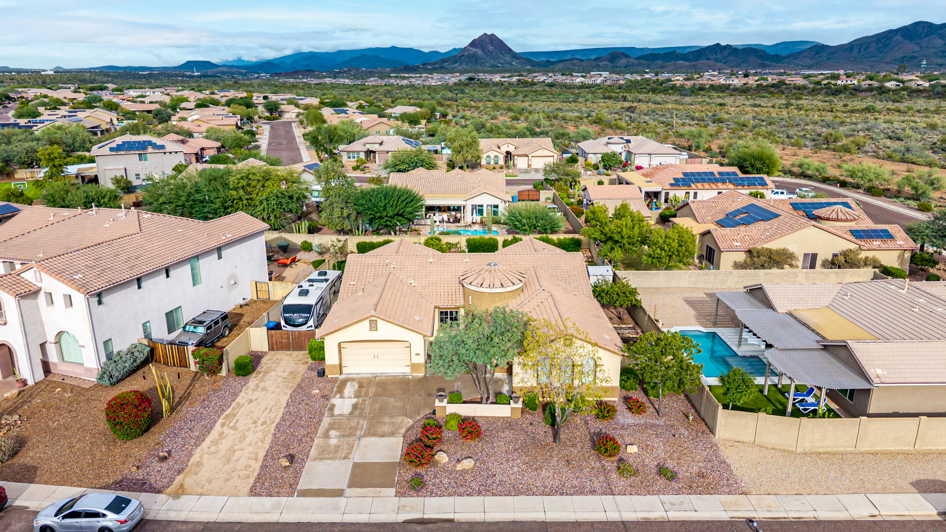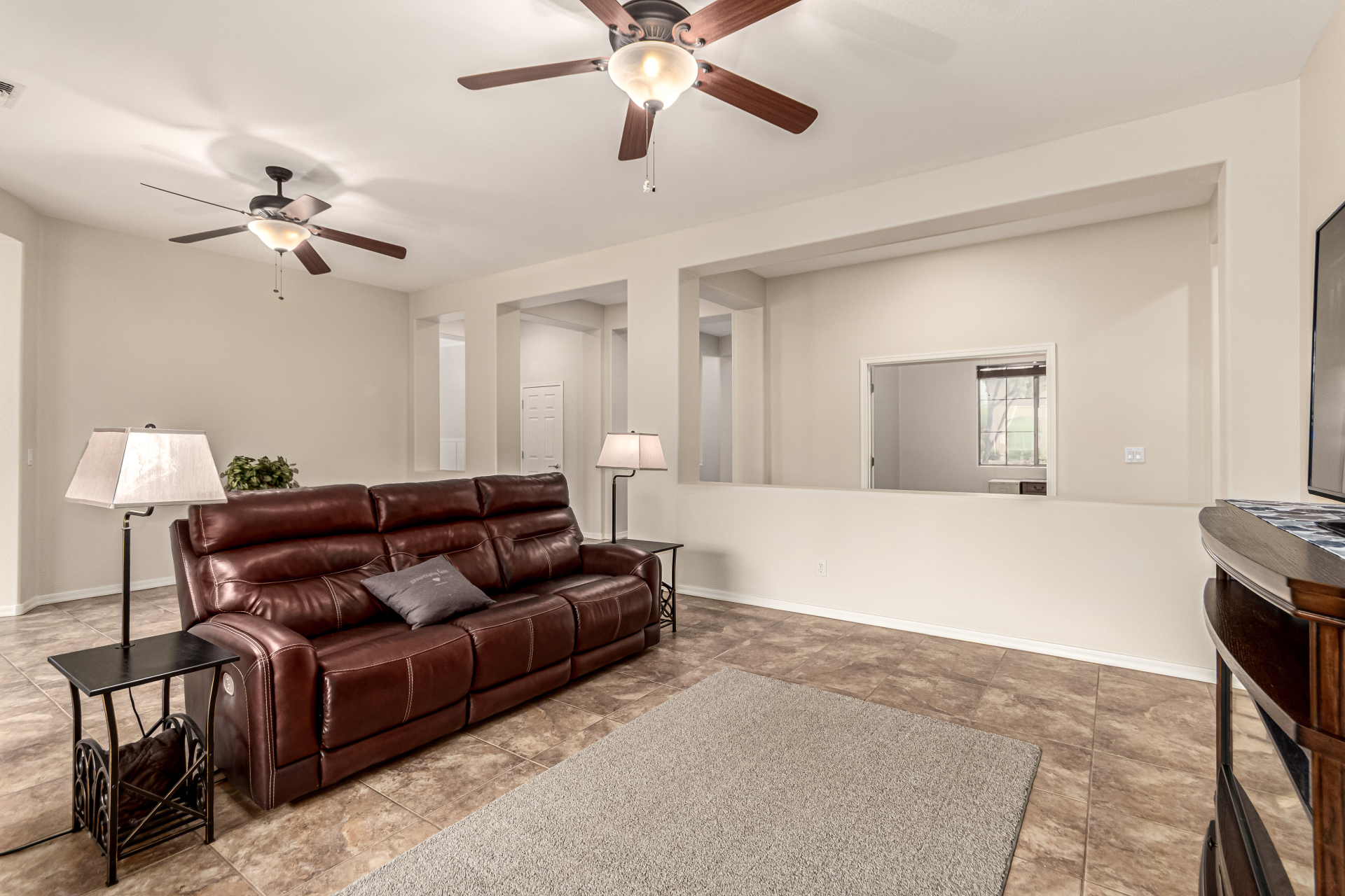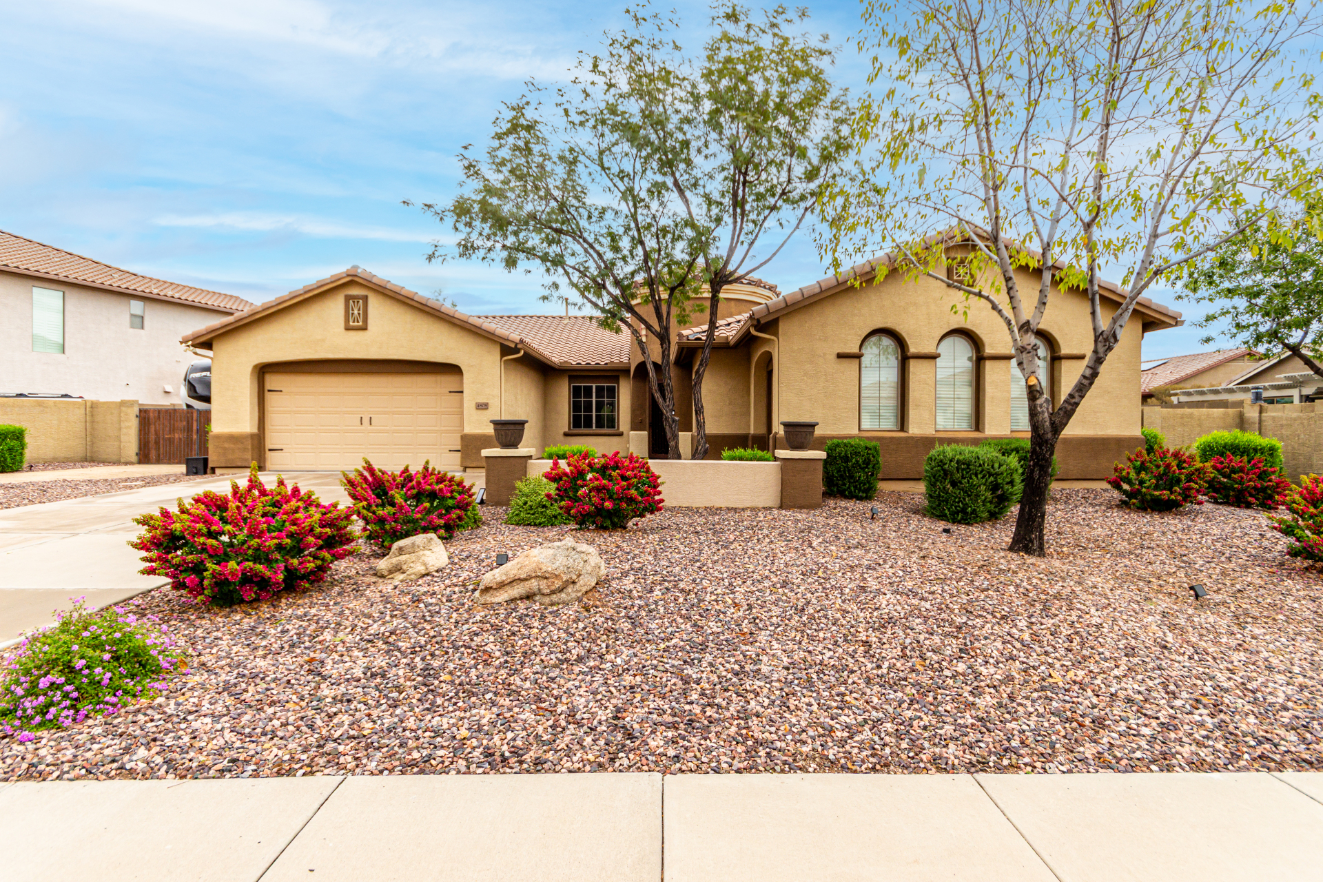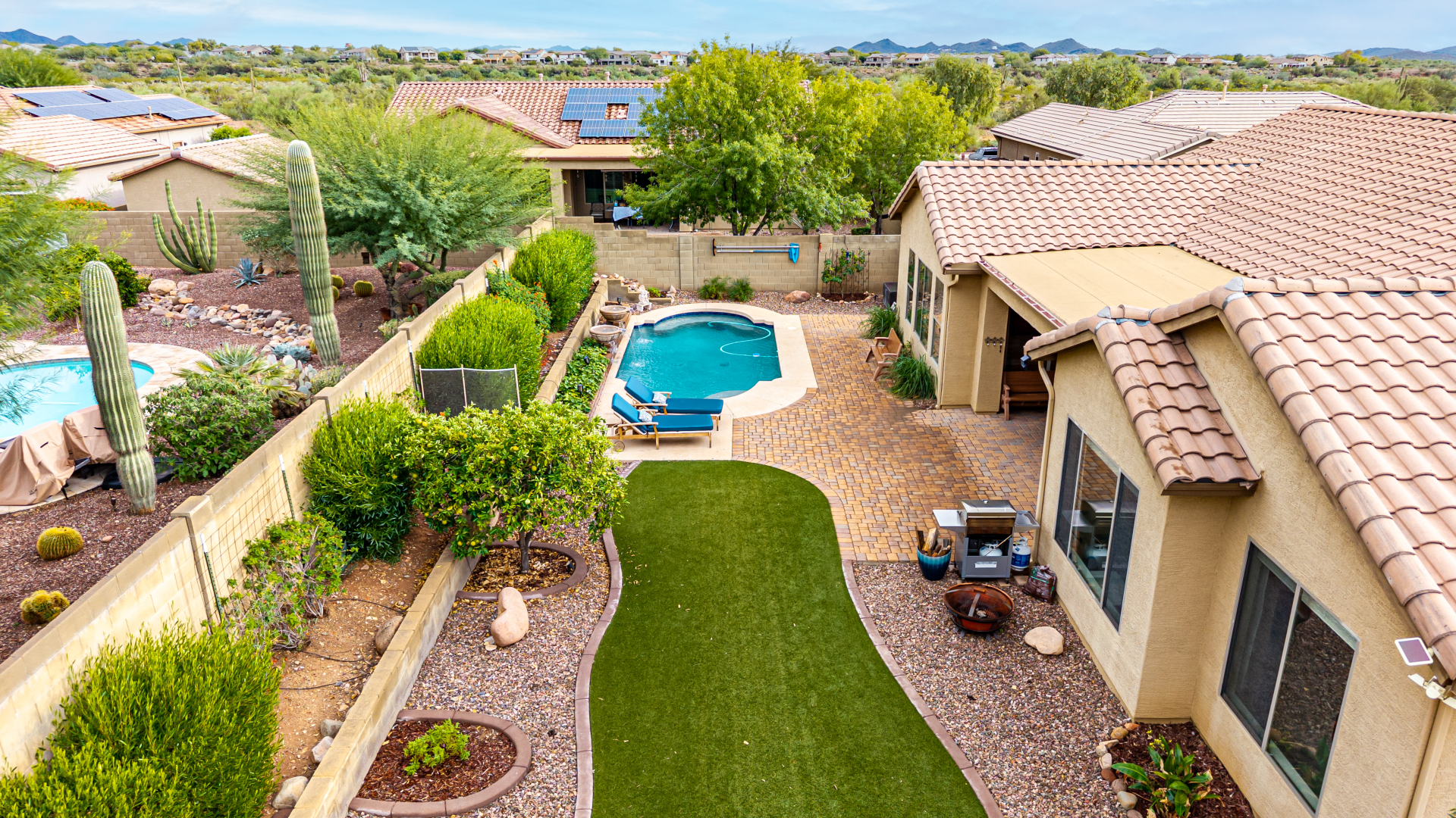 Exceptional, spacious home w/ 10 ft ceilings throughout. Split 4 bdrm/den/2.5 bath, open concept floorplan on 1/3 acre lot. RV PARKING W/ ELECTRIC HOOKUP. Large kitchen w/ center island, granite counters, & ample maple cabinets w/ pull out shelves. Dbl ovens, built in micro, 5 burner gas stove, & more! Oversized primary bdrm w/ large walk in closet and built in shelves. Primary bath has a garden soaking tub, dbl sinks, sep shower w/ bench seat and vanity sitting area. 3 additional bdrms are good sized w/ built in dbl desk/craft area w/ abundant maple cabs. Fam Rm has a cozy gas fireplace, pre-wired surround & picture windows over looking the backyard oasis & pool. Spacious multifunctional liv rm has a large glass sliding door to the covered patio. Big laundry rm w/ cabs, mounted