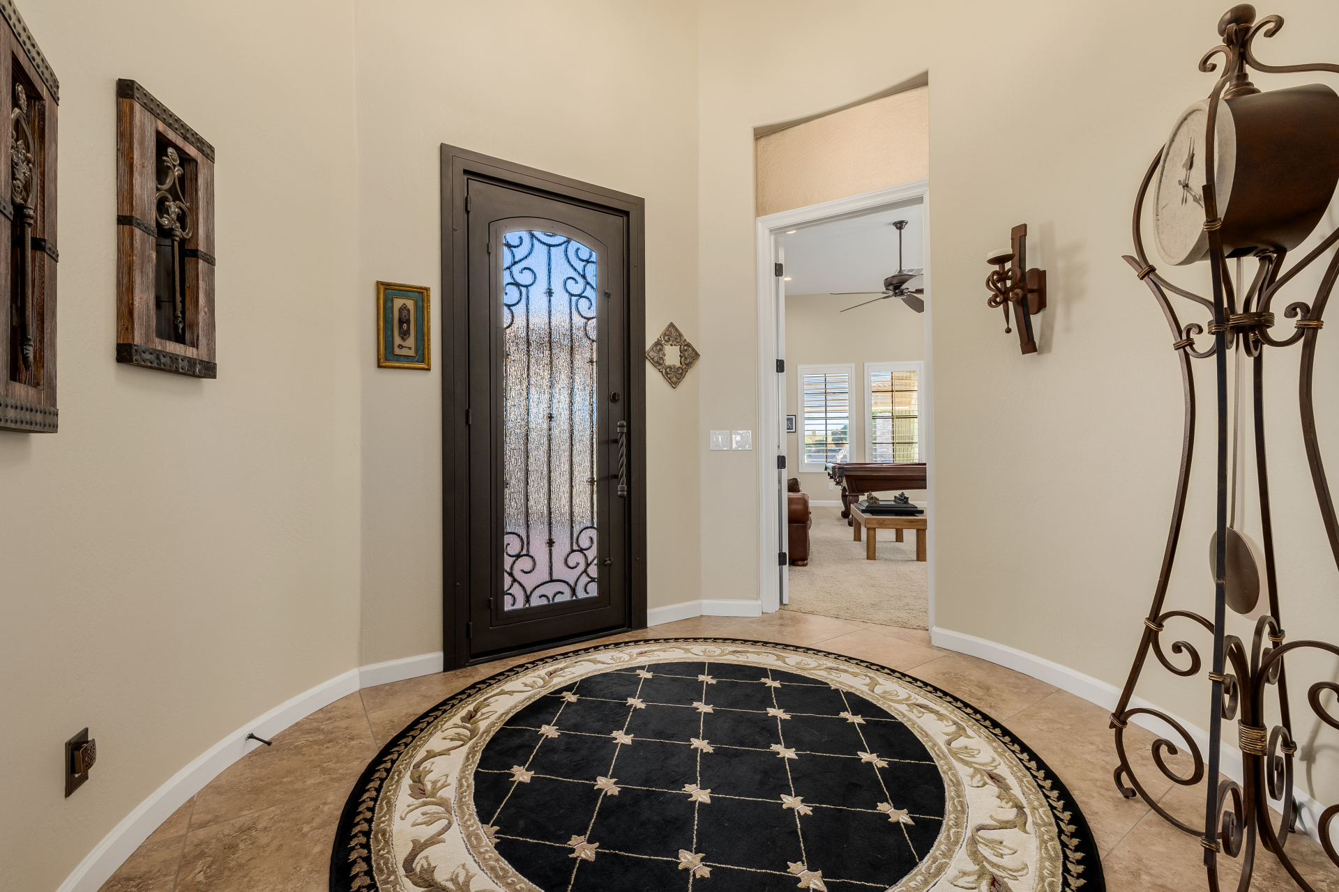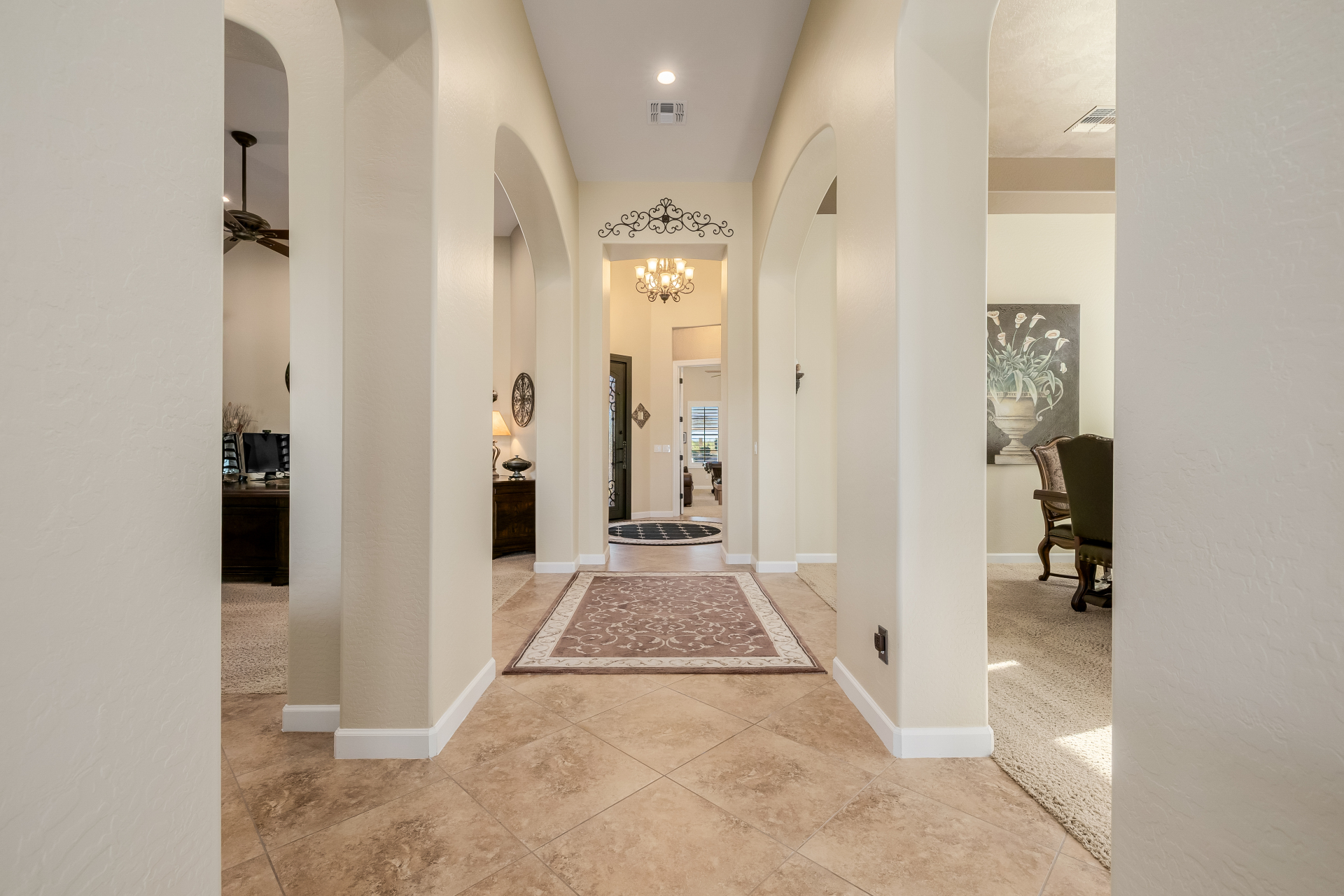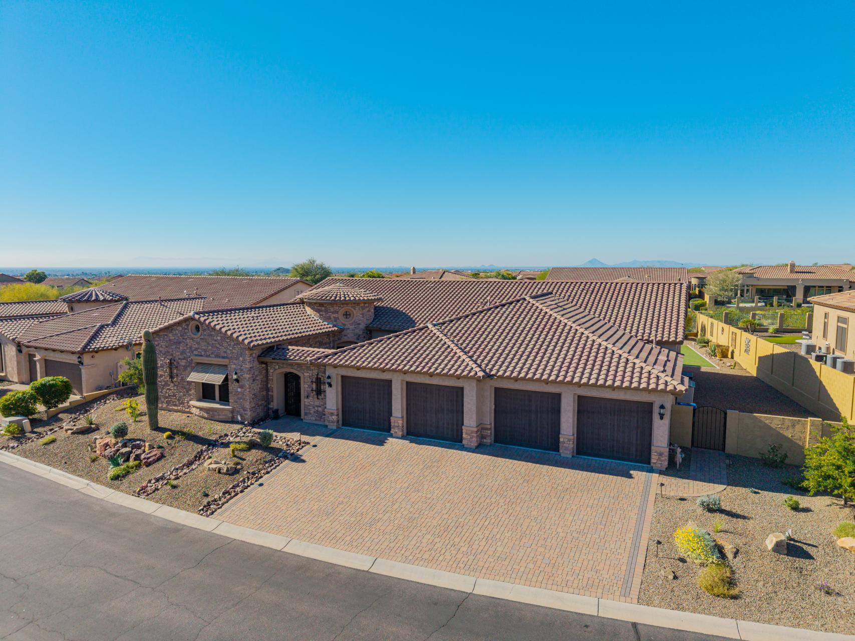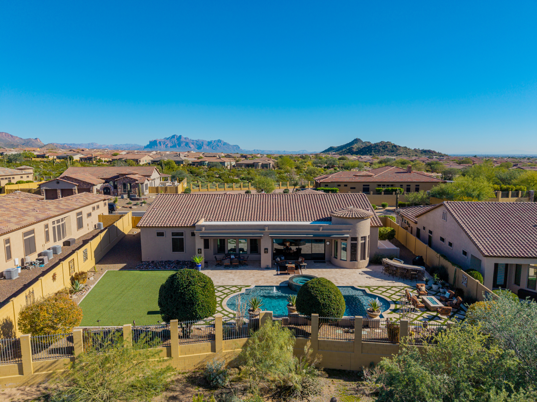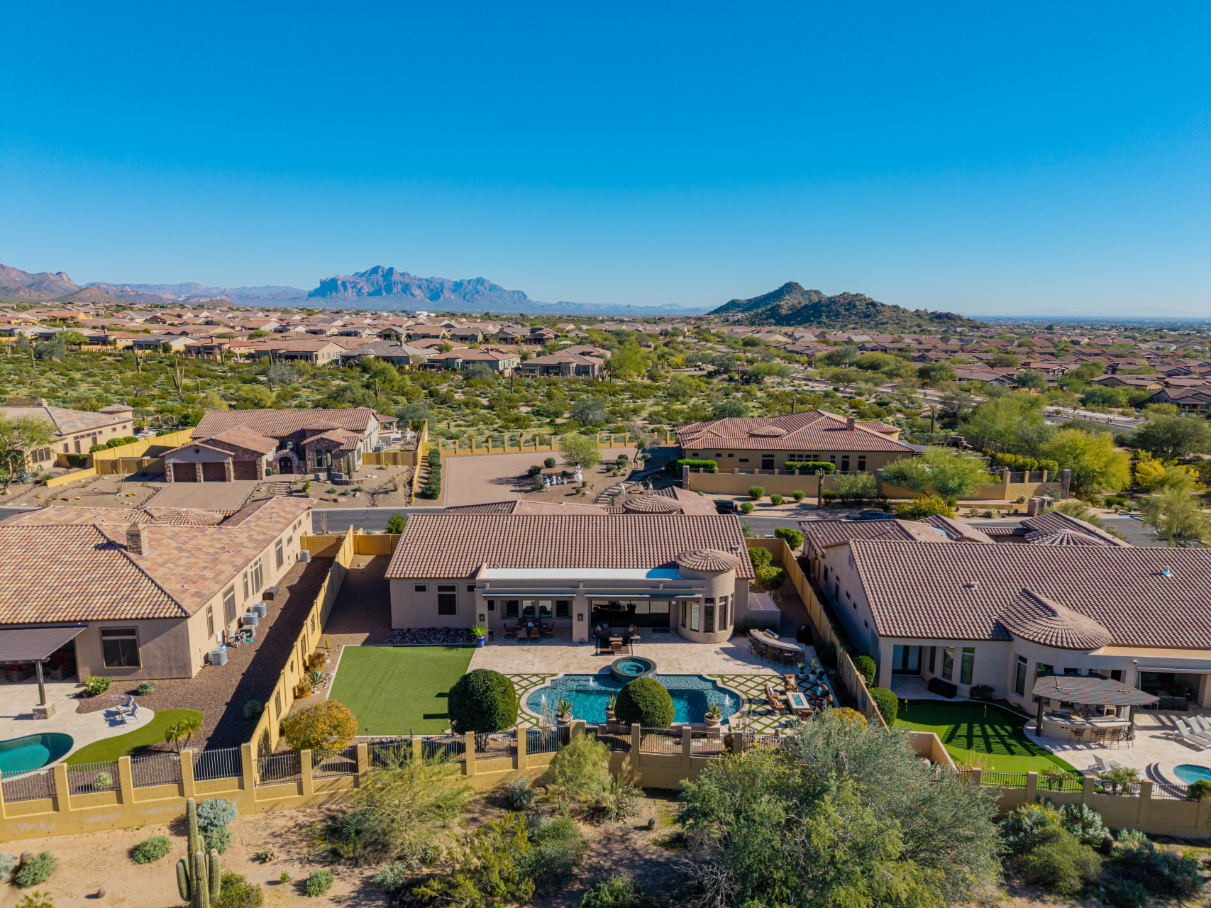 Experience the ultimate in luxury desert living within the exclusive gated enclave of Riviera at Mountain Bridge, one of Mesa's premier master-planned communities nestled in the scenic Desert Uplands of Northeast Mesa. Every detail of this home reflects quality, pride of ownership & timeless sophistication. Single level living! Impeccable curb appeal & manicured landscaping set the tone as you enter this home through a custom iron gate into a private courtyard, leading to a stunning custom iron entry door and dramatic rotunda foyer. This single-level residence features 4 ensuite bedrooms, 4.5 baths & an oversized FOUR CAR garage a car enthusiast's dream with epoxy flooring, built-in cabinetry & direct backyard access.Inside 9 & 12-foot ceilings, plantation shutters & designer finishes elevate every space. Off the foyer, an attached oversized casita with a full bath and walk-in closet provides ideal space for guests, multi-generational living, a game room, or a second owner's suite.
