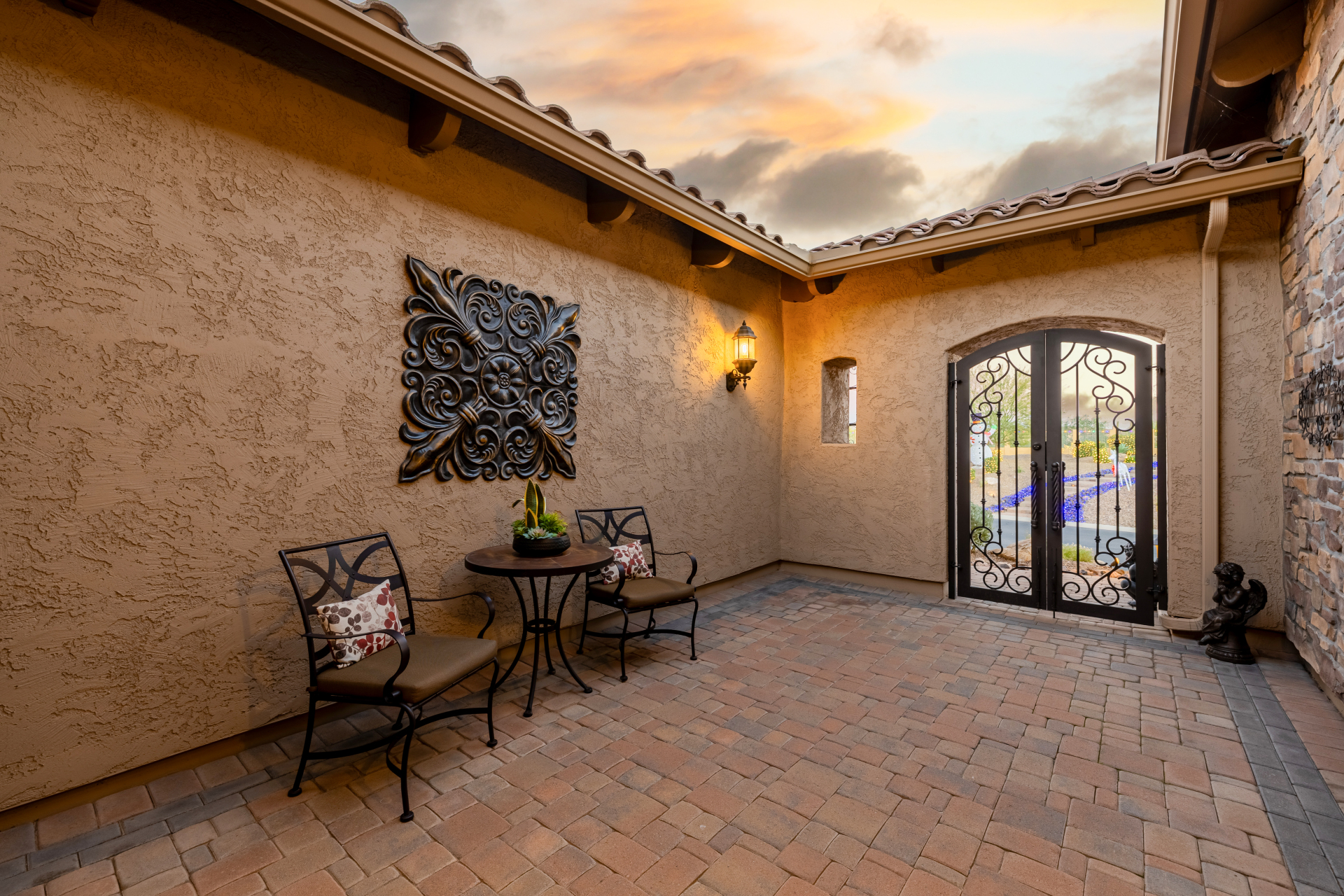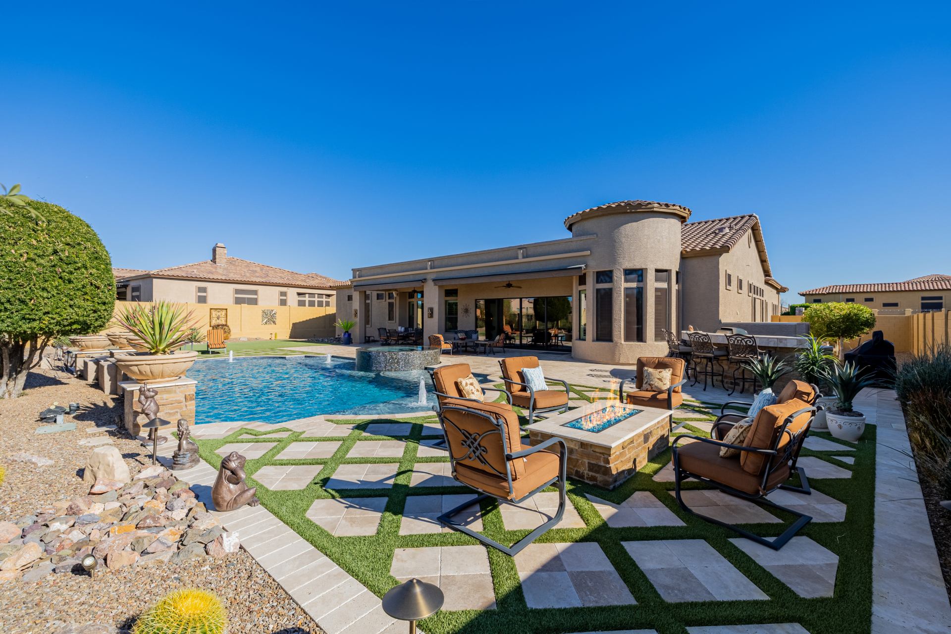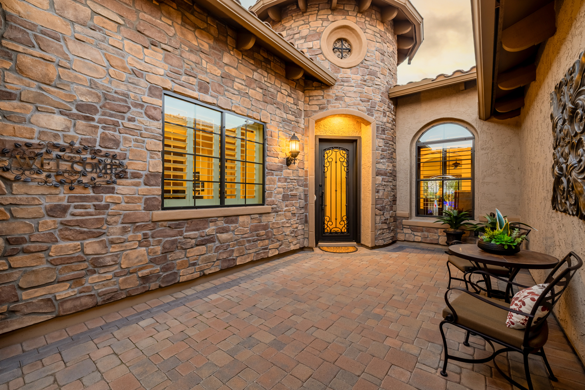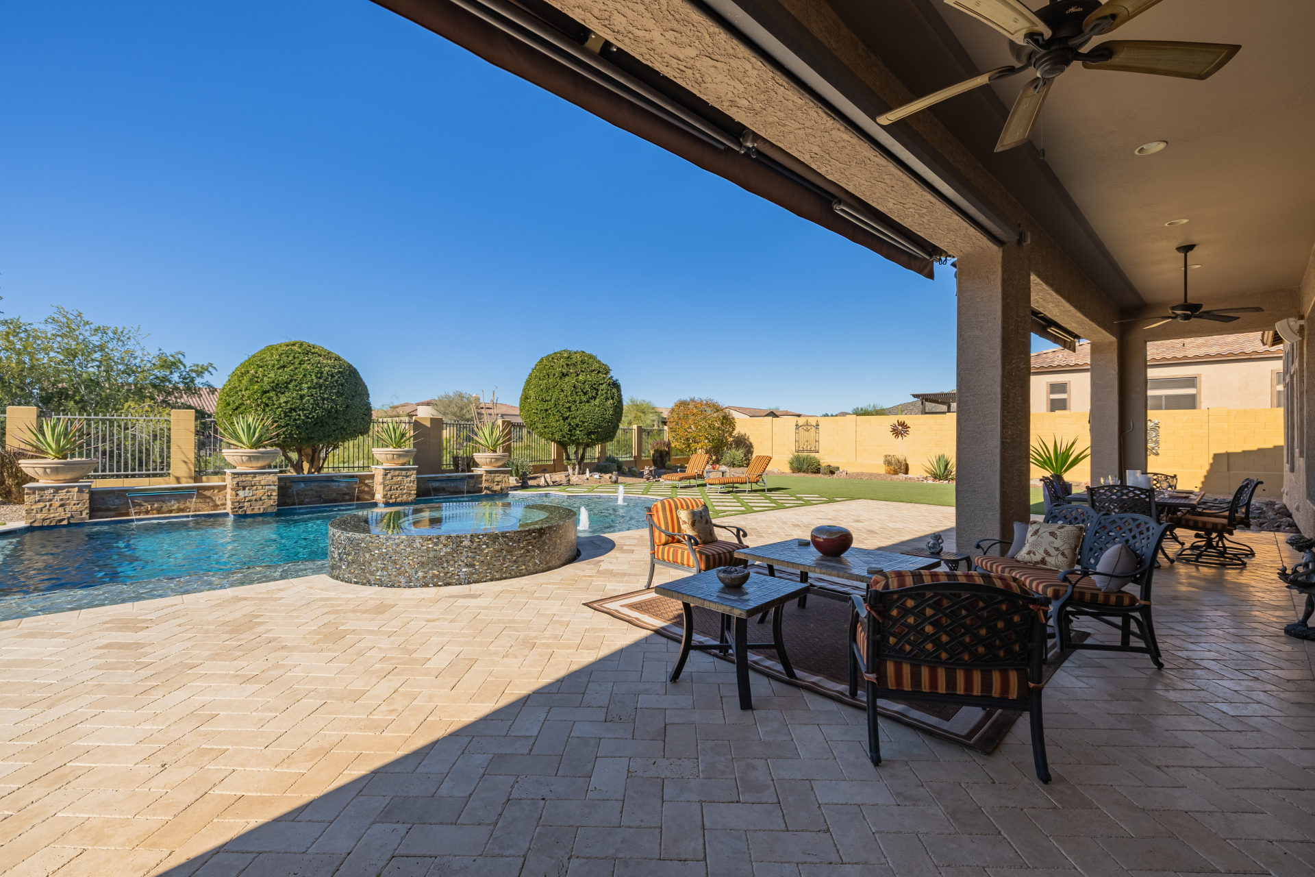Experience the ultimate in luxury desert living within the exclusive gated enclave of Riviera at Mountain Bridge, one of Mesa's premier master-planned communities nestled in the scenic Desert Uplands of Northeast Mesa. Every detail of this home reflects quality, pride of ownership & timeless sophistication. Single level living! Impeccable curb appeal & manicured landscaping set the tone as you enter this home through a custom iron gate into a private courtyard, leading to a stunning custom iron entry door and dramatic rotunda foyer. This single-level residence features 4 ensuite bedrooms, 4.5 baths & an oversized FOUR CAR garage a car enthusiast's dream with epoxy flooring, built-in cabinetry & direct backyard access.Inside 9 & 12-foot ceilings, plantation shutters & designer finishes elevate every space. Off the foyer, an attached oversized casita with a full bath and walk-in closet provides ideal space for guests, multi-generational living, a game room, or a second owner's suite.