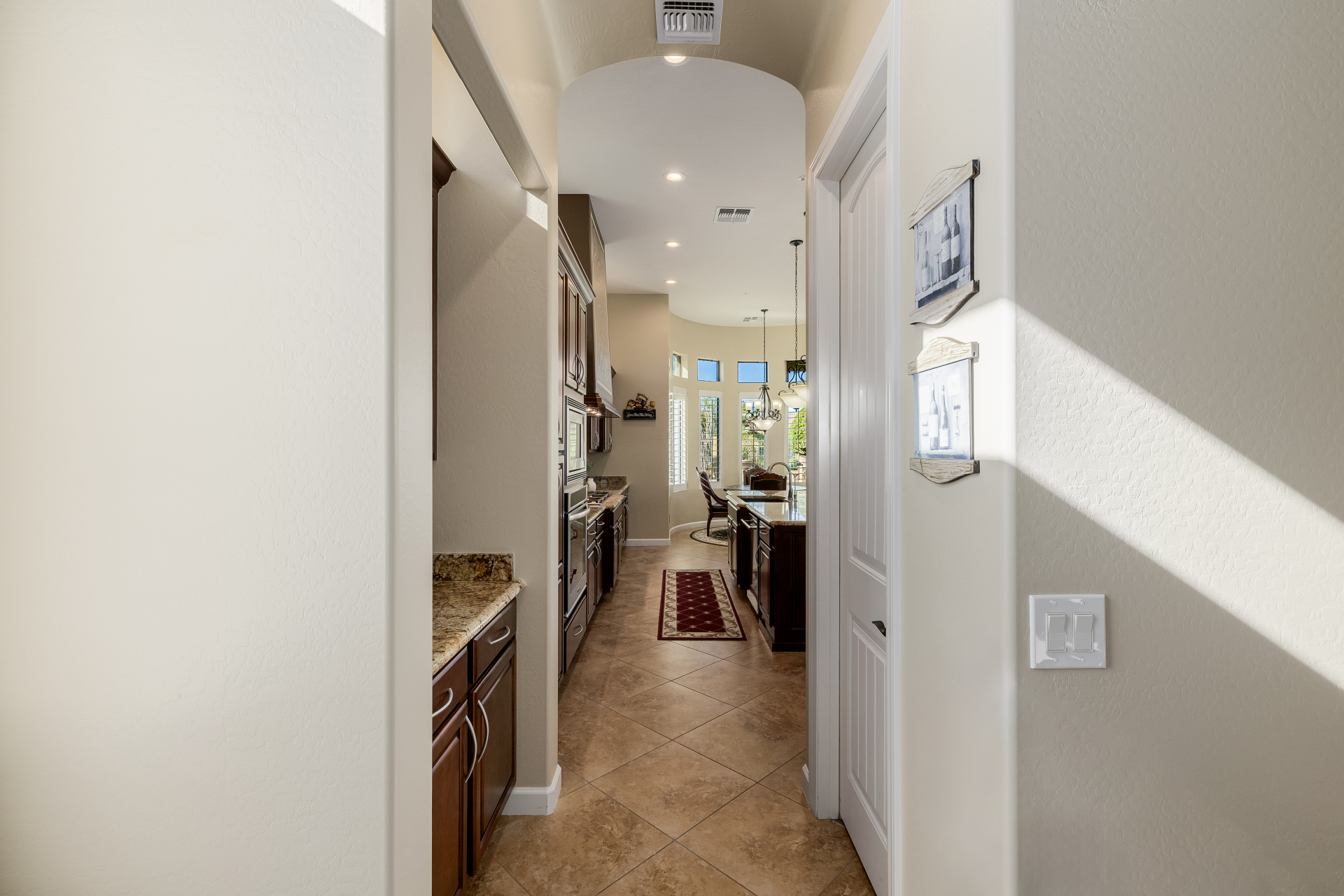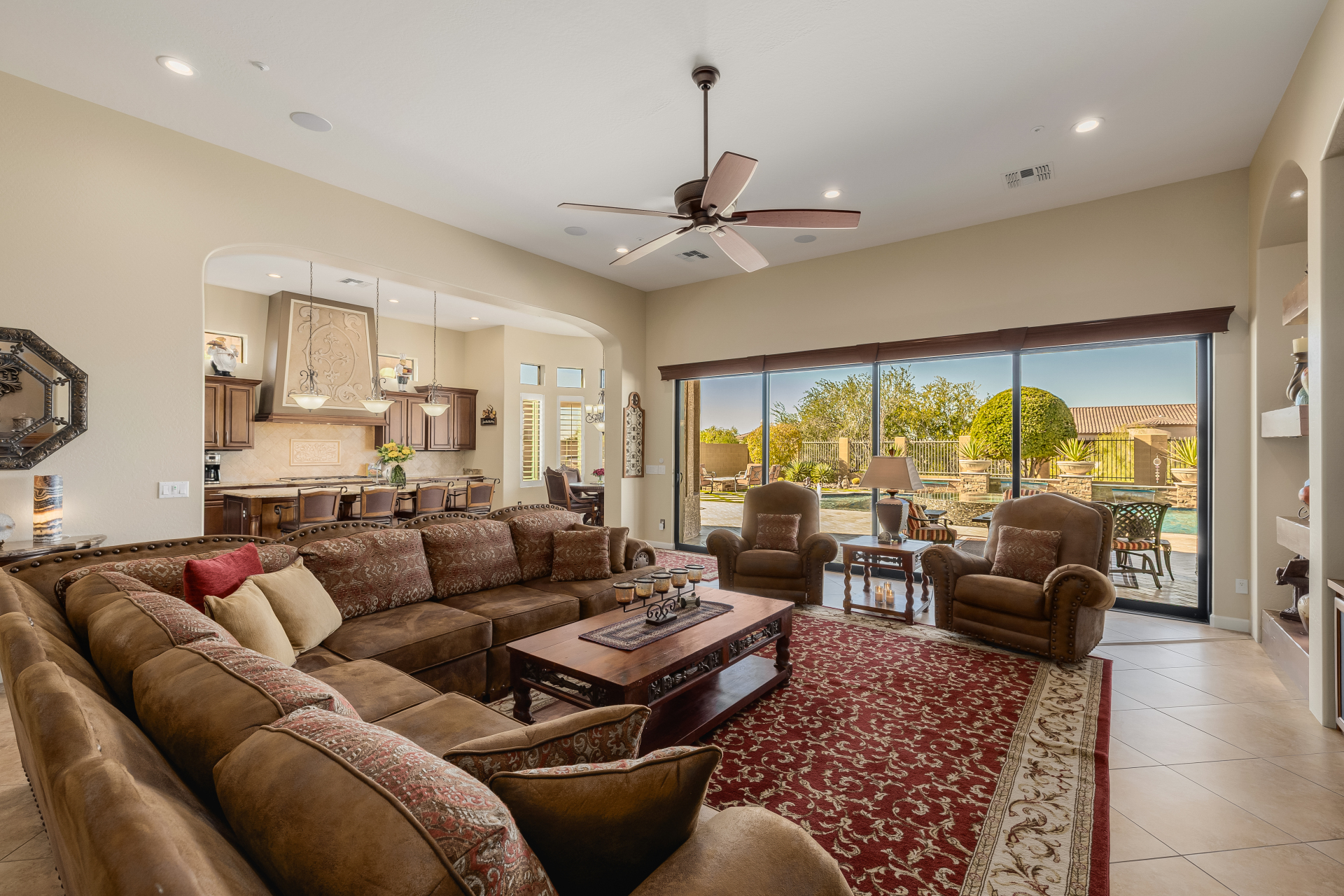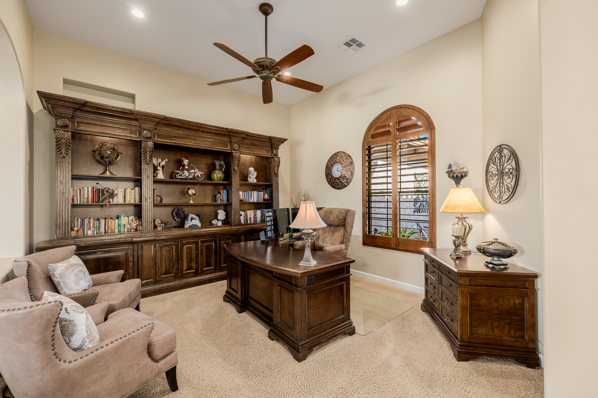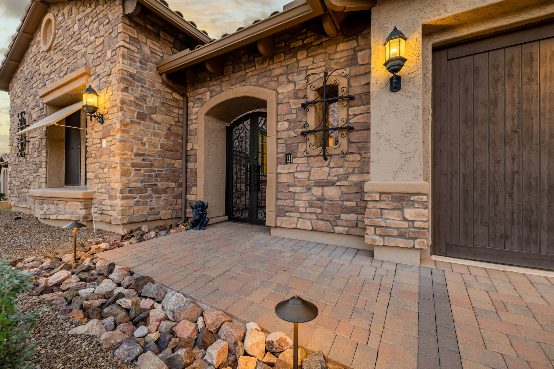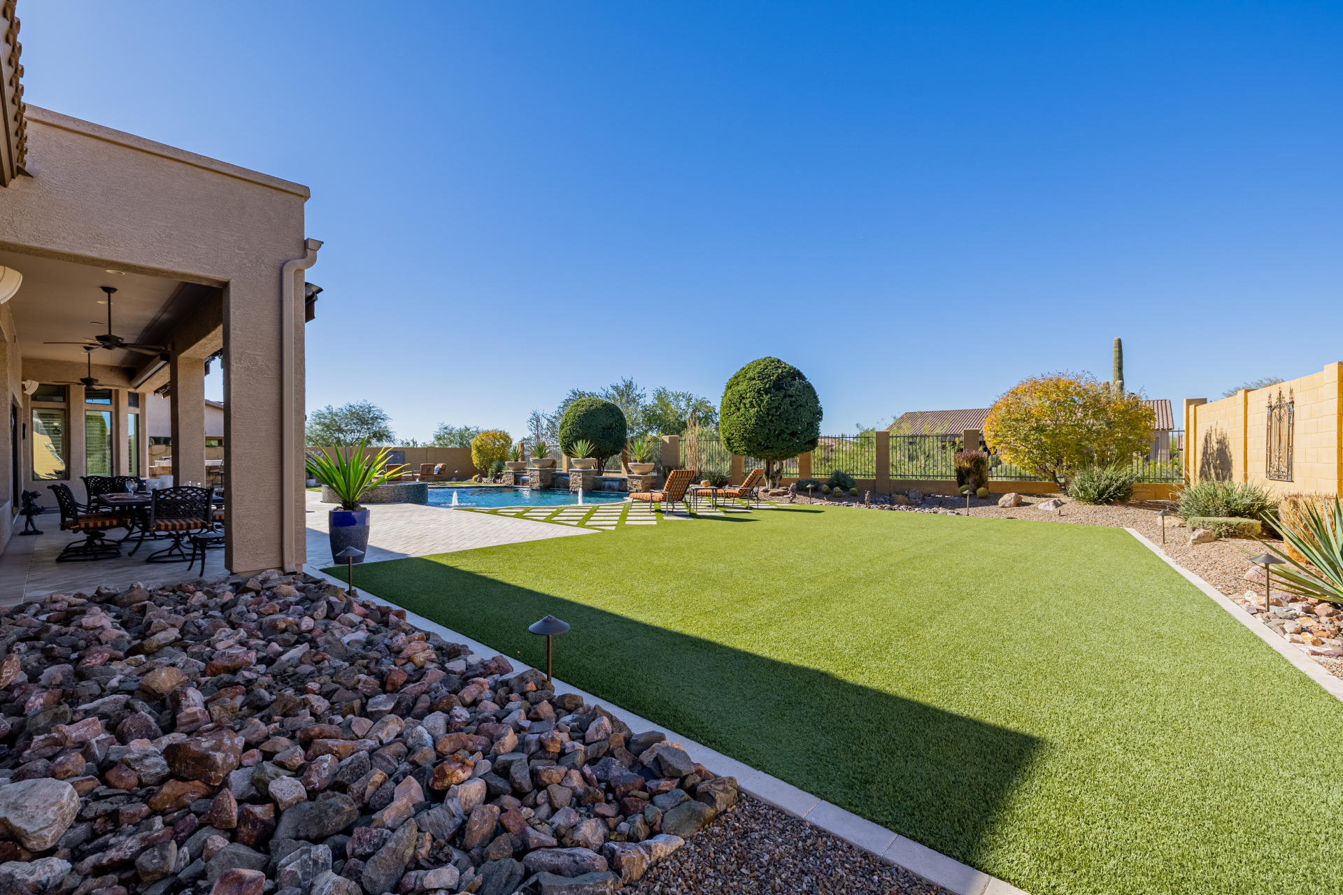 Experience the ultimate in luxury desert living within the exclusive gated enclave of Riviera at Mountain Bridge, one of Mesa's premier master-planned communities nestled in the scenic Desert Uplands of Northeast Mesa. Every detail of this home reflects quality, pride of ownership & timeless sophistication. Single level living! Impeccable curb appeal & manicured landscaping set the tone as you enter this home through a custom iron gate into a private courtyard, leading to a stunning custom iron entry door and dramatic rotunda foyer. This single-level residence features 4 ensuite bedrooms, 4.5 baths & an oversized FOUR CAR garage a car enthusiast's dream with epoxy flooring, built-in cabinetry & direct backyard access.Inside 9 & 12-foot ceilings, plantation shutters & designer finishes elevate every space. Off the foyer, an attached oversized casita with a full bath and walk-in closet provides ideal space for guests, multi-generational living, a game room, or a second owner's suite.