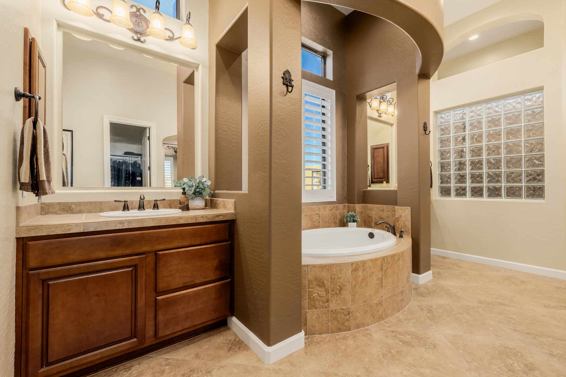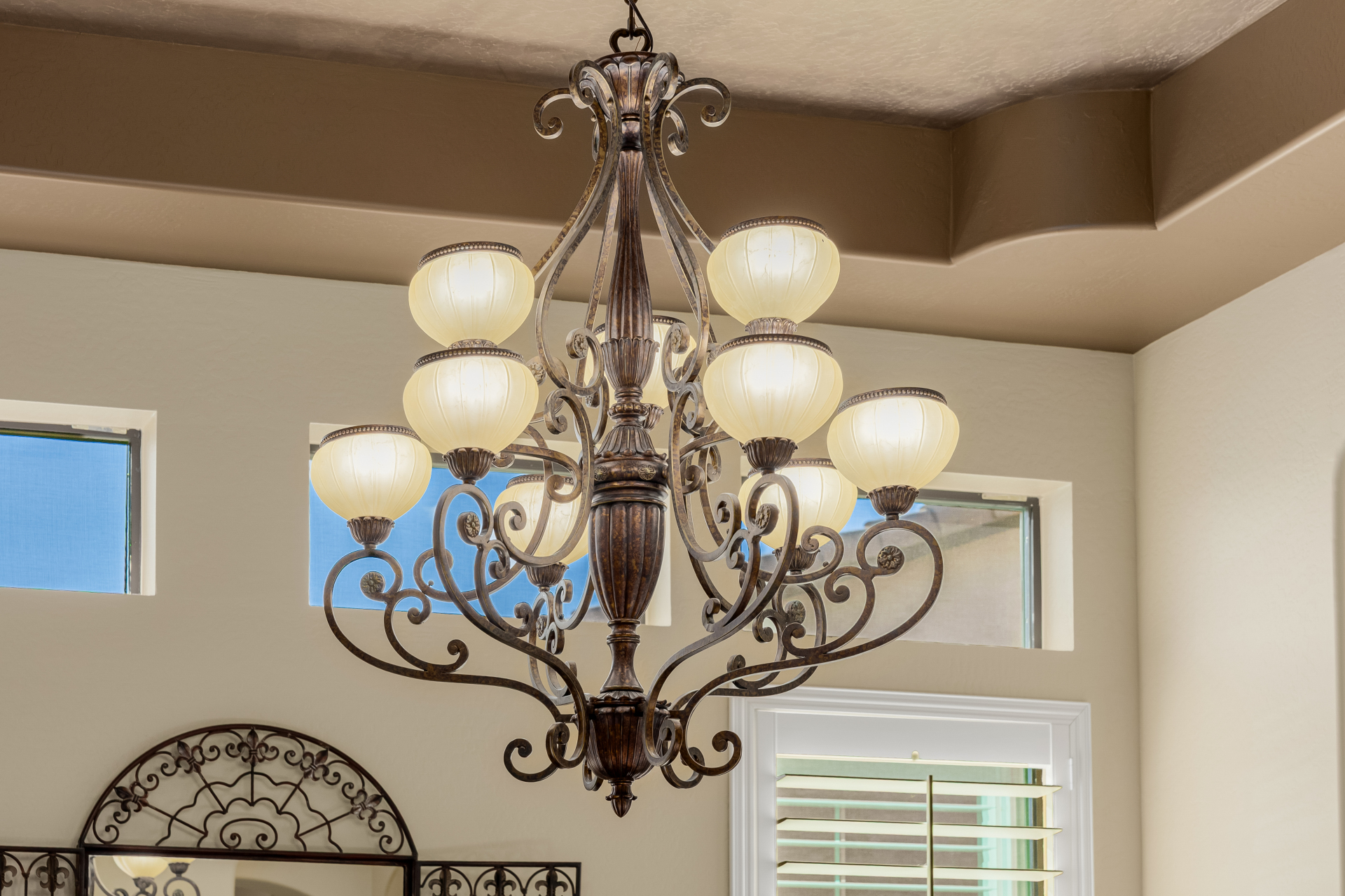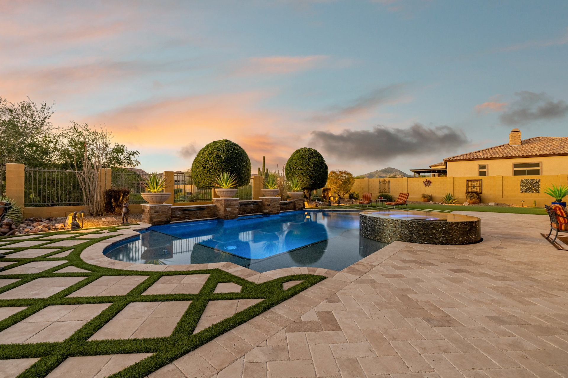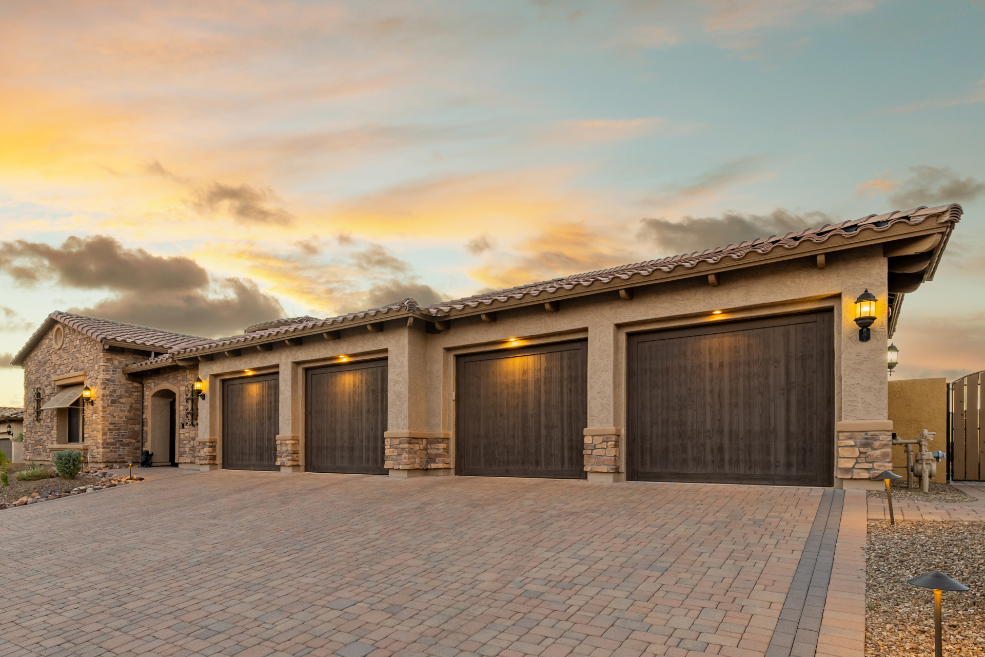 Experience the ultimate in luxury desert living within the exclusive gated enclave of Riviera at Mountain Bridge, one of Mesa's premier master-planned communities nestled in the scenic Desert Uplands of Northeast Mesa. Every detail of this home reflects quality, pride of ownership & timeless sophistication. Single level living! Impeccable curb appeal & manicured landscaping set the tone as you enter this home through a custom iron gate into a private courtyard, leading to a stunning custom iron entry door and dramatic rotunda foyer. This single-level residence features 4 ensuite bedrooms, 4.5 baths & an oversized FOUR CAR garage a car enthusiast's dream with epoxy flooring, built-in cabinetry & direct backyard access.Inside 9 & 12-foot ceilings, plantation shutters & designer finishes elevate every space. Off the foyer, an attached oversized casita with a full bath and walk-in closet provides ideal space for guests, multi-generational living, a game room, or a second owner's suite.