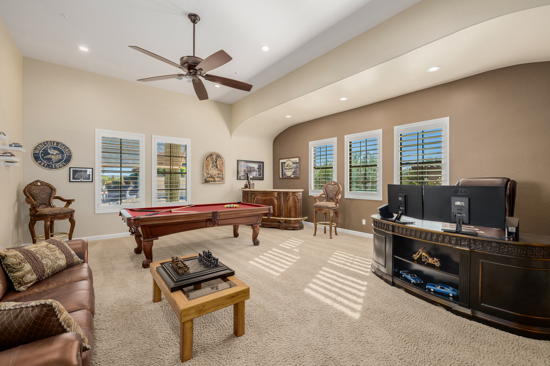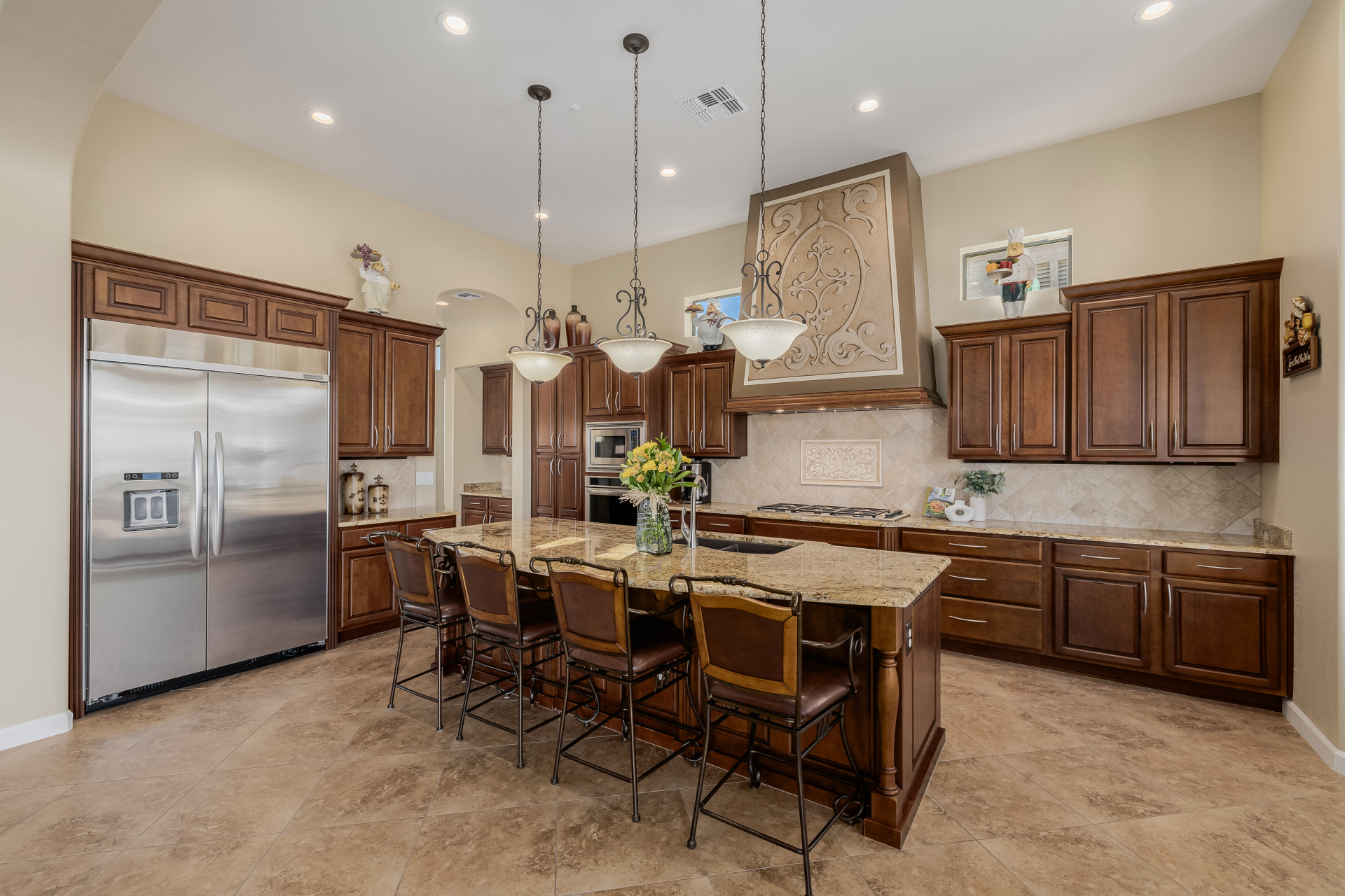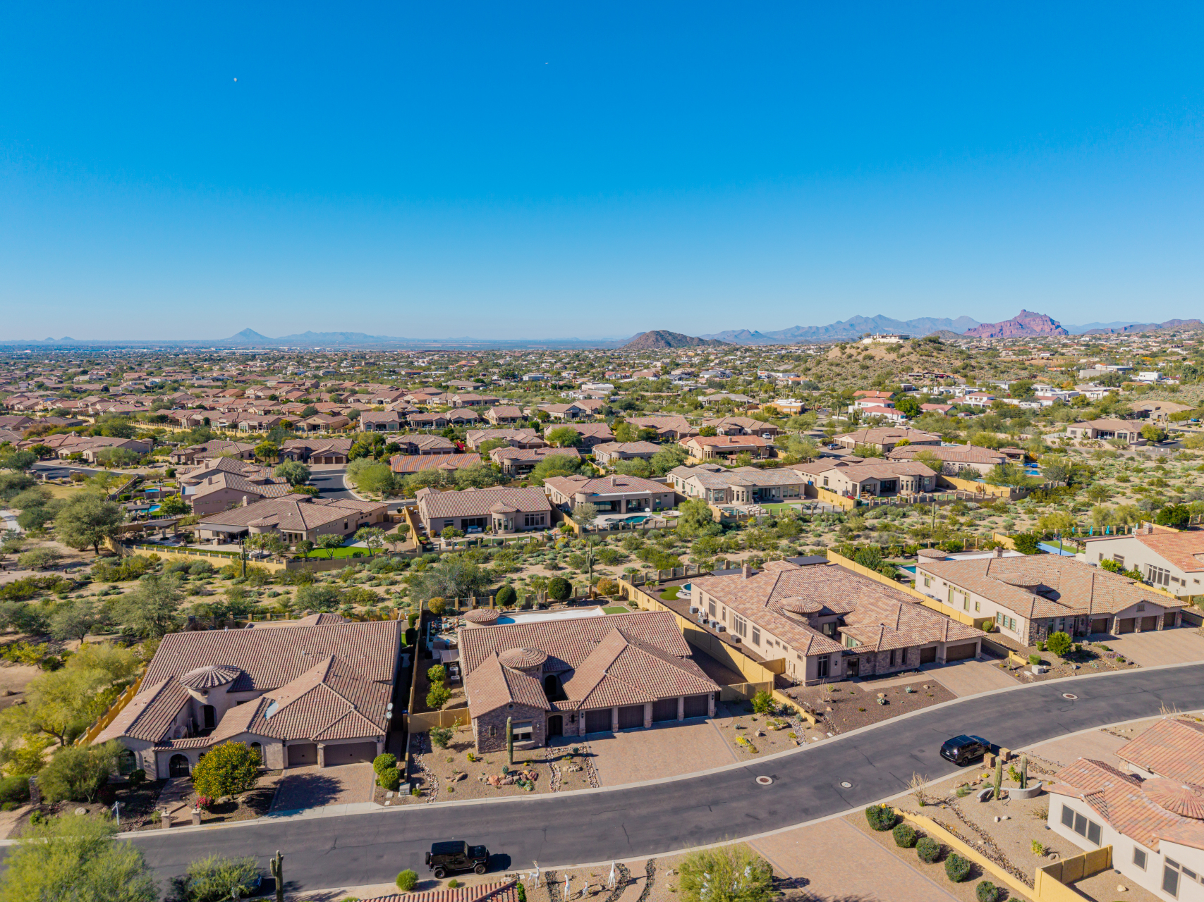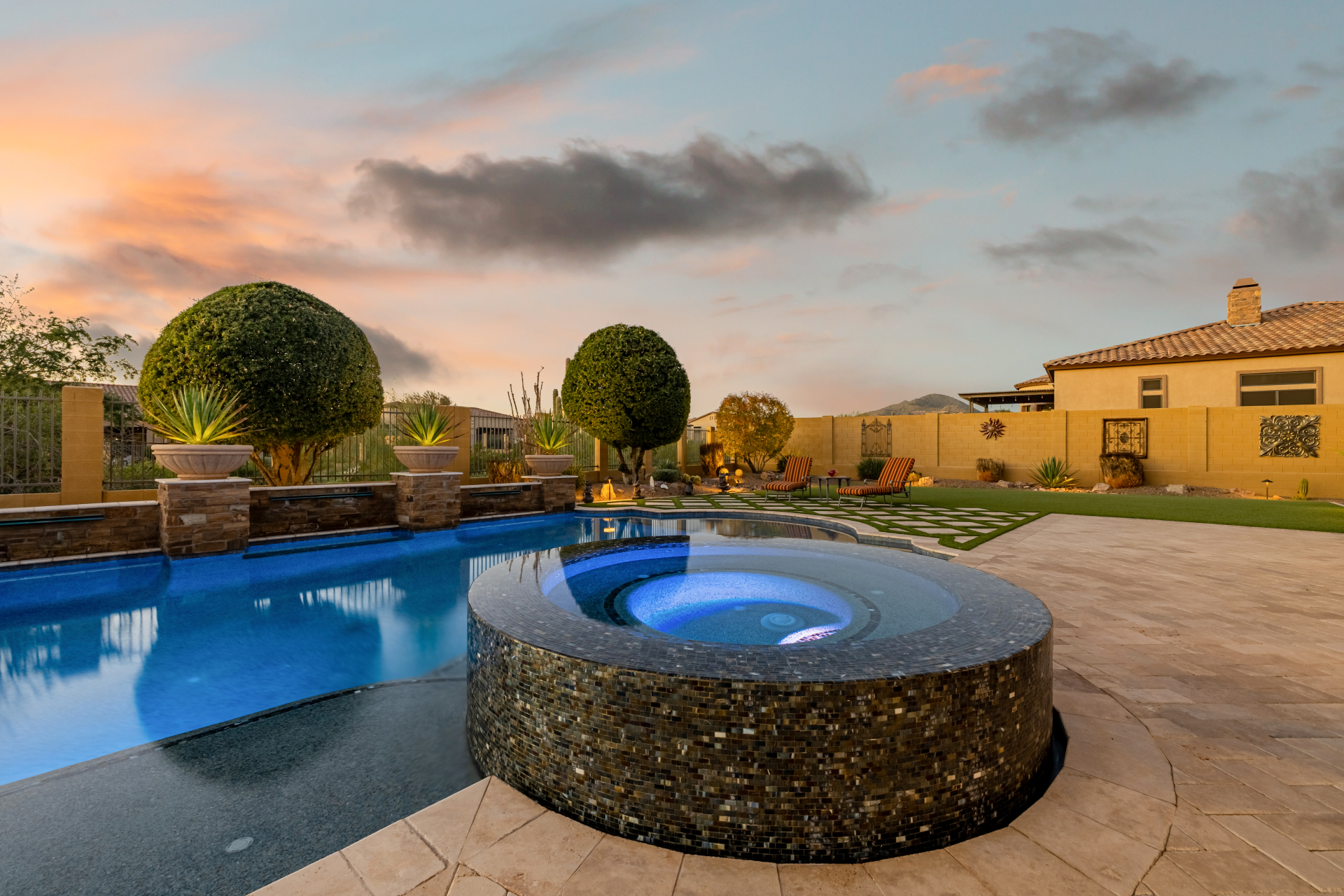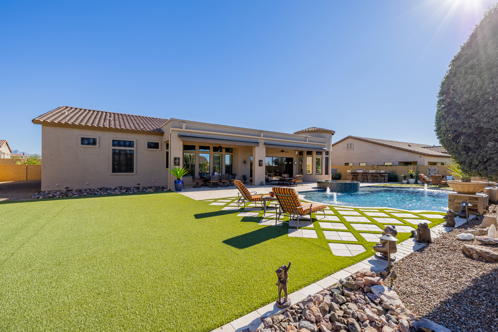 Experience the ultimate in luxury desert living within the exclusive gated enclave of Riviera at Mountain Bridge, one of Mesa's premier master-planned communities nestled in the scenic Desert Uplands of Northeast Mesa. Every detail of this home reflects quality, pride of ownership & timeless sophistication. Single level living! Impeccable curb appeal & manicured landscaping set the tone as you enter this home through a custom iron gate into a private courtyard, leading to a stunning custom iron entry door and dramatic rotunda foyer. This single-level residence features 4 ensuite bedrooms, 4.5 baths & an oversized FOUR CAR garage a car enthusiast's dream with epoxy flooring, built-in cabinetry & direct backyard access.Inside 9 & 12-foot ceilings, plantation shutters & designer finishes elevate every space. Off the foyer, an attached oversized casita with a full bath and walk-in closet provides ideal space for guests, multi-generational living, a game room, or a second owner's suite.