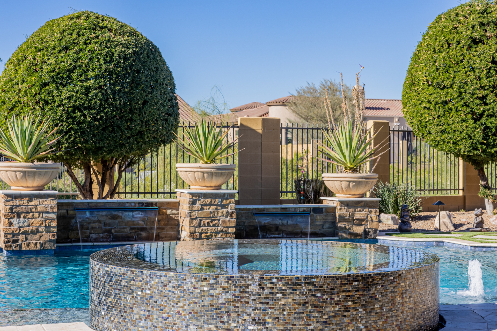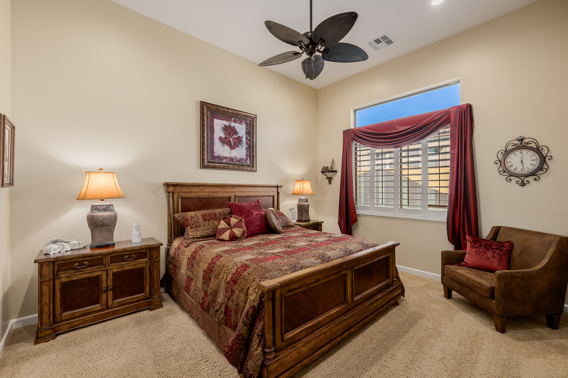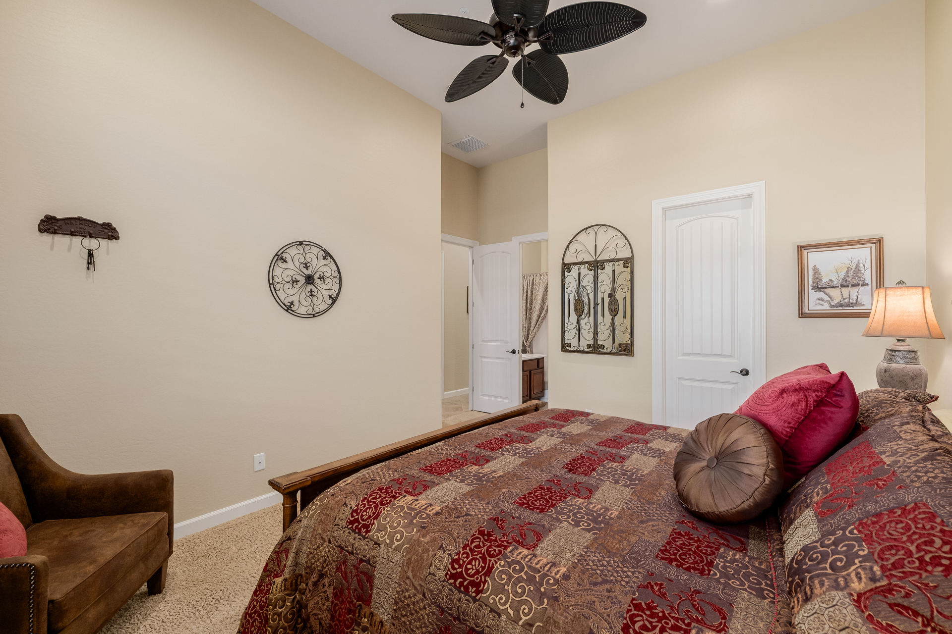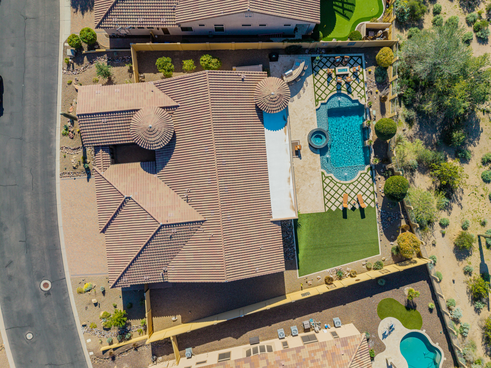 Experience the ultimate in luxury desert living within the exclusive gated enclave of Riviera at Mountain Bridge, one of Mesa's premier master-planned communities nestled in the scenic Desert Uplands of Northeast Mesa. Every detail of this home reflects quality, pride of ownership & timeless sophistication. Single level living! Impeccable curb appeal & manicured landscaping set the tone as you enter this home through a custom iron gate into a private courtyard, leading to a stunning custom iron entry door and dramatic rotunda foyer. This single-level residence features 4 ensuite bedrooms, 4.5 baths & an oversized FOUR CAR garage a car enthusiast's dream with epoxy flooring, built-in cabinetry & direct backyard access.Inside 9 & 12-foot ceilings, plantation shutters & designer finishes elevate every space. Off the foyer, an attached oversized casita with a full bath and walk-in closet provides ideal space for guests, multi-generational living, a game room, or a second owner's suite.