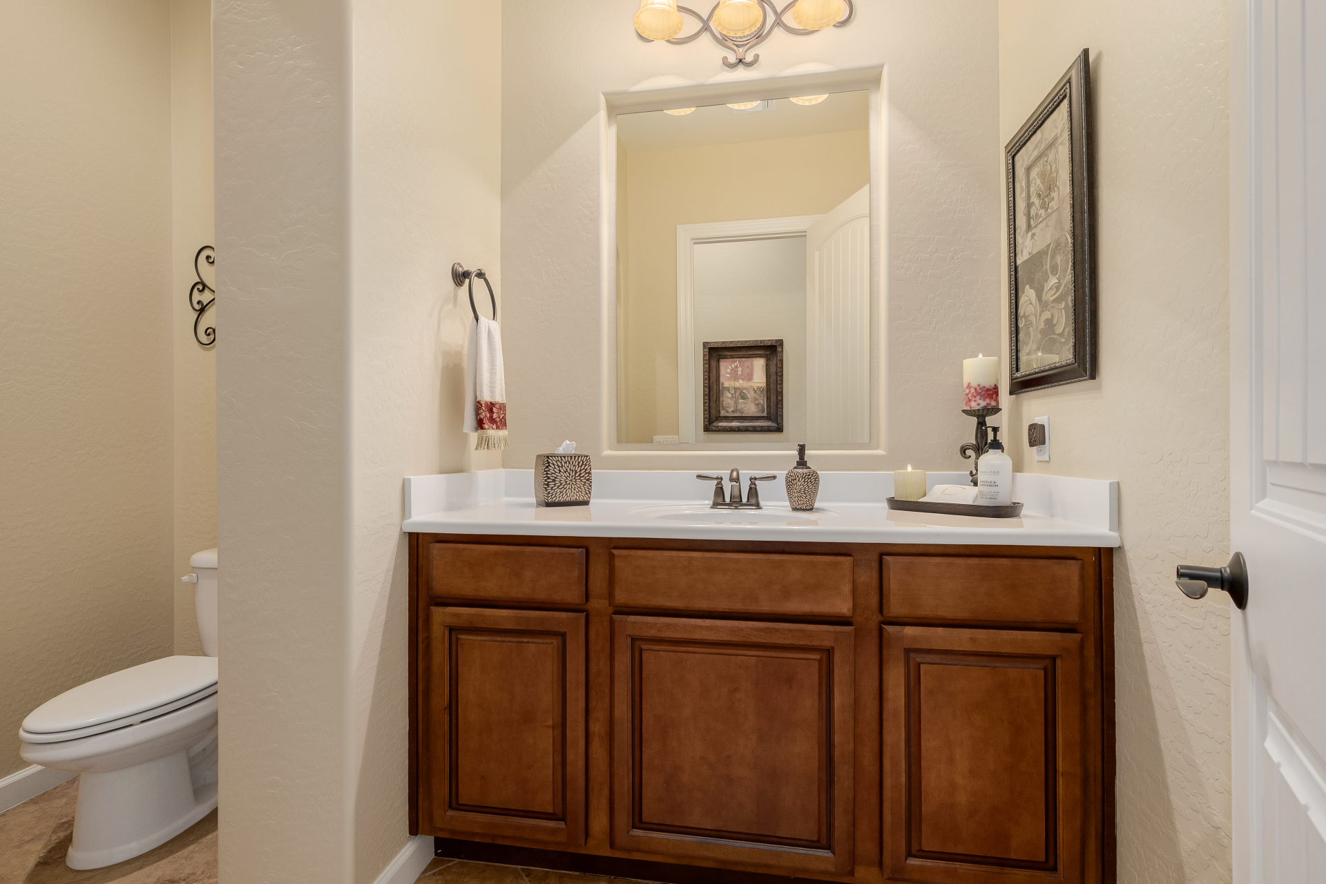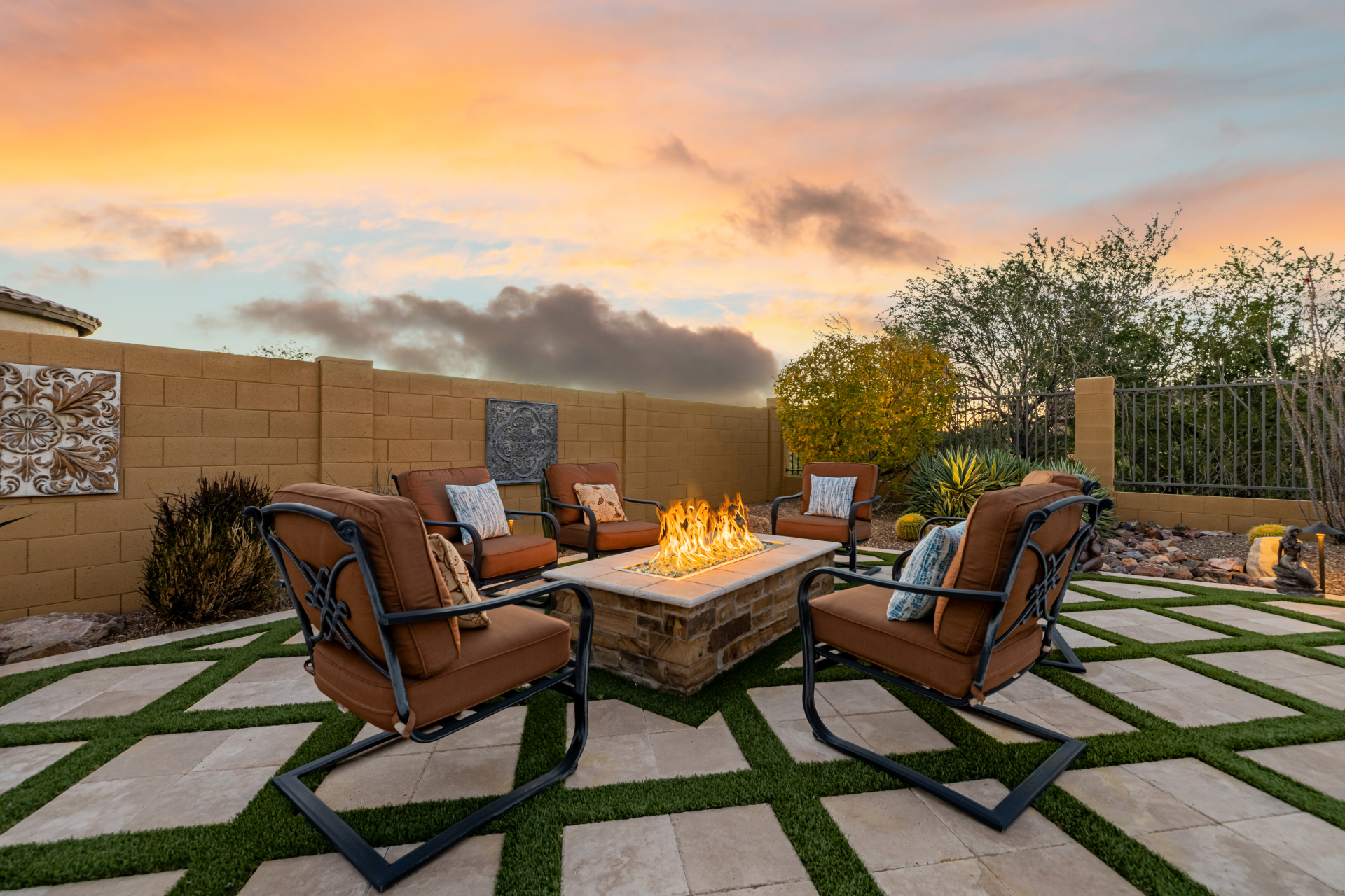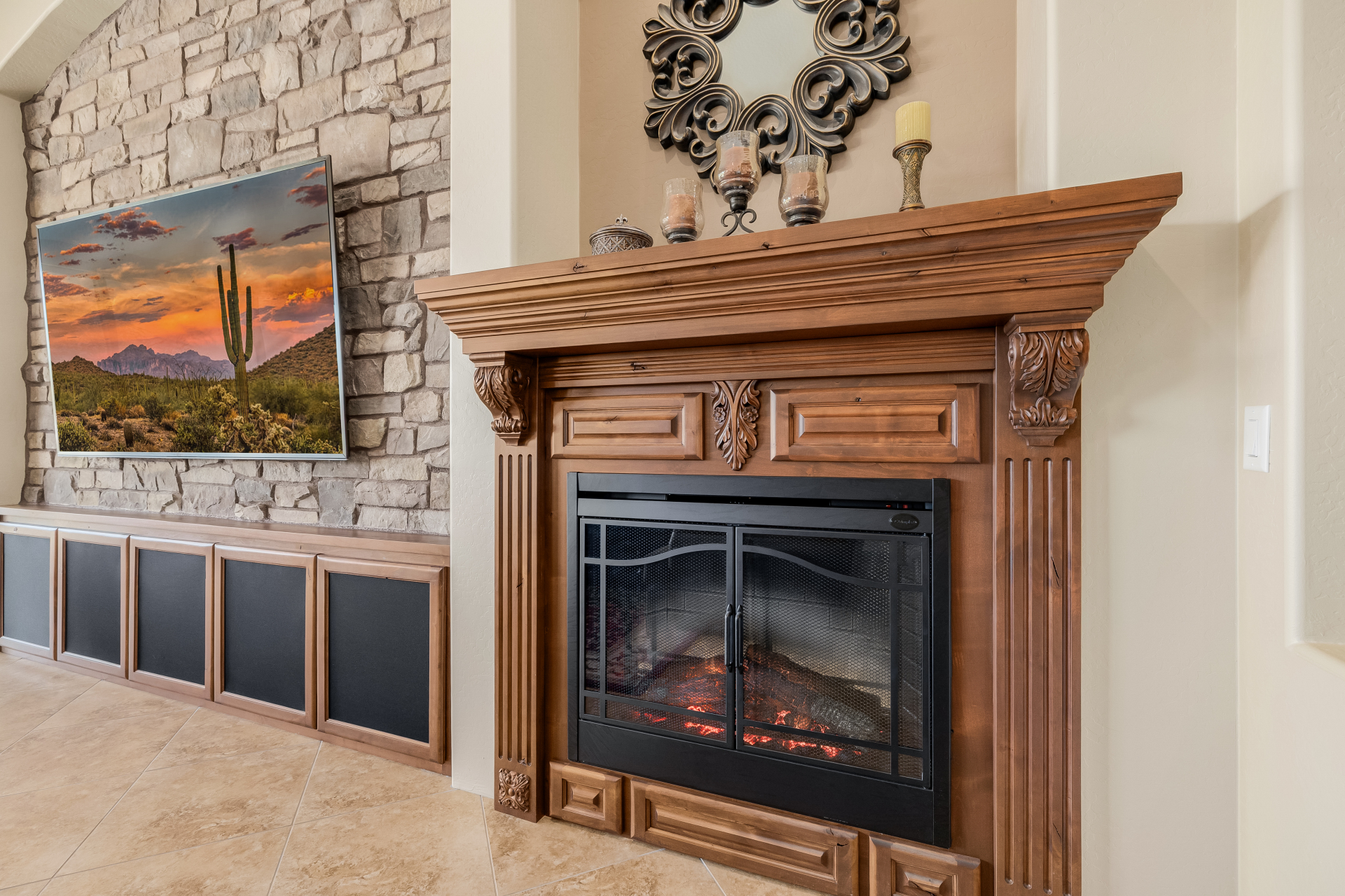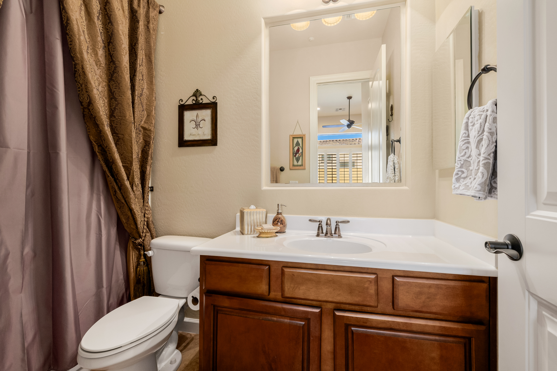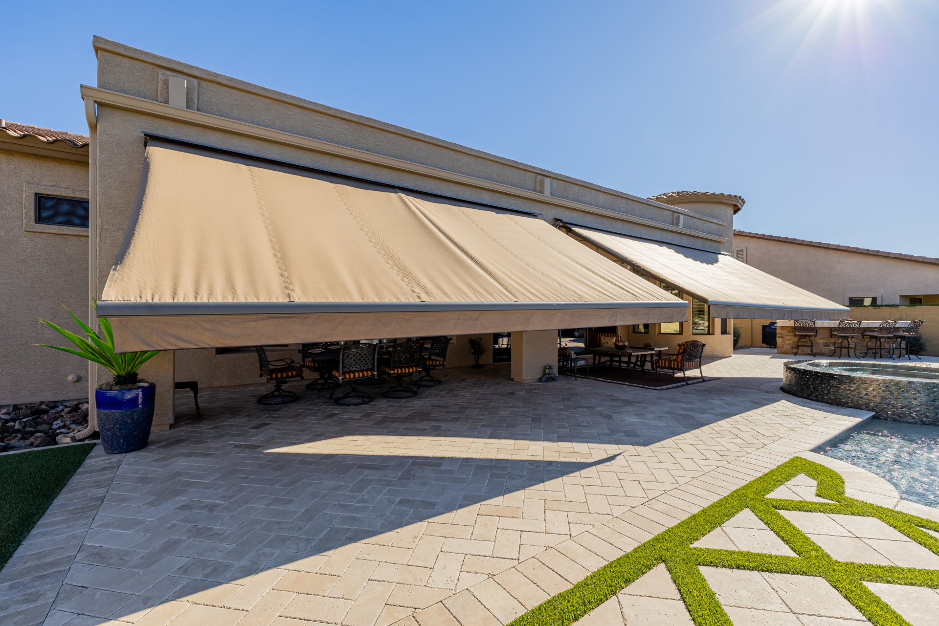 Experience the ultimate in luxury desert living within the exclusive gated enclave of Riviera at Mountain Bridge, one of Mesa's premier master-planned communities nestled in the scenic Desert Uplands of Northeast Mesa. Every detail of this home reflects quality, pride of ownership & timeless sophistication. Single level living! Impeccable curb appeal & manicured landscaping set the tone as you enter this home through a custom iron gate into a private courtyard, leading to a stunning custom iron entry door and dramatic rotunda foyer. This single-level residence features 4 ensuite bedrooms, 4.5 baths & an oversized FOUR CAR garage a car enthusiast's dream with epoxy flooring, built-in cabinetry & direct backyard access.Inside 9 & 12-foot ceilings, plantation shutters & designer finishes elevate every space. Off the foyer, an attached oversized casita with a full bath and walk-in closet provides ideal space for guests, multi-generational living, a game room, or a second owner's suite.