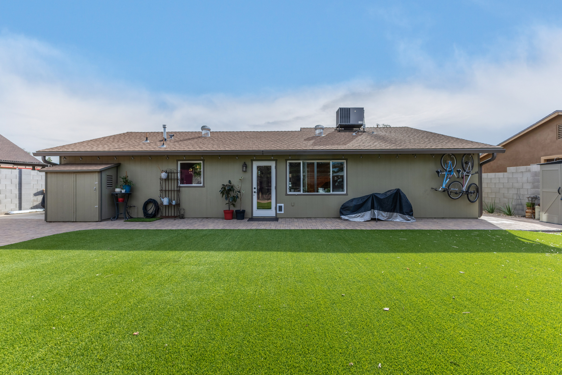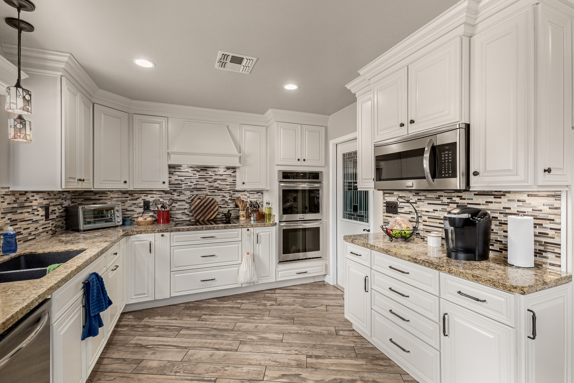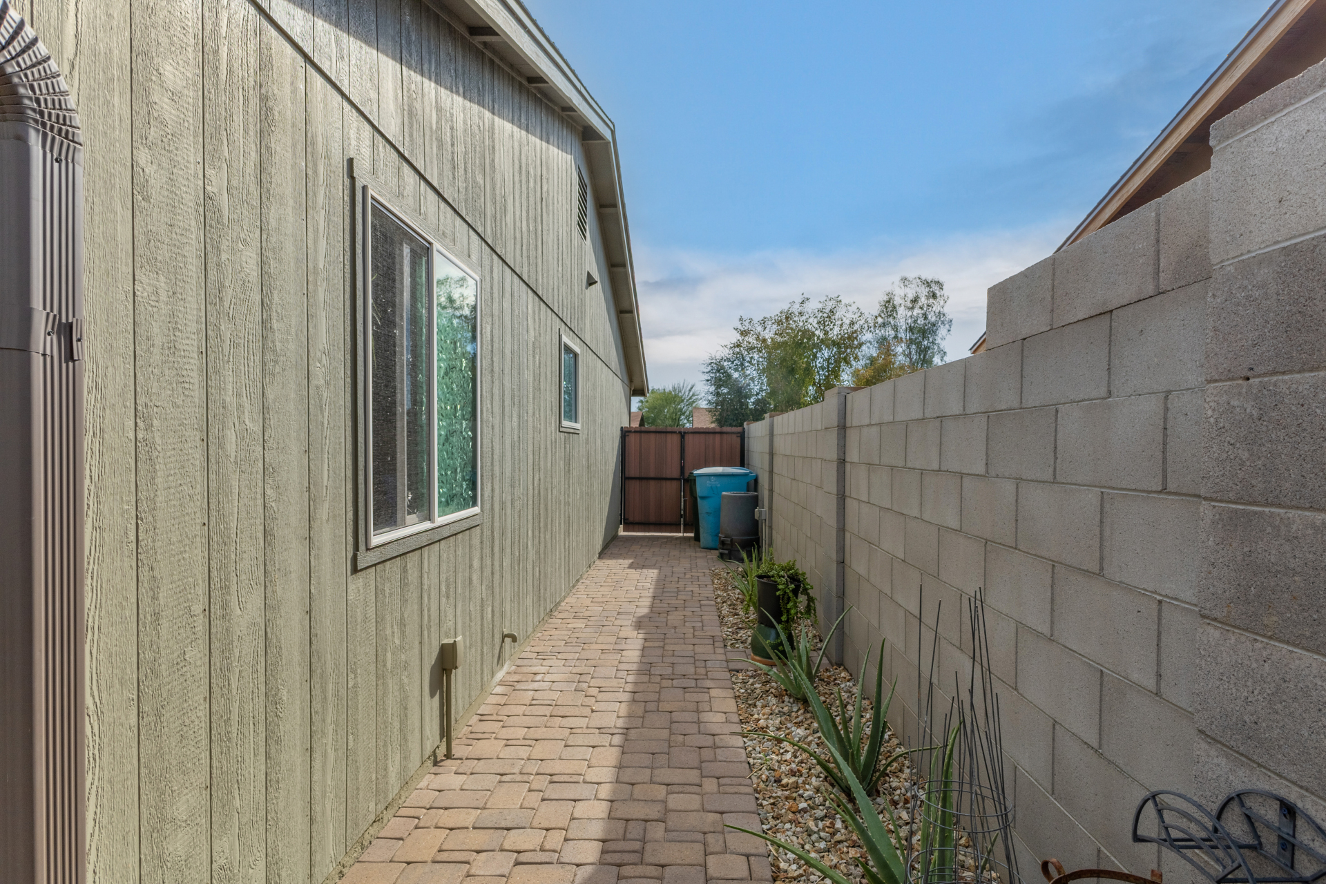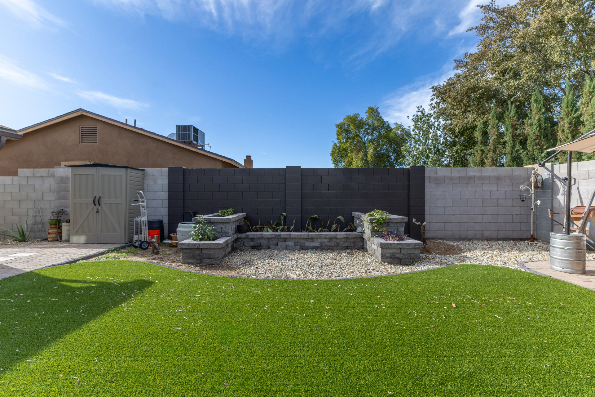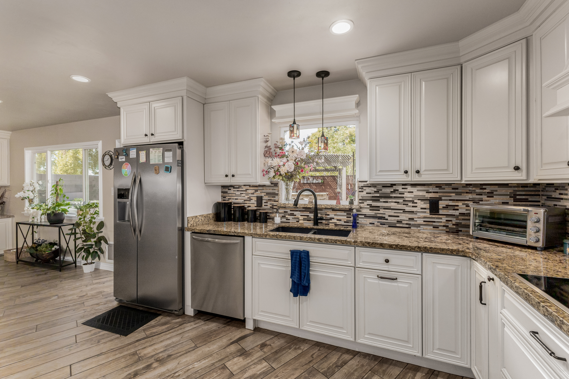 Beautifully upgraded home featuring 22.5° plank tile flooring, 4'' baseboards, pocket doors, and dual-pane encased nylon windows. The kitchen offers granite counters, custom soft-close cabinets with 9'' crown molding, appliance garage, graphite undermount sink, pendant lighting, custom hood, built-in microwave, smooth-top range, and dual ovens including convection. Great room has a stone-veneer accent wall. Bedrooms include built-ins; primary bath features granite counters, dual undermount sinks, stone veneer wall, and travertine rain-head shower. Backyard includes synthetic grass, pavers, and built-in BBQ under a lattice patio with lighting and fan. Front yard gravel/stone with pavers, RV gate, gutters. Extended 2-car garage with insulated garage door, built-in cabinets, granite worktop & security cameras.