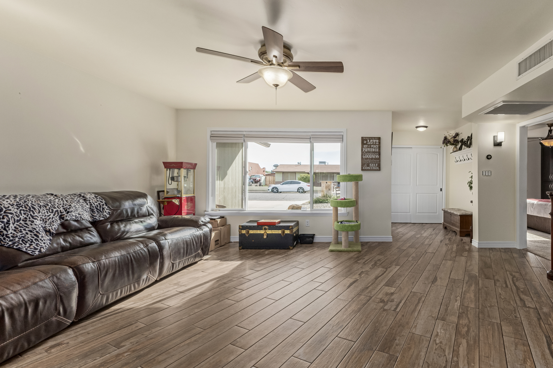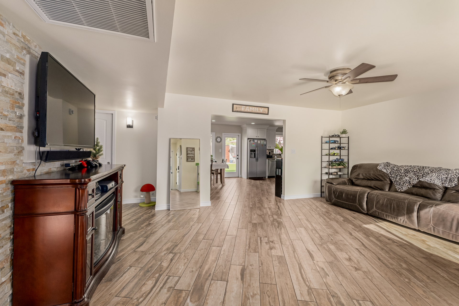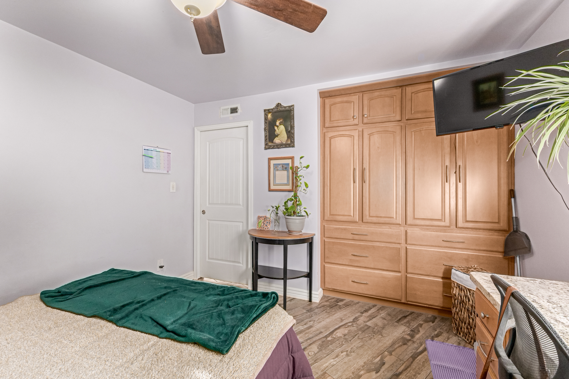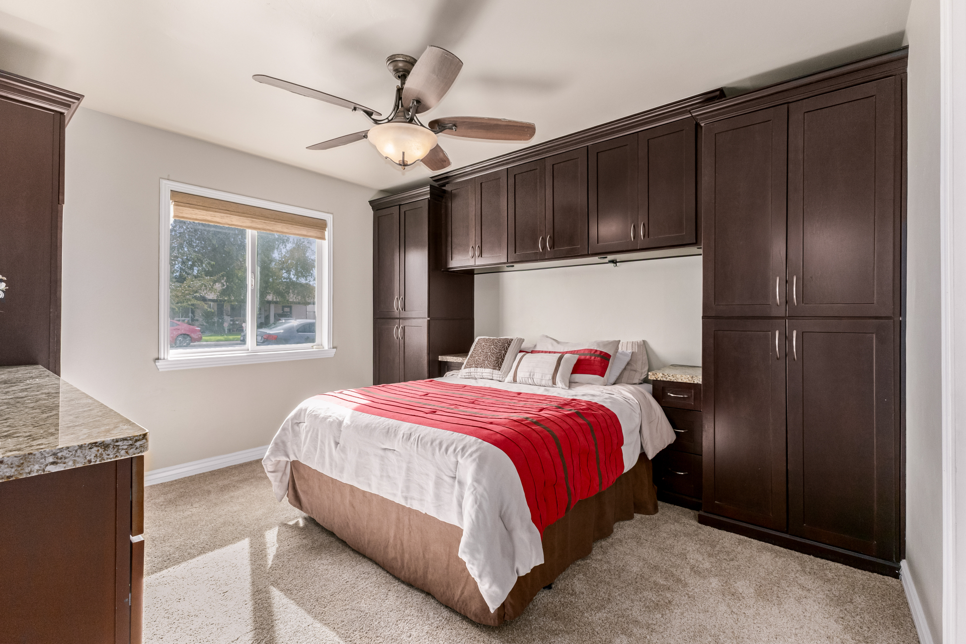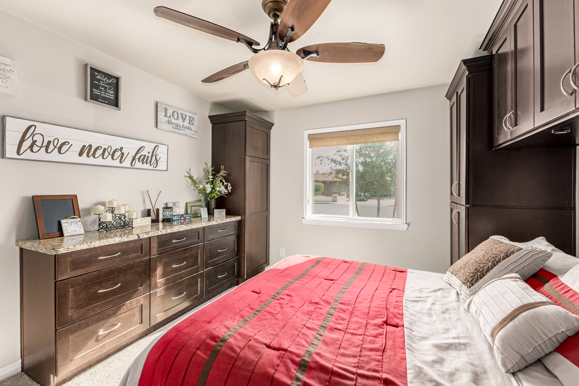 Beautifully upgraded home featuring 22.5° plank tile flooring, 4'' baseboards, pocket doors, and dual-pane encased nylon windows. The kitchen offers granite counters, custom soft-close cabinets with 9'' crown molding, appliance garage, graphite undermount sink, pendant lighting, custom hood, built-in microwave, smooth-top range, and dual ovens including convection. Great room has a stone-veneer accent wall. Bedrooms include built-ins; primary bath features granite counters, dual undermount sinks, stone veneer wall, and travertine rain-head shower. Backyard includes synthetic grass, pavers, and built-in BBQ under a lattice patio with lighting and fan. Front yard gravel/stone with pavers, RV gate, gutters. Extended 2-car garage with insulated garage door, built-in cabinets, granite worktop & security cameras.