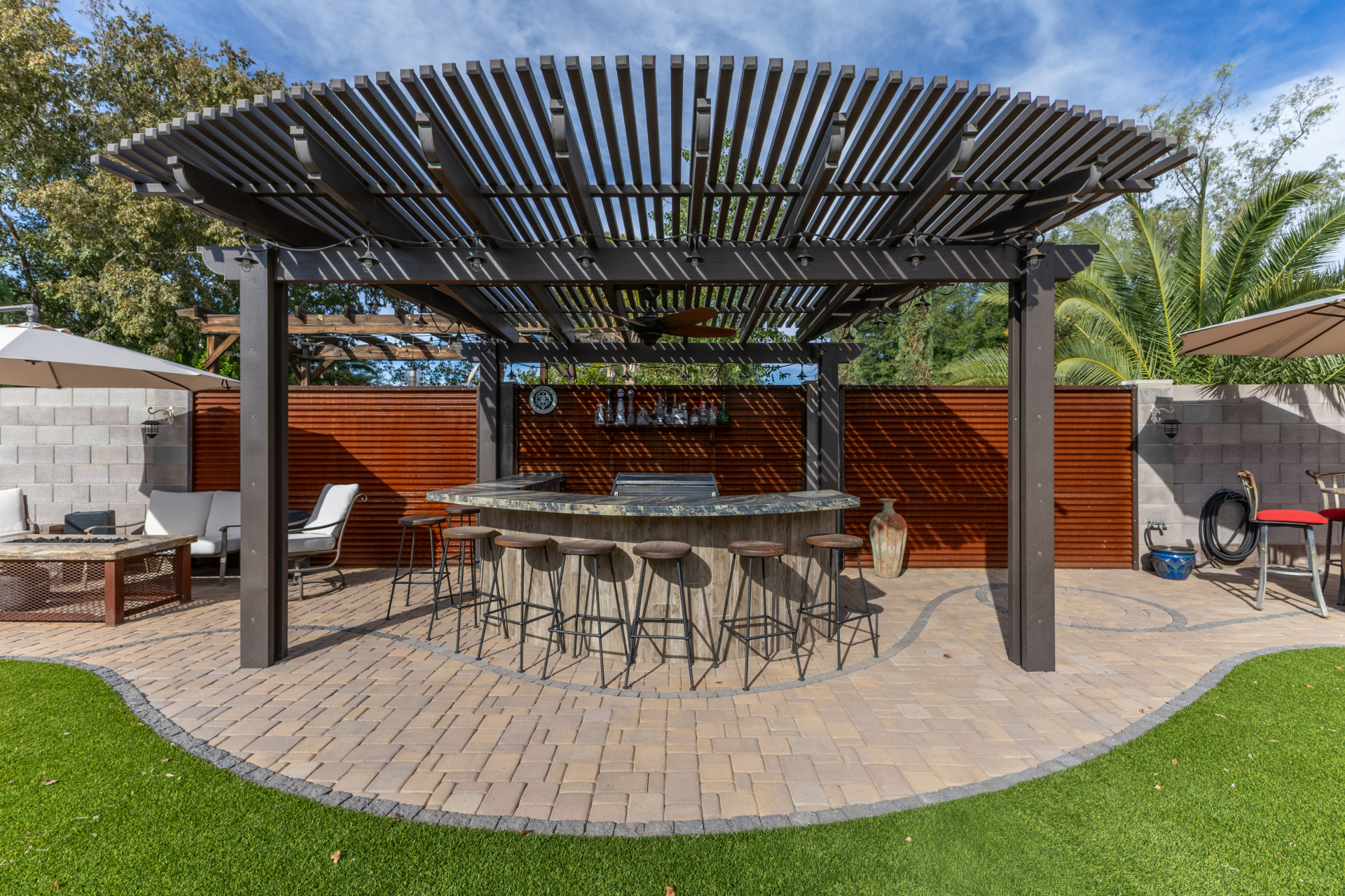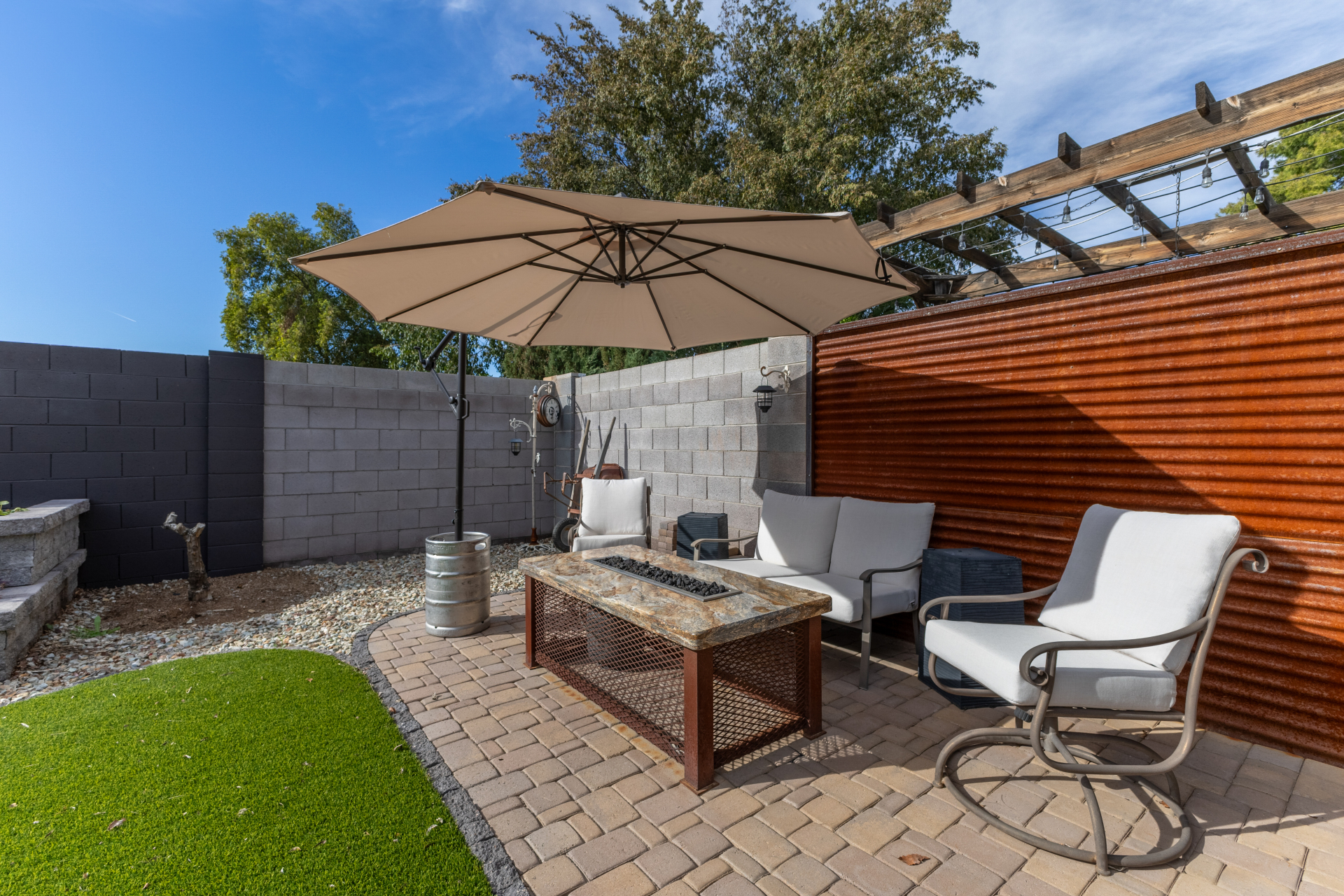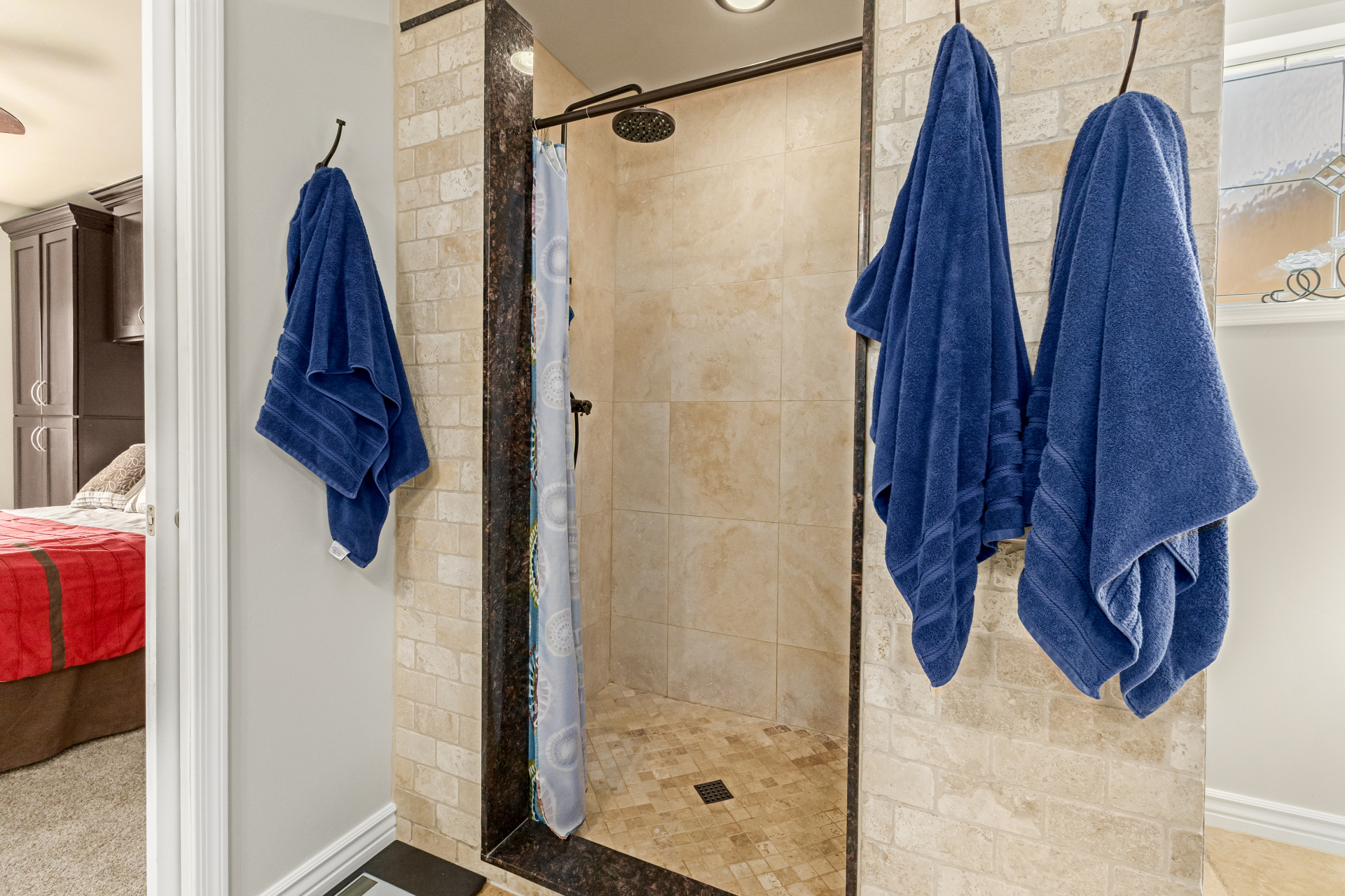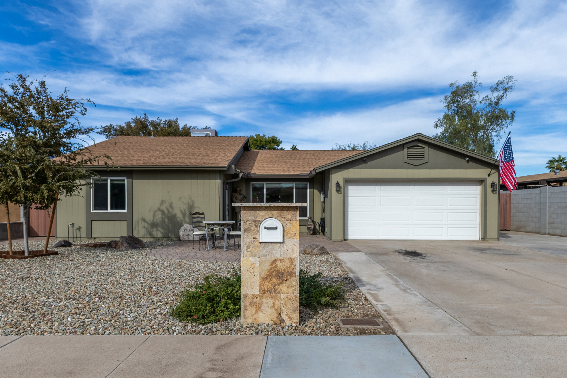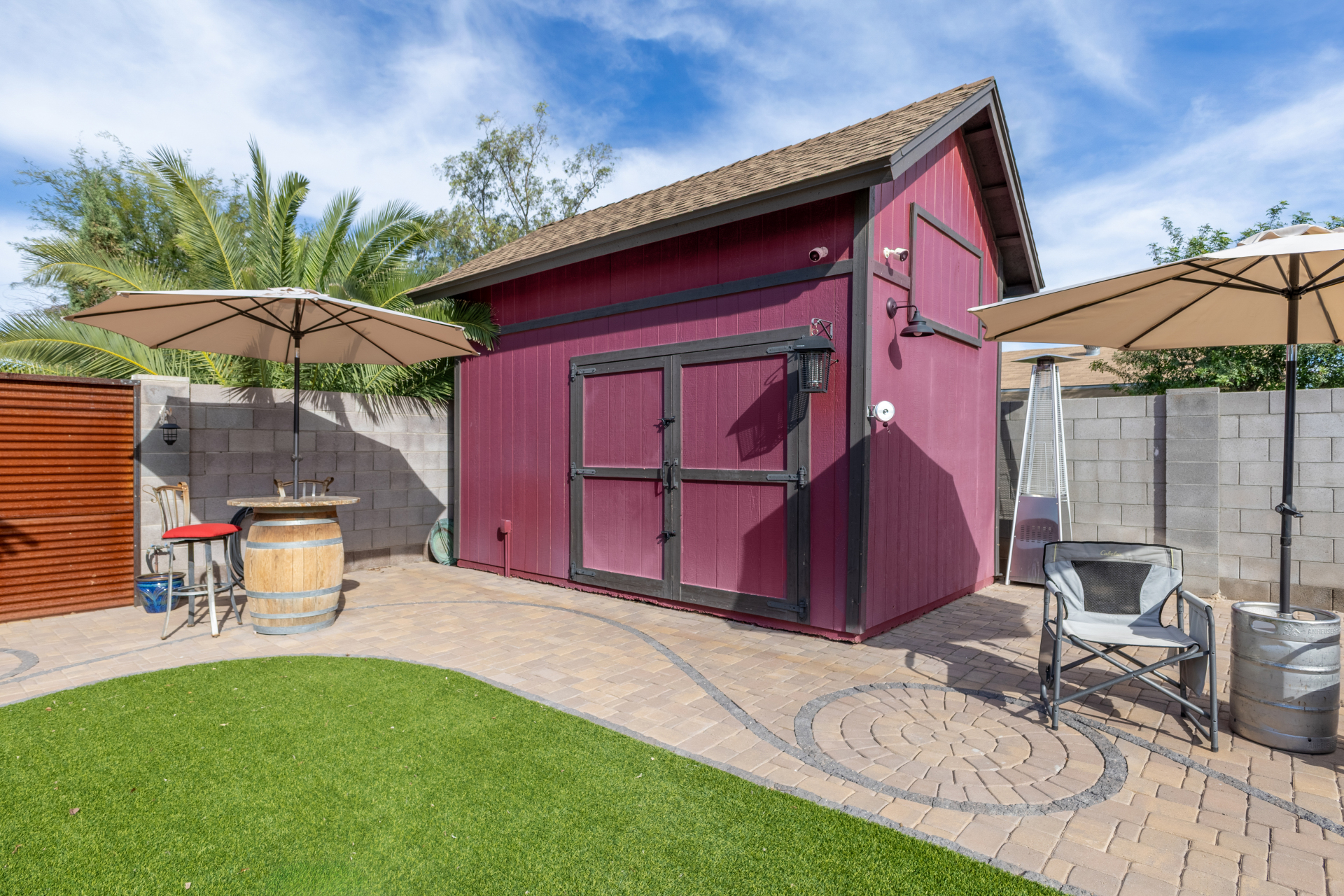 Beautifully upgraded home featuring 22.5° plank tile flooring, 4'' baseboards, pocket doors, and dual-pane encased nylon windows. The kitchen offers granite counters, custom soft-close cabinets with 9'' crown molding, appliance garage, graphite undermount sink, pendant lighting, custom hood, built-in microwave, smooth-top range, and dual ovens including convection. Great room has a stone-veneer accent wall. Bedrooms include built-ins; primary bath features granite counters, dual undermount sinks, stone veneer wall, and travertine rain-head shower. Backyard includes synthetic grass, pavers, and built-in BBQ under a lattice patio with lighting and fan. Front yard gravel/stone with pavers, RV gate, gutters. Extended 2-car garage with insulated garage door, built-in cabinets, granite worktop & security cameras.