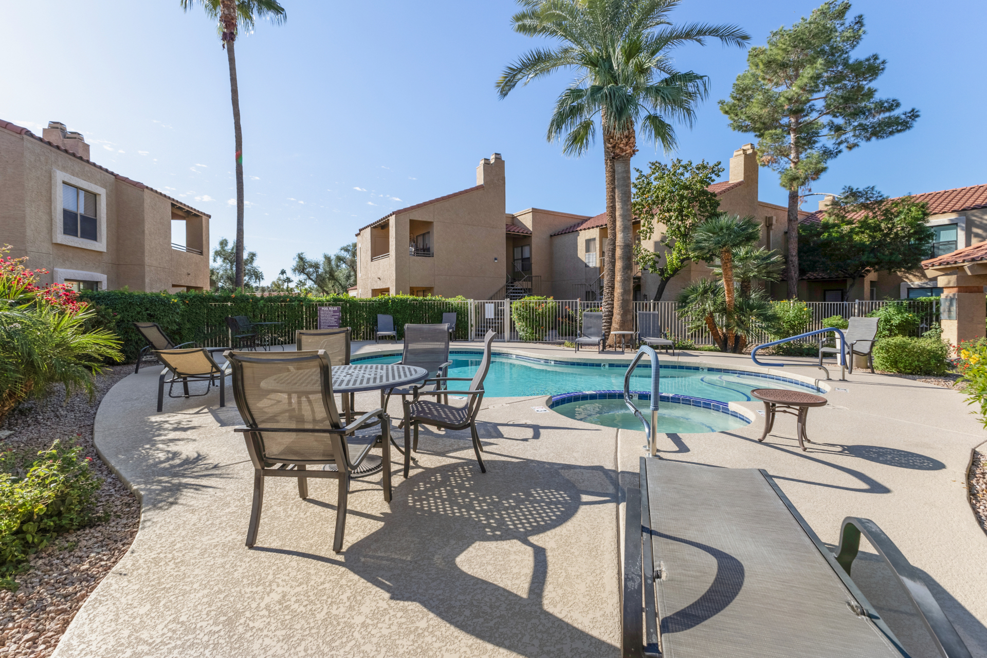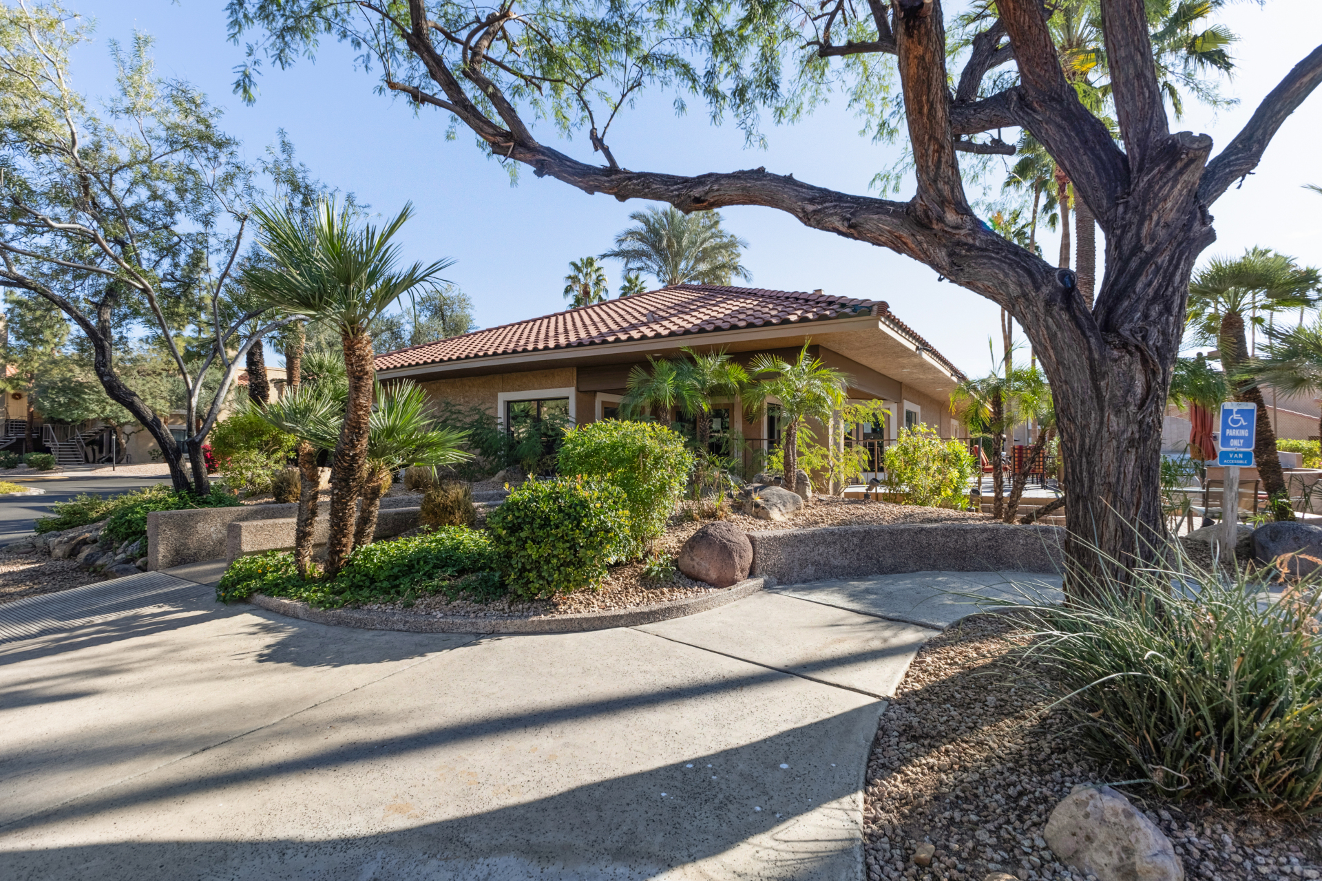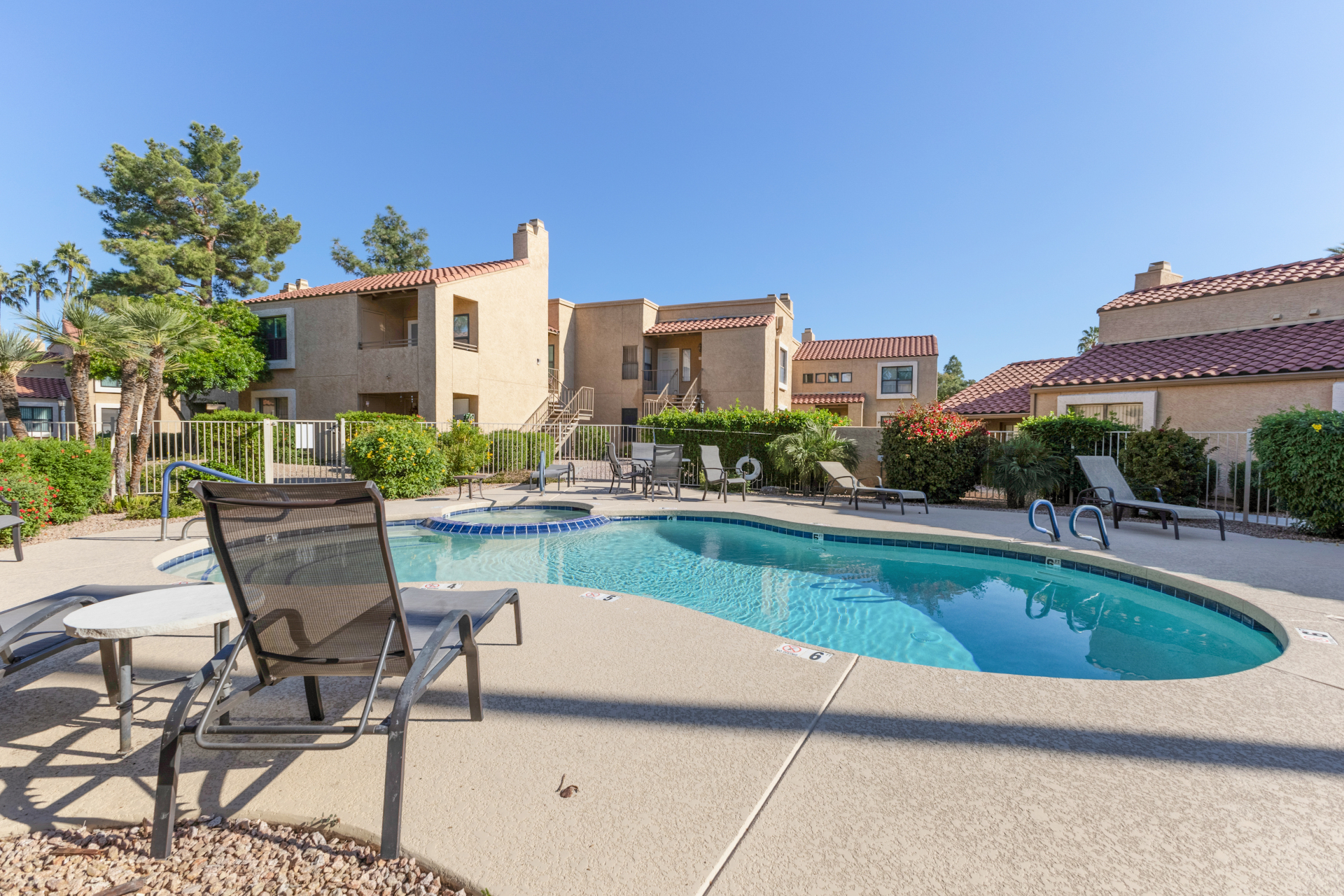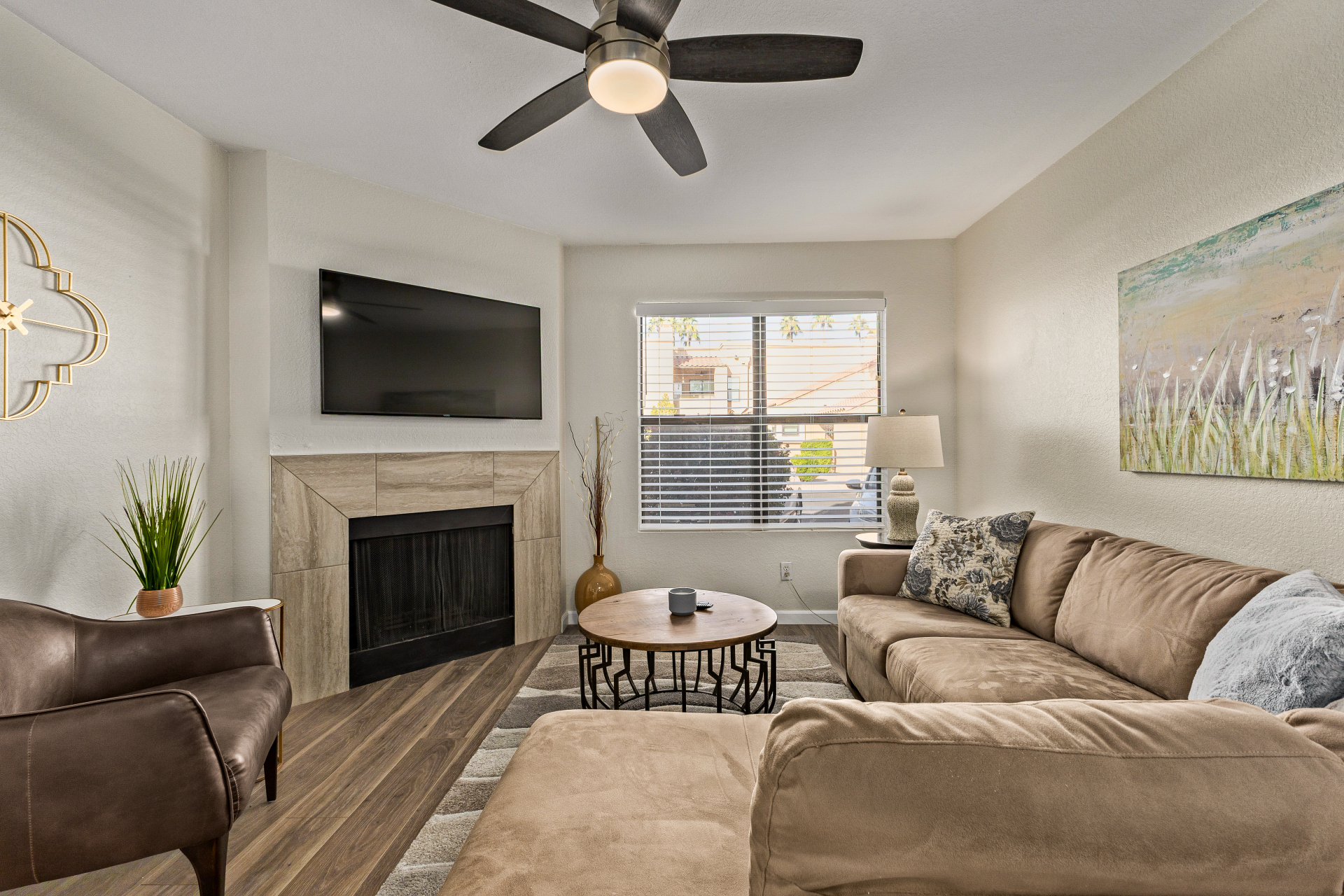 This charming 2-bedroom condo awaits you in the desirable McCormick Ranch! Explore the bright interior, showcasing wood-look flooring, a fireplace to add warmth, and a soothing palette that creates a cozy ambiance throughout. Whip up your signature dishes in the impeccable kitchen, equipped with ample cabinetry, tile backsplash, a granite peninsula, and built-in essentials. The primary retreat promises a good night's sleep and boasts a bathroom with double sinks and a closet. Enjoy your morning brew under the cozy covered patio, and don't forget to visit the community's pool, spa, clubhouse, and other amenities for a relaxing time! This home is a must-see!
