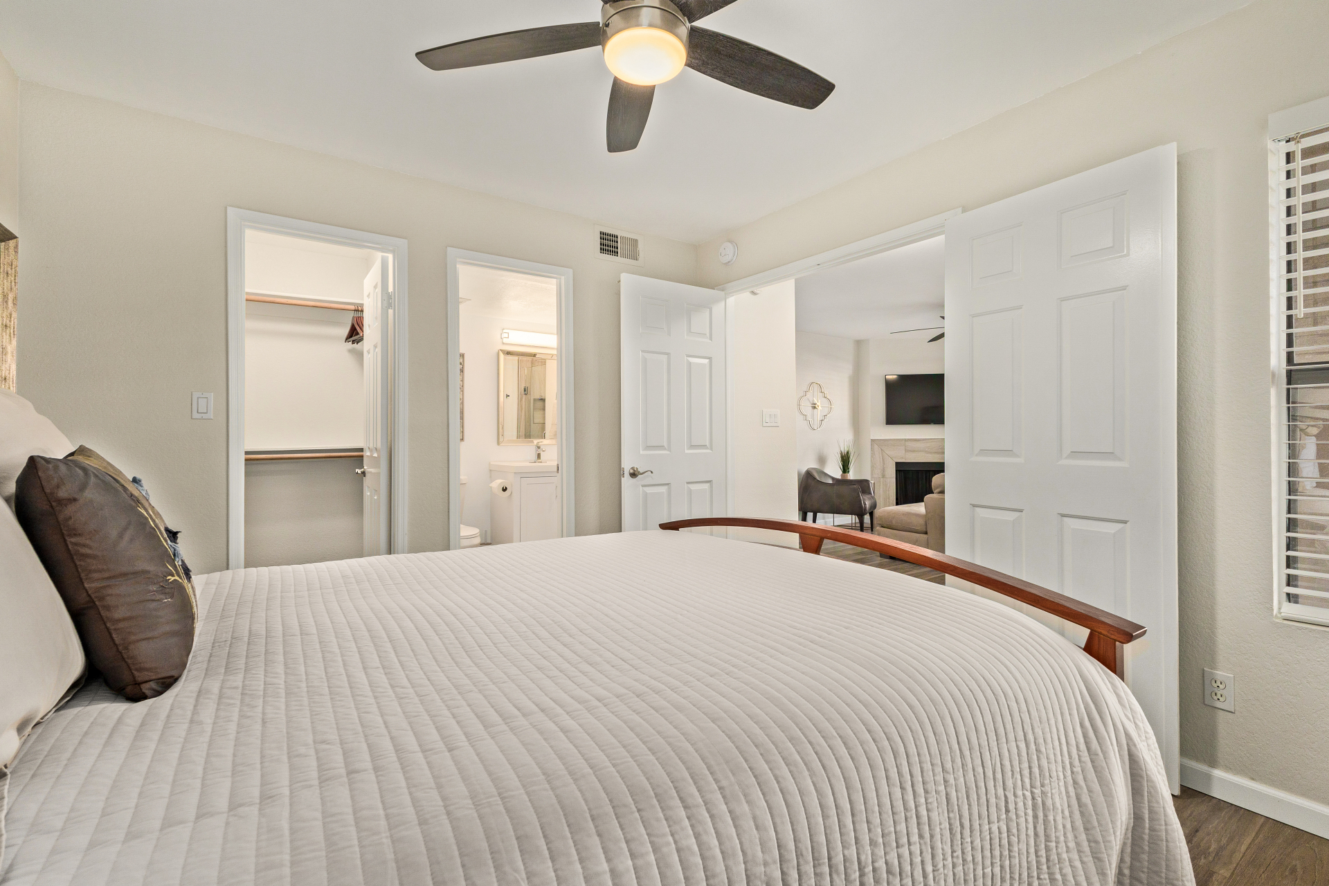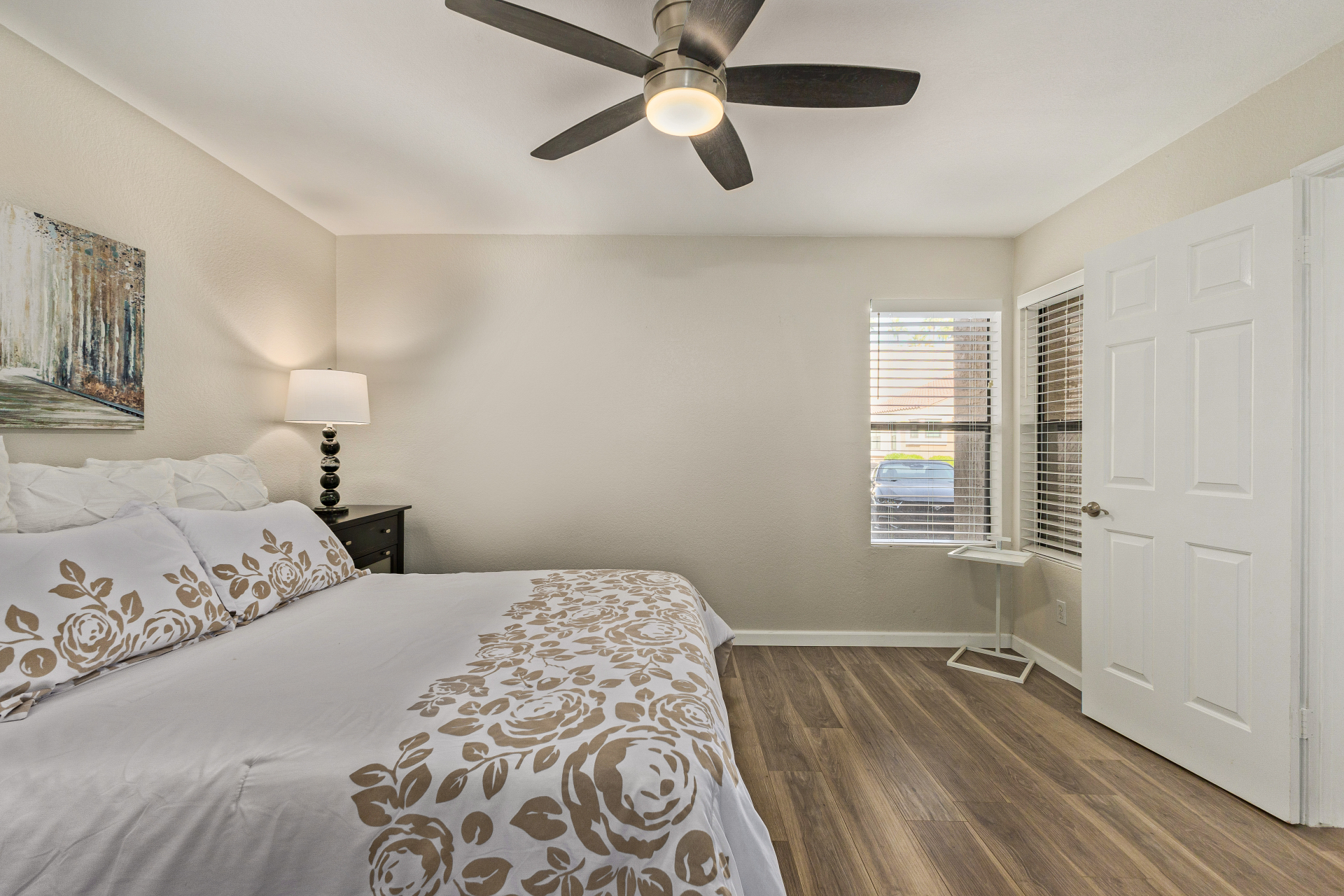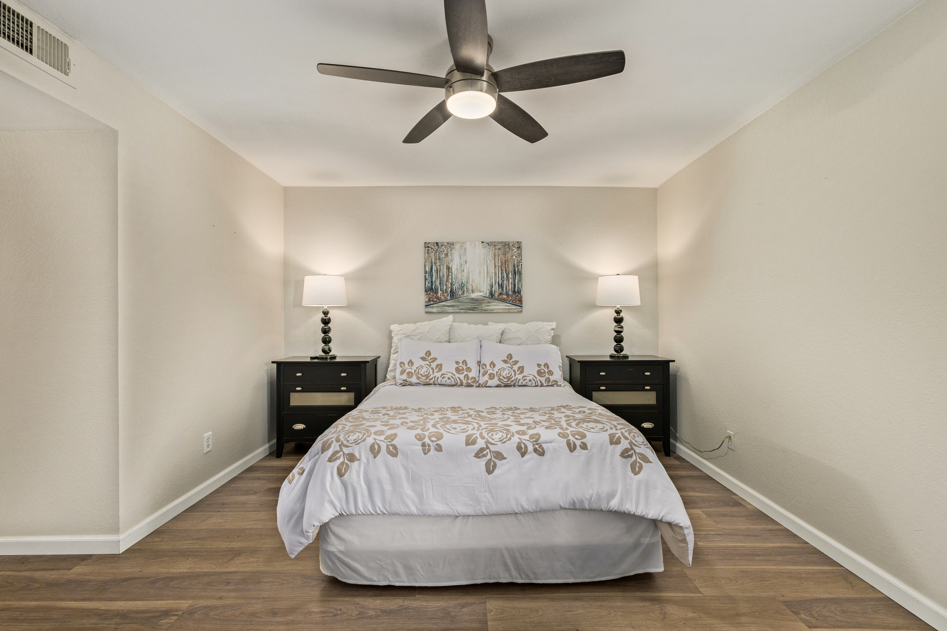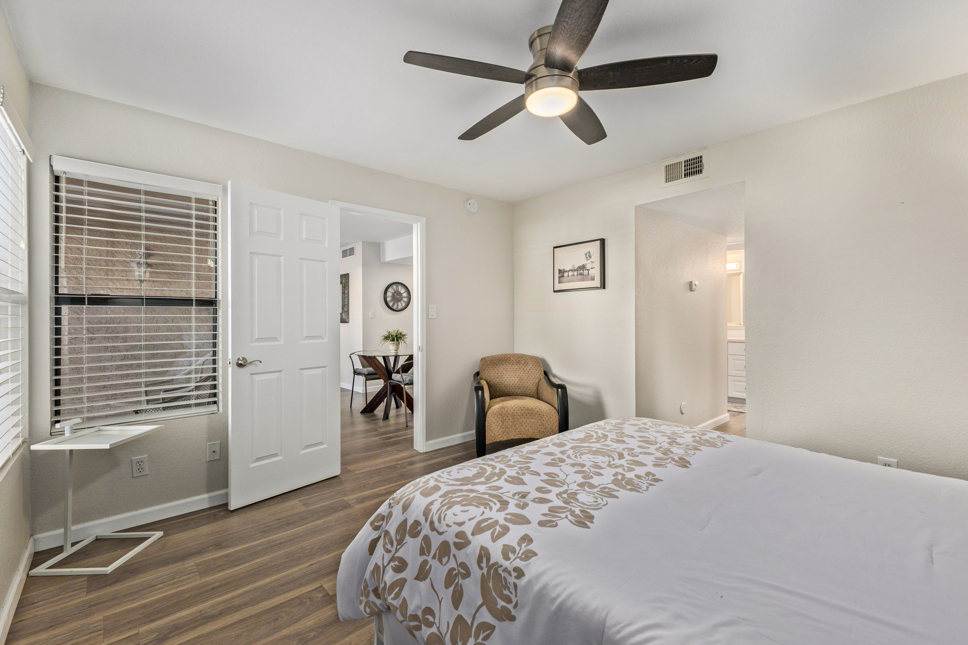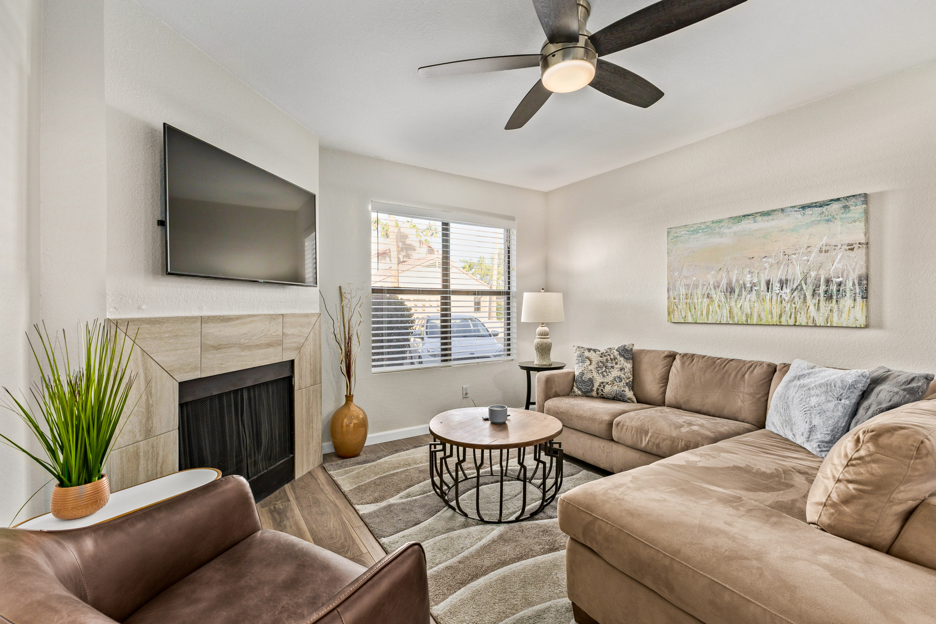 This charming 2-bedroom condo awaits you in the desirable McCormick Ranch! Explore the bright interior, showcasing wood-look flooring, a fireplace to add warmth, and a soothing palette that creates a cozy ambiance throughout. Whip up your signature dishes in the impeccable kitchen, equipped with ample cabinetry, tile backsplash, a granite peninsula, and built-in essentials. The primary retreat promises a good night's sleep and boasts a bathroom with double sinks and a closet. Enjoy your morning brew under the cozy covered patio, and don't forget to visit the community's pool, spa, clubhouse, and other amenities for a relaxing time! This home is a must-see!