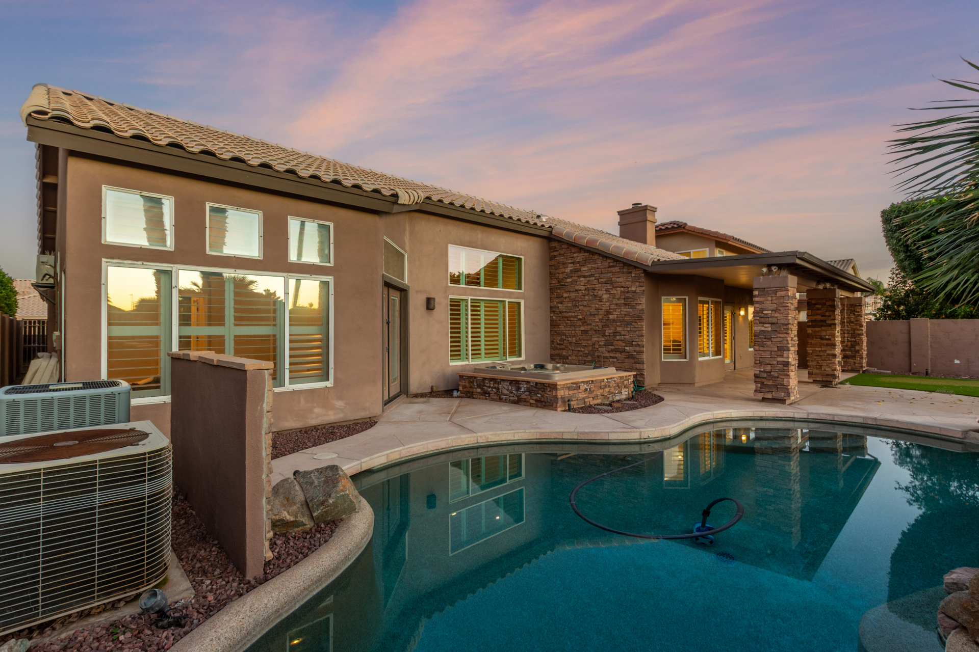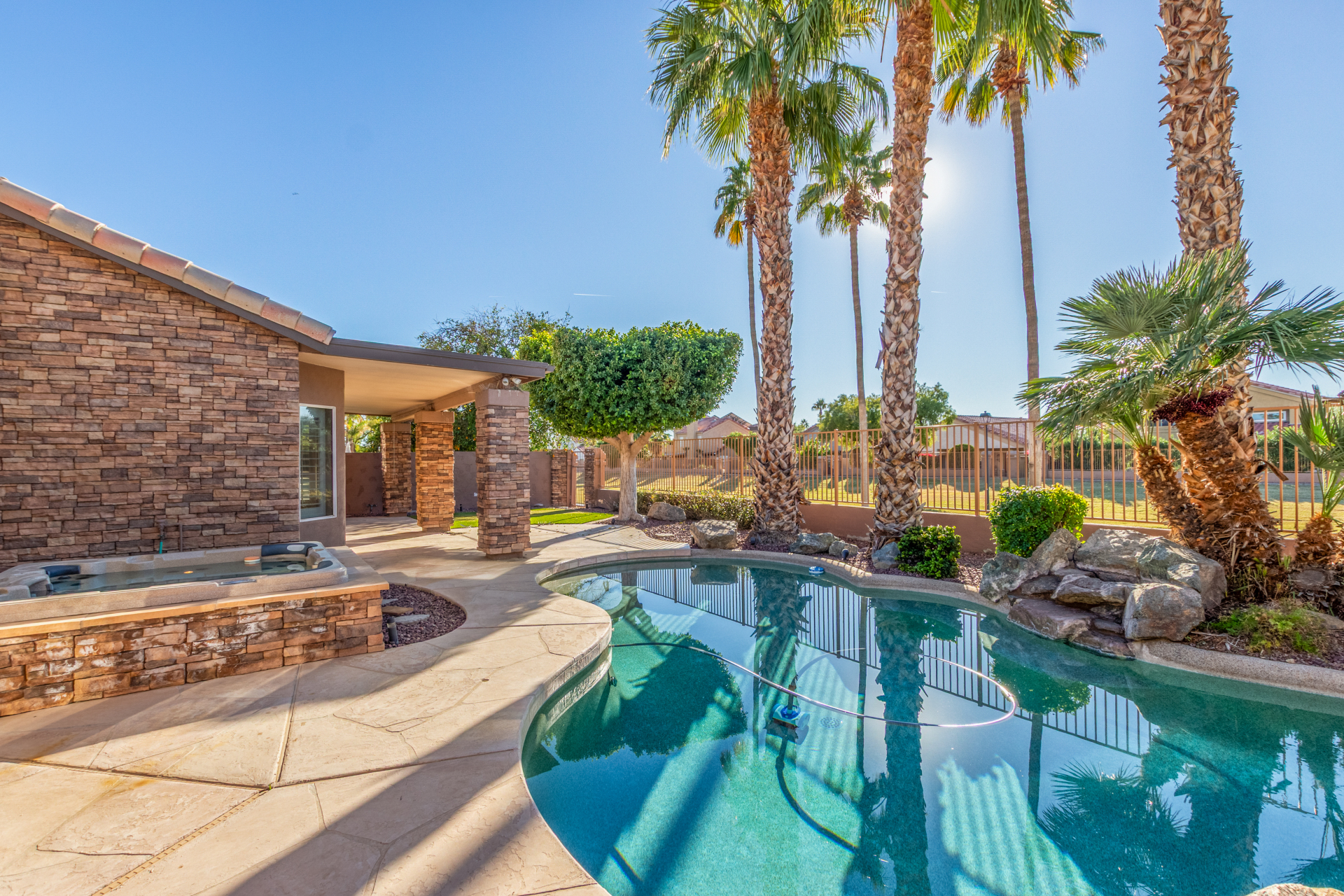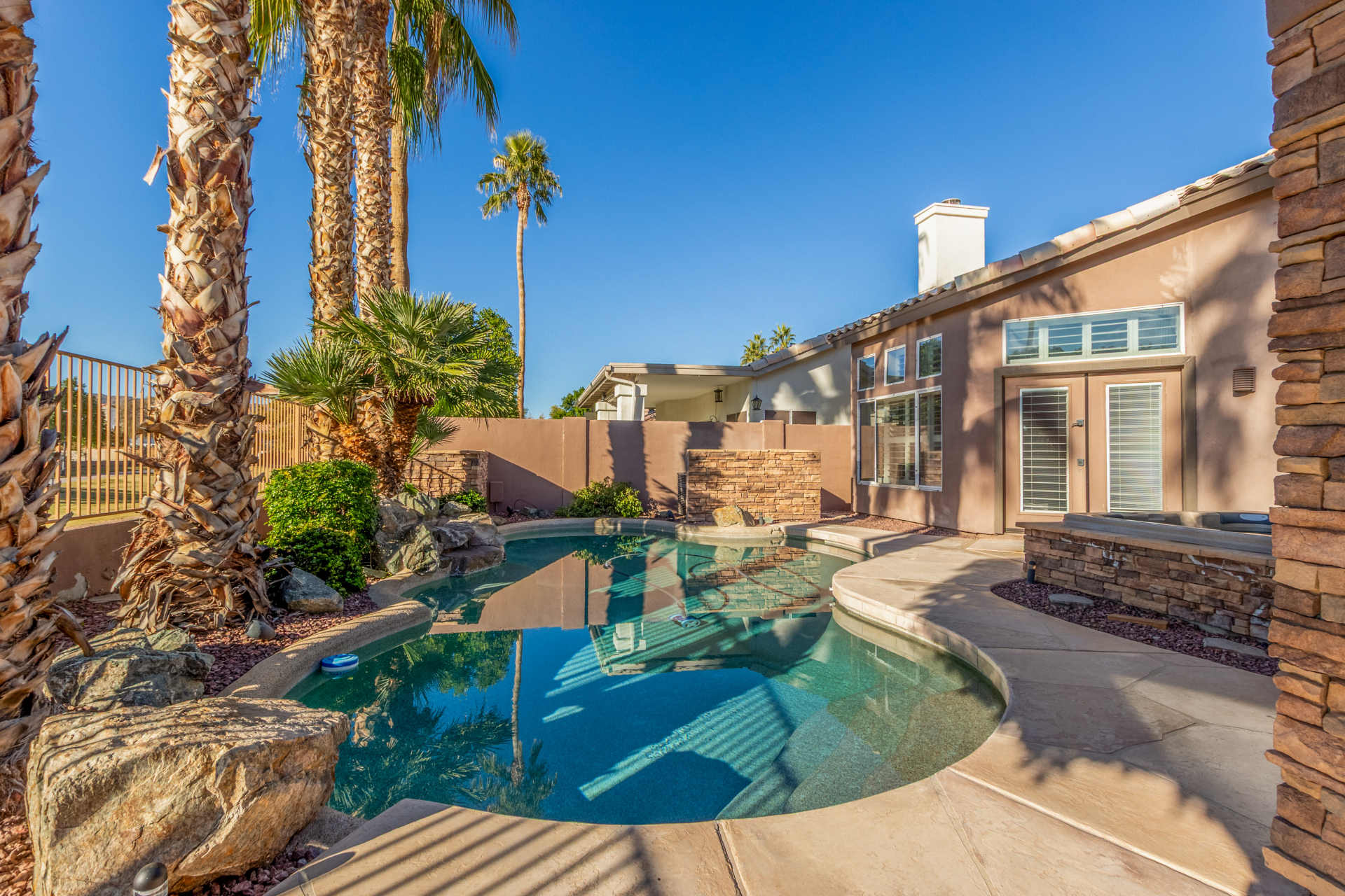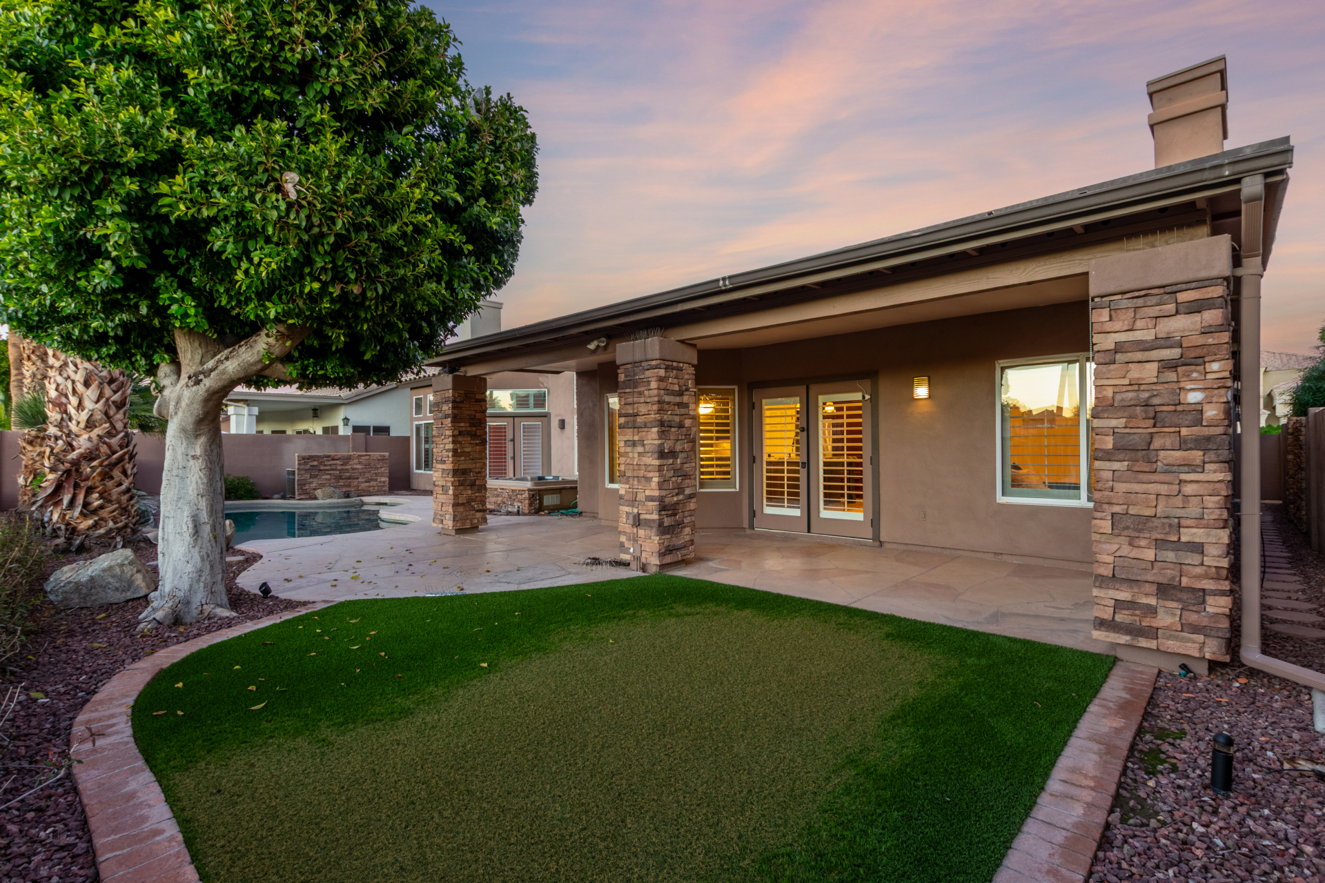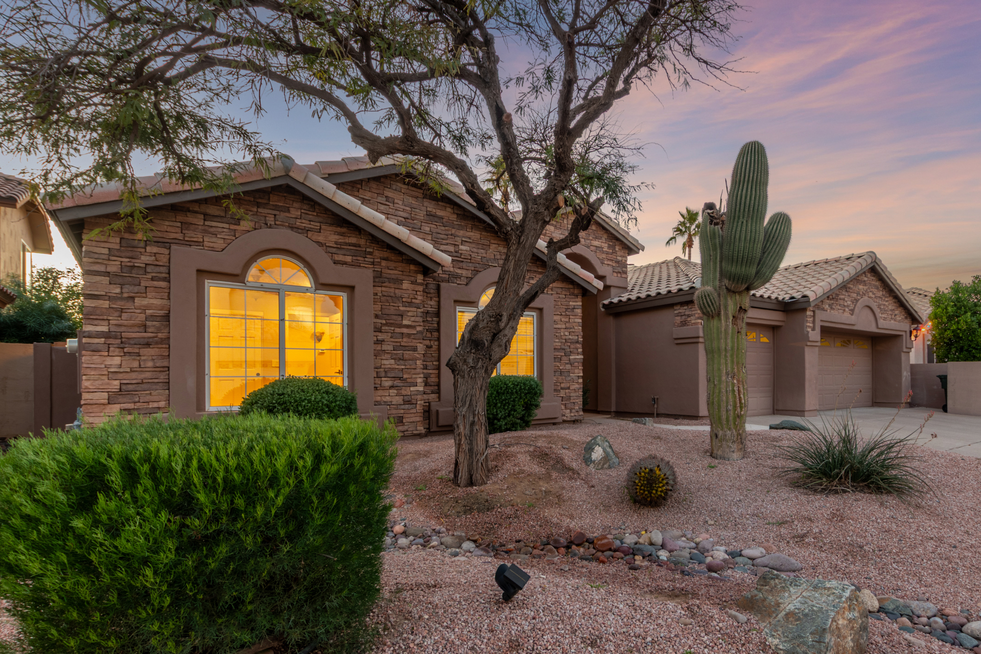 Nestled directly behind the community park set between two serene lakes, this stunning home is ready for you! A stone-accented façade, desert landscaping, & a 3-car garage w/built-in cabinets create impressive curb appeal enhanced by a custom ironwork front door. Discover a welcoming living room, formal dining, & cozy family room. Plantation shutters, recessed lighting, vaulted ceilings, & striking stone-accented gas fireplace can’t be left unsaid. A convenient powder room enhances functionality! The eat-in kitchen showcases staggered cabinets, a walk-in pantry, granite counters, a stone backsplash, SS appliances, & a large island w/breakfast bar. Spacious main bedroom offers French door access to the outdoors & a spa-like ensuite w/dual sinks, jetted tub, glass-enclosed rain shower, & generous walk-in closet. Downstairs, the finished basement provides even more living space with soft carpet and a media niche! The backyard is an entertainer’s paradise with a view fence, full-length covered patio, hot tub.