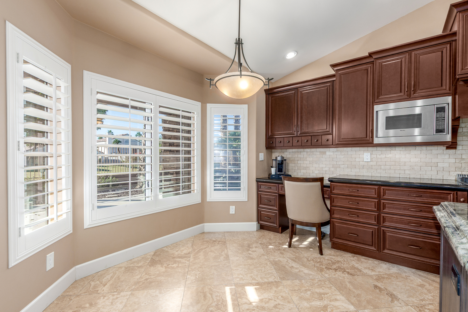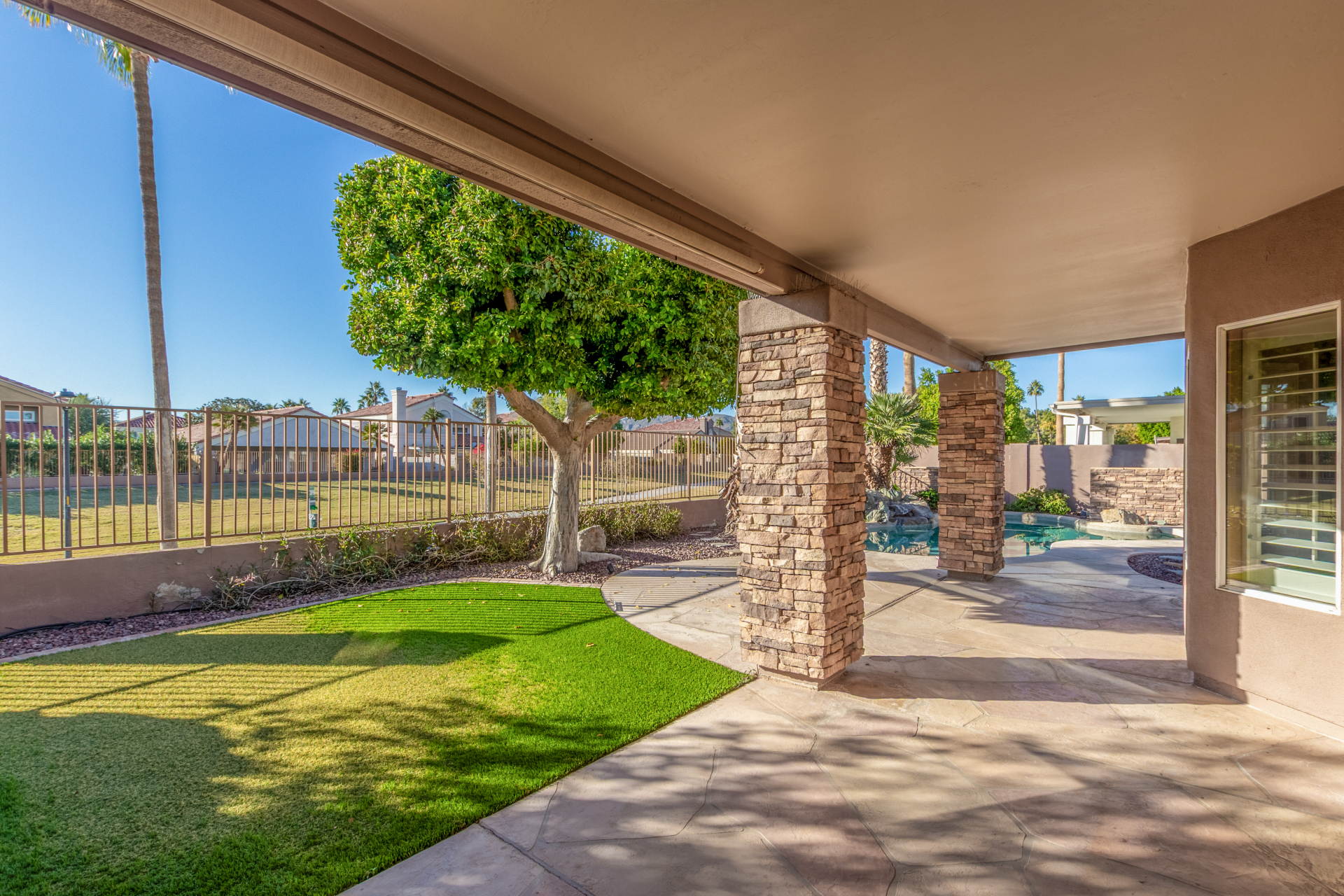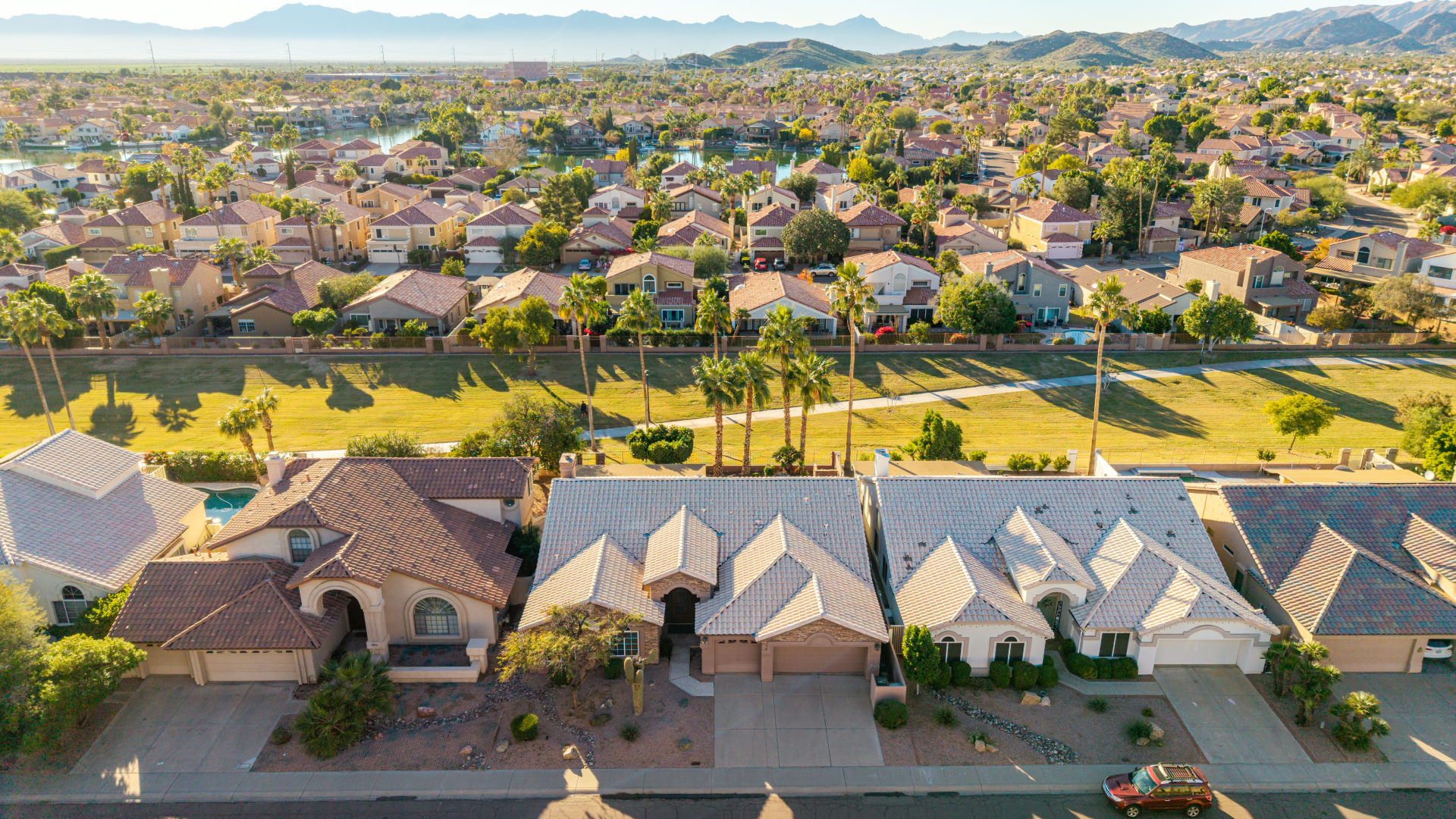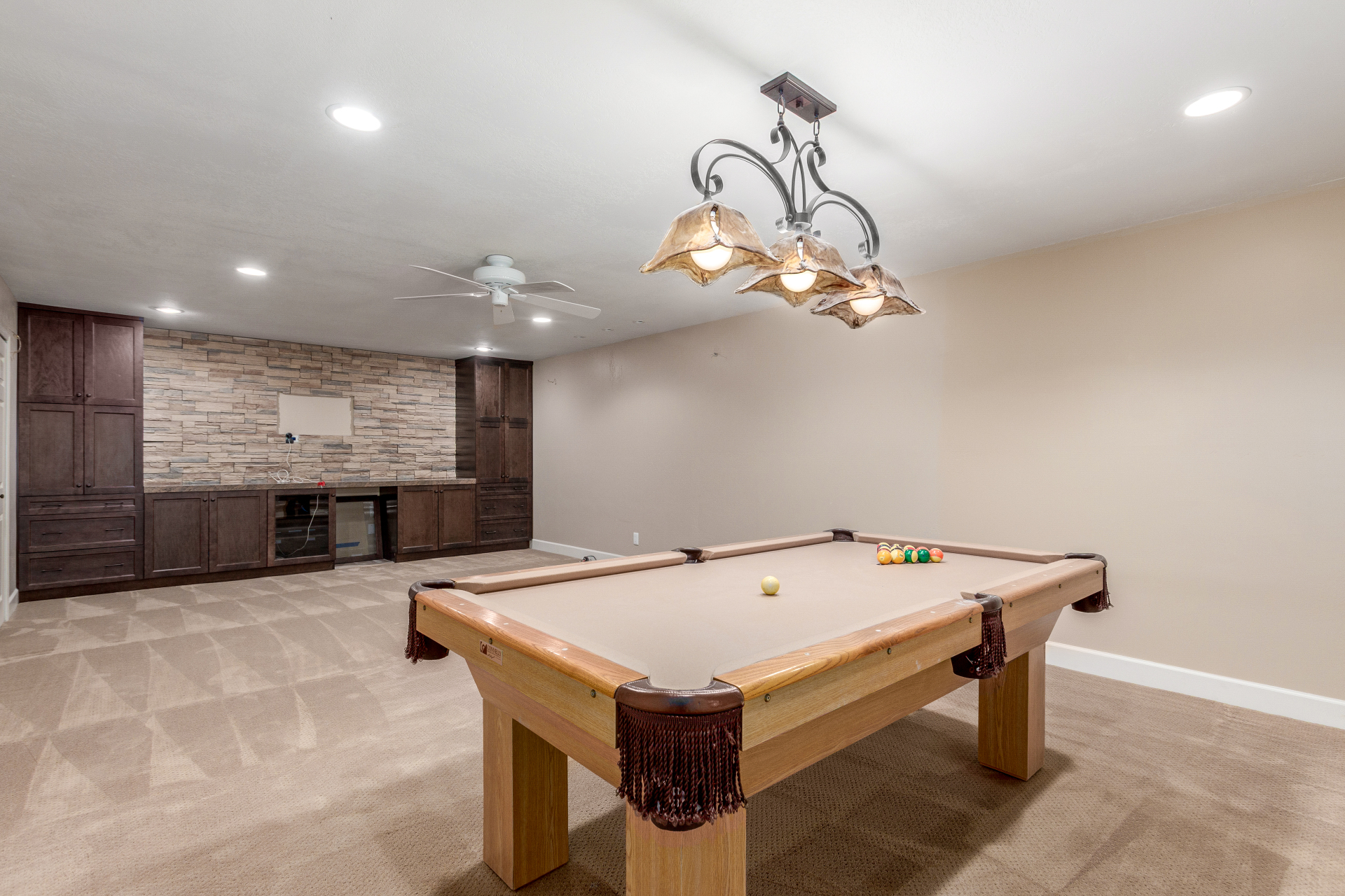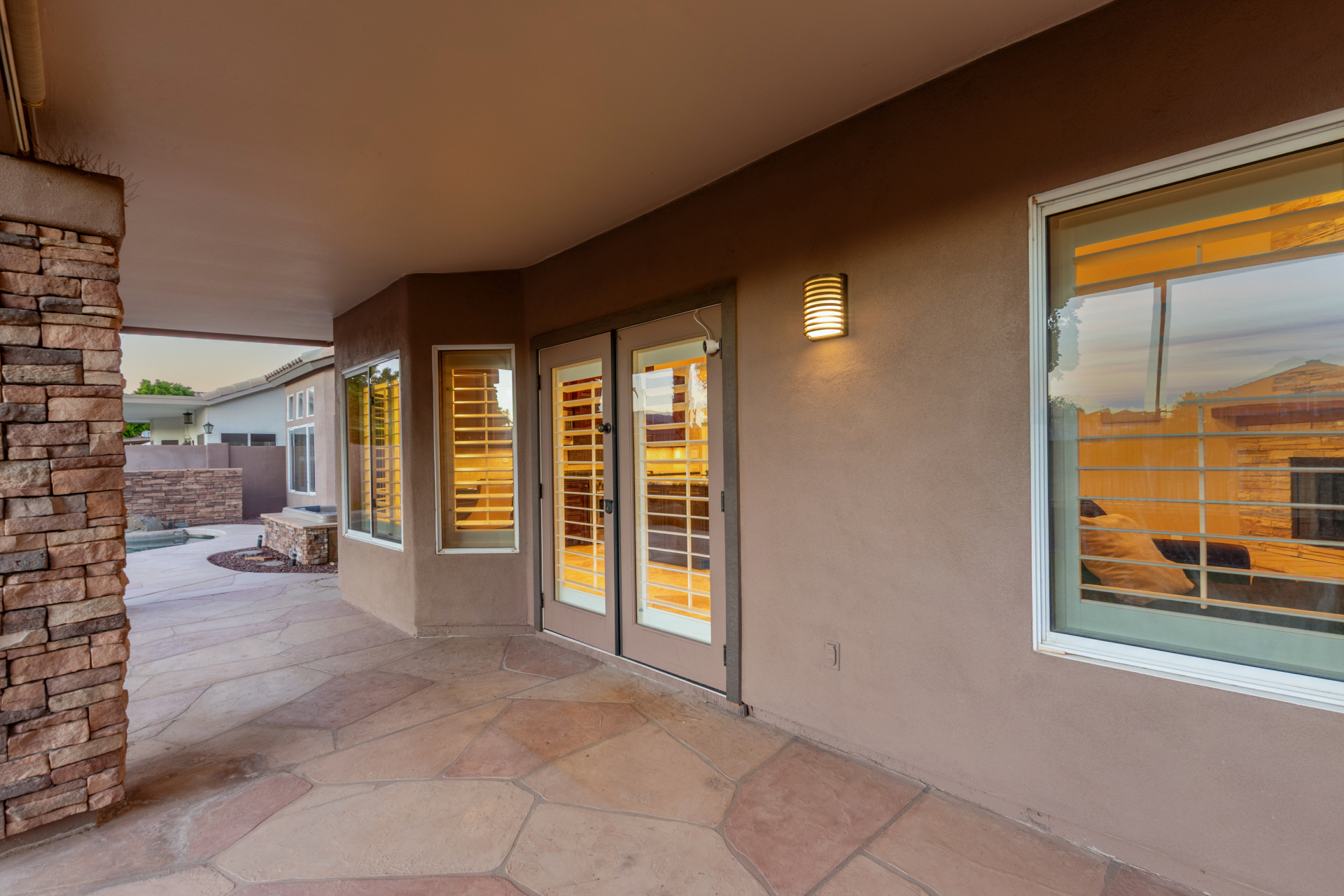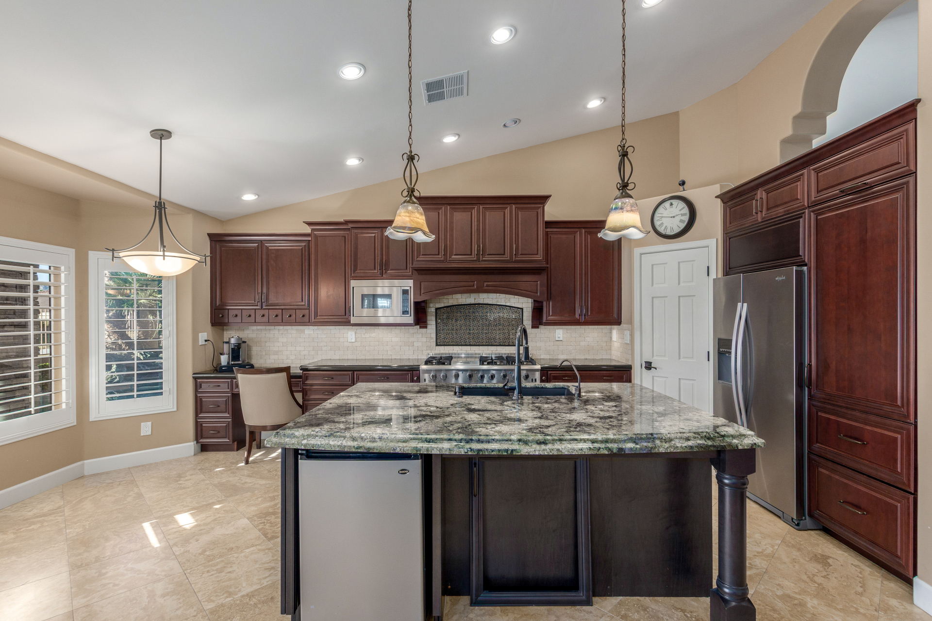 Nestled directly behind the community park set between two serene lakes, this stunning home is ready for you! A stone-accented façade, desert landscaping, & a 3-car garage w/built-in cabinets create impressive curb appeal enhanced by a custom ironwork front door. Discover a welcoming living room, formal dining, & cozy family room. Plantation shutters, recessed lighting, vaulted ceilings, & striking stone-accented gas fireplace can’t be left unsaid. A convenient powder room enhances functionality! The eat-in kitchen showcases staggered cabinets, a walk-in pantry, granite counters, a stone backsplash, SS appliances, & a large island w/breakfast bar. Spacious main bedroom offers French door access to the outdoors & a spa-like ensuite w/dual sinks, jetted tub, glass-enclosed rain shower, & generous walk-in closet. Downstairs, the finished basement provides even more living space with soft carpet and a media niche! The backyard is an entertainer’s paradise with a view fence, full-length covered patio, hot tub.