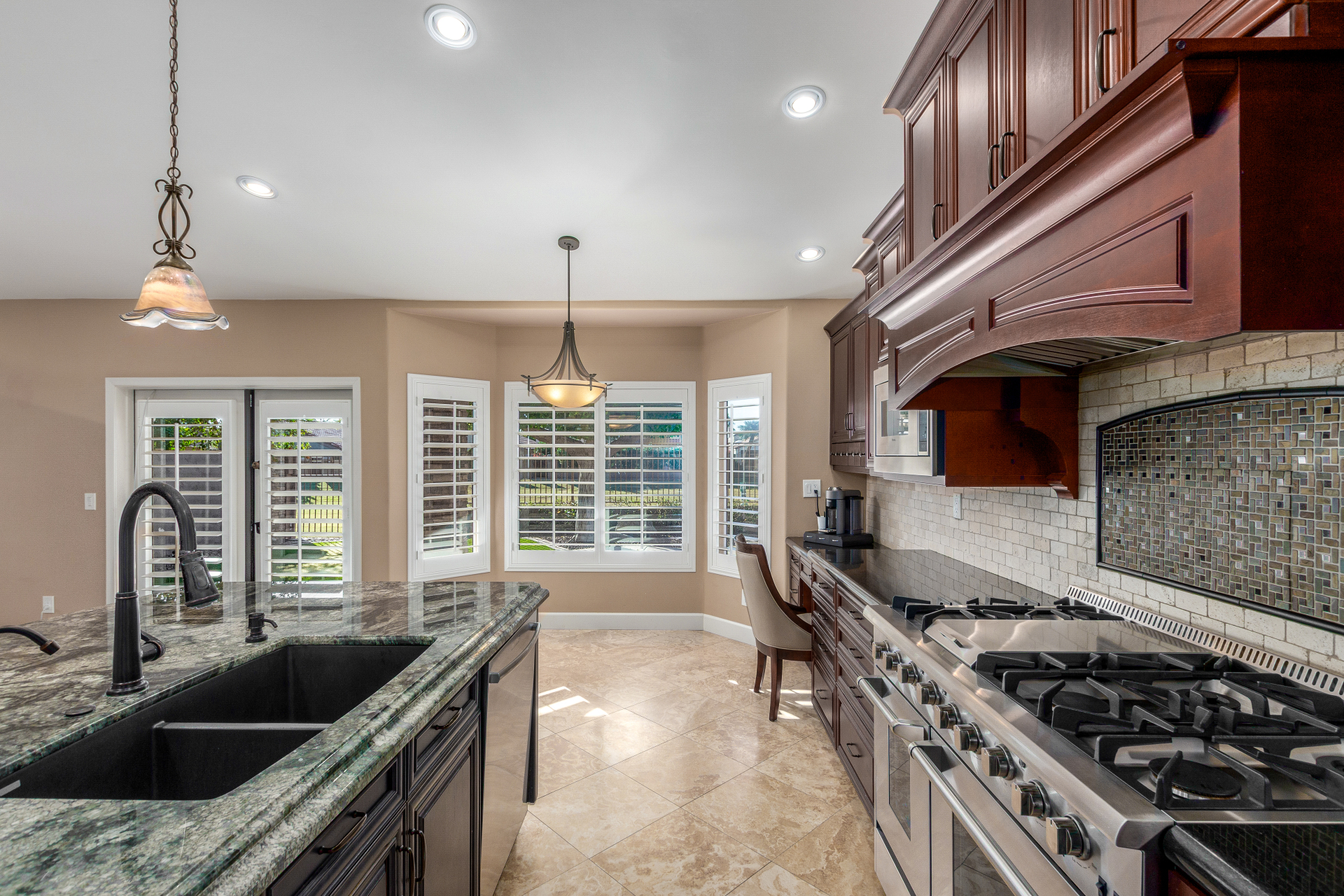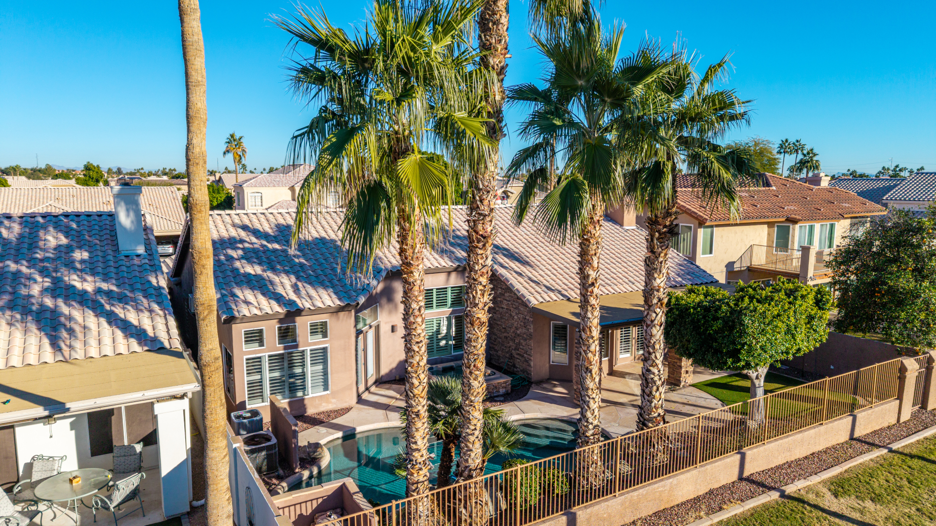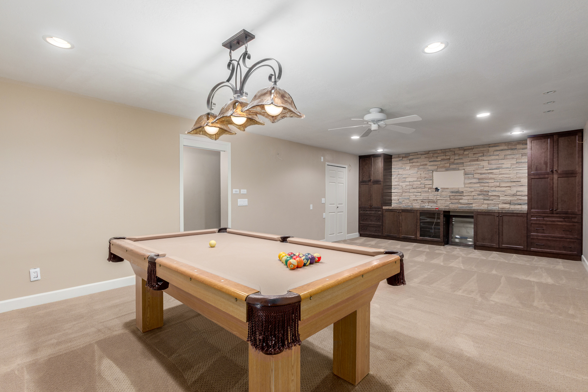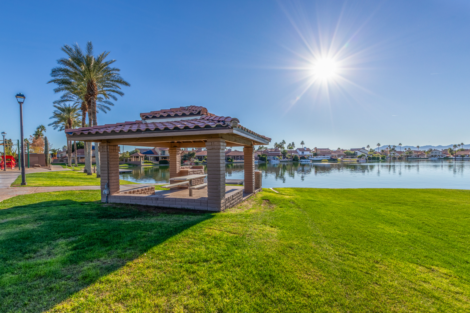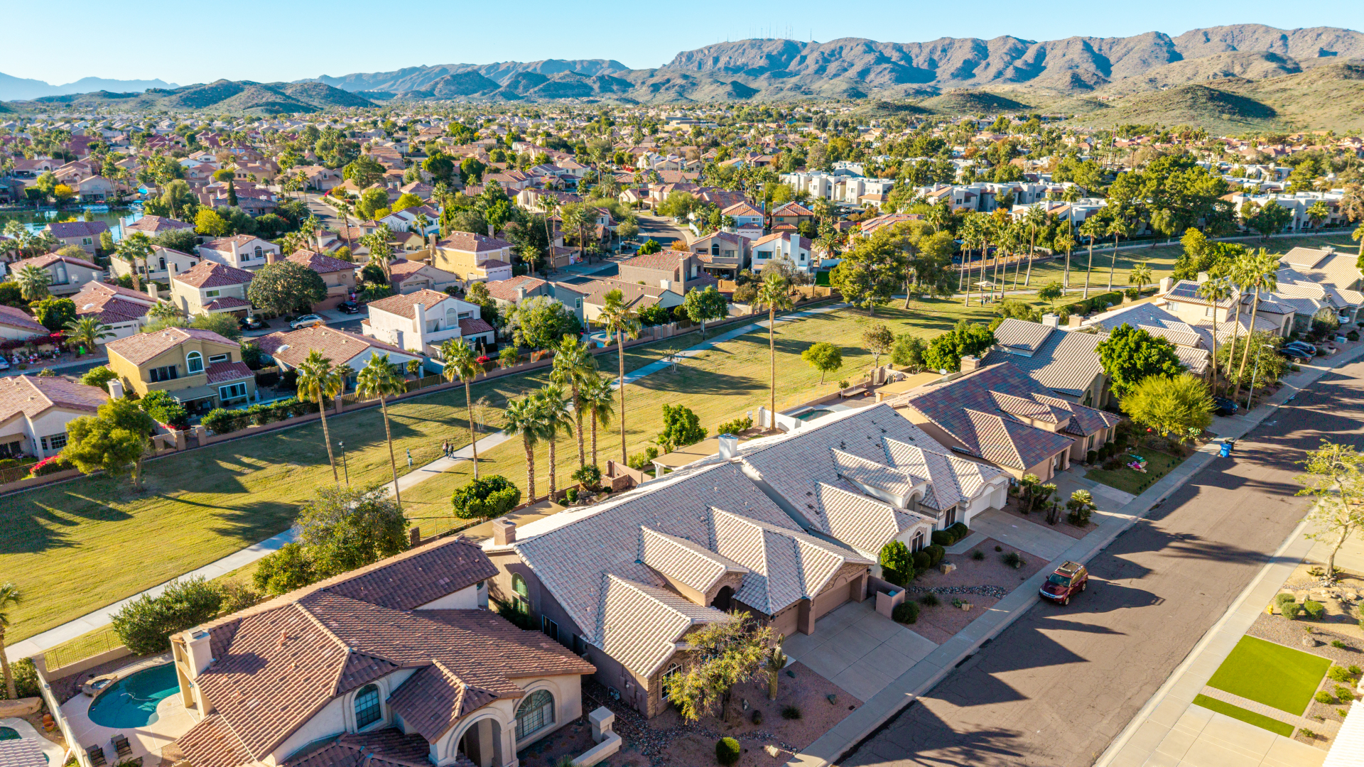 Nestled directly behind the community park set between two serene lakes, this stunning home is ready for you! A stone-accented façade, desert landscaping, & a 3-car garage w/built-in cabinets create impressive curb appeal enhanced by a custom ironwork front door. Discover a welcoming living room, formal dining, & cozy family room. Plantation shutters, recessed lighting, vaulted ceilings, & striking stone-accented gas fireplace can’t be left unsaid. A convenient powder room enhances functionality! The eat-in kitchen showcases staggered cabinets, a walk-in pantry, granite counters, a stone backsplash, SS appliances, & a large island w/breakfast bar. Spacious main bedroom offers French door access to the outdoors & a spa-like ensuite w/dual sinks, jetted tub, glass-enclosed rain shower, & generous walk-in closet. Downstairs, the finished basement provides even more living space with soft carpet and a media niche! The backyard is an entertainer’s paradise with a view fence, full-length covered patio, hot tub.