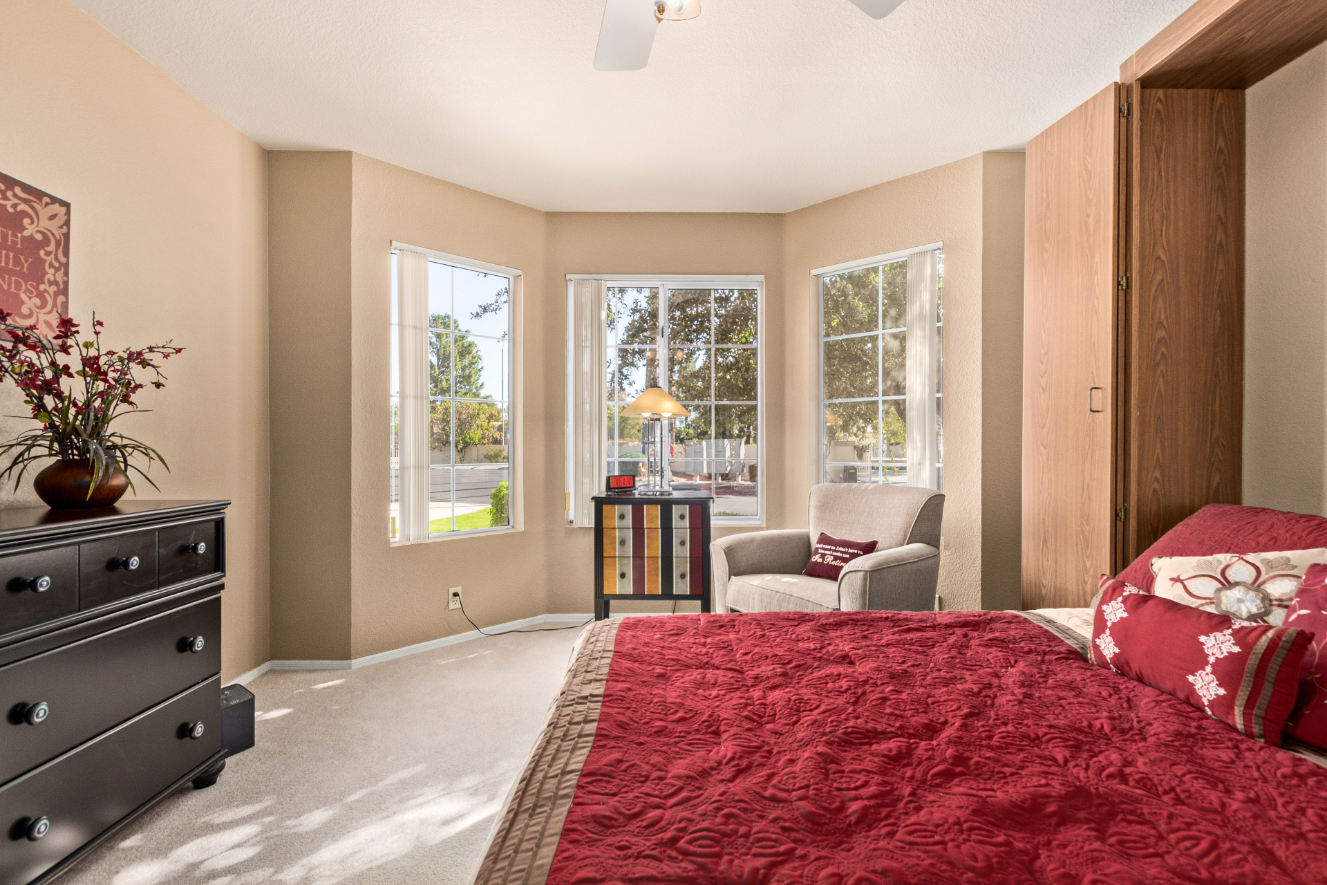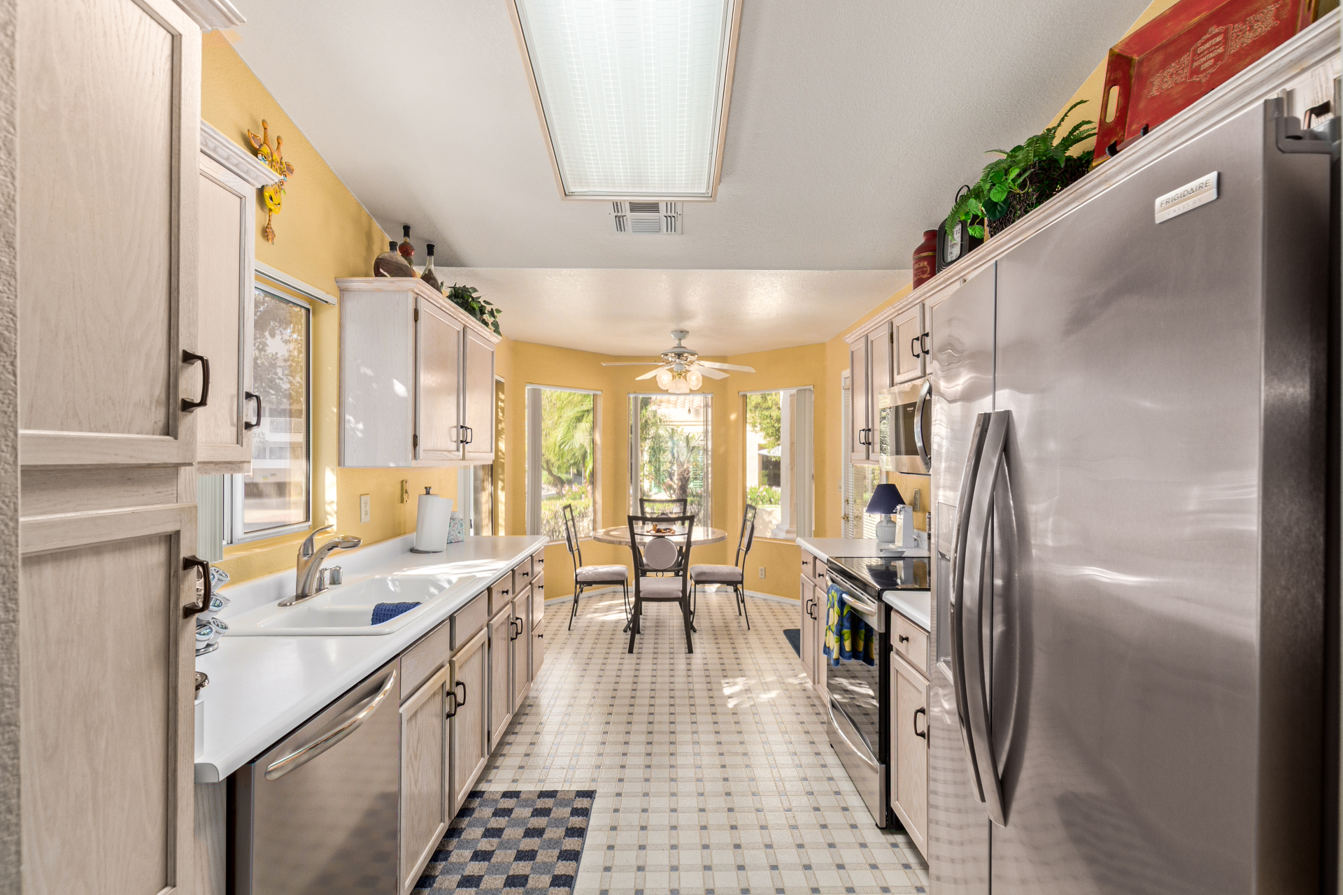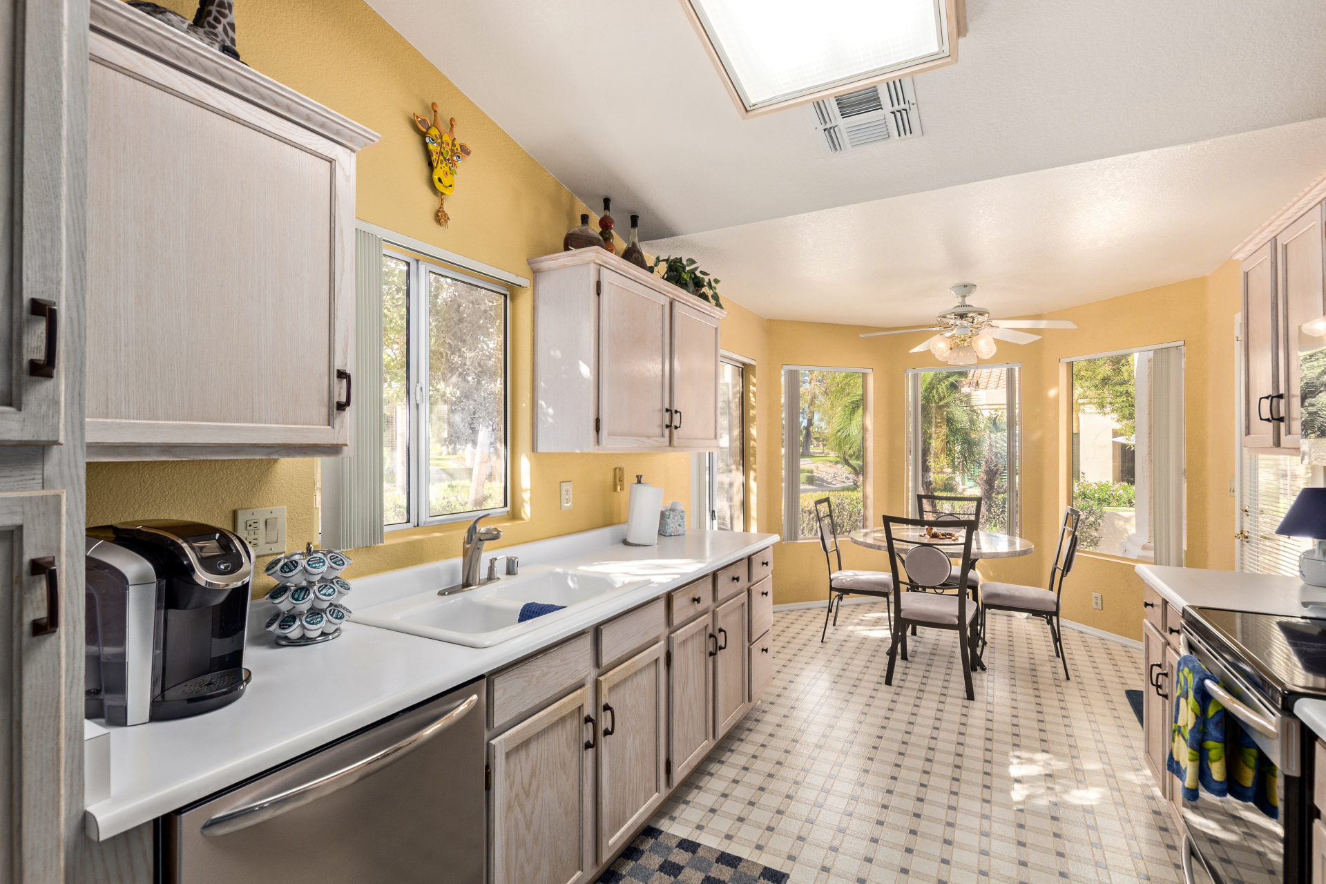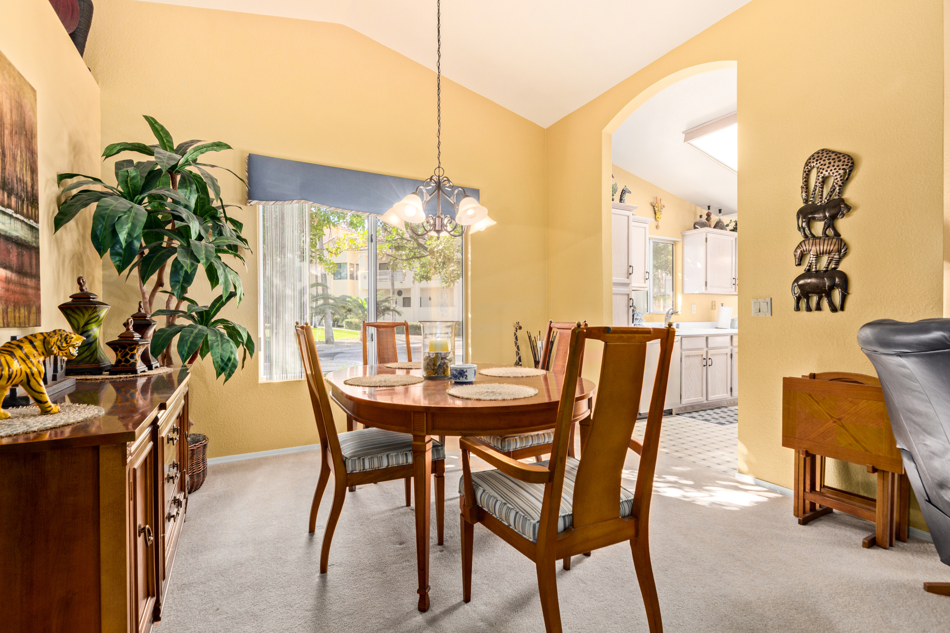 JUST BRING YOUR TOOTHBRUSH! This popular end-unit, St. Thomas model, located in a gated community, can be a turn-key home. Pride of ownership shows in this gently lived-in, immaculate home. The natural light floods into the cozy breakfast room from the bay windows and has patio access. The formal dining area flows into the great room for convenience and entertaining. The bedrooms are split for added privacy. You will find extra storage in the garage. Household furniture and other items are available for purchase outside of escrow. Newer HVAC, roof, sprinkler system. MOVE IN READY.