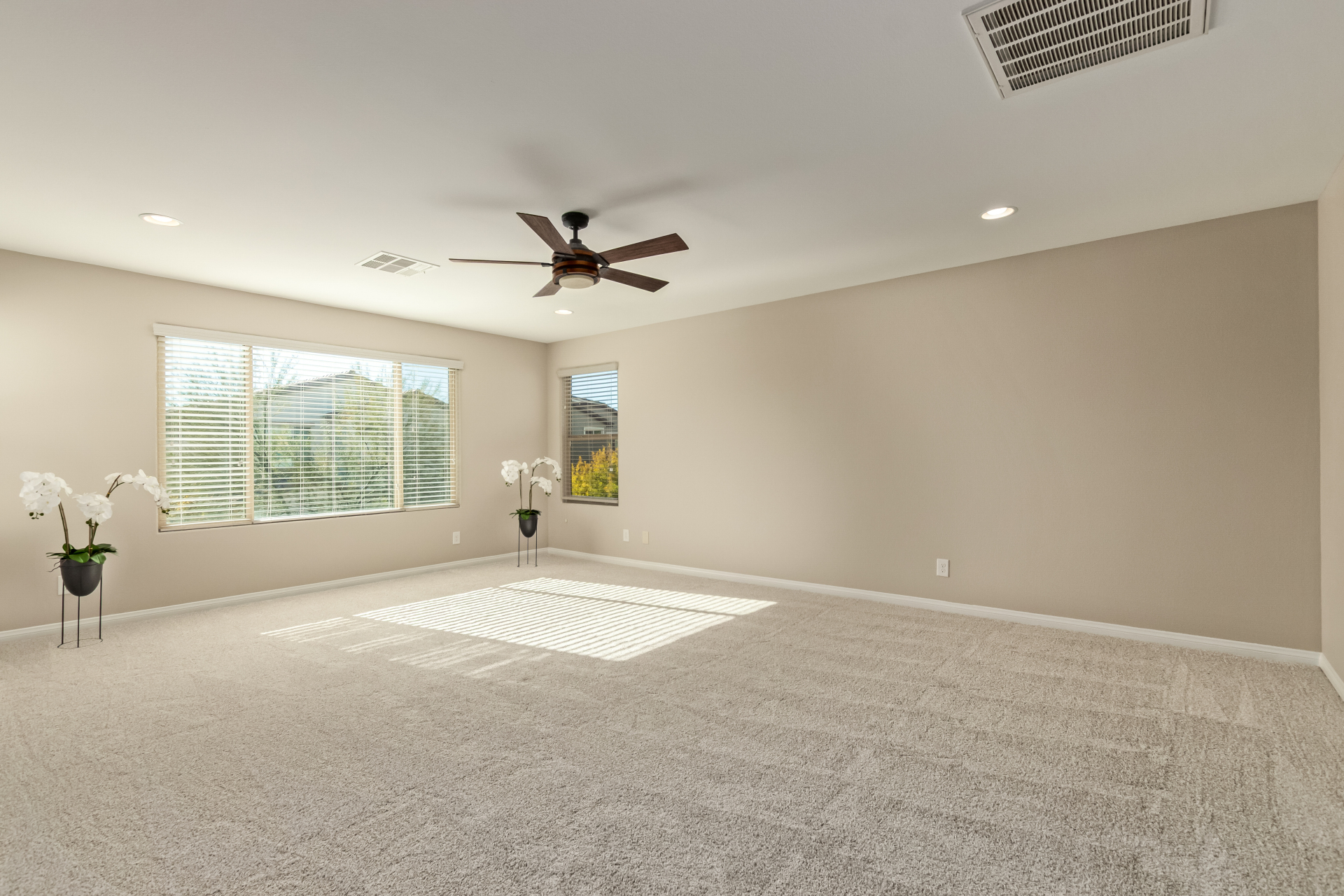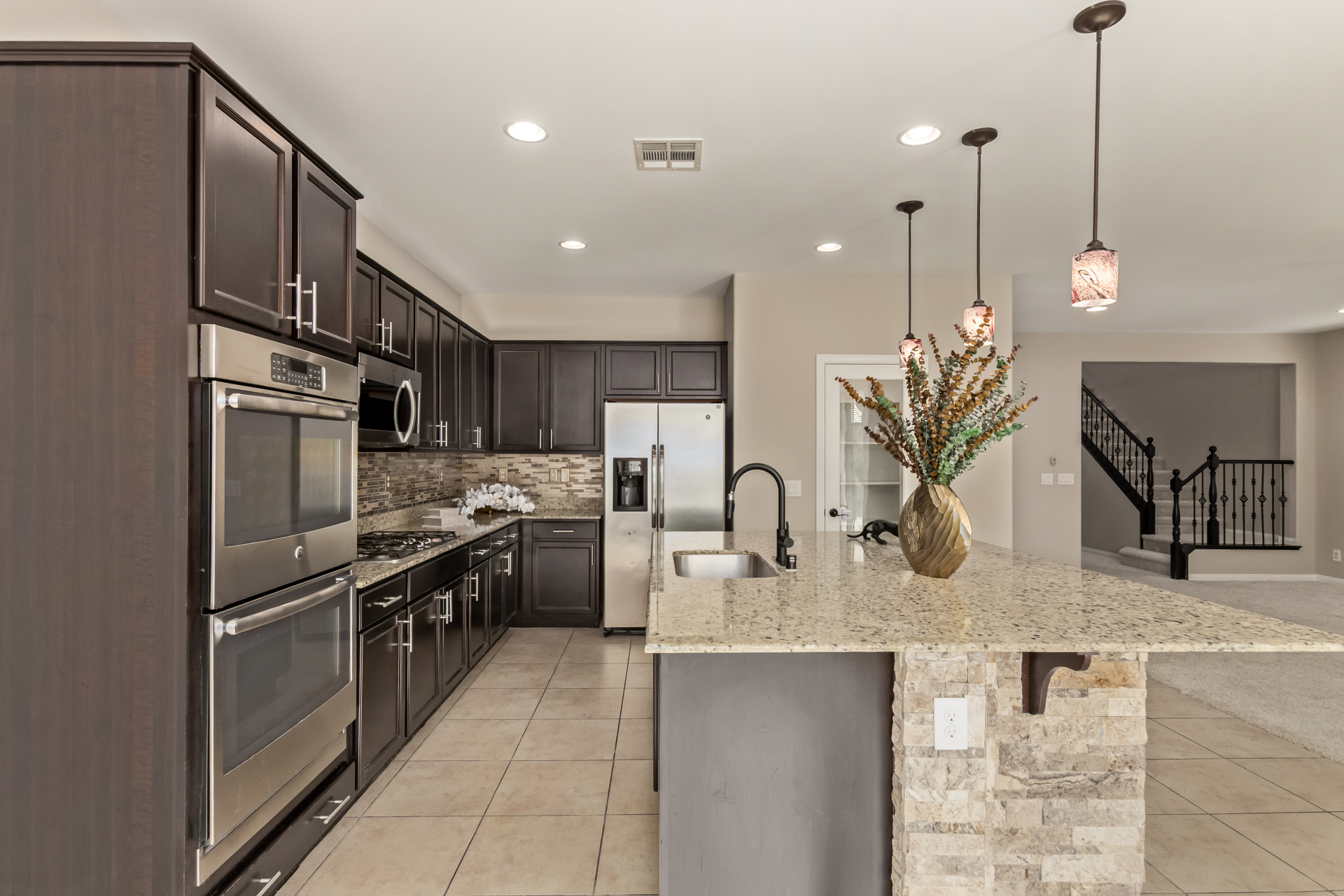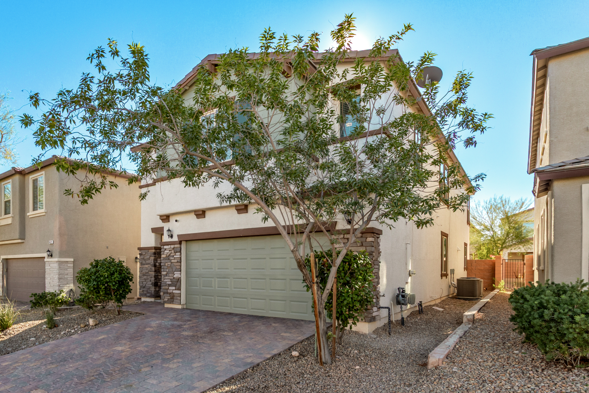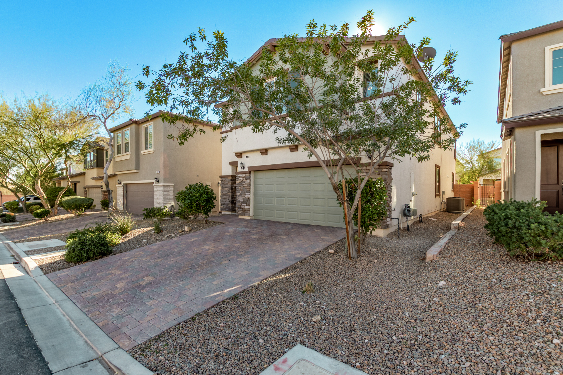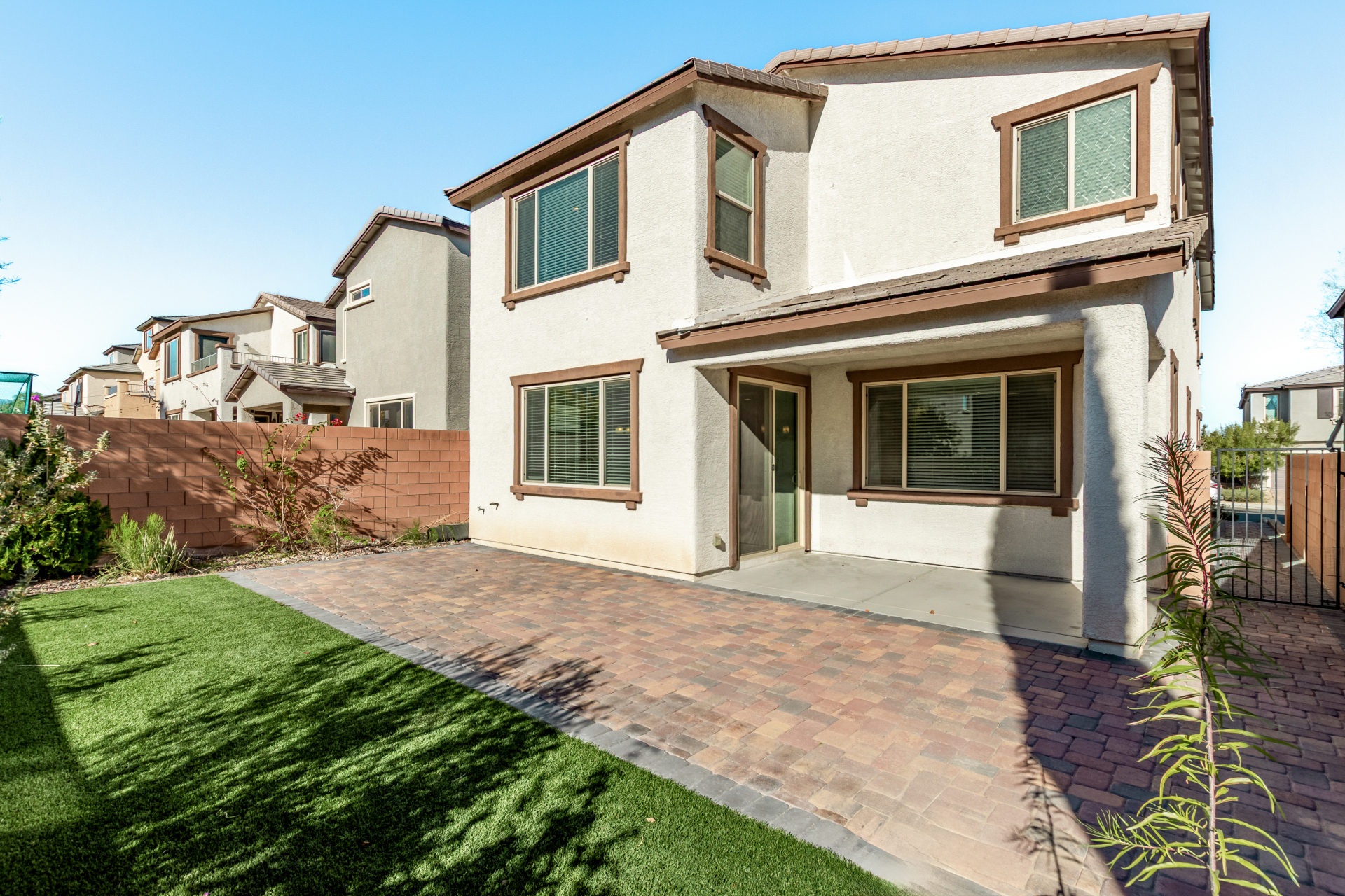 The search is finally over! This stunning 4-bedroom home welcomes you with a 2-car garage, a tasteful paver driveway, and eye-catching stone accents. Discover a captivating great room with high ceilings, recessed lighting, blinds, and a harmonious blend of soft carpeting and tile flooring. The gorgeous chef's kitchen boasts granite counters, abundant wood cabinetry with crown moulding, chic pendant lighting, a mosaic tile backsplash, stainless steel appliances, a walk-in pantry, and a stone-clad center island with a breakfast bar. Upstairs, you'll find a cozy loft that provides a versatile living space. The luxurious primary suite features a private bathroom with double vanities and a spacious walk-in closet. Spend enchanting evenings in the lovely backyard, which offers a covered patio and pristine artificial turf for outdoor activities. Don't miss out on this fantastic opportunity!