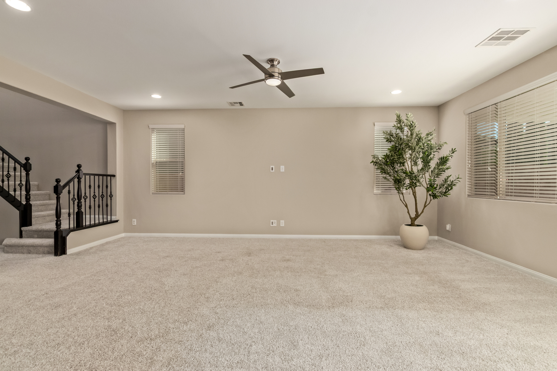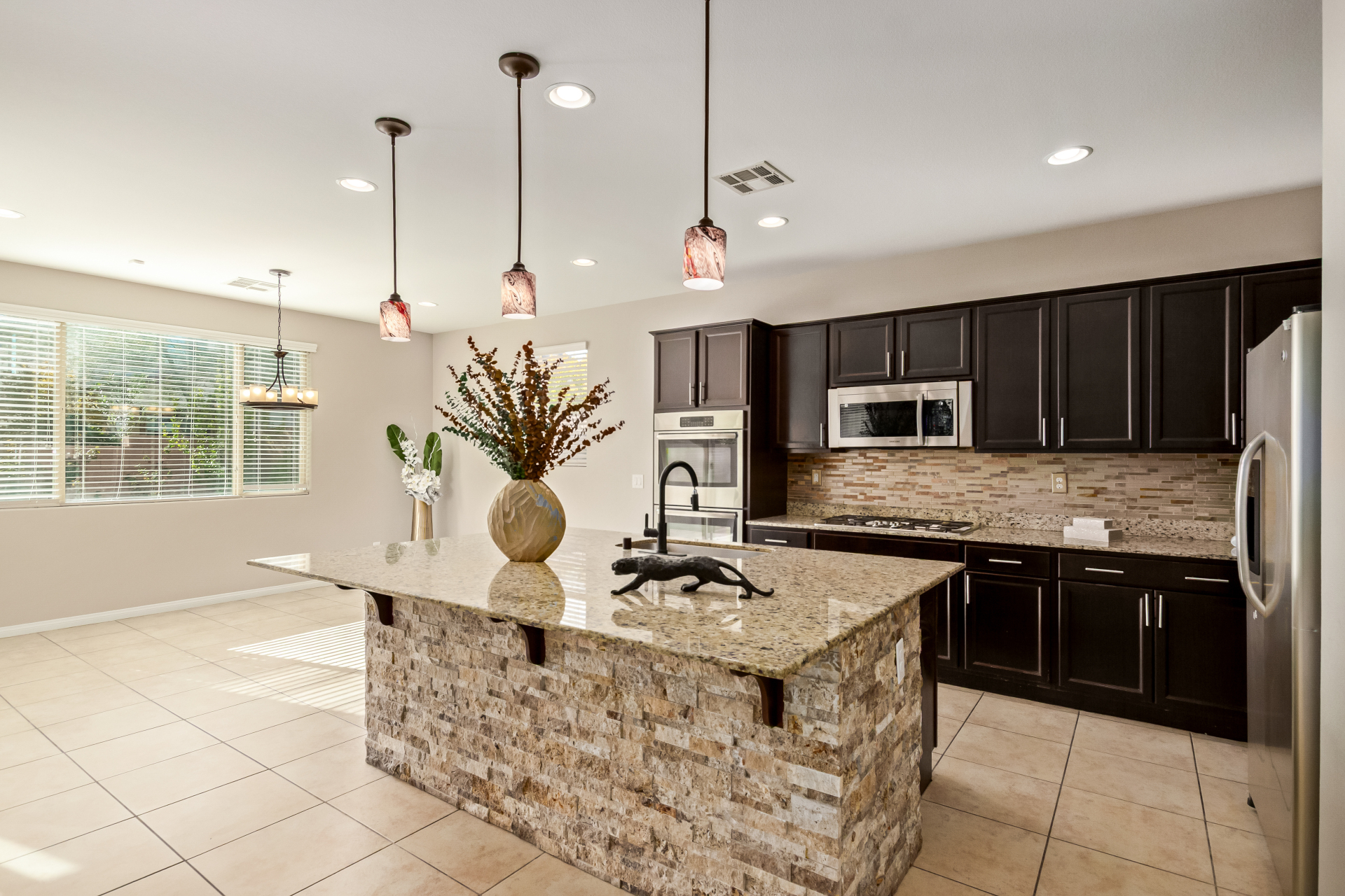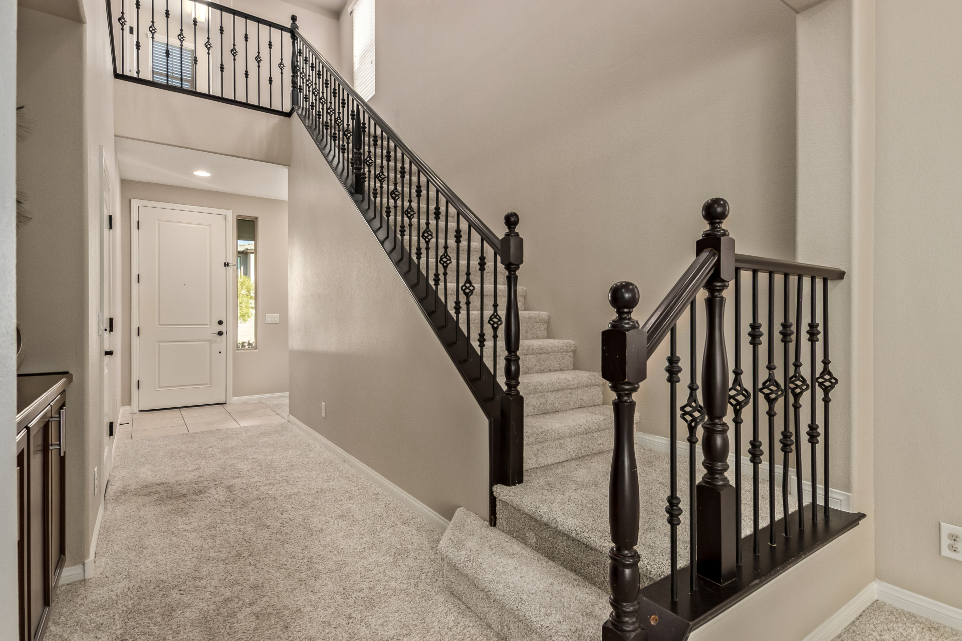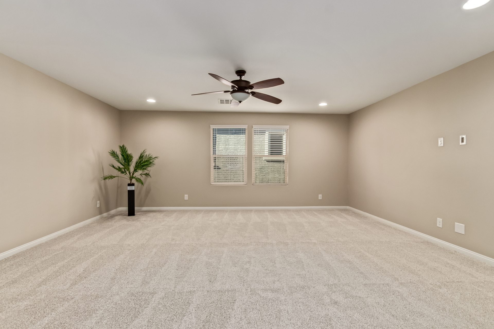The search is finally over! This stunning 4-bedroom home welcomes you with a 2-car garage, a tasteful paver driveway, and eye-catching stone accents. Discover a captivating great room with high ceilings, recessed lighting, blinds, and a harmonious blend of soft carpeting and tile flooring. The gorgeous chef's kitchen boasts granite counters, abundant wood cabinetry with crown moulding, chic pendant lighting, a mosaic tile backsplash, stainless steel appliances, a walk-in pantry, and a stone-clad center island with a breakfast bar. Upstairs, you'll find a cozy loft that provides a versatile living space. The luxurious primary suite features a private bathroom with double vanities and a spacious walk-in closet. Spend enchanting evenings in the lovely backyard, which offers a covered patio and pristine artificial turf for outdoor activities. Don't miss out on this fantastic opportunity!