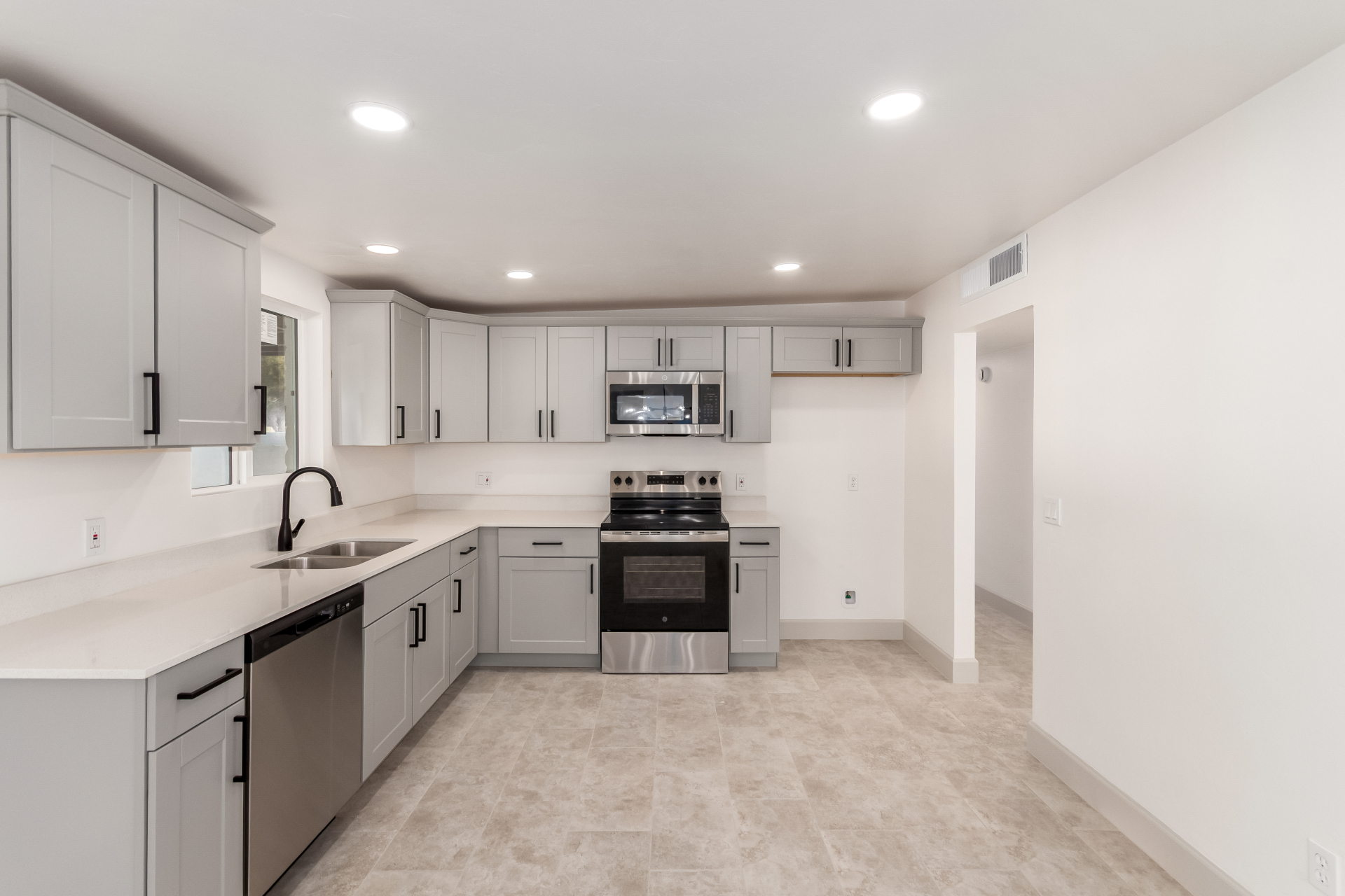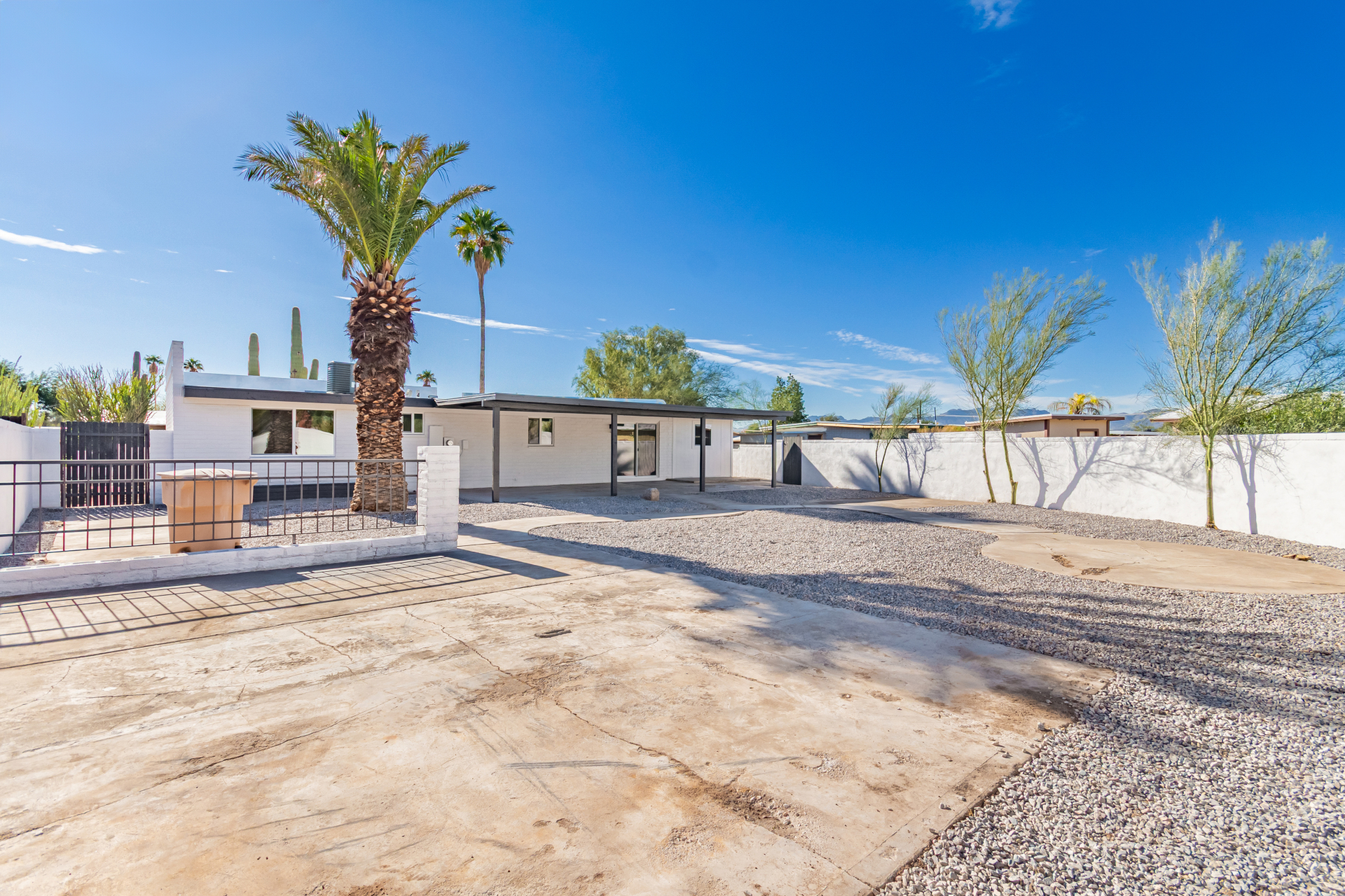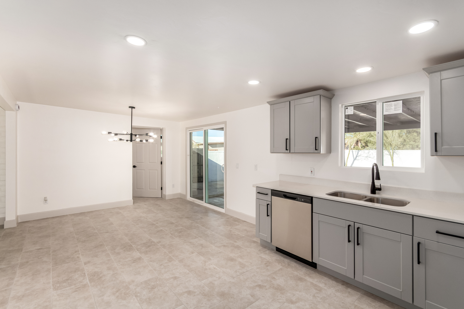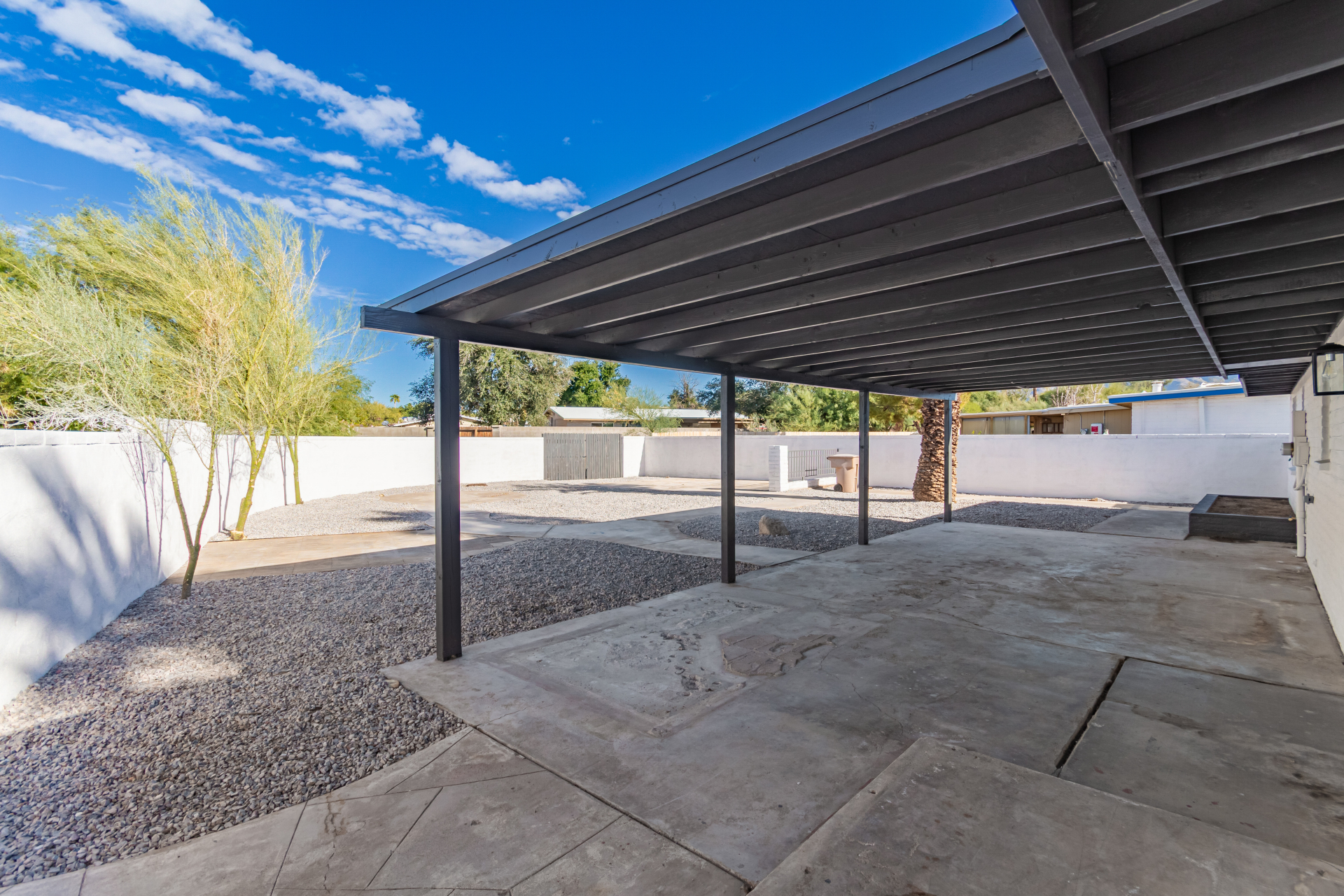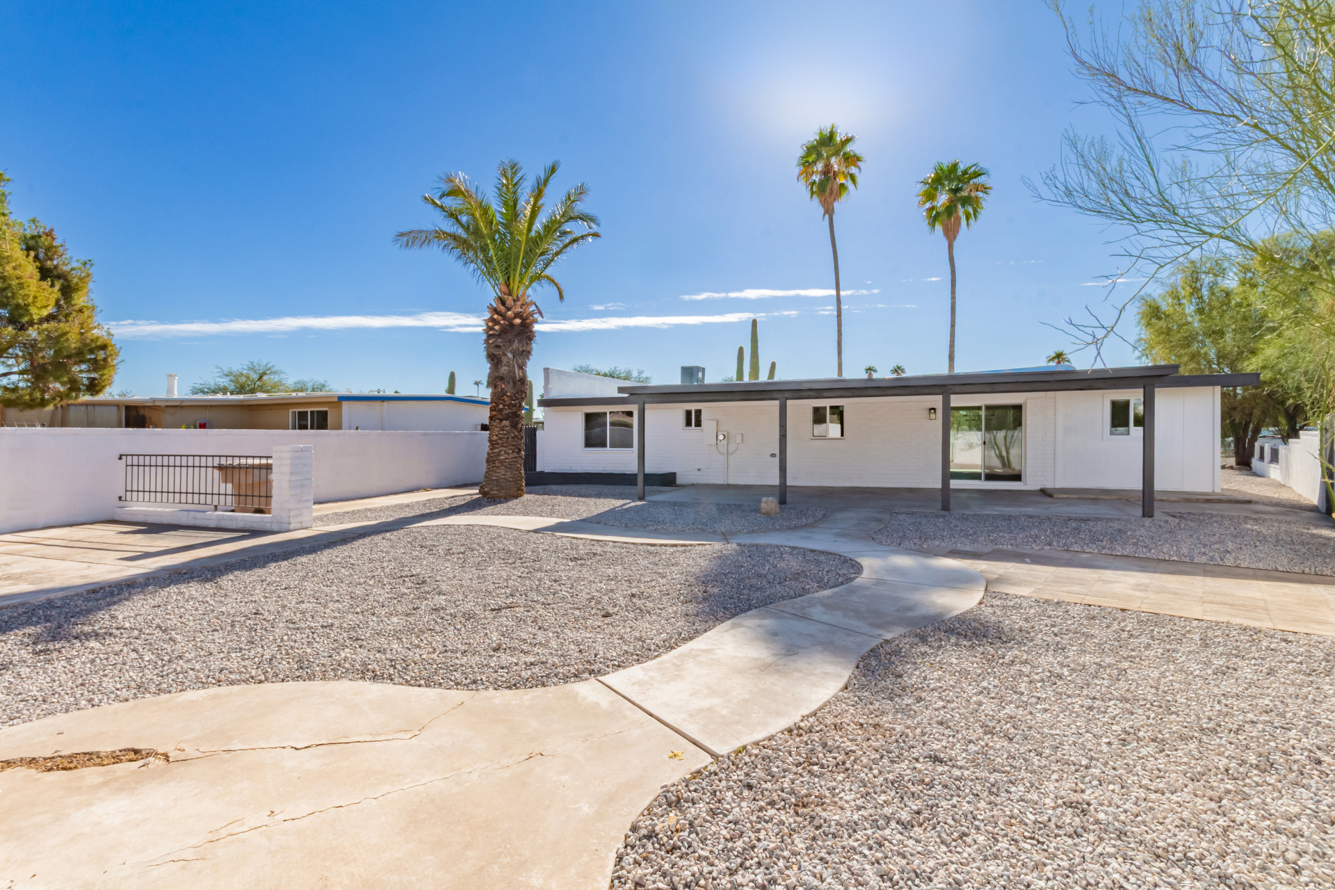 Seize the chance to own this thoughtfully renovated 3-bedroom, 2-bath home! You're welcomed by a fenced front yard with a charming desert landscape. Inside, you'll find an expertly upgraded interior featuring a living room with a soothing palette, ample natural light, and durable tile flooring. The updated eat-in kitchen comes with quartz counters, shaker cabinetry with crown moulding, and sleek stainless steel appliances. The primary bedroom boasts plush carpeting and a private bathroom for added comfort. Imagine enchanting evenings in the sizeable backyard, which offers a spacious covered patio, an RV gate that leads to the alley, and abundant space for outdoor gatherings. Don't miss out on this revitalized gem!