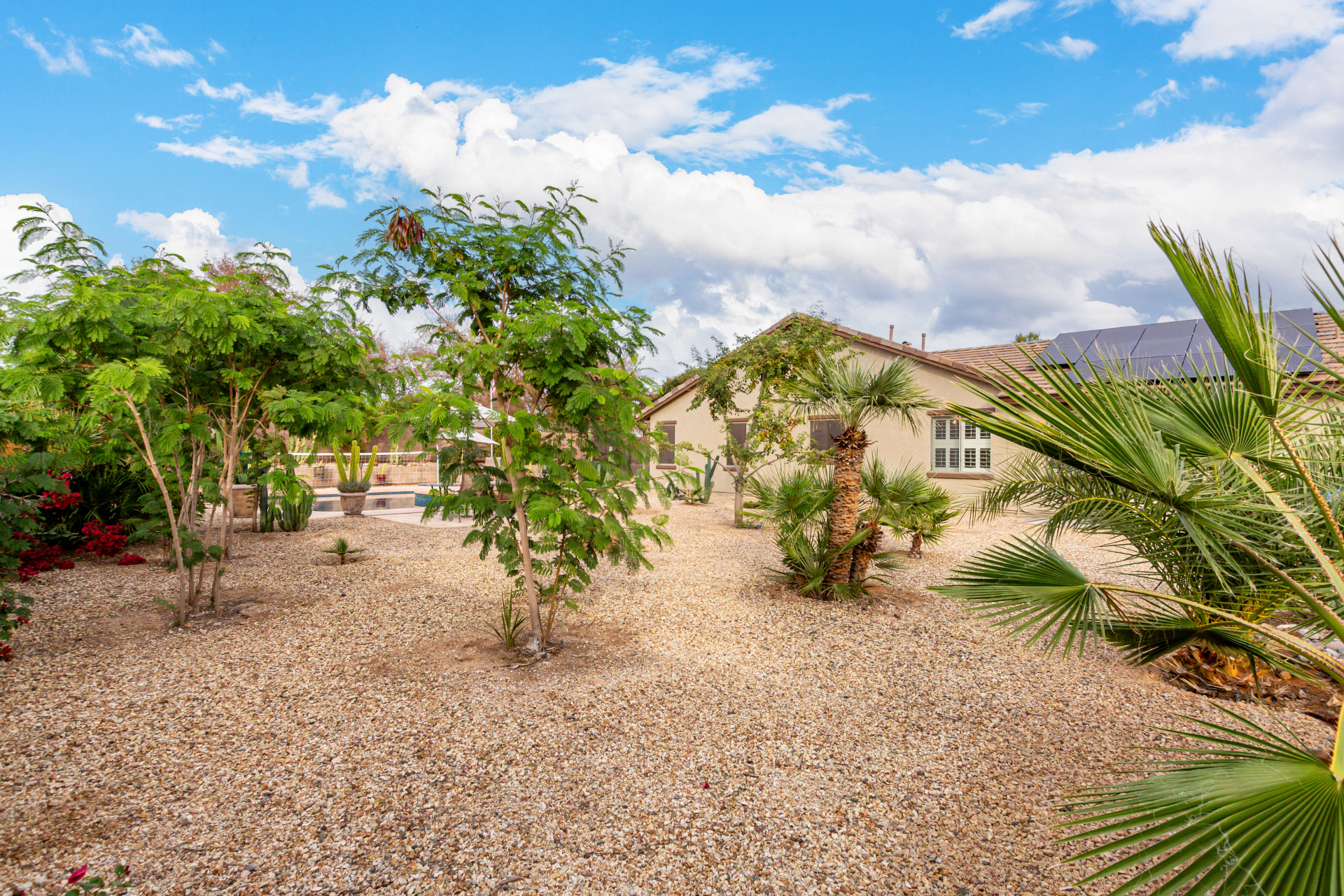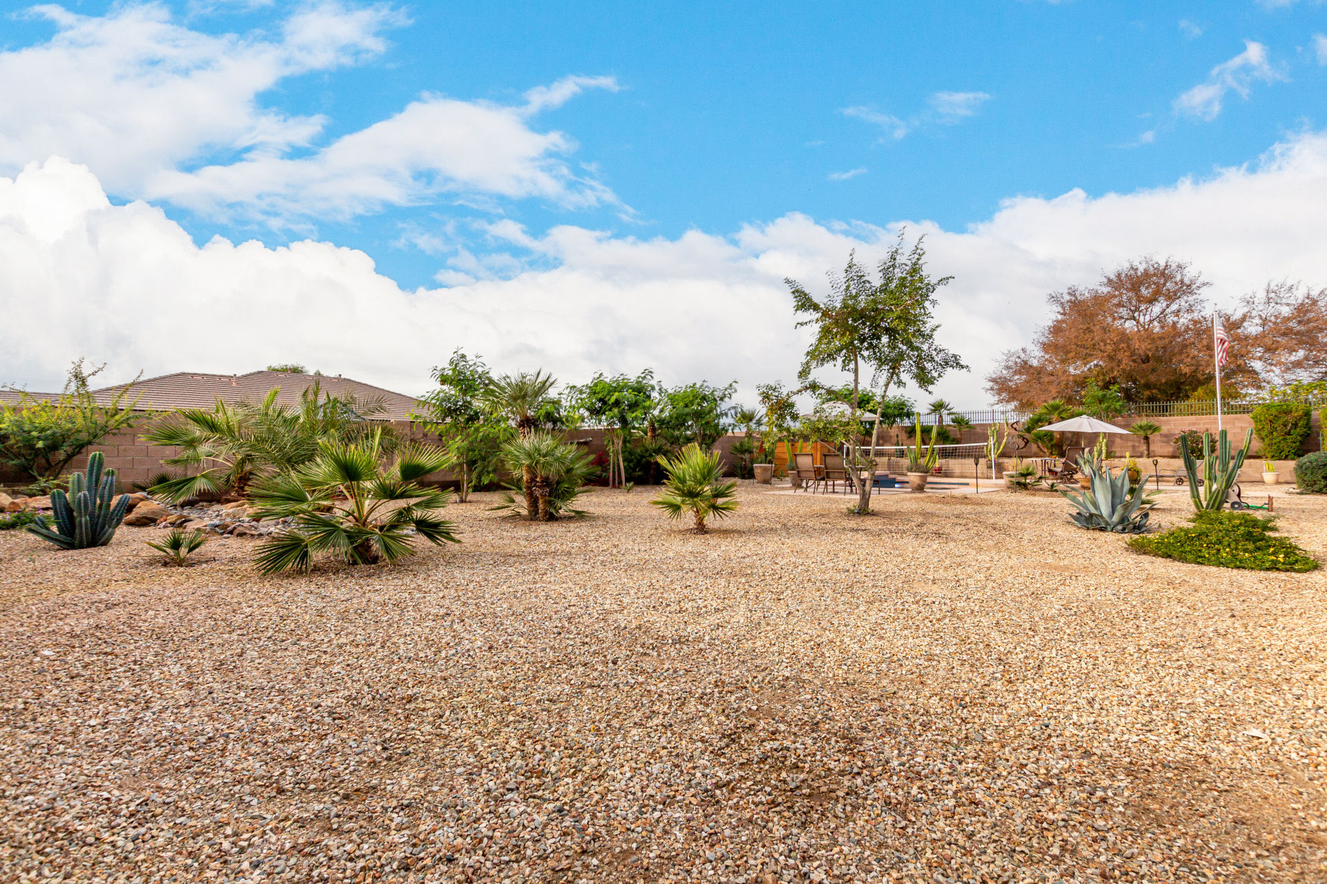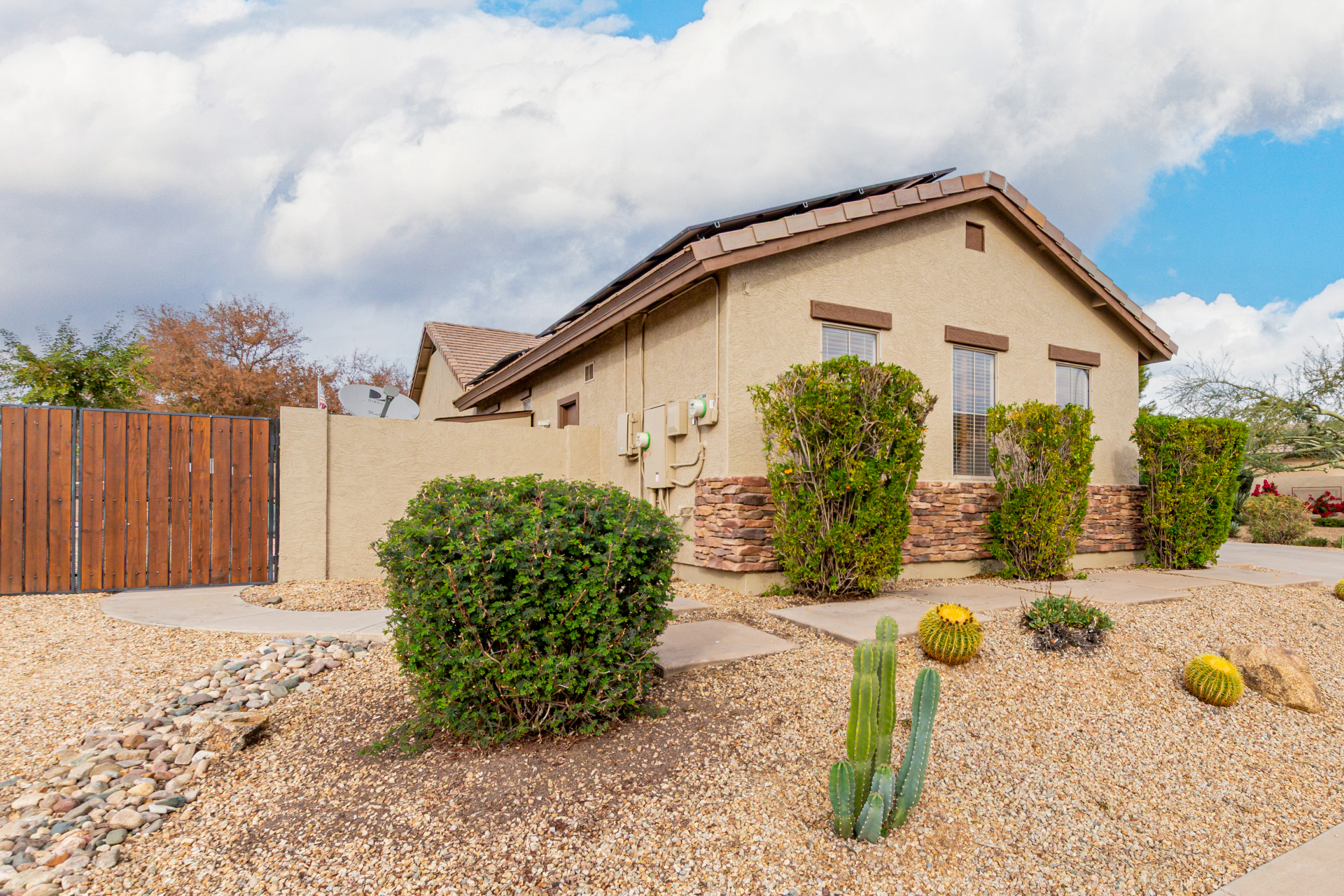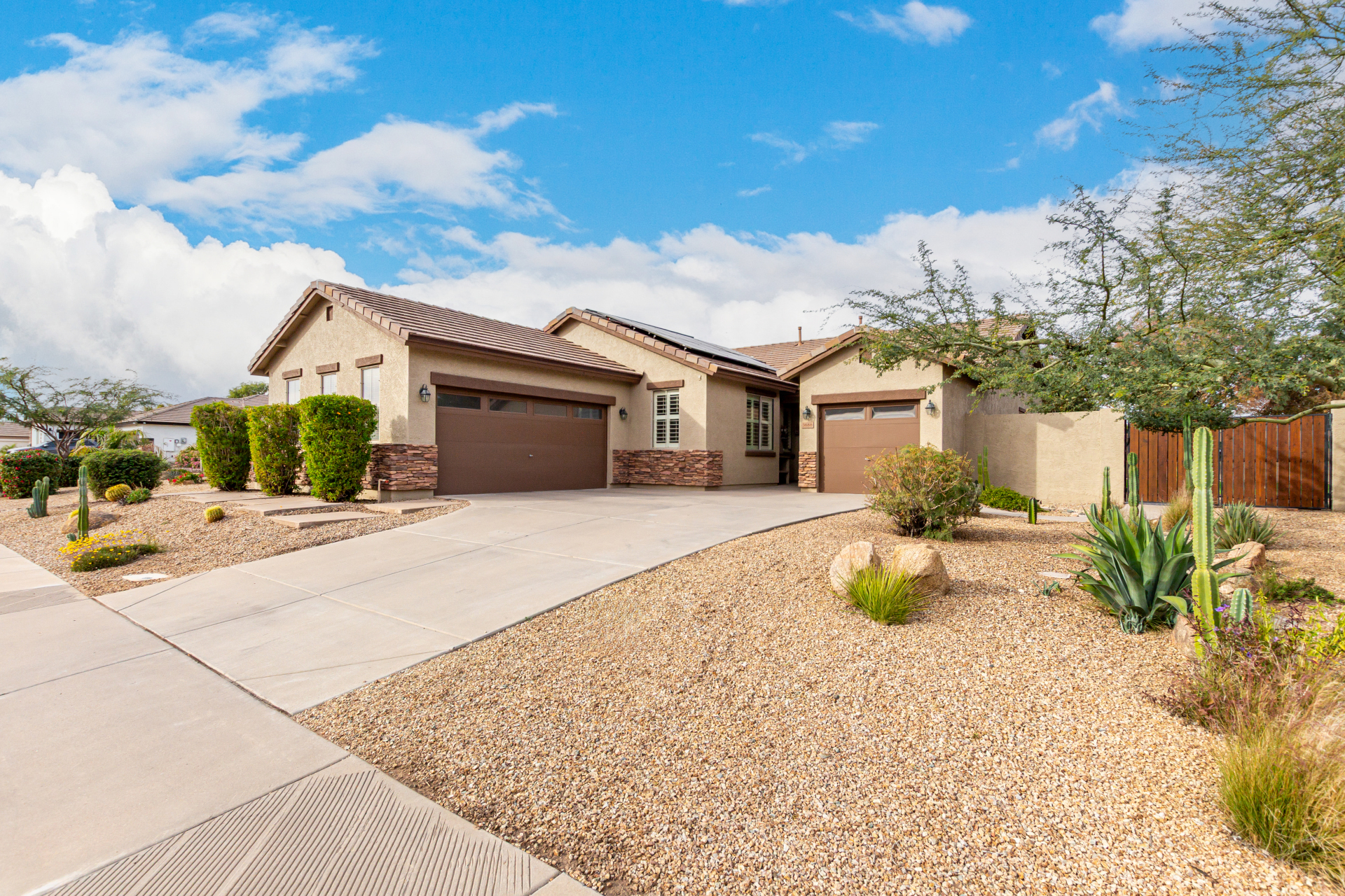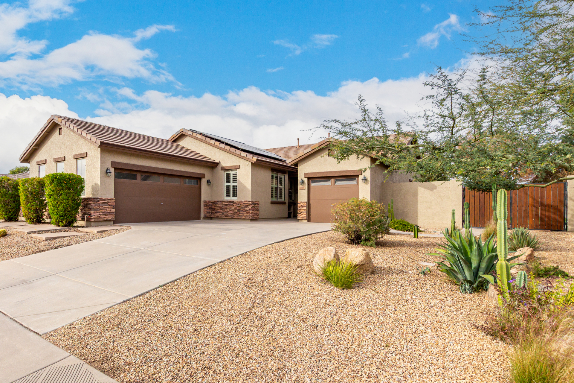 Your dream home is here! This stunning 3-bedroom residence welcomes you with a 3-car garage, RV gates, a lovely desert landscape, and tasteful stone accents. Fall in love with the captivating living room with high ceilings, recessed lighting, classic plantation shutters, and soft carpeting. The great room is perfect for relaxing evenings with loved ones. Culinary adventures await in the kitchen, equipped with granite counters, abundant wood cabinets with crown moulding, contemporary track lighting, essential built-in appliances, a pantry, and an island with a breakfast bar. The luxurious primary bedroom features an ensuite with dual sinks and a convenient walk-in closet. Double French doors lead to a cozy den, ideal for an office or a quiet lounge.