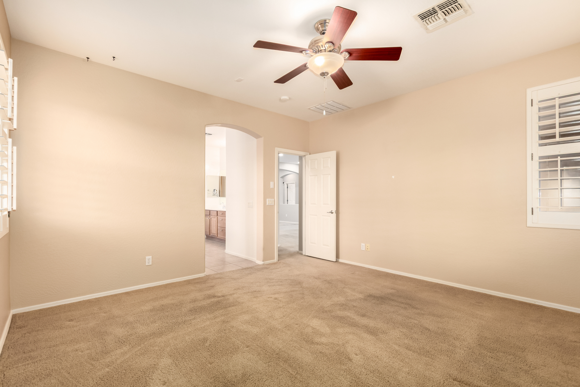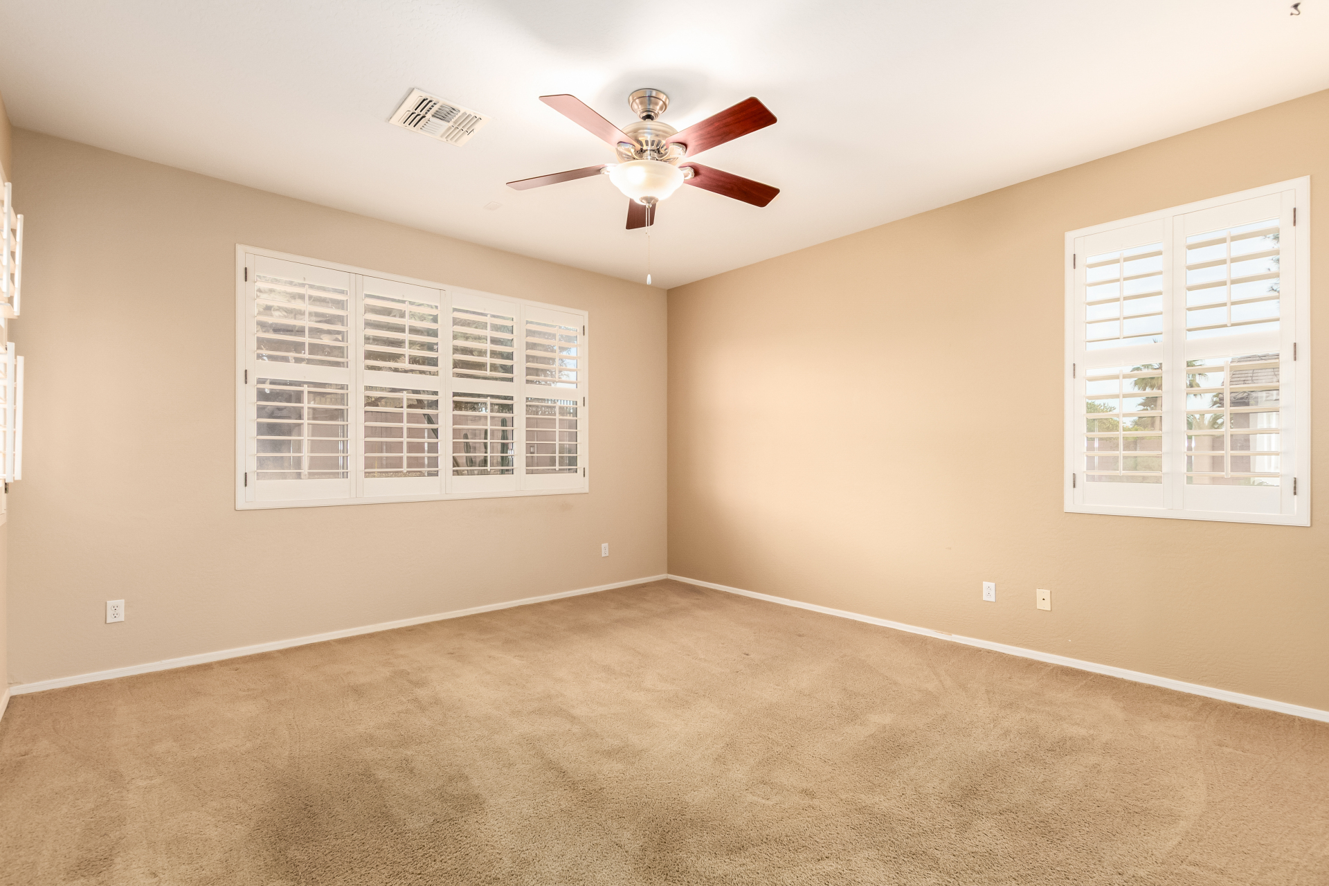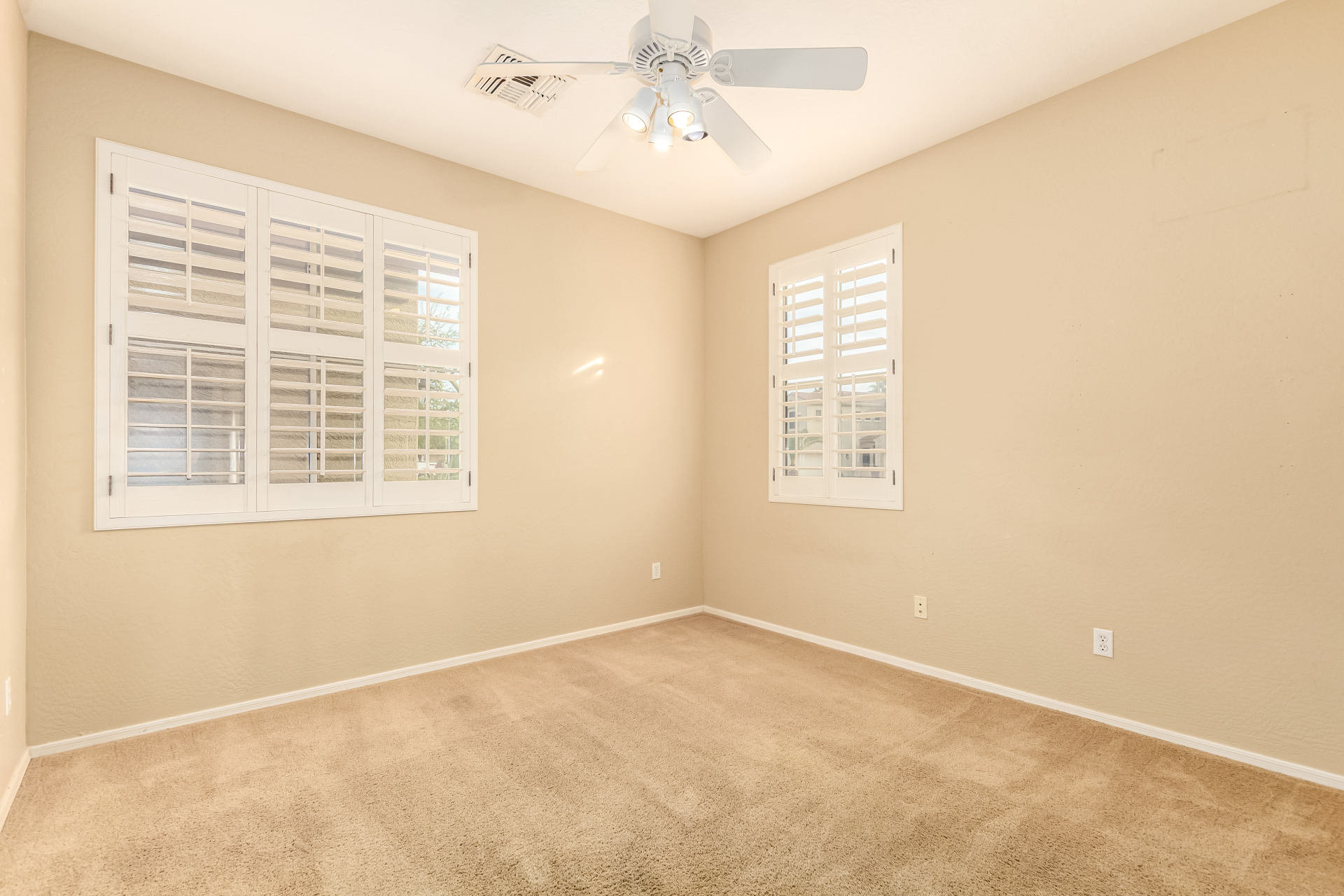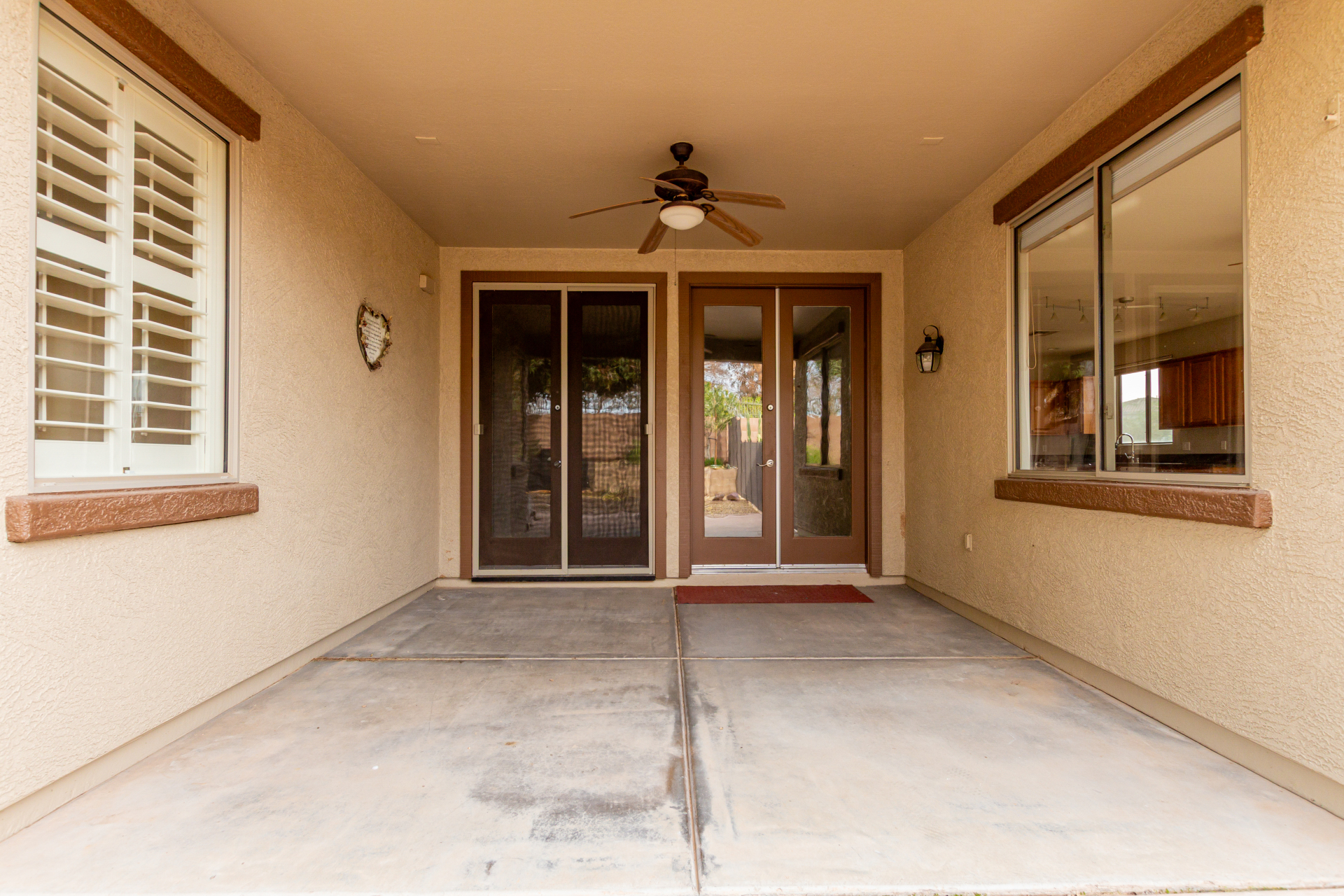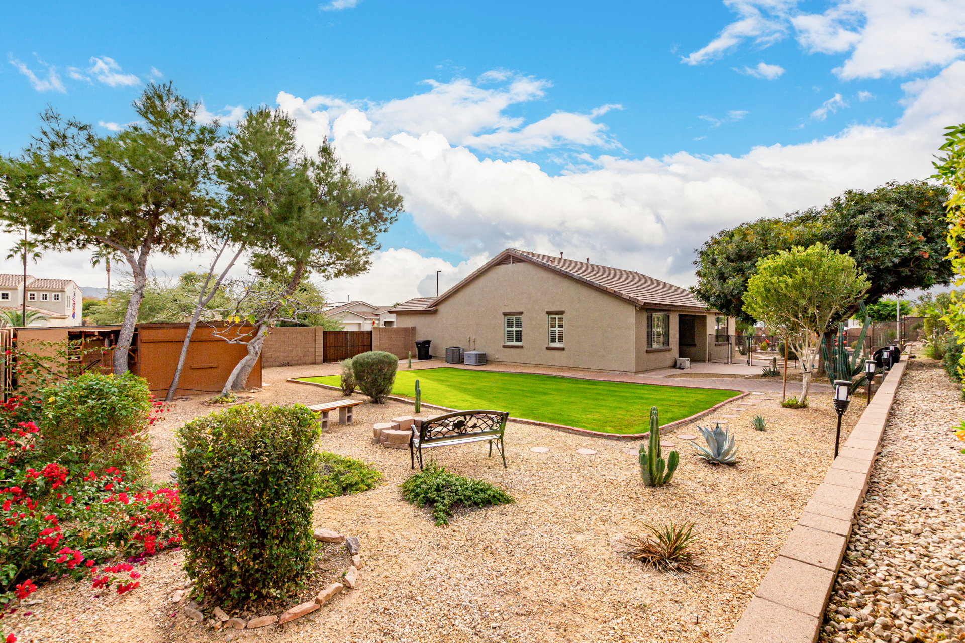 Your dream home is here! This stunning 3-bedroom residence welcomes you with a 3-car garage, RV gates, a lovely desert landscape, and tasteful stone accents. Fall in love with the captivating living room with high ceilings, recessed lighting, classic plantation shutters, and soft carpeting. The great room is perfect for relaxing evenings with loved ones. Culinary adventures await in the kitchen, equipped with granite counters, abundant wood cabinets with crown moulding, contemporary track lighting, essential built-in appliances, a pantry, and an island with a breakfast bar. The luxurious primary bedroom features an ensuite with dual sinks and a convenient walk-in closet. Double French doors lead to a cozy den, ideal for an office or a quiet lounge.