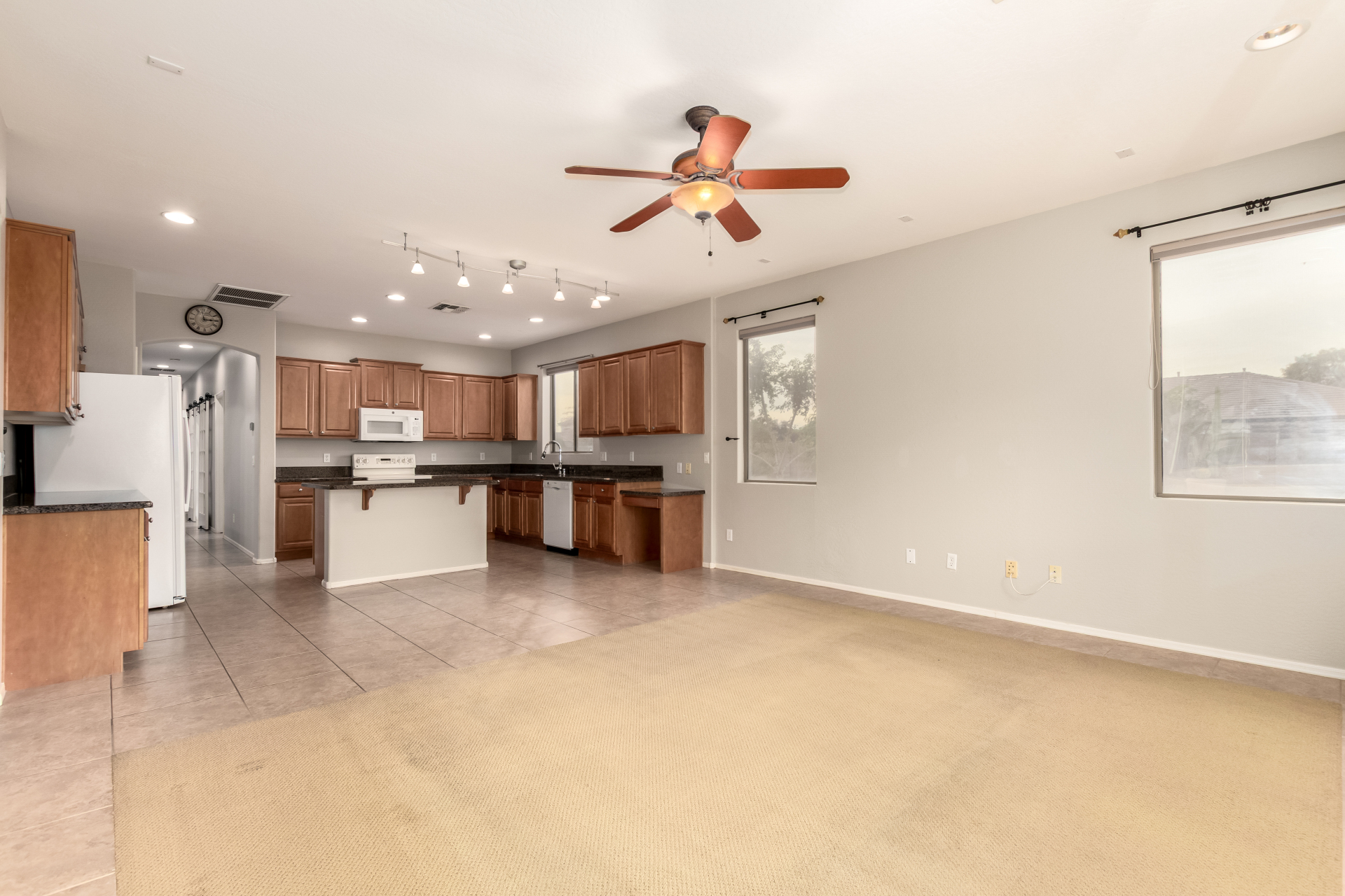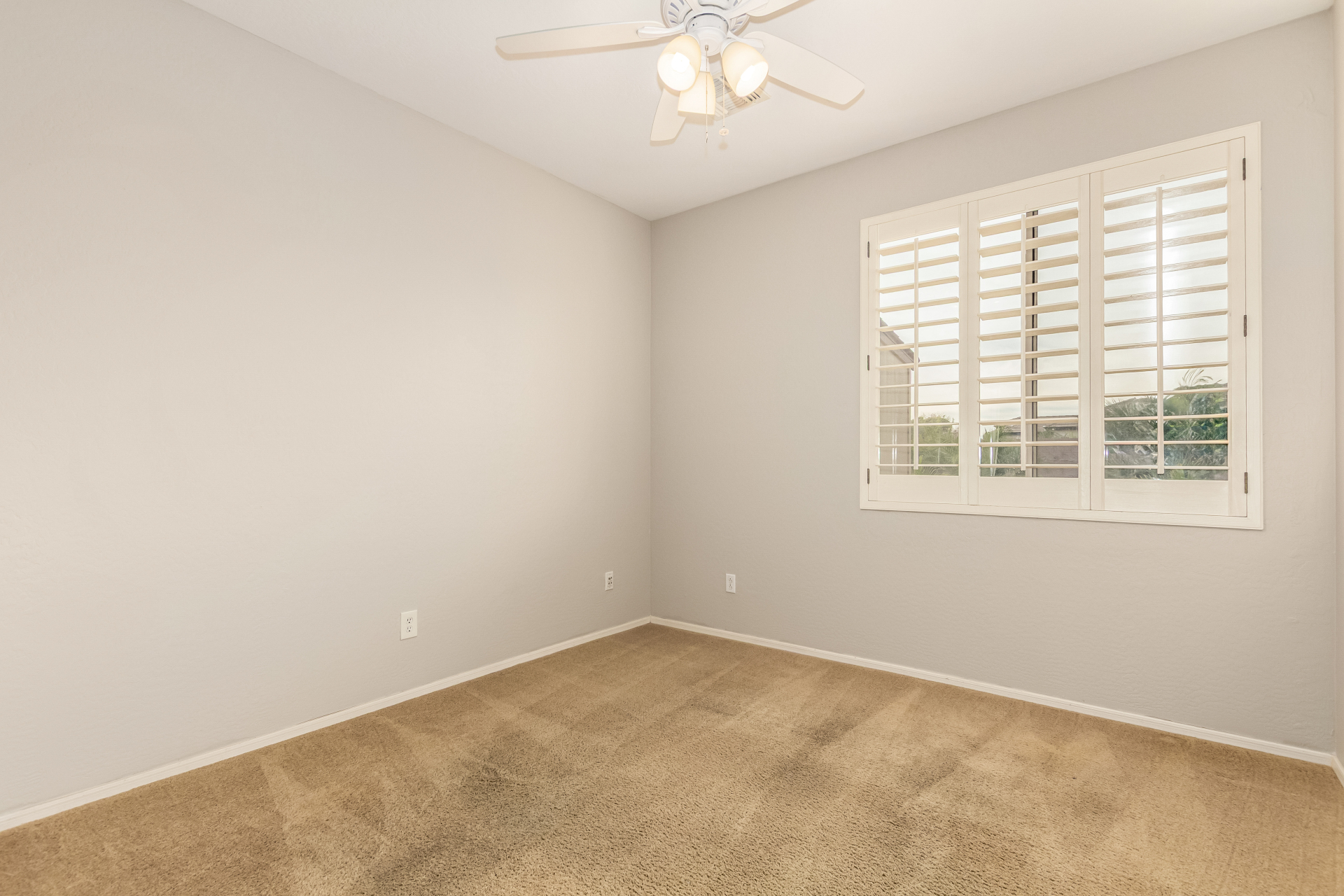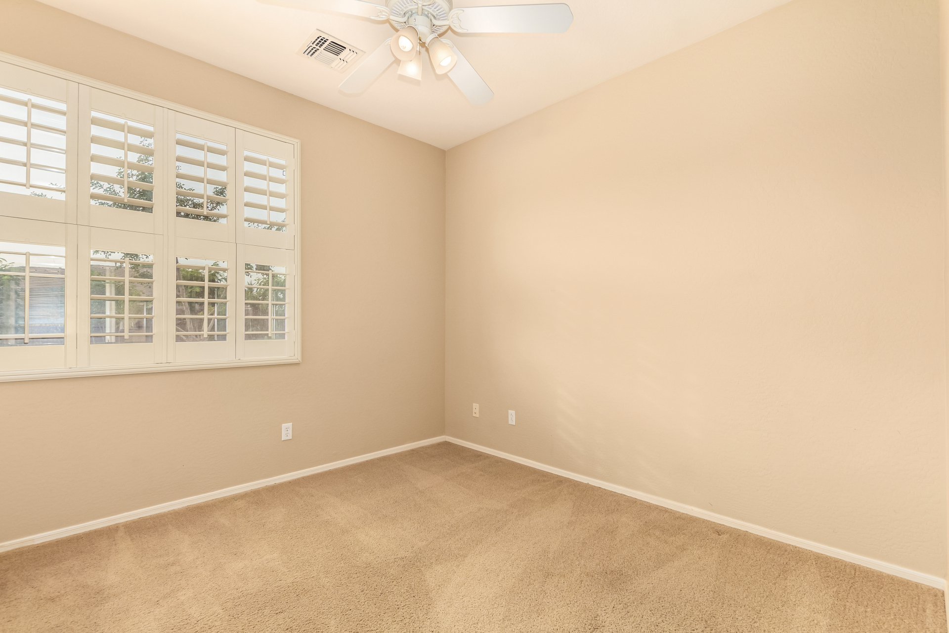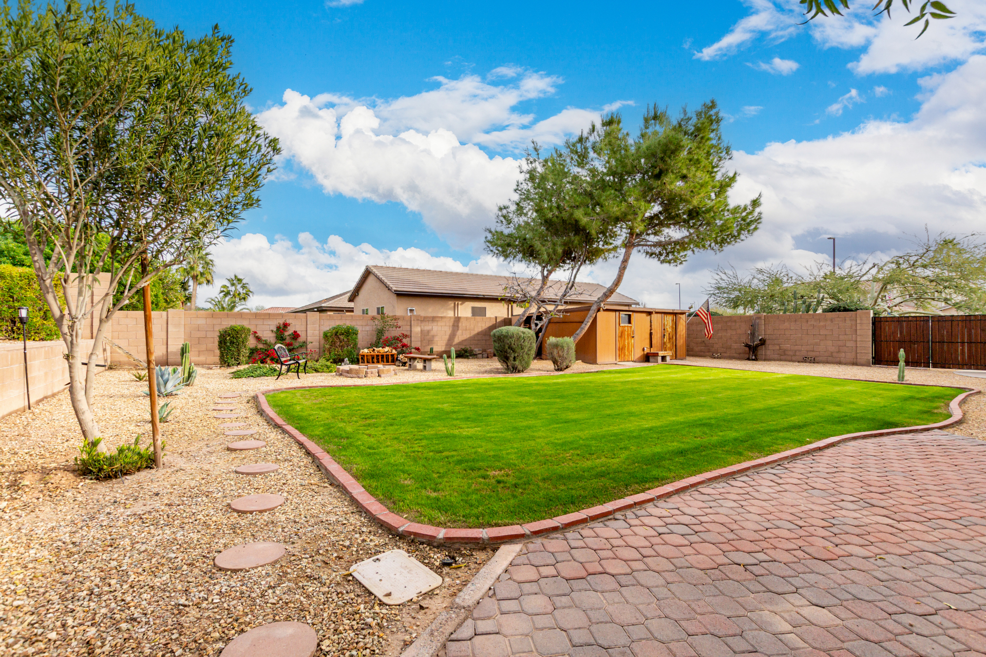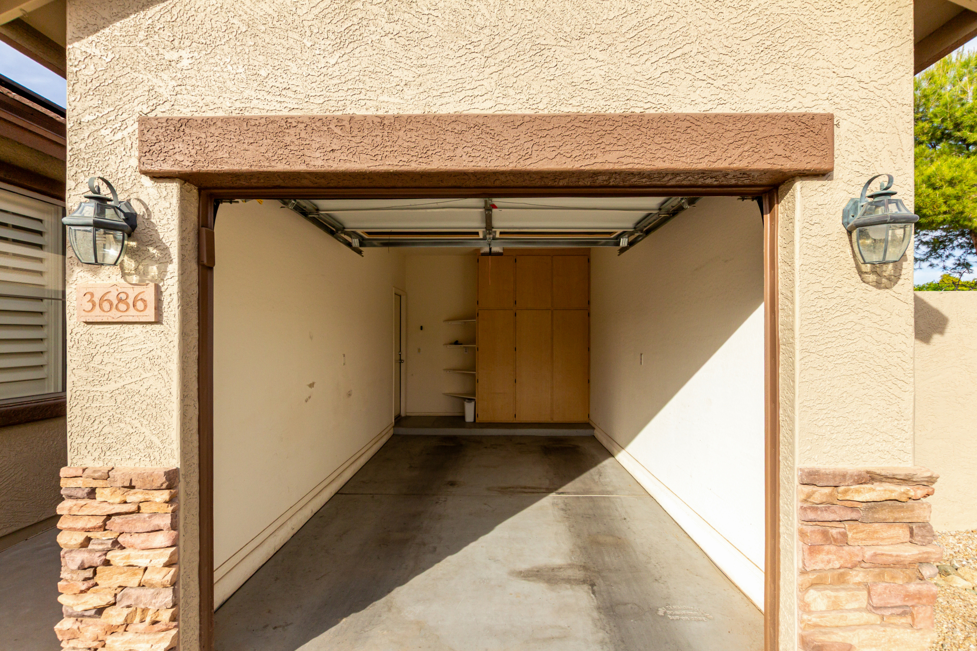 Your dream home is here! This stunning 3-bedroom residence welcomes you with a 3-car garage, RV gates, a lovely desert landscape, and tasteful stone accents. Fall in love with the captivating living room with high ceilings, recessed lighting, classic plantation shutters, and soft carpeting. The great room is perfect for relaxing evenings with loved ones. Culinary adventures await in the kitchen, equipped with granite counters, abundant wood cabinets with crown moulding, contemporary track lighting, essential built-in appliances, a pantry, and an island with a breakfast bar. The luxurious primary bedroom features an ensuite with dual sinks and a convenient walk-in closet. Double French doors lead to a cozy den, ideal for an office or a quiet lounge.