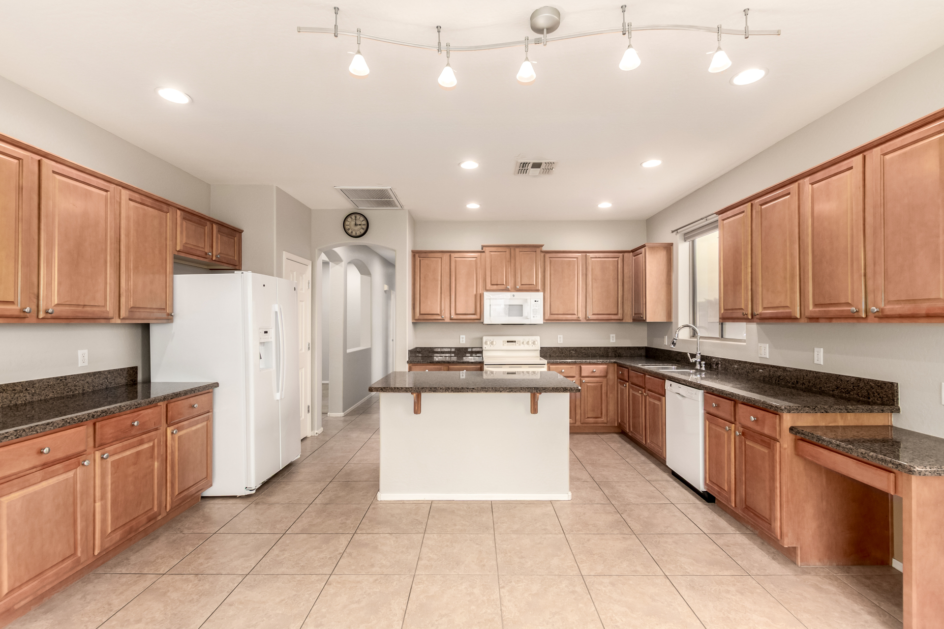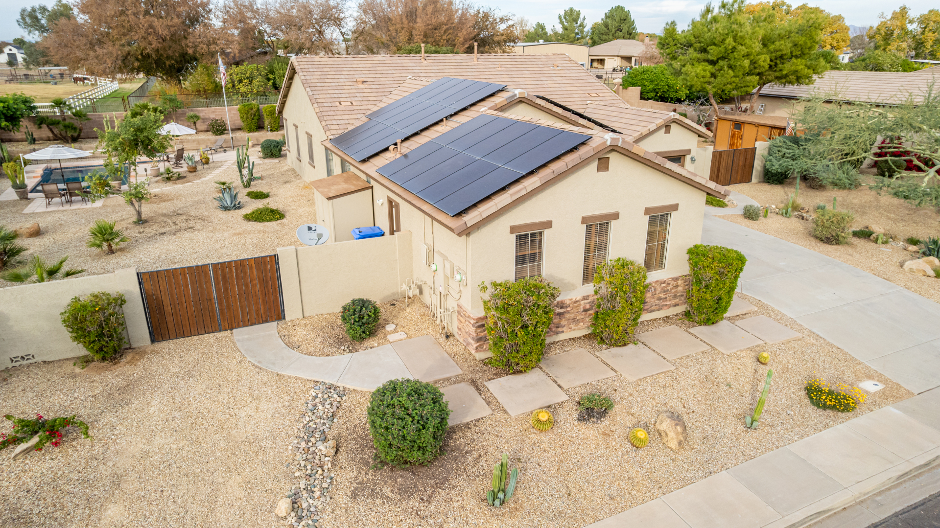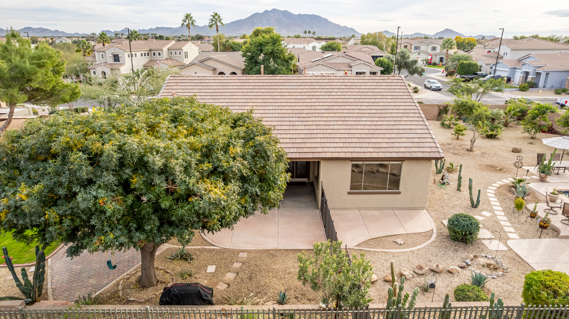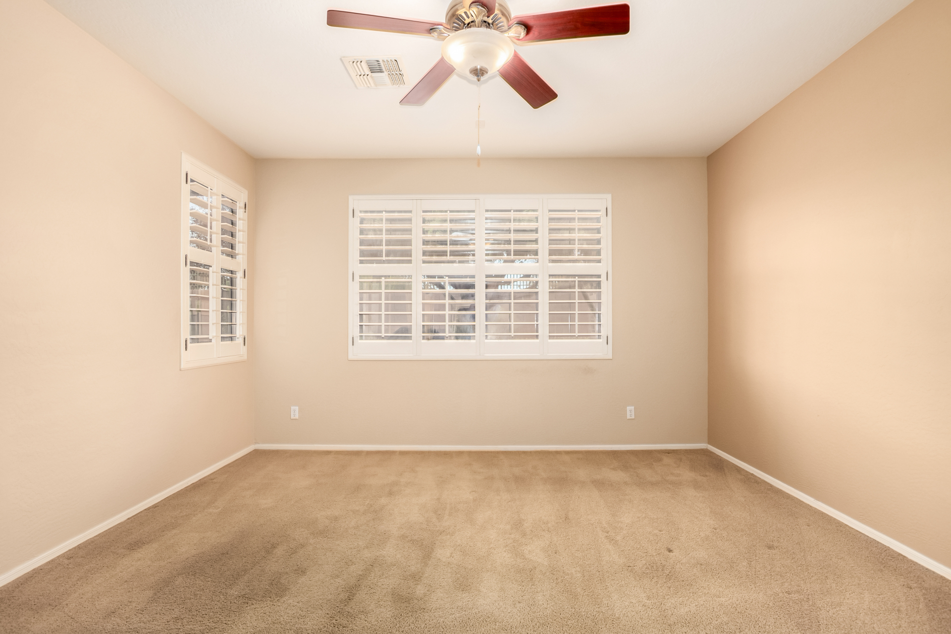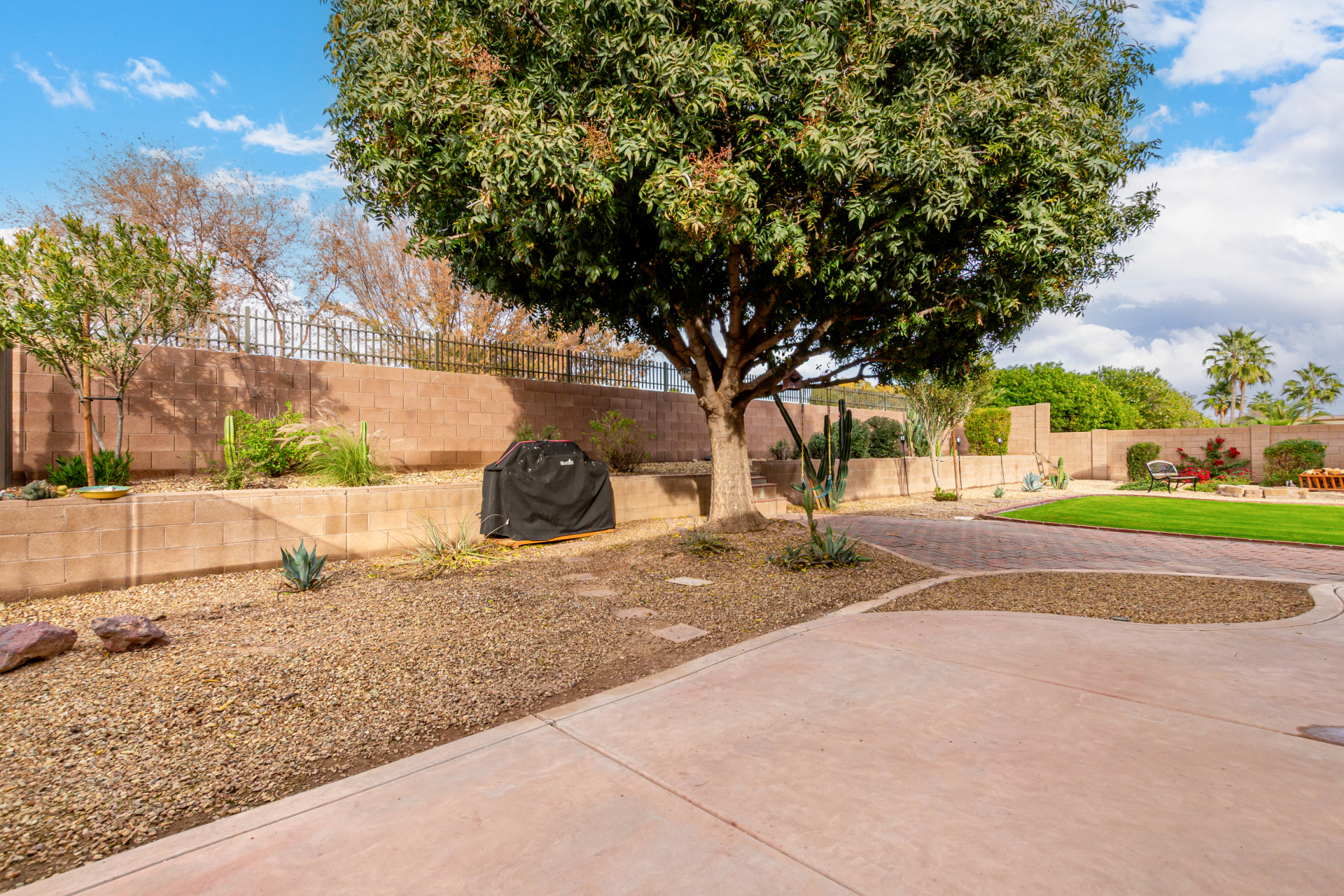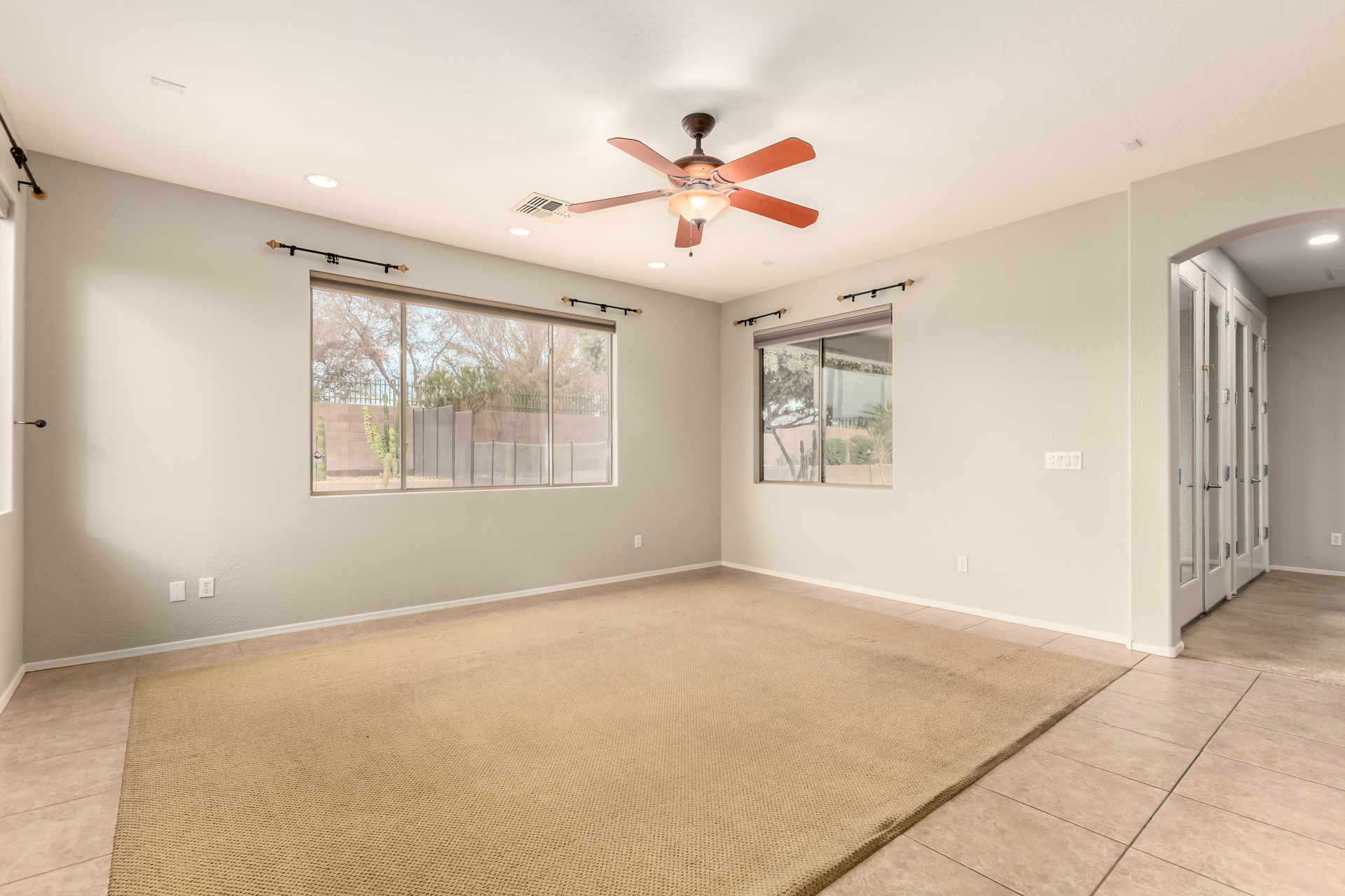 Your dream home is here! This stunning 3-bedroom residence welcomes you with a 3-car garage, RV gates, a lovely desert landscape, and tasteful stone accents. Fall in love with the captivating living room with high ceilings, recessed lighting, classic plantation shutters, and soft carpeting. The great room is perfect for relaxing evenings with loved ones. Culinary adventures await in the kitchen, equipped with granite counters, abundant wood cabinets with crown moulding, contemporary track lighting, essential built-in appliances, a pantry, and an island with a breakfast bar. The luxurious primary bedroom features an ensuite with dual sinks and a convenient walk-in closet. Double French doors lead to a cozy den, ideal for an office or a quiet lounge.