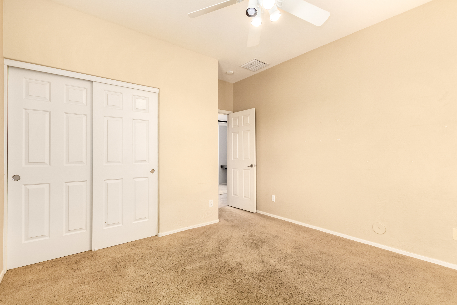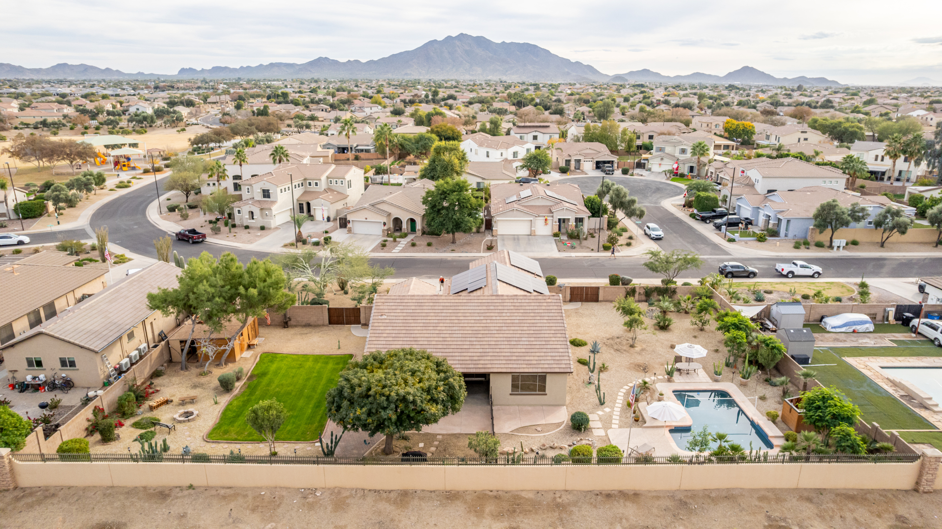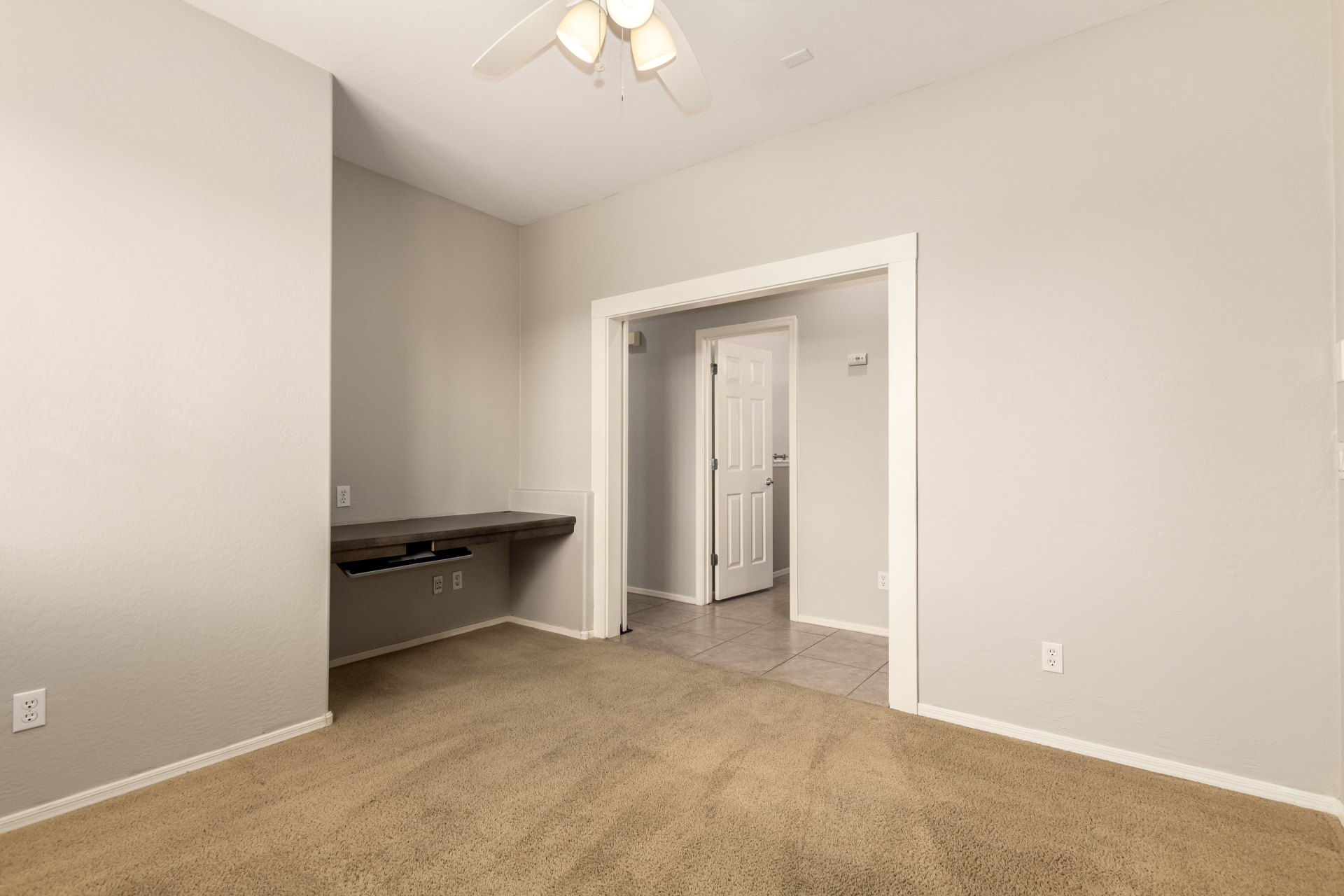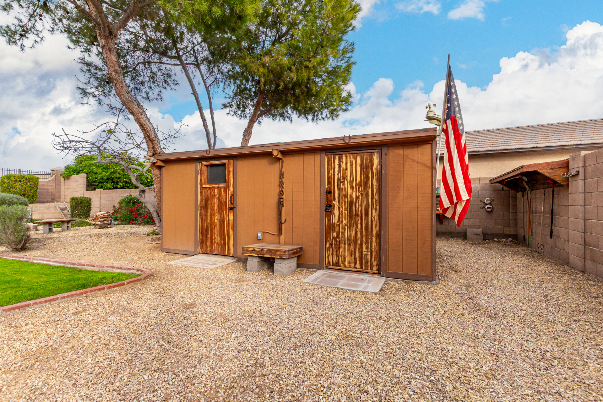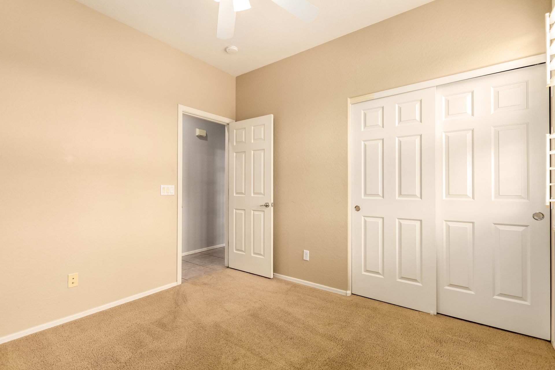 Your dream home is here! This stunning 3-bedroom residence welcomes you with a 3-car garage, RV gates, a lovely desert landscape, and tasteful stone accents. Fall in love with the captivating living room with high ceilings, recessed lighting, classic plantation shutters, and soft carpeting. The great room is perfect for relaxing evenings with loved ones. Culinary adventures await in the kitchen, equipped with granite counters, abundant wood cabinets with crown moulding, contemporary track lighting, essential built-in appliances, a pantry, and an island with a breakfast bar. The luxurious primary bedroom features an ensuite with dual sinks and a convenient walk-in closet. Double French doors lead to a cozy den, ideal for an office or a quiet lounge.