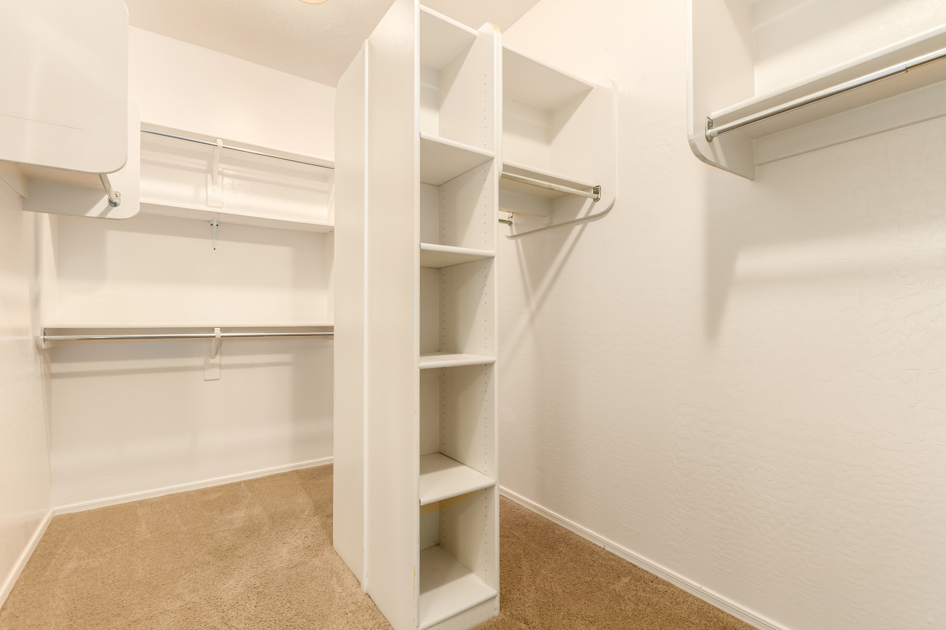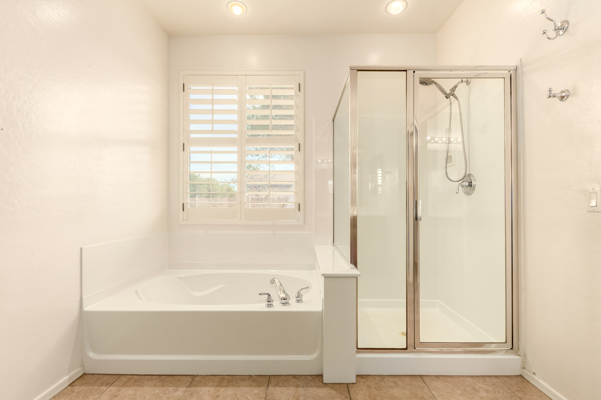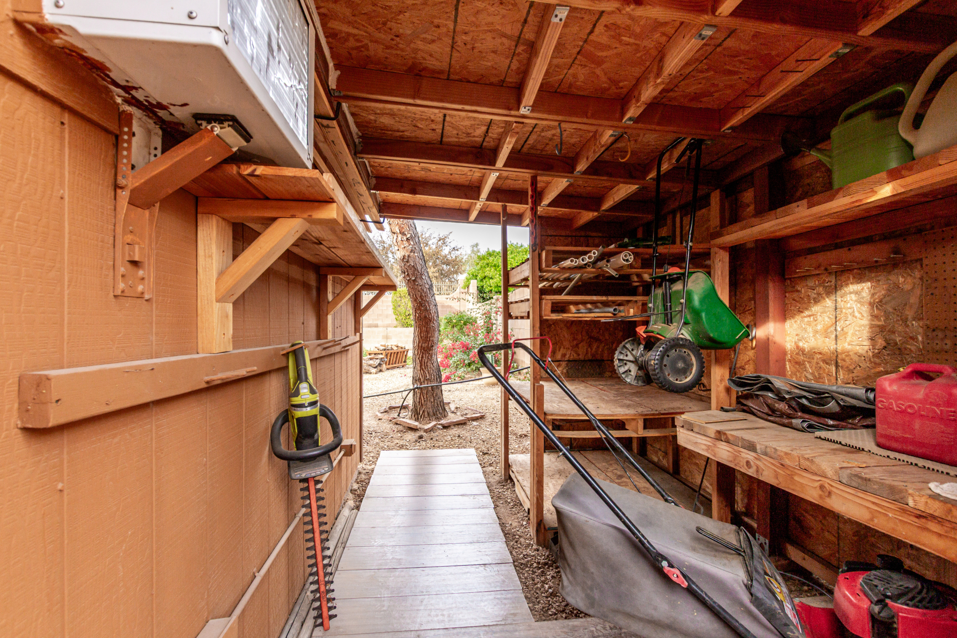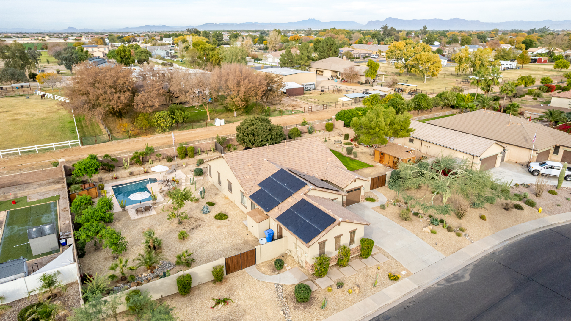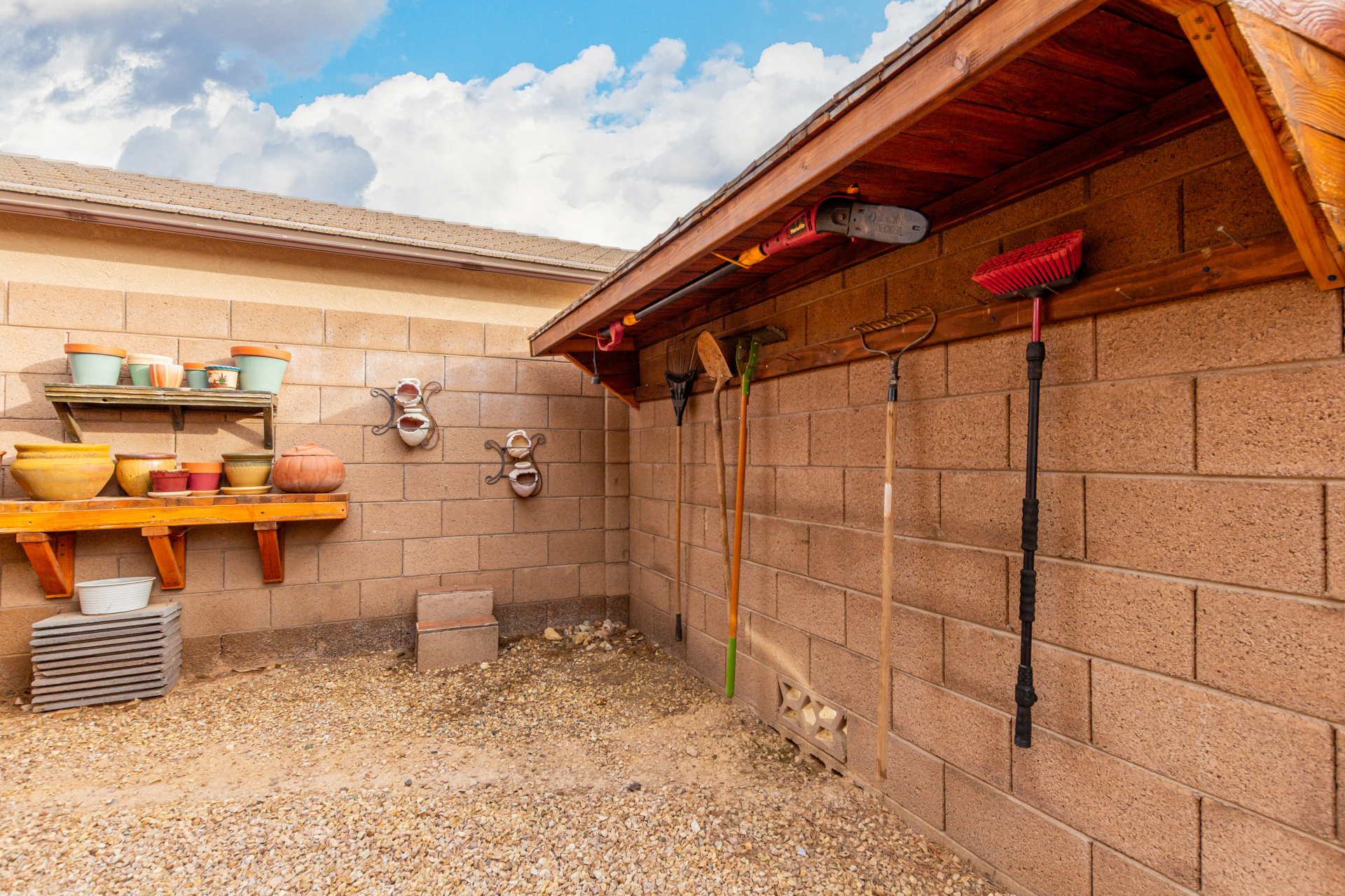 Your dream home is here! This stunning 3-bedroom residence welcomes you with a 3-car garage, RV gates, a lovely desert landscape, and tasteful stone accents. Fall in love with the captivating living room with high ceilings, recessed lighting, classic plantation shutters, and soft carpeting. The great room is perfect for relaxing evenings with loved ones. Culinary adventures await in the kitchen, equipped with granite counters, abundant wood cabinets with crown moulding, contemporary track lighting, essential built-in appliances, a pantry, and an island with a breakfast bar. The luxurious primary bedroom features an ensuite with dual sinks and a convenient walk-in closet. Double French doors lead to a cozy den, ideal for an office or a quiet lounge.