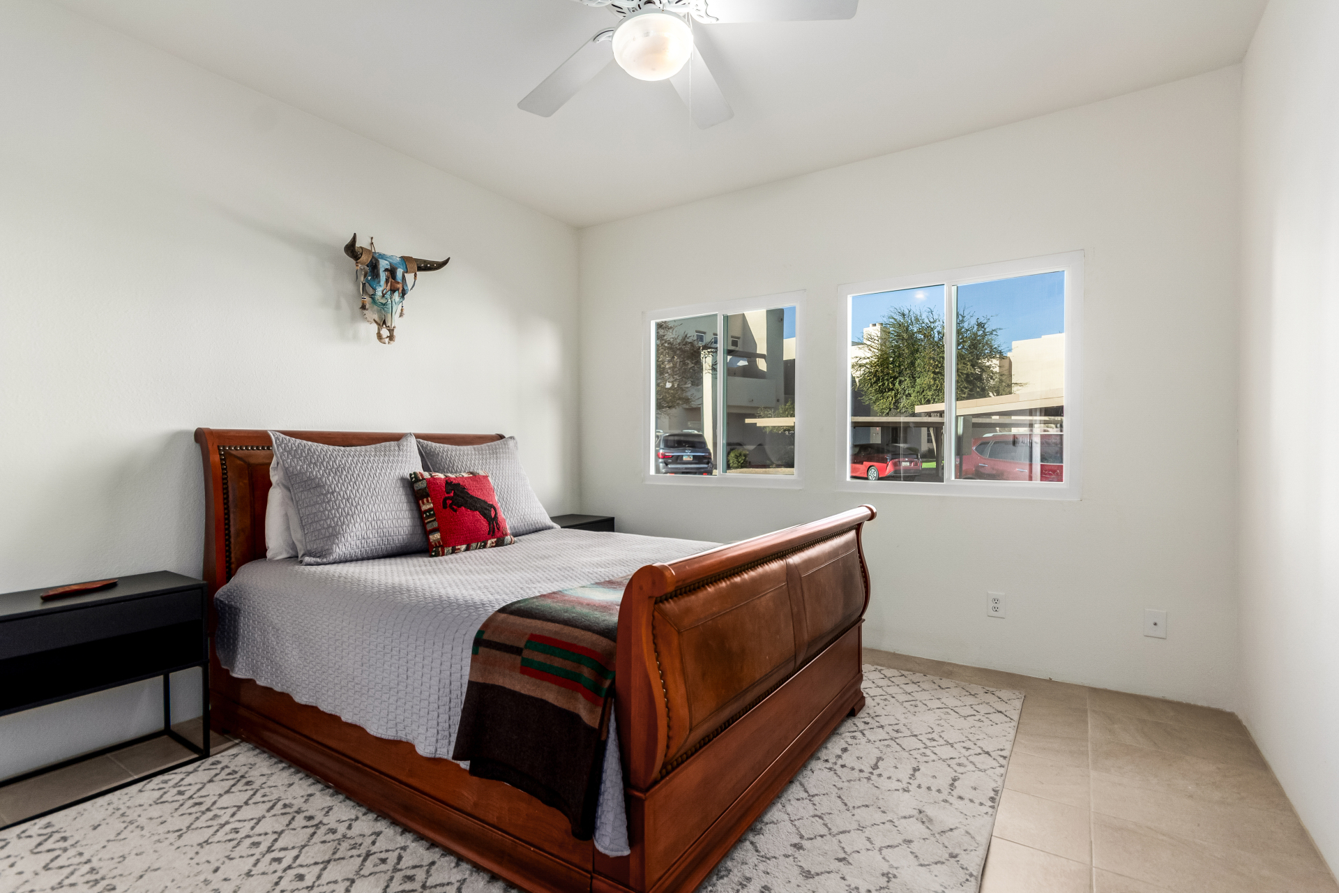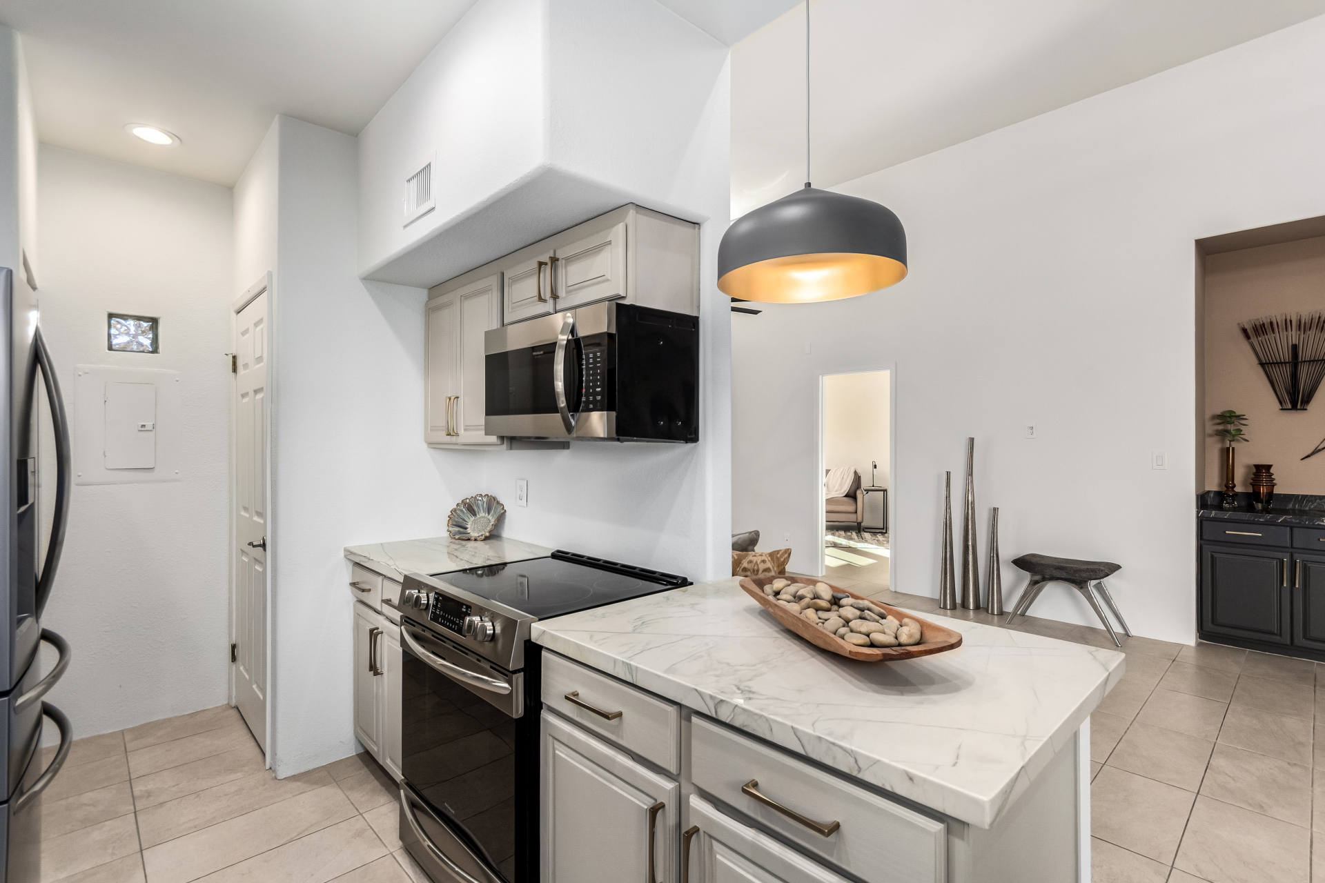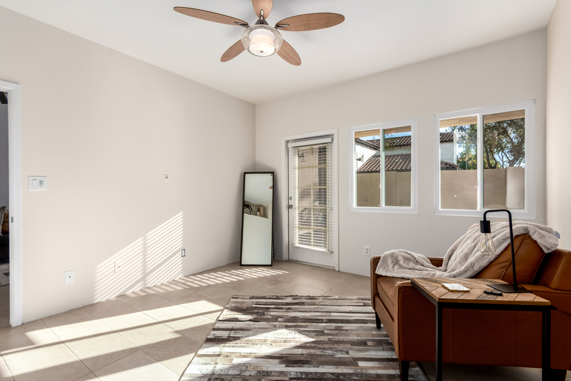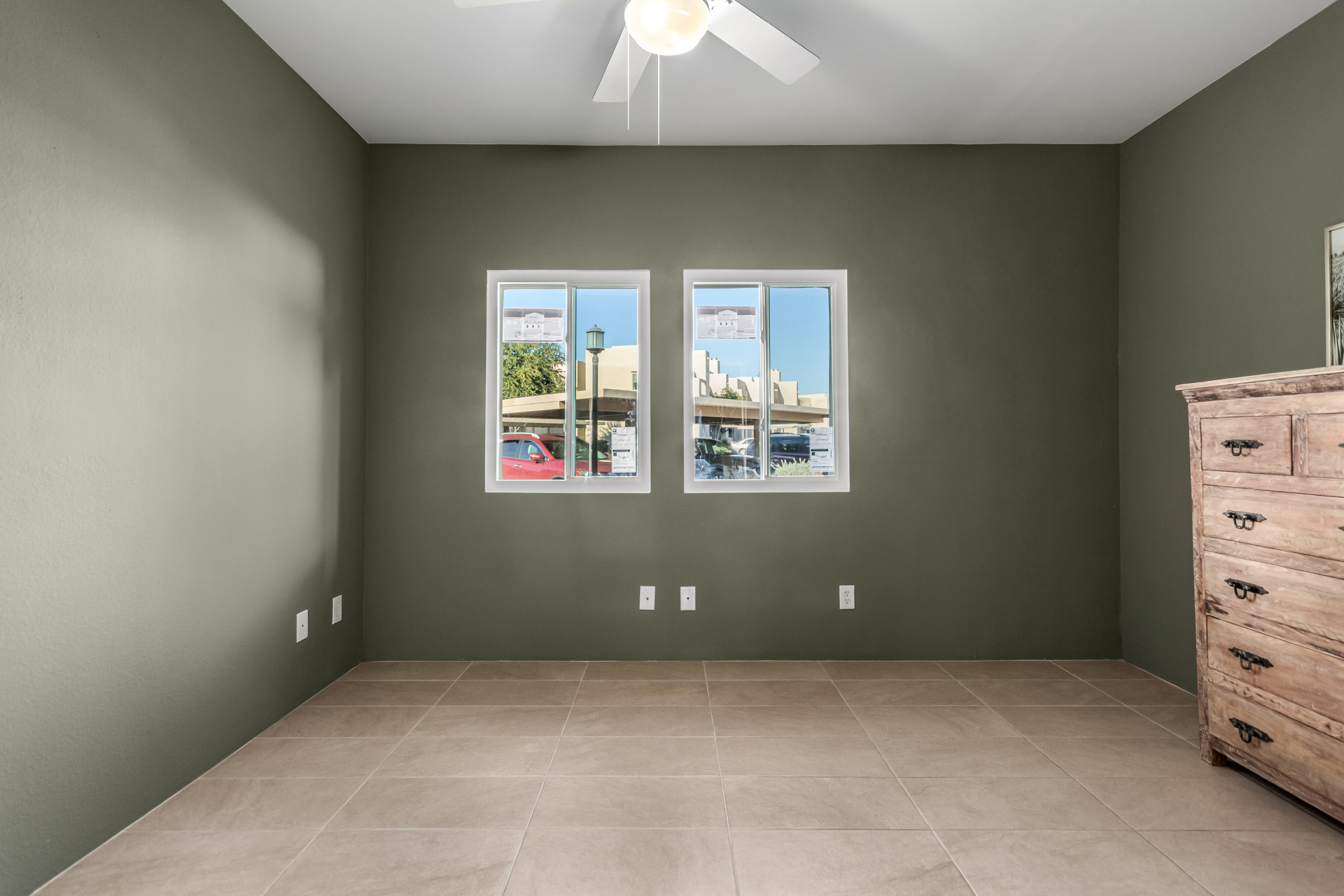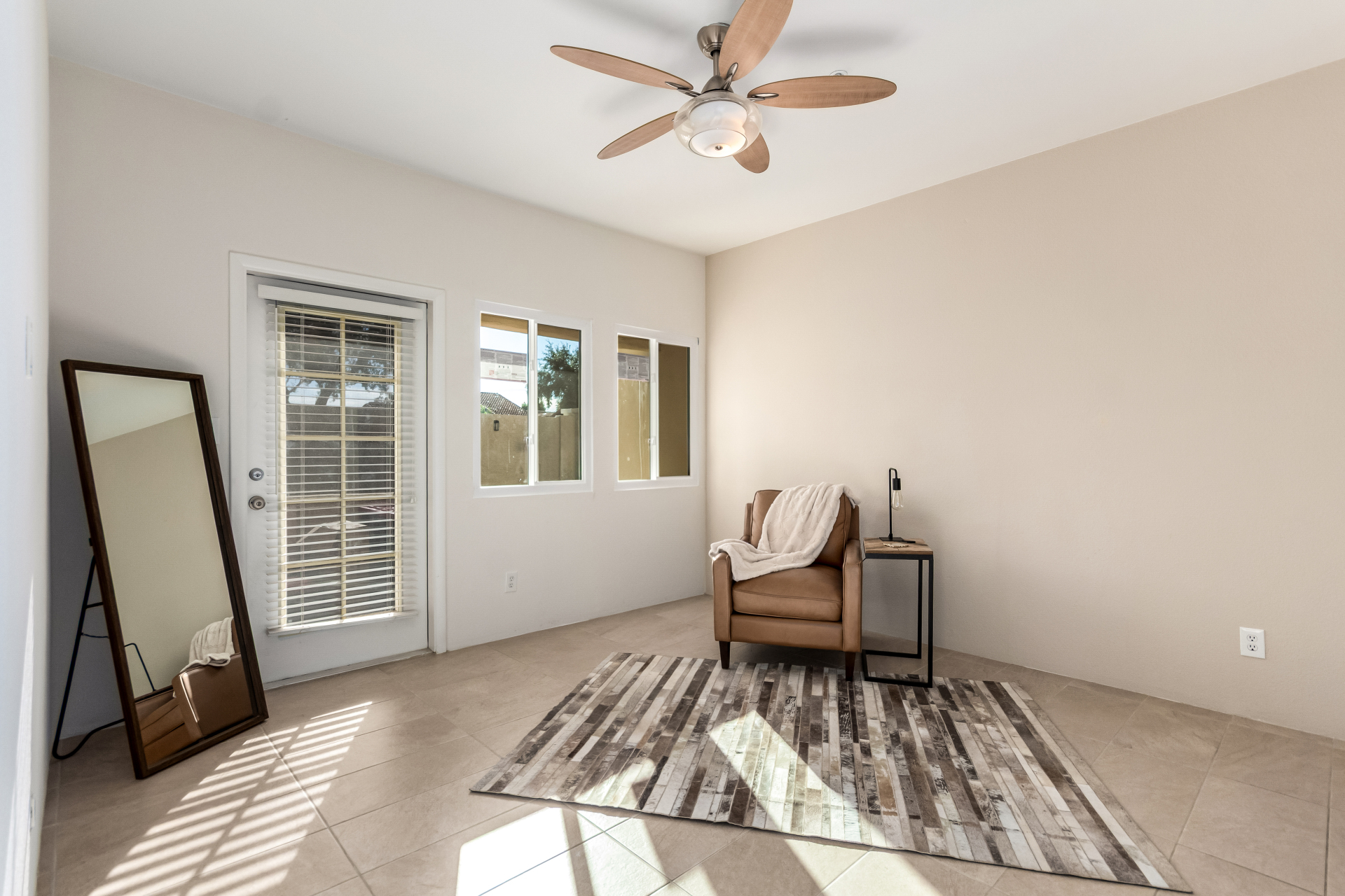 Fantastic opportunity to own this 2-bedroom unit, thoughtfully remodeled from top to bottom! Discover a renovated open layout with soaring ceilings, recessed lighting, a soothing palette, abundant natural light, durable tile flooring, and an inviting fireplace. The updated kitchen comes with granite counters, pristine wood cabinetry, SS appliances, and a pantry. Double French doors lead to a flex room, ideal for a 3rd bedroom or office. The primary bedroom boasts direct patio access, an ensuite with double sinks, and a walk-in closet for an organized wardrobe. Unwind on the covered patio, offering additional storage and serene views of the neighborhood. As a bonus, the property includes NEW WINDOWS and an HVAC system installed. Don't miss your chance to own this incredible gem!