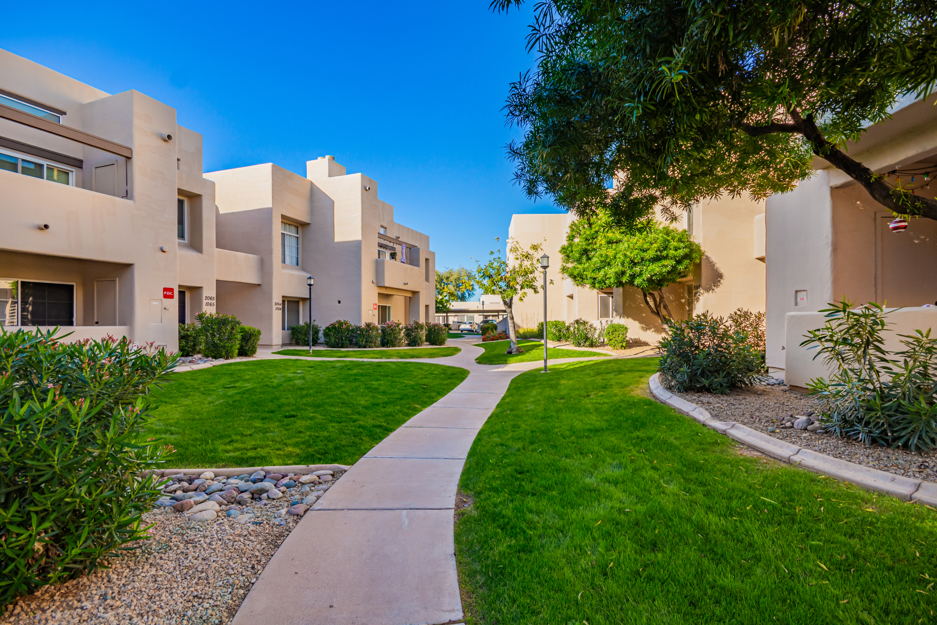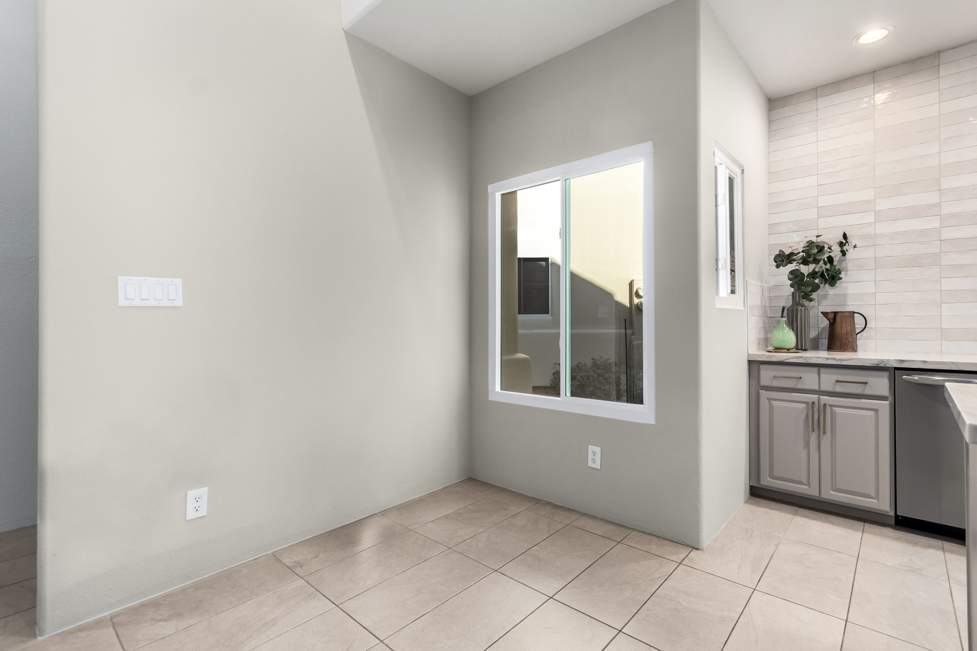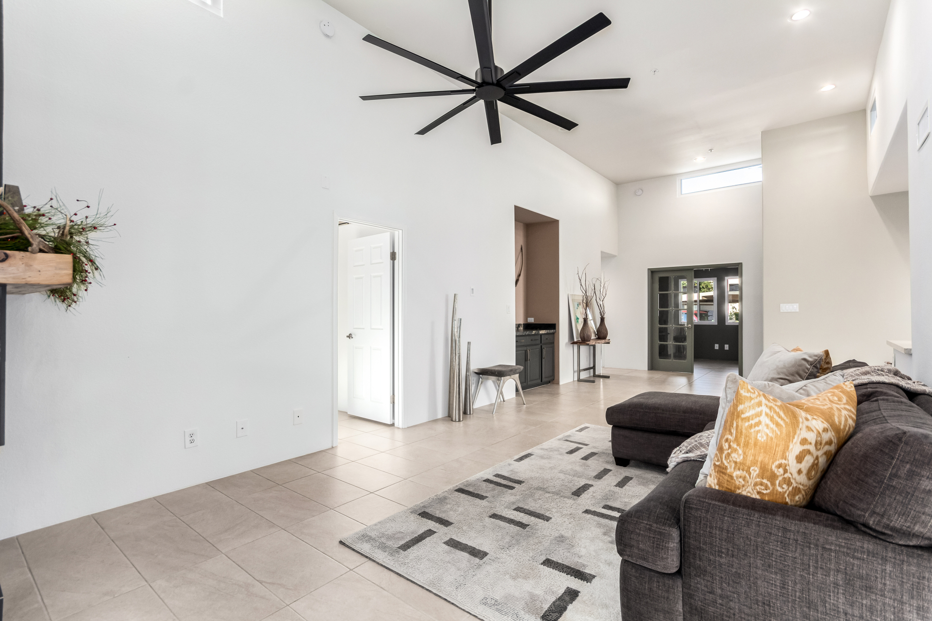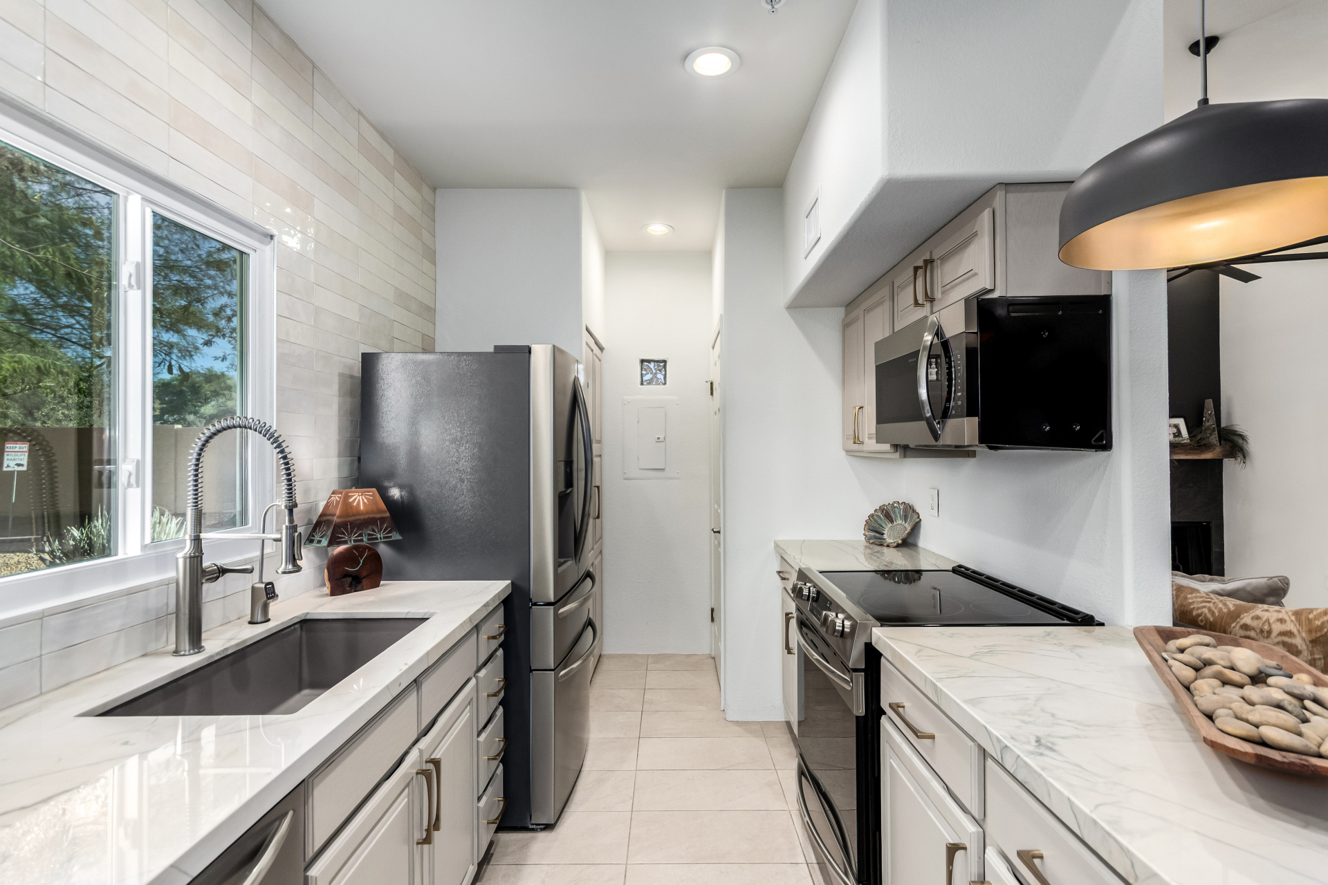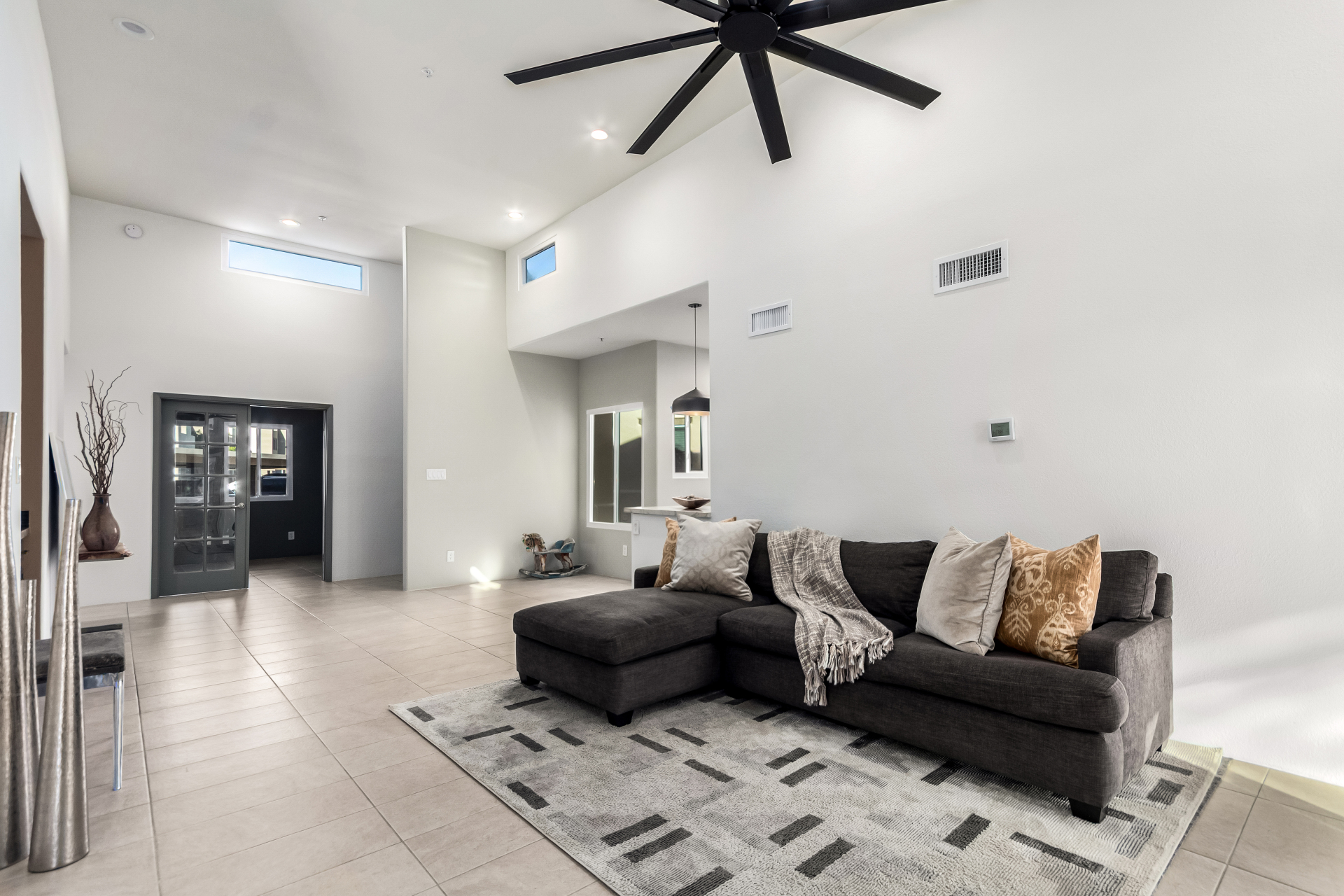 Fantastic opportunity to own this 2-bedroom unit, thoughtfully remodeled from top to bottom! Discover a renovated open layout with soaring ceilings, recessed lighting, a soothing palette, abundant natural light, durable tile flooring, and an inviting fireplace. The updated kitchen comes with granite counters, pristine wood cabinetry, SS appliances, and a pantry. Double French doors lead to a flex room, ideal for a 3rd bedroom or office. The primary bedroom boasts direct patio access, an ensuite with double sinks, and a walk-in closet for an organized wardrobe. Unwind on the covered patio, offering additional storage and serene views of the neighborhood. As a bonus, the property includes NEW WINDOWS and an HVAC system installed. Don't miss your chance to own this incredible gem!