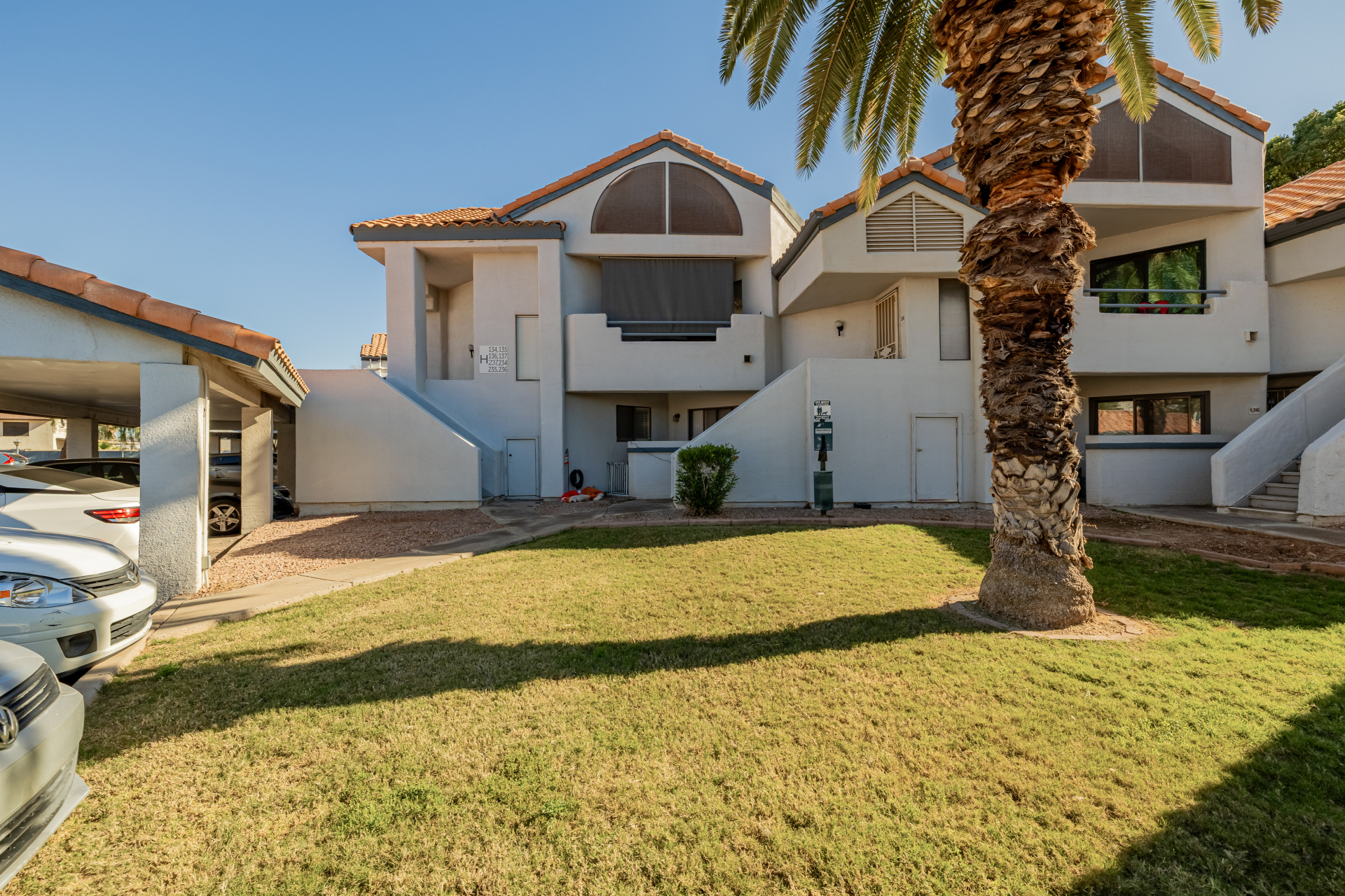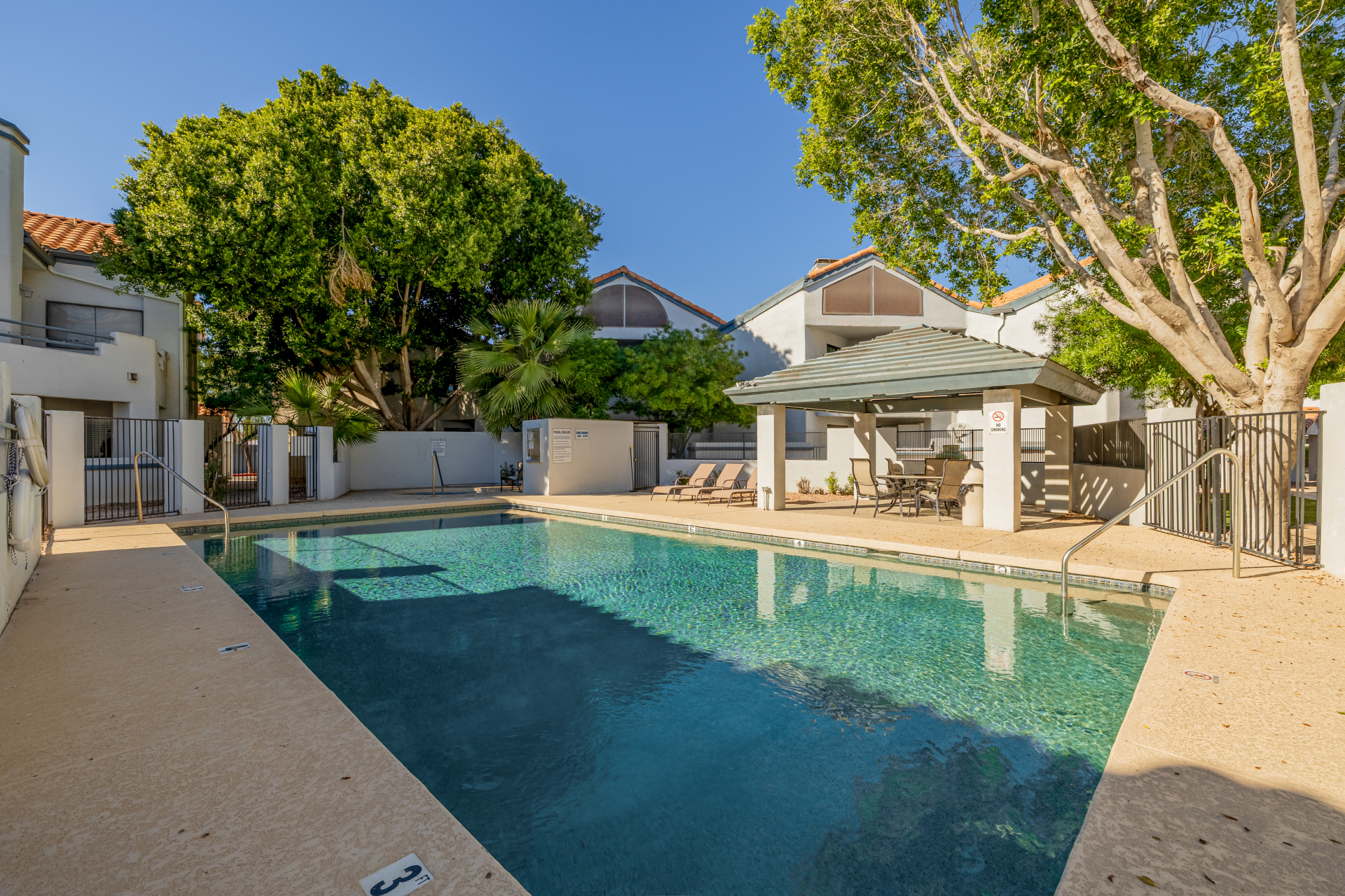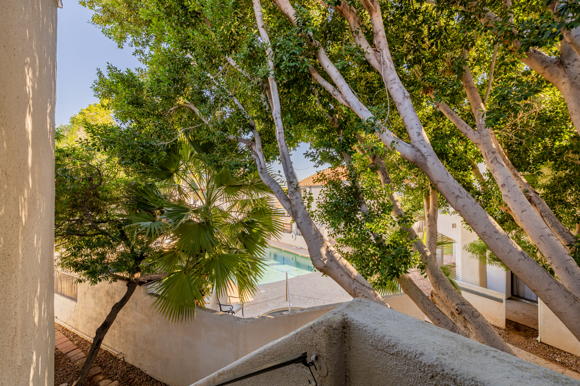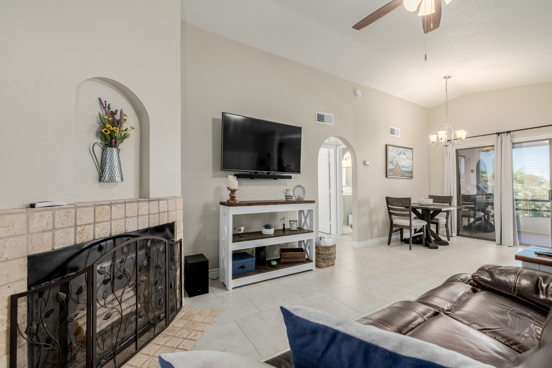 Adorable 2-bedroom upstairs condo in Shadow Run, offering beautiful pool views! The inviting interior showcases abundant natural light, a neutral palette, vaulted ceilings, and tile flooring w/carpet in bedrooms. With a fireplace as the focal point, the desirable great room exudes warmth & charm. The kitchen boasts SS appliances, granite tile counters/backsplash, ample wood cabinetry w/crown molding, and a peninsula w/breakfast bar. The primary bedroom features a private vanity area connected to a walk-in closet, with direct access to the Jack & Jill bathroom for added convenience. If you want to relax or enjoy BBQ, the cozy balcony awaits you! The assigned parking space is a plus. Take advantage of the Community pool and spa! Excellent Chandler location close to everything. Welcome home!