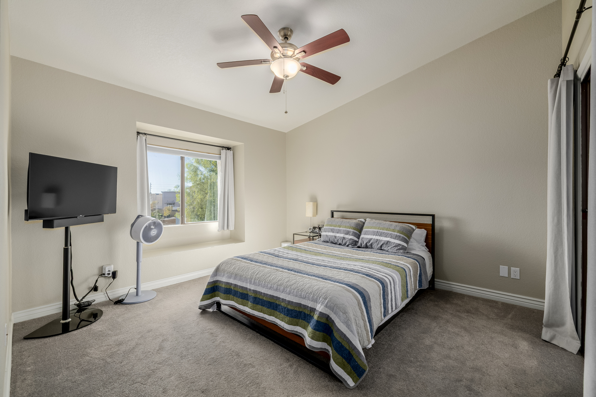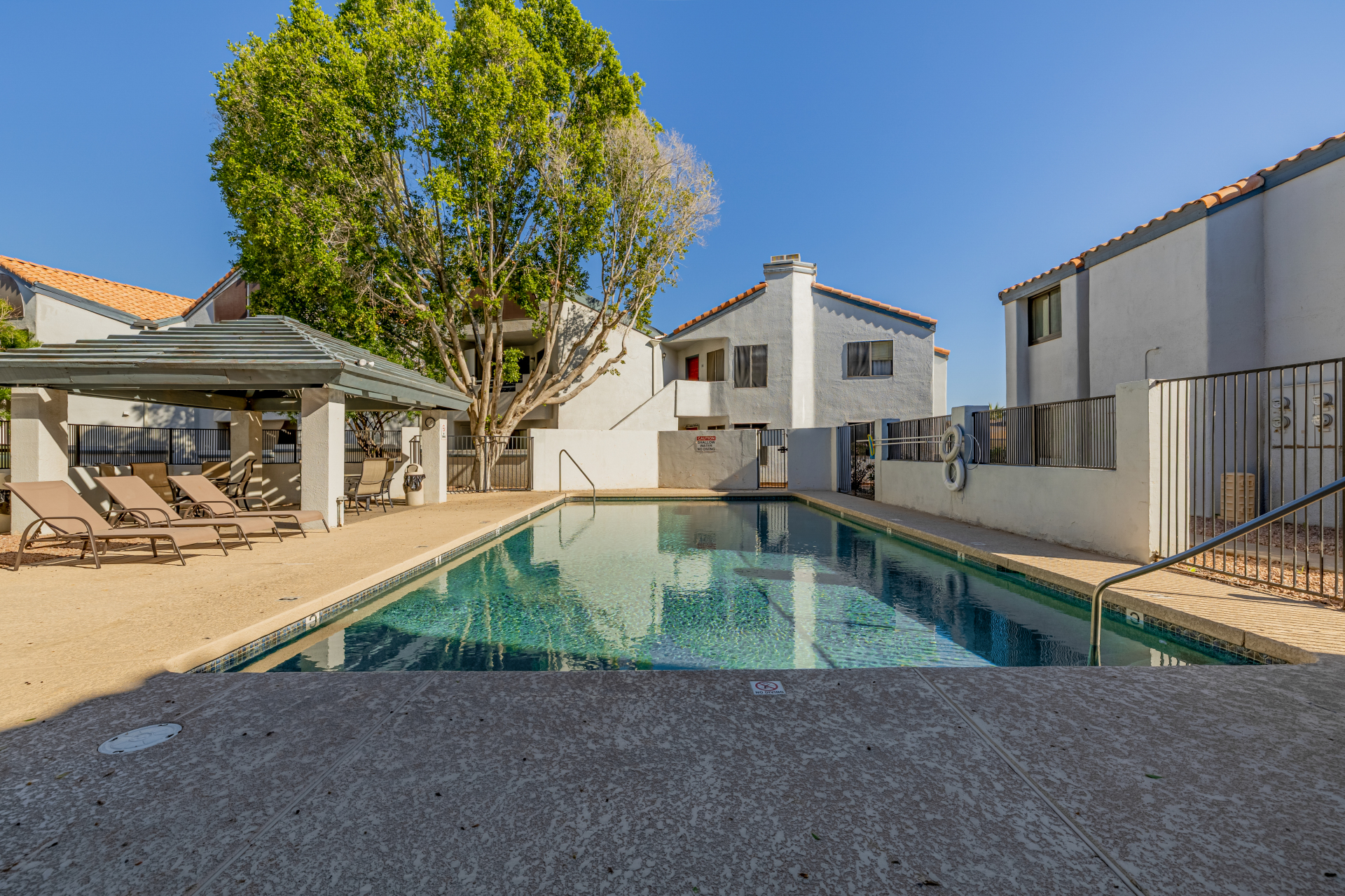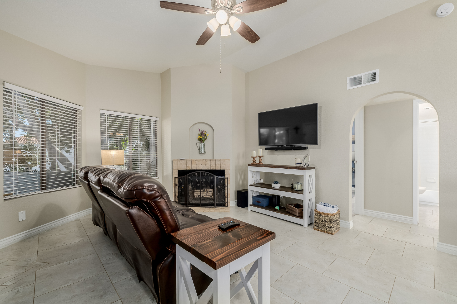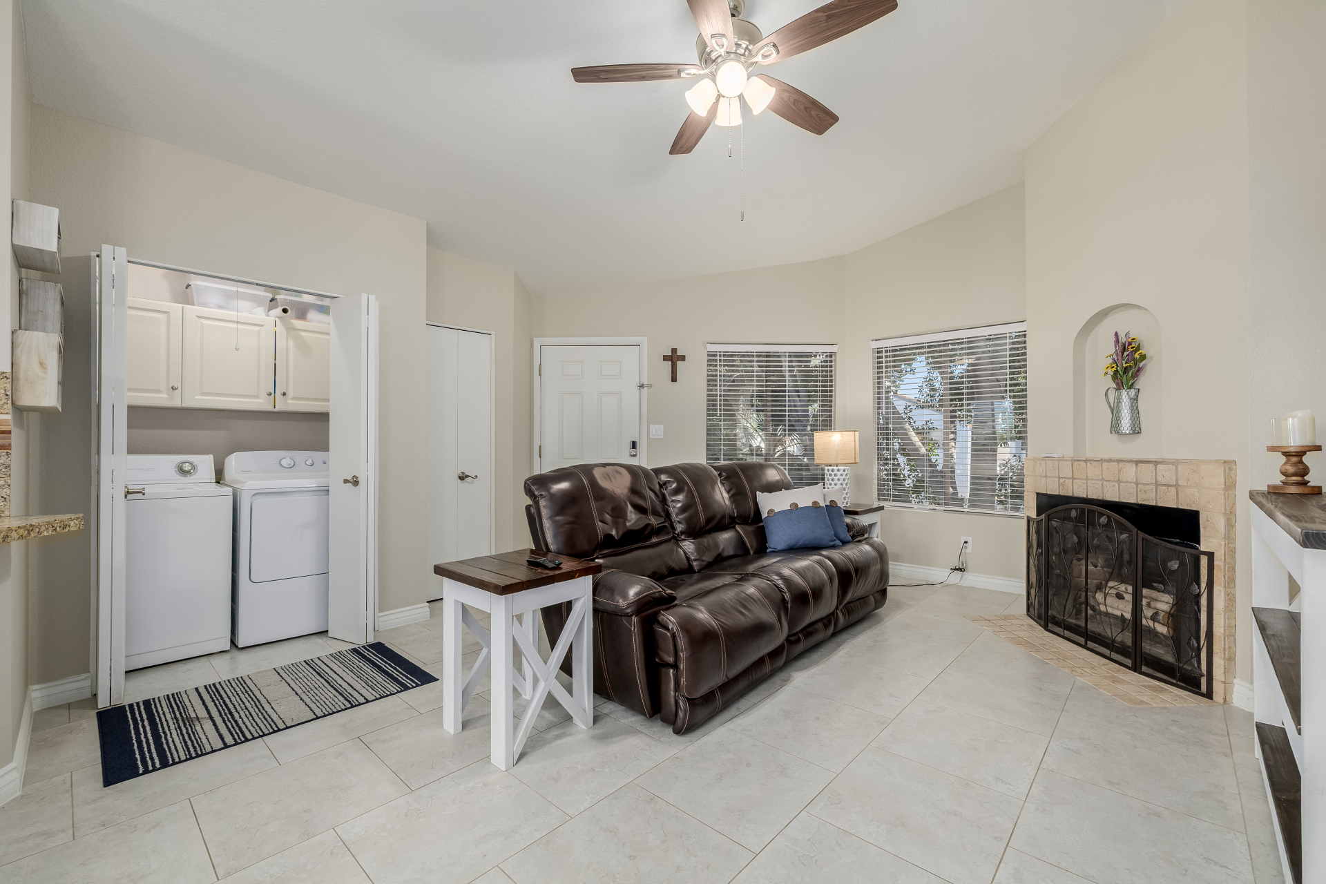 Adorable 2-bedroom upstairs condo in Shadow Run, offering beautiful pool views! The inviting interior showcases abundant natural light, a neutral palette, vaulted ceilings, and tile flooring w/carpet in bedrooms. With a fireplace as the focal point, the desirable great room exudes warmth & charm. The kitchen boasts SS appliances, granite tile counters/backsplash, ample wood cabinetry w/crown molding, and a peninsula w/breakfast bar. The primary bedroom features a private vanity area connected to a walk-in closet, with direct access to the Jack & Jill bathroom for added convenience. If you want to relax or enjoy BBQ, the cozy balcony awaits you! The assigned parking space is a plus. Take advantage of the Community pool and spa! Excellent Chandler location close to everything. Welcome home!