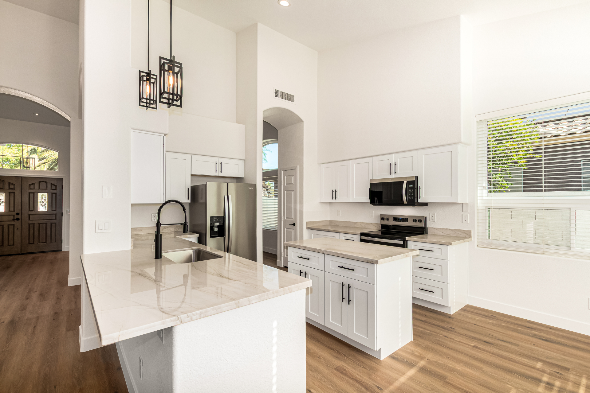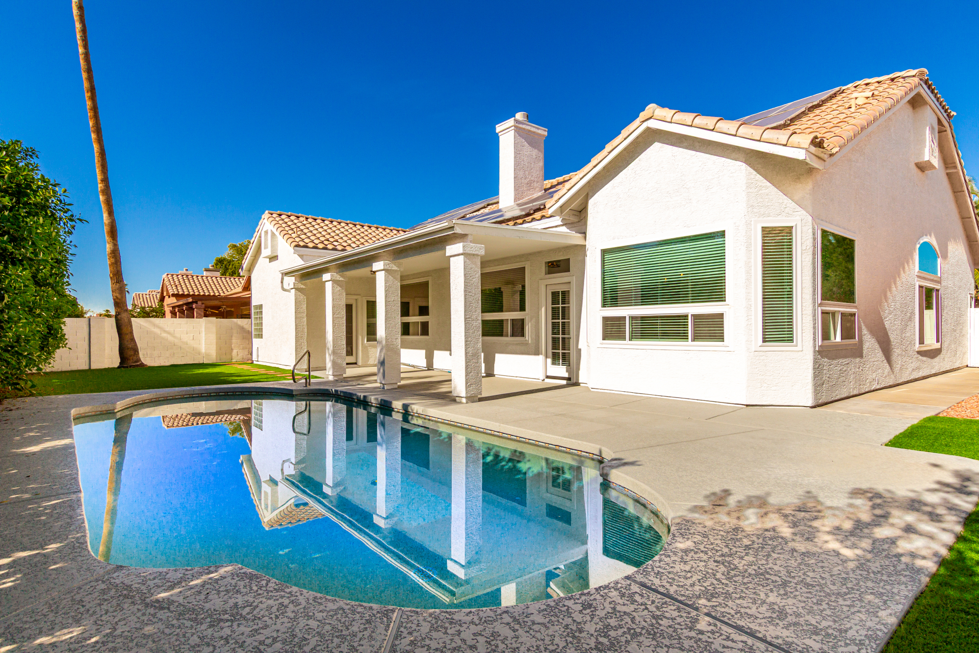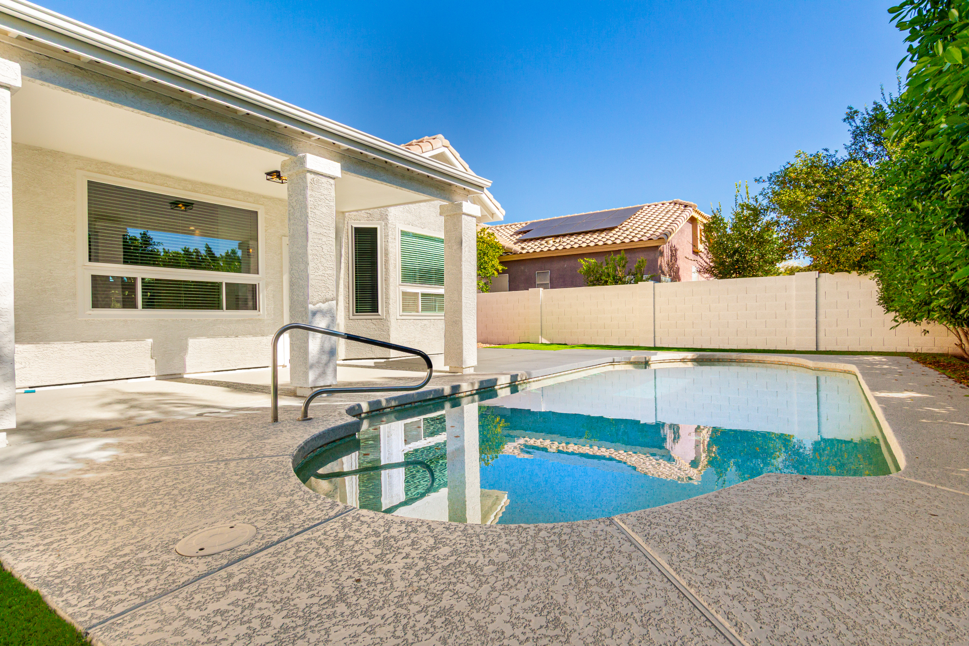 This extensively remodeled 4-bedroom, 2-bathroom residence is situated in the sought-after Steeplechase community of Scottsdale. The property showcases contemporary design elements, elevated ceilings, decorative architectural niches, and a spacious open layout. Recent upgrades encompass flooring throughout, copper plumbing, pool equipment, appliances, cabinetry, new windows and more. Additional features include a three-car garage and no HOA fees.