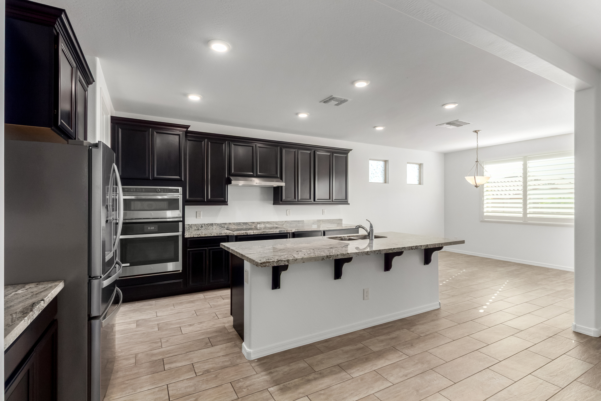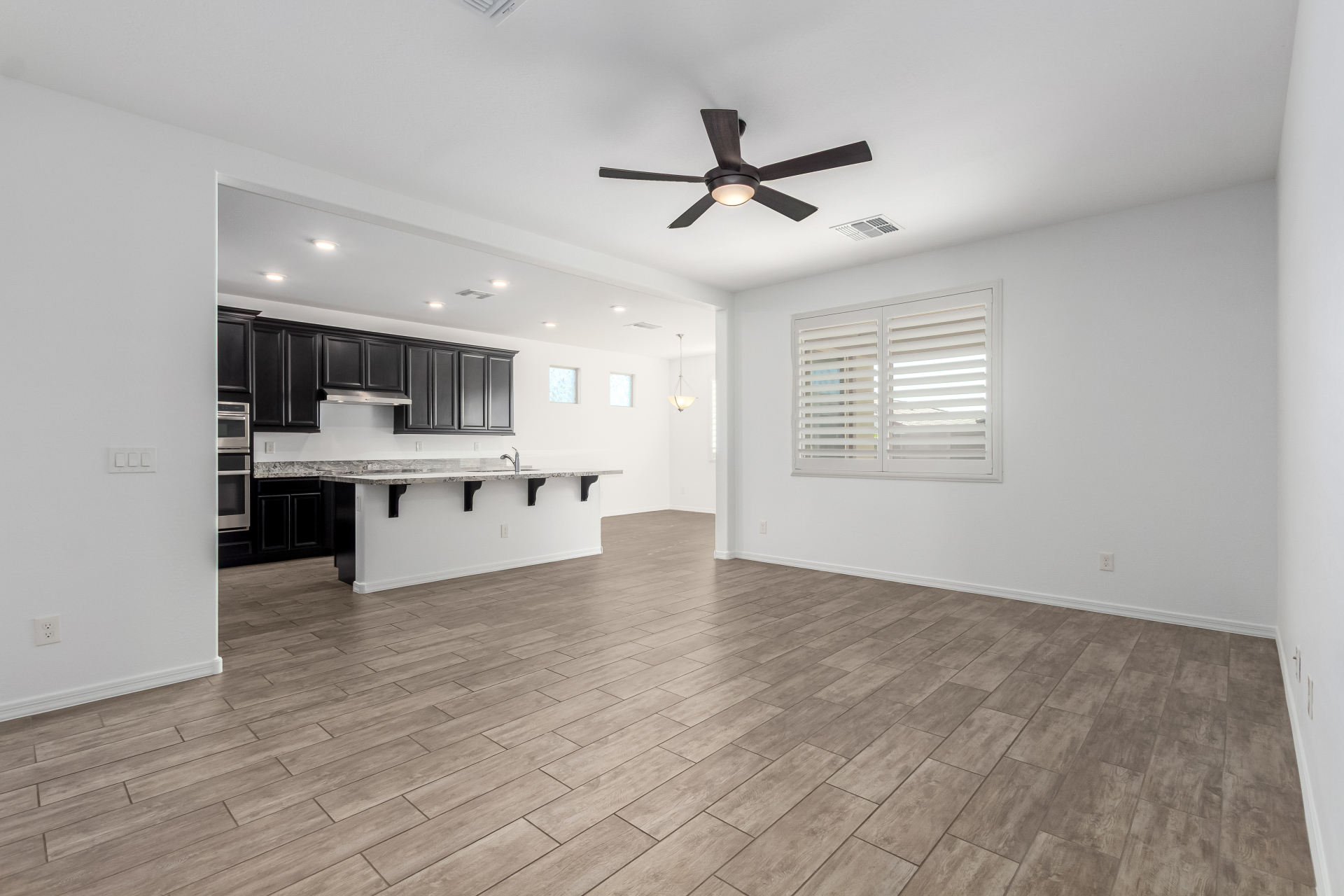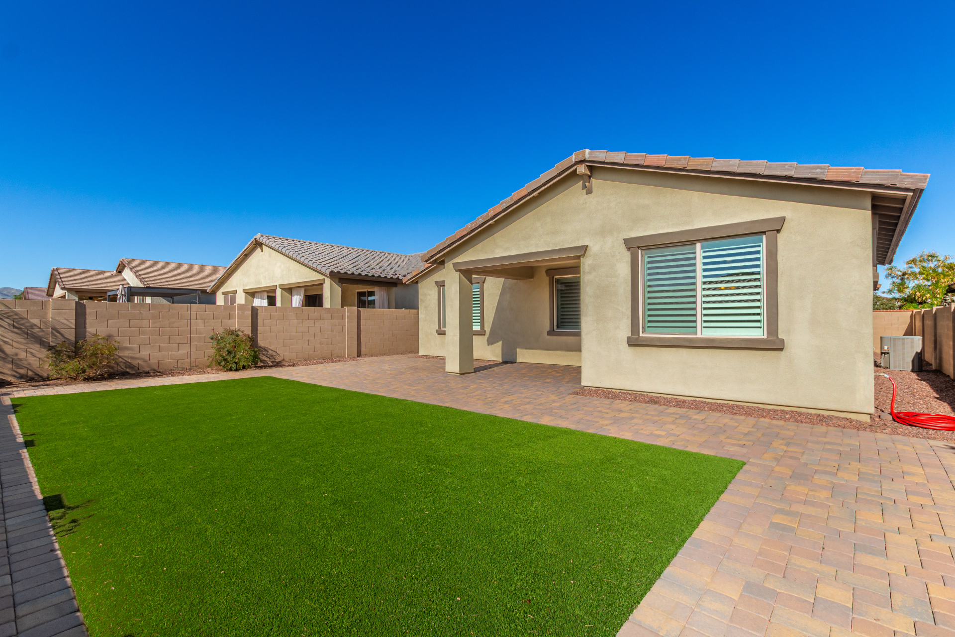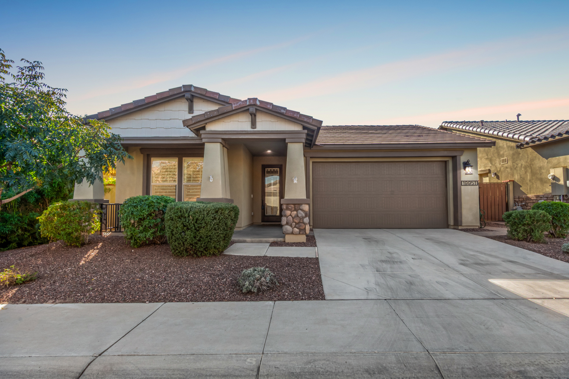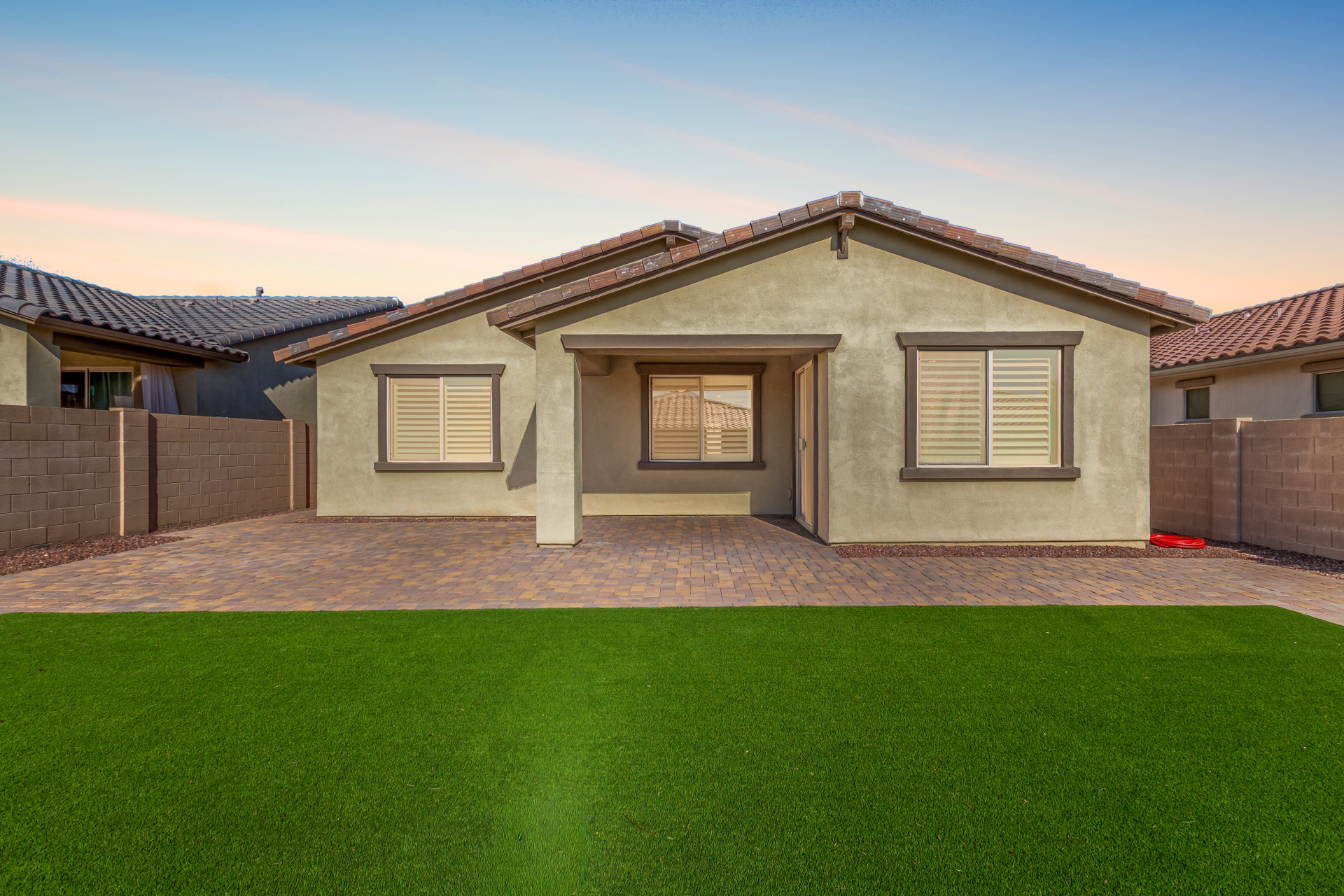 Start living in this upgraded single-level home offering a 2-car garage, stone accents, and a cozy front porch! Inviting hallway leads to the spacious open floor plan enhanced by wood-look tile flooring, abundant natural light, plantation shutters, and fresh paint throughout. Upscale kitchen is a cook's delight, fully equipped with stainless steel appliances, ample espresso cabinets adorned with crown moulding, a walk-in pantry, granite counters, a prep island with a breakfast bar, and recessed lighting that illuminates every corner. Sizable main bedroom provides a bathroom with two vanities and a walk-in closet. Flexible den can be used as an office, game area, or reading nook. Enjoy outdoor living in the large backyard, complete with a covered patio and artificial turf. Don't miss!