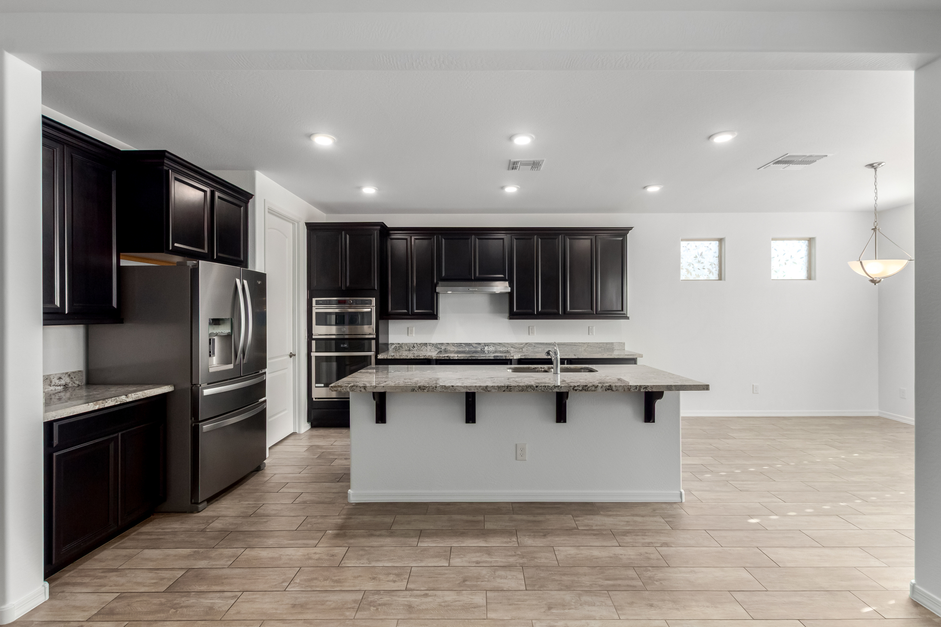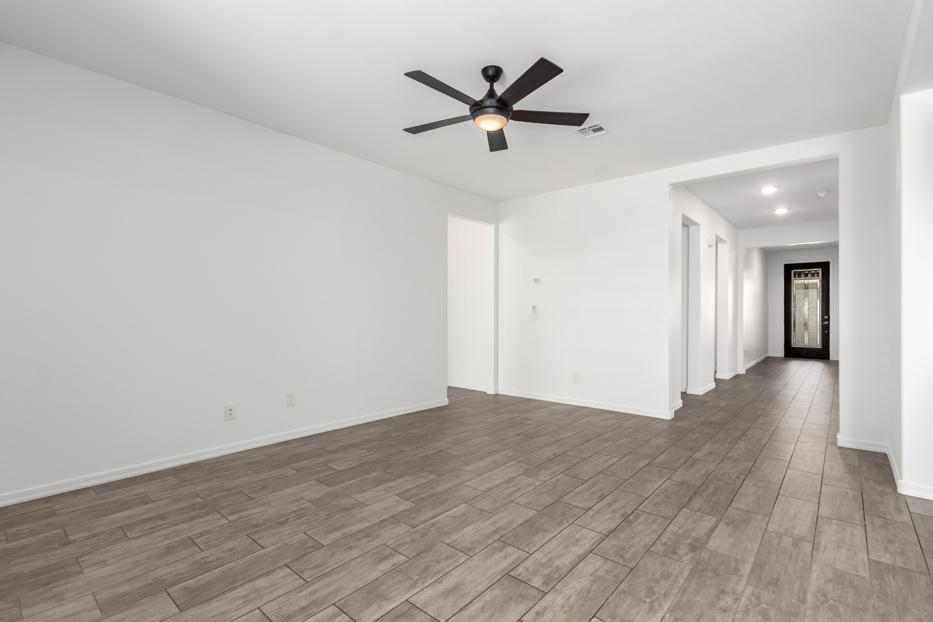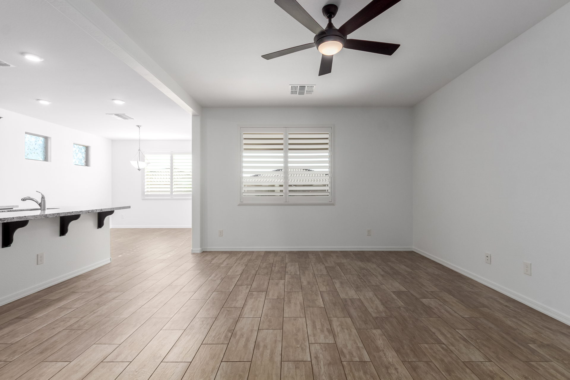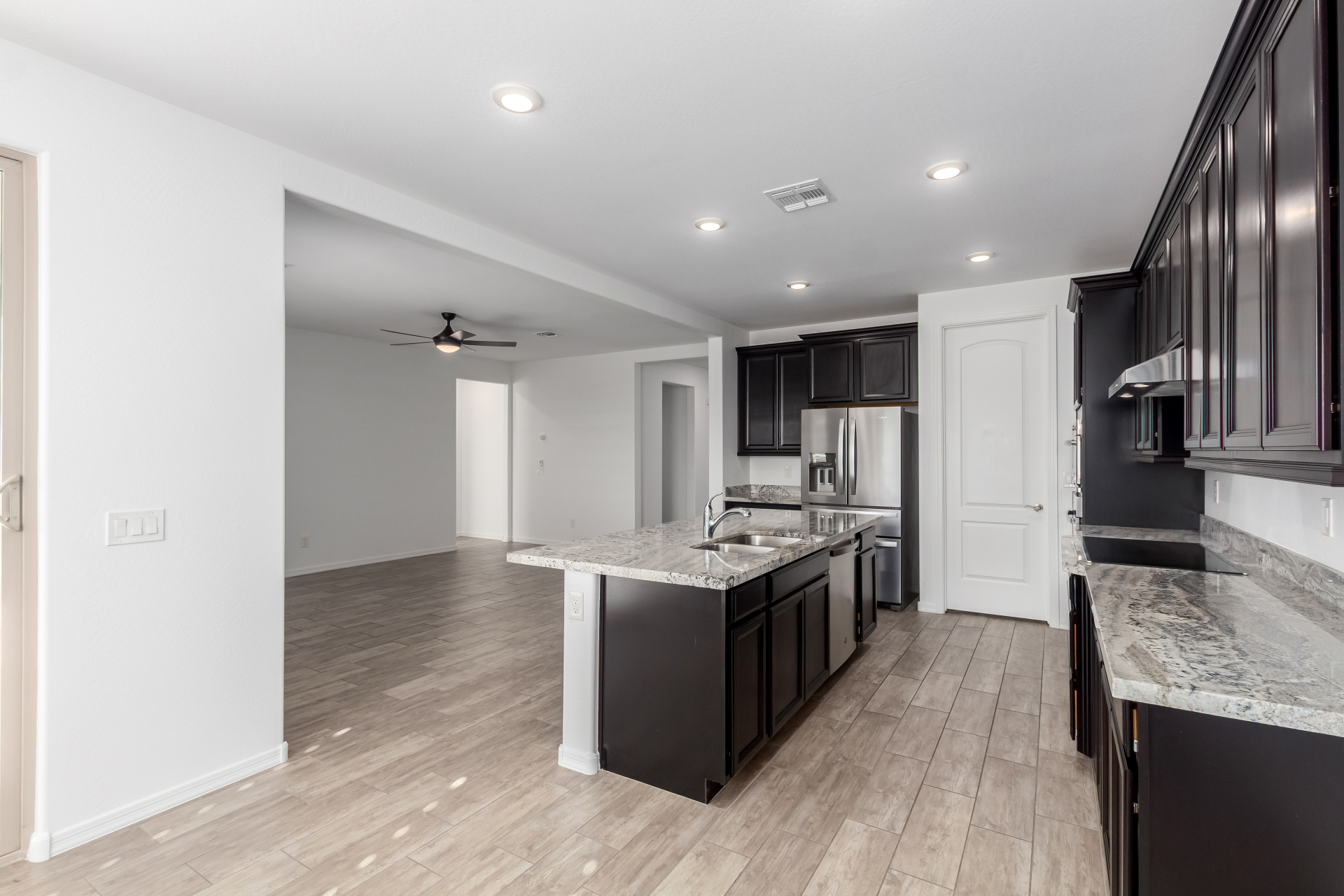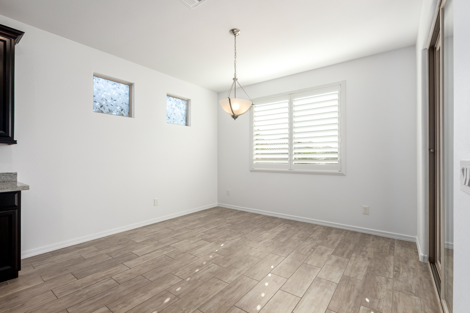 Start living in this upgraded single-level home offering a 2-car garage, stone accents, and a cozy front porch! Inviting hallway leads to the spacious open floor plan enhanced by wood-look tile flooring, abundant natural light, plantation shutters, and fresh paint throughout. Upscale kitchen is a cook's delight, fully equipped with stainless steel appliances, ample espresso cabinets adorned with crown moulding, a walk-in pantry, granite counters, a prep island with a breakfast bar, and recessed lighting that illuminates every corner. Sizable main bedroom provides a bathroom with two vanities and a walk-in closet. Flexible den can be used as an office, game area, or reading nook. Enjoy outdoor living in the large backyard, complete with a covered patio and artificial turf. Don't miss!