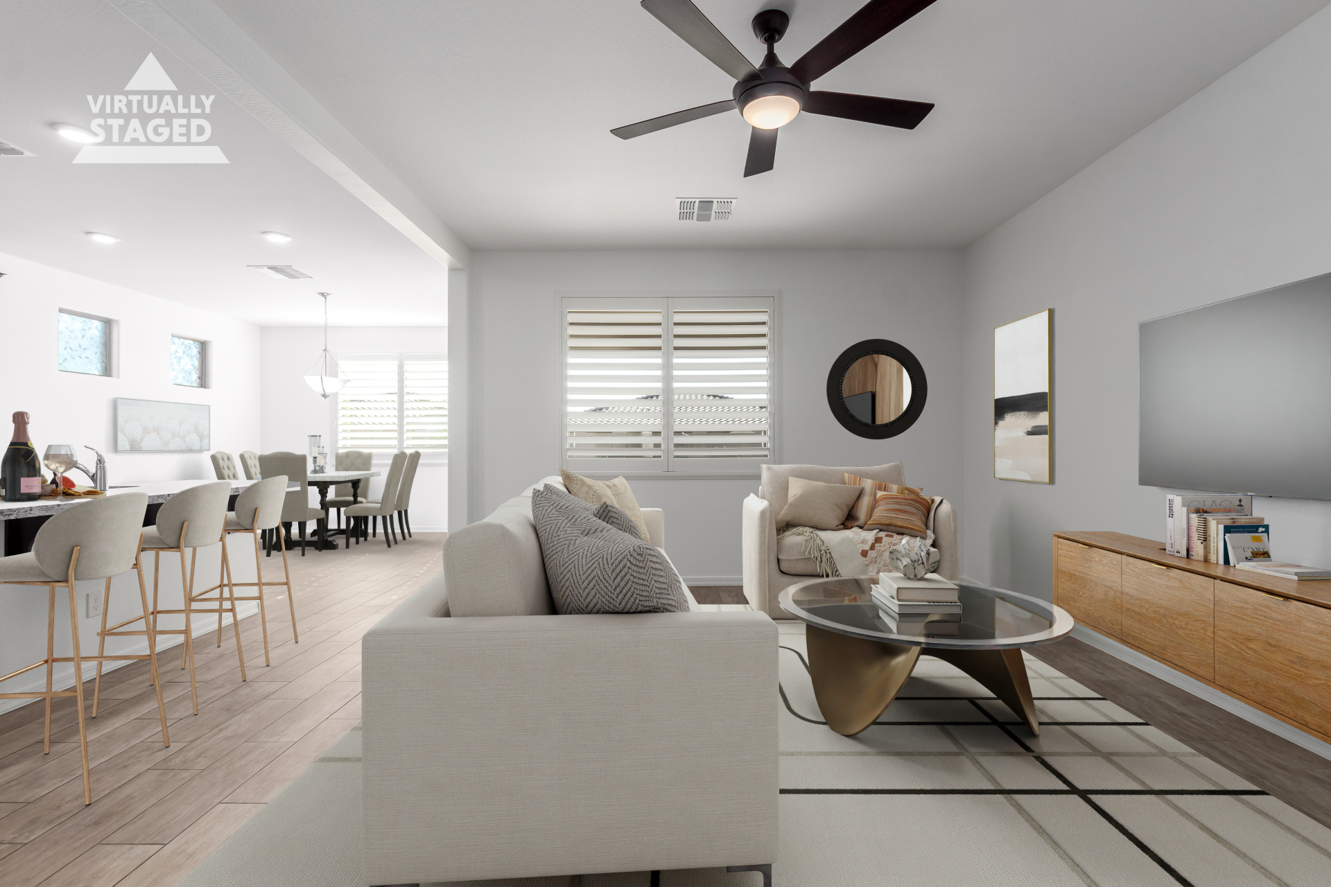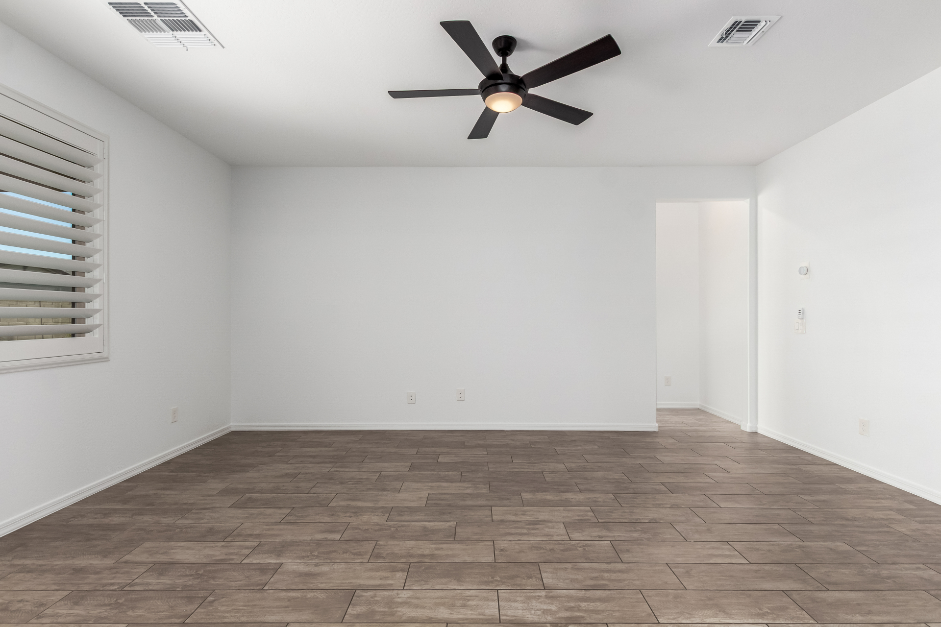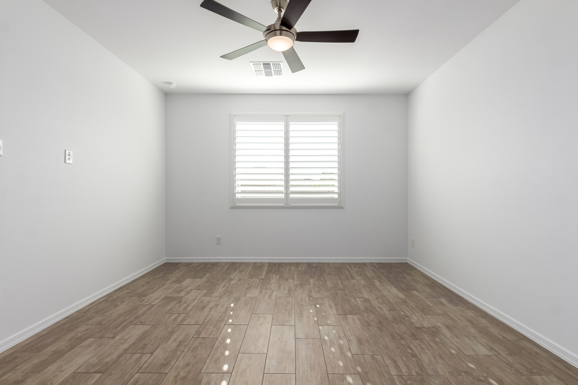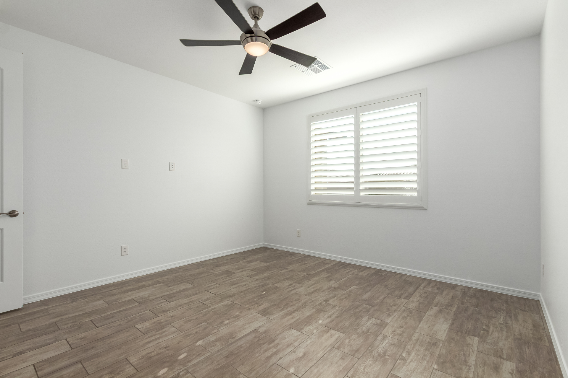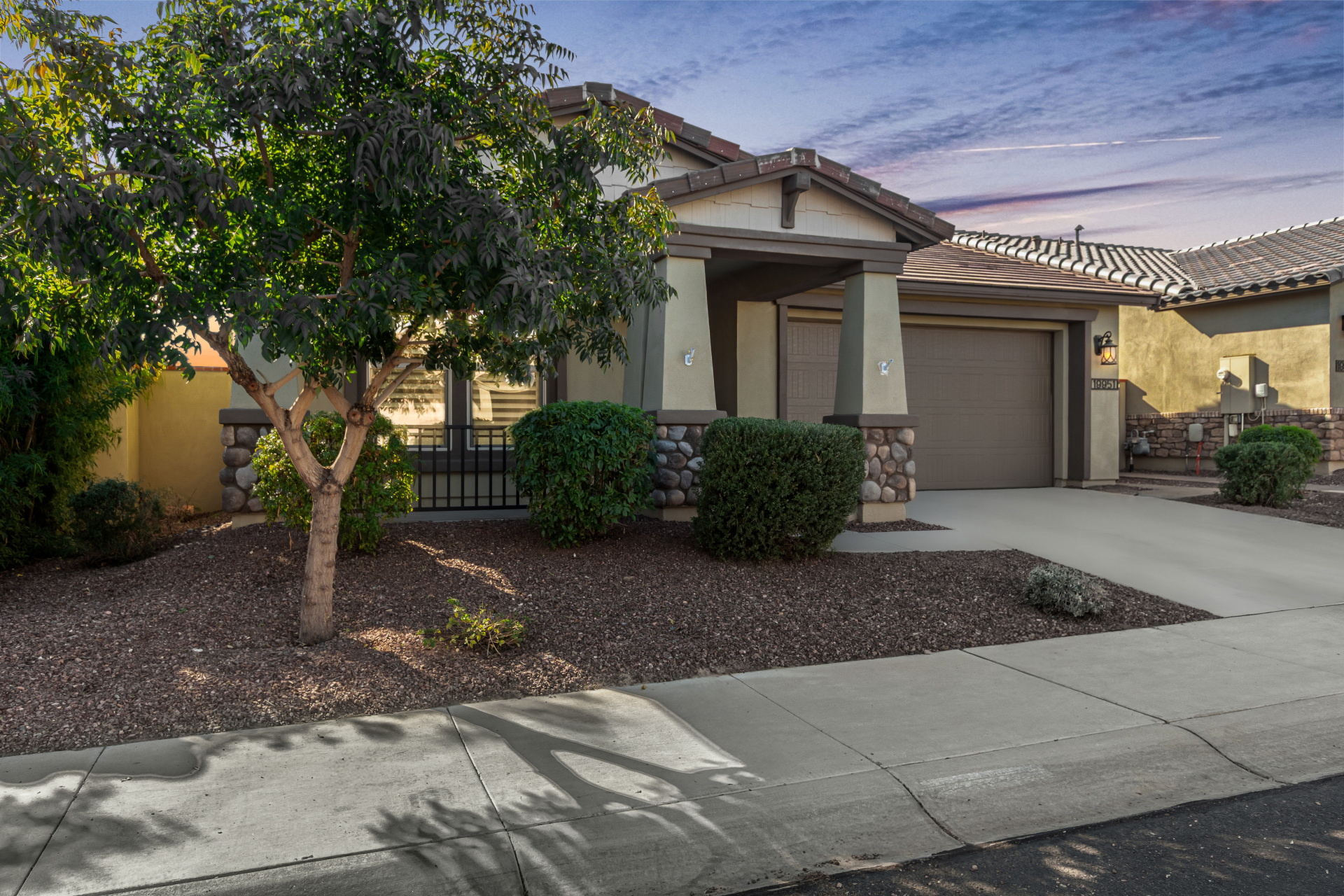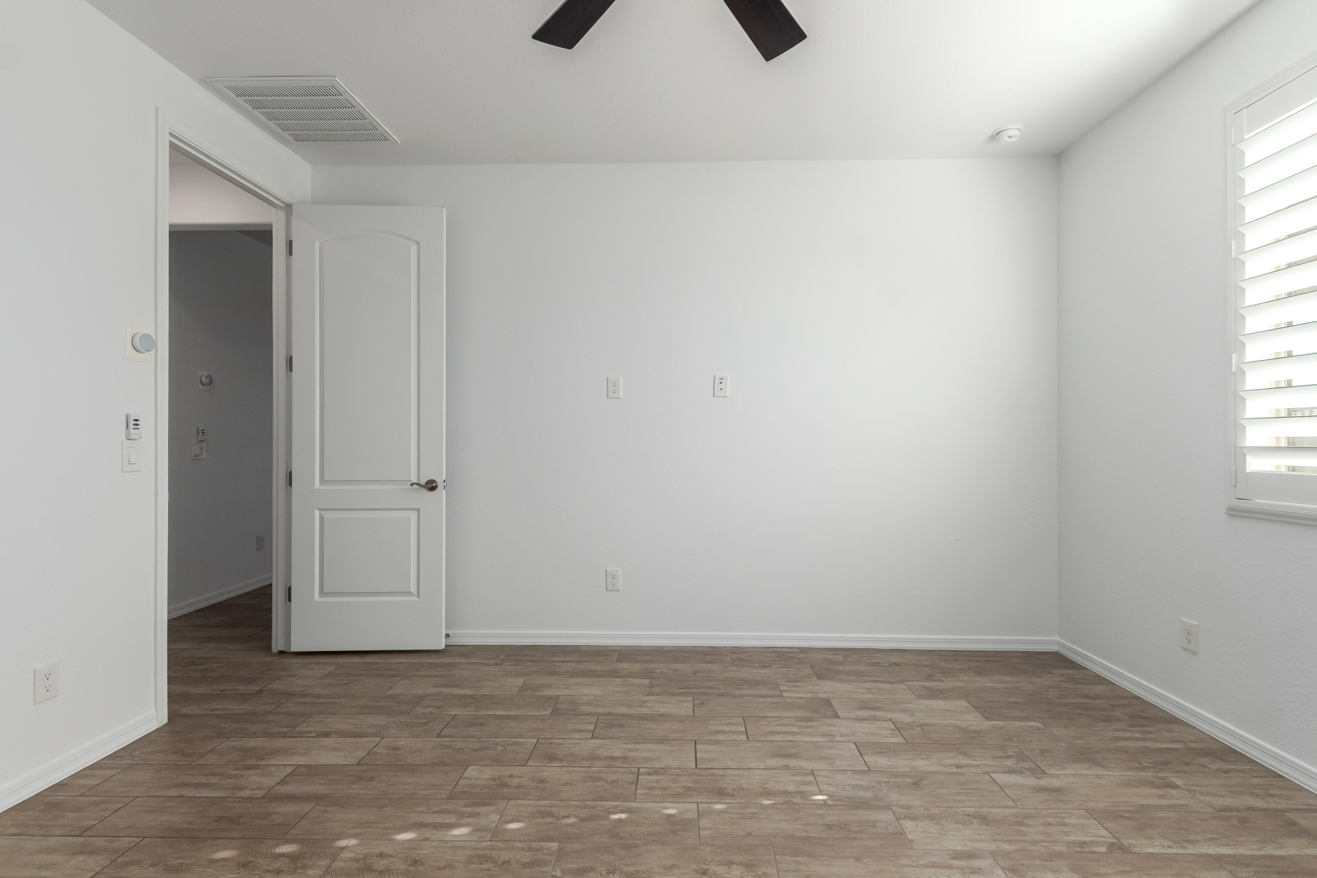 Start living in this upgraded single-level home offering a 2-car garage, stone accents, and a cozy front porch! Inviting hallway leads to the spacious open floor plan enhanced by wood-look tile flooring, abundant natural light, plantation shutters, and fresh paint throughout. Upscale kitchen is a cook's delight, fully equipped with stainless steel appliances, ample espresso cabinets adorned with crown moulding, a walk-in pantry, granite counters, a prep island with a breakfast bar, and recessed lighting that illuminates every corner. Sizable main bedroom provides a bathroom with two vanities and a walk-in closet. Flexible den can be used as an office, game area, or reading nook. Enjoy outdoor living in the large backyard, complete with a covered patio and artificial turf. Don't miss!