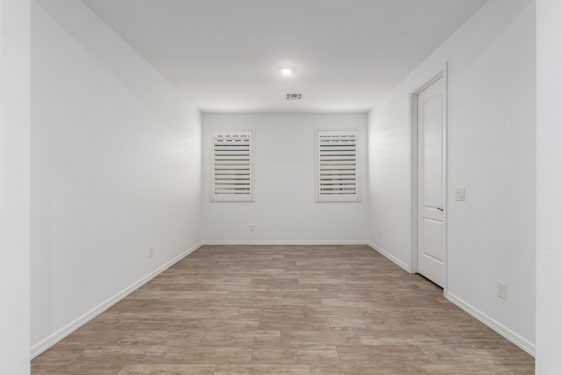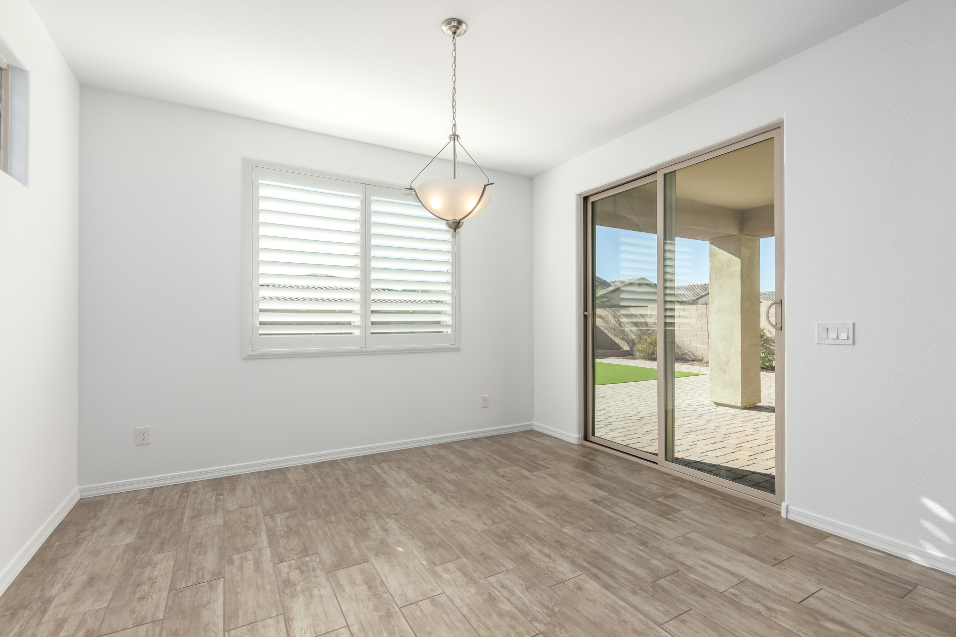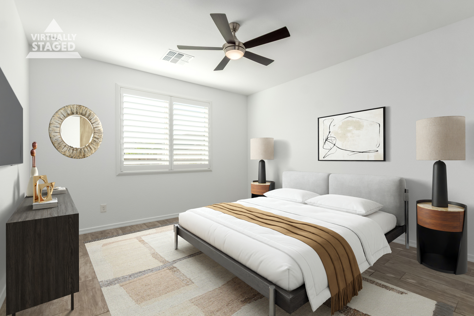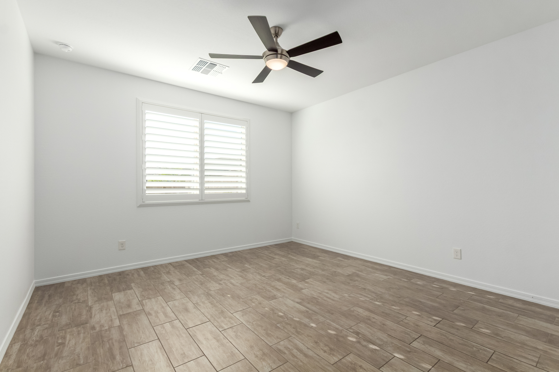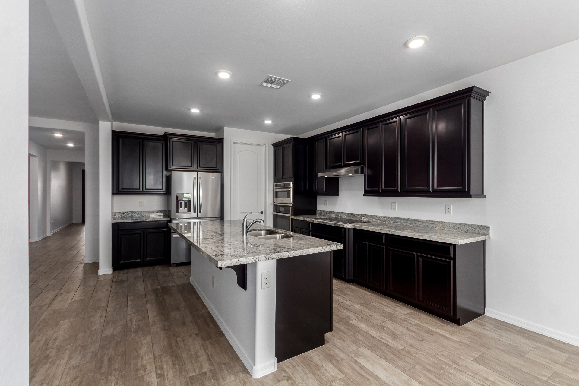 Start living in this upgraded single-level home offering a 2-car garage, stone accents, and a cozy front porch! Inviting hallway leads to the spacious open floor plan enhanced by wood-look tile flooring, abundant natural light, plantation shutters, and fresh paint throughout. Upscale kitchen is a cook's delight, fully equipped with stainless steel appliances, ample espresso cabinets adorned with crown moulding, a walk-in pantry, granite counters, a prep island with a breakfast bar, and recessed lighting that illuminates every corner. Sizable main bedroom provides a bathroom with two vanities and a walk-in closet. Flexible den can be used as an office, game area, or reading nook. Enjoy outdoor living in the large backyard, complete with a covered patio and artificial turf. Don't miss!